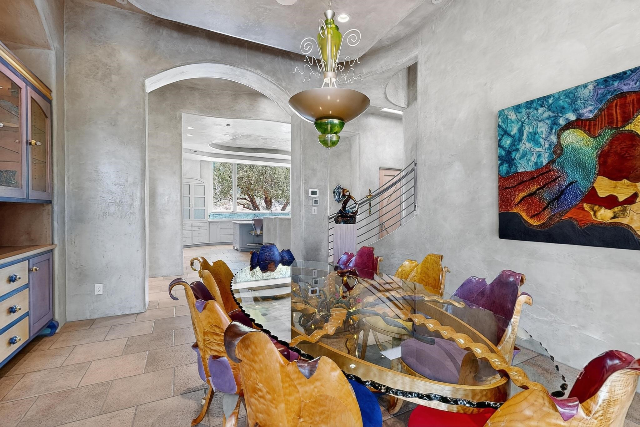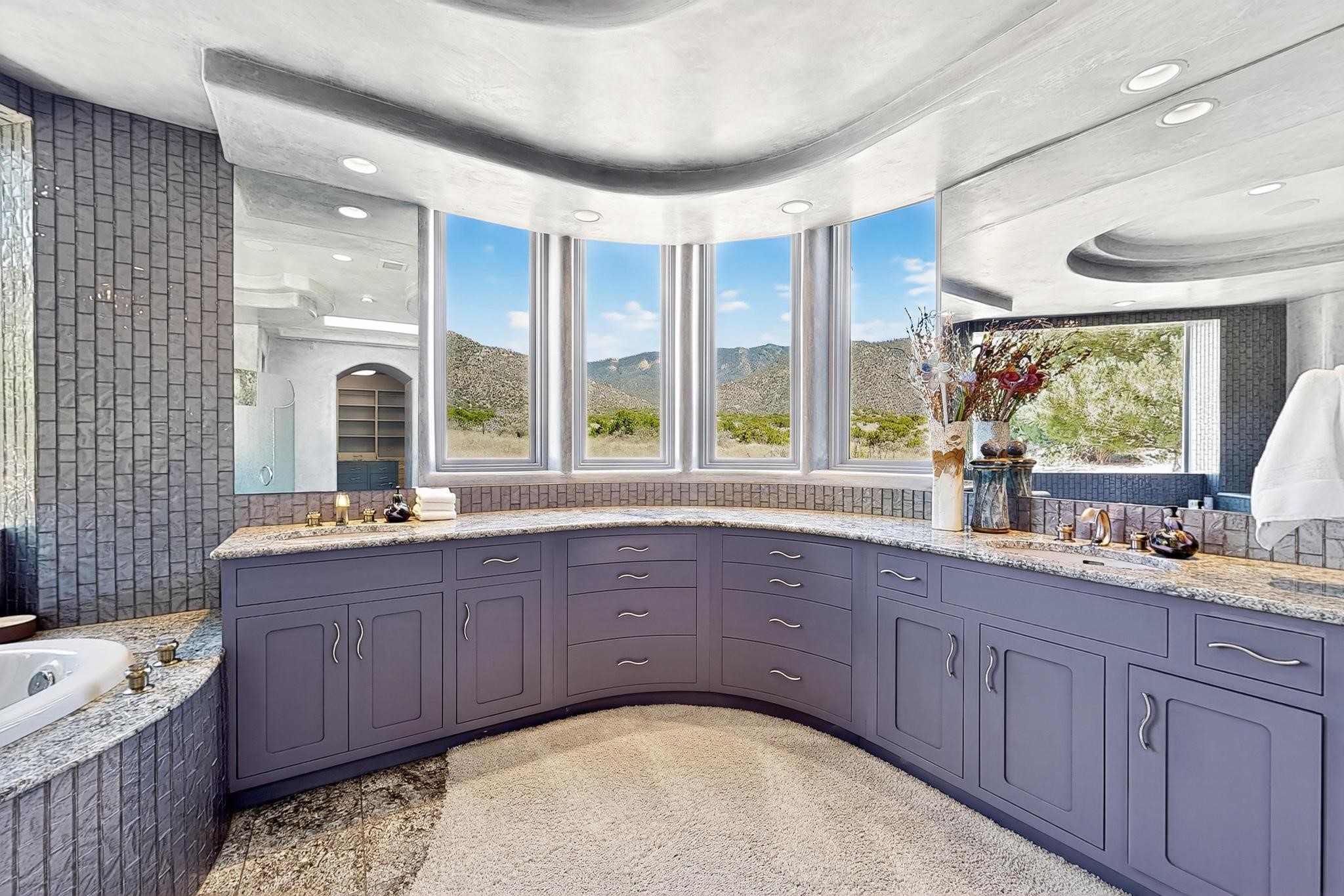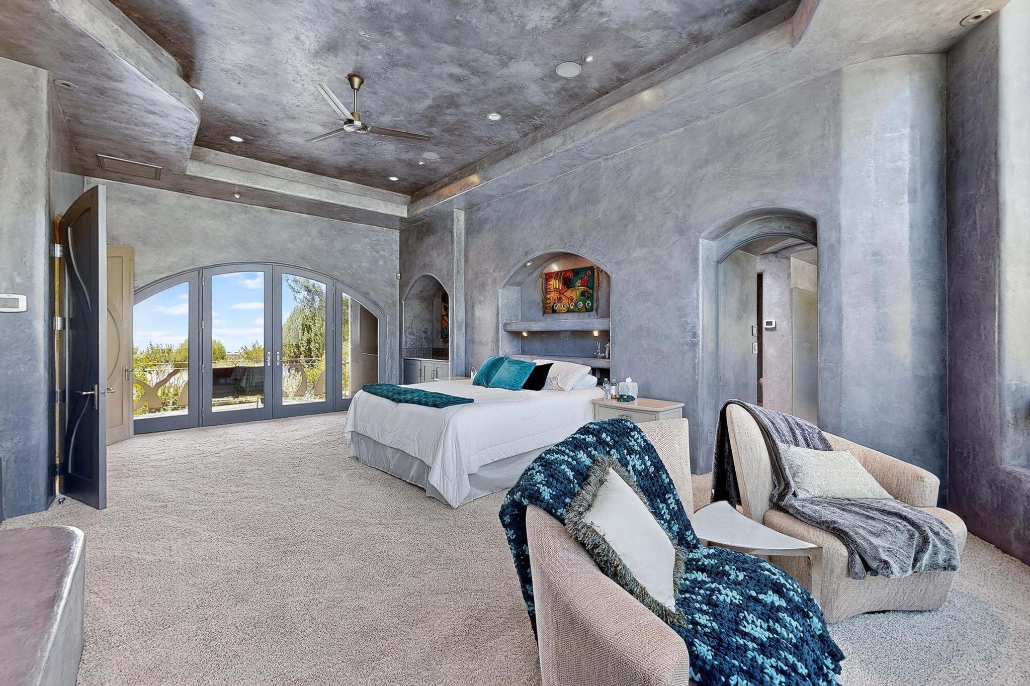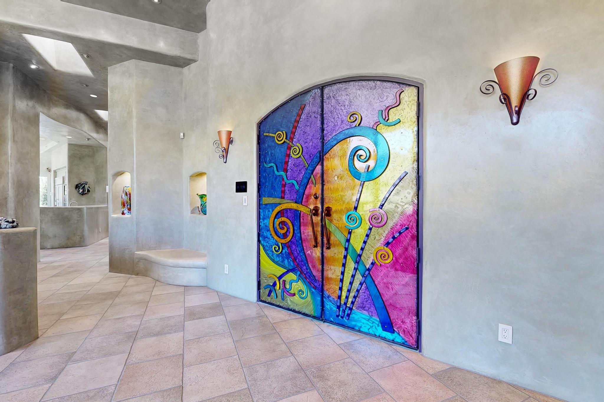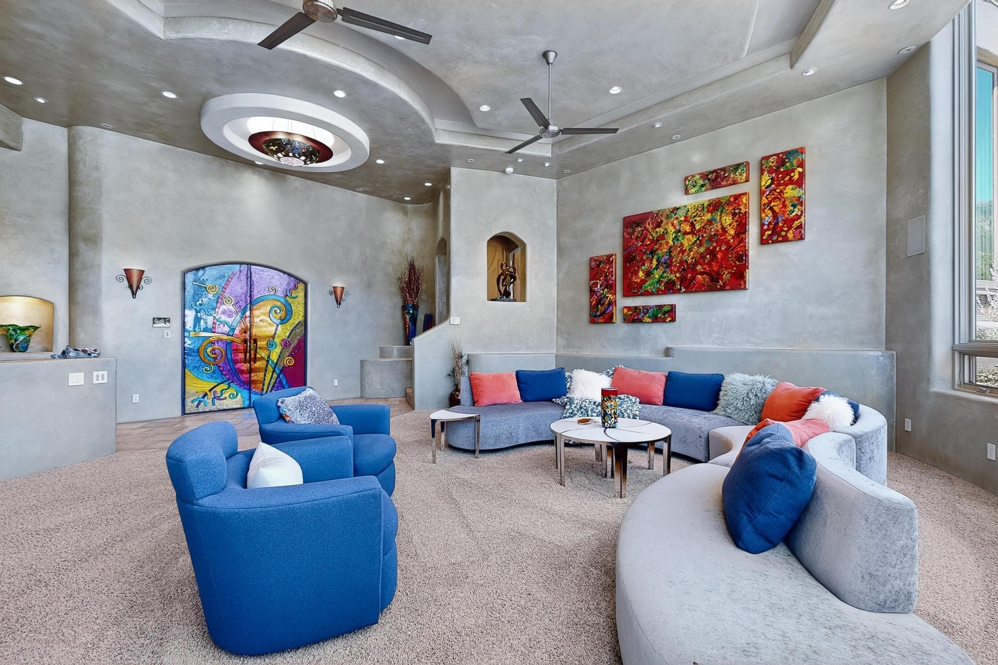 Perched at the pinnacle of High Desert, this extraordinary Custom Built luxury home sits on a private 2.37 acres lot and offers National Forest Views, unmatched privacy, and masterful design throughout. With 4 dedicated bedrooms, including a self-contained guest suite, plus two flexible rooms perfect for a home office and craft space, this home blends spacious living with thoughtful functionality. As you approach the home, you're greeted by an elegant water feature that flows beside a custom fire pit, creating a stunning and serene entry experience that sets the tone for the rest of the property. Bedrooms/Office all have window and balcony views. creating indoor-outdoor living and maximizing the incredible vistas. Designed for both elegance and practicality. Designed for both elegance and practicality, the home features 8 bathrooms (including 3 half baths and 2 three-quarter baths) and is adorned with hand-applied plaster walls by Frank D'Angelico that lend warmth and sophistication. The floor plan was thoughtfully crafted to provide ample wall space for showcasing art, ideal for collectors and design enthusiasts. Enjoy a dedicated theater room with a custom star ceiling designed to replicate a starry Albuquerque night in September, offering a truly immersive cinematic experience. Outside, a private pool serves as a tranquil escape, featuring an automatic cover and custom water features, including a bespoke downspout inspired by European spa architecture all operable at the touch of a button. Separate pool rooms provide convenient storage for pool toys and house the mechanical equipment. Comfort meets control with radiant floor heating and five refrigerated cooling units, all designed for efficiency and luxury. Each bedroom has independent climate controls, allowing for personalized heating and cooling throughout the home. A built-in, bank-grade safe offers secure storage for your most valuable possessions, while the chef's kitchen is outfitted with premium Wolf and Sub-Zero appliances, making it a culinary dream. From its elevated position with sweeping panoramic views to its impeccable craftsmanship and resort-style amenities, this is truly one of High Desert's most distinguished homes.