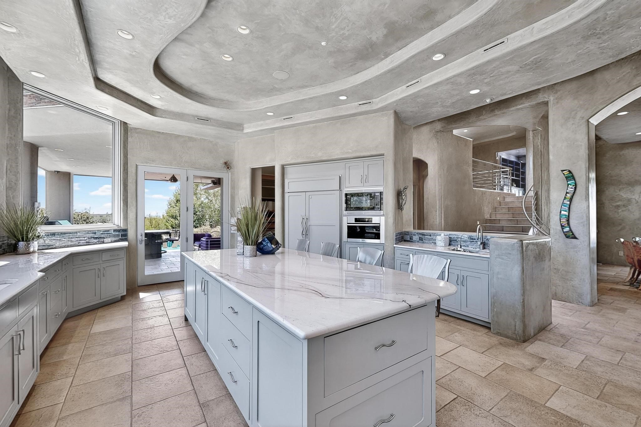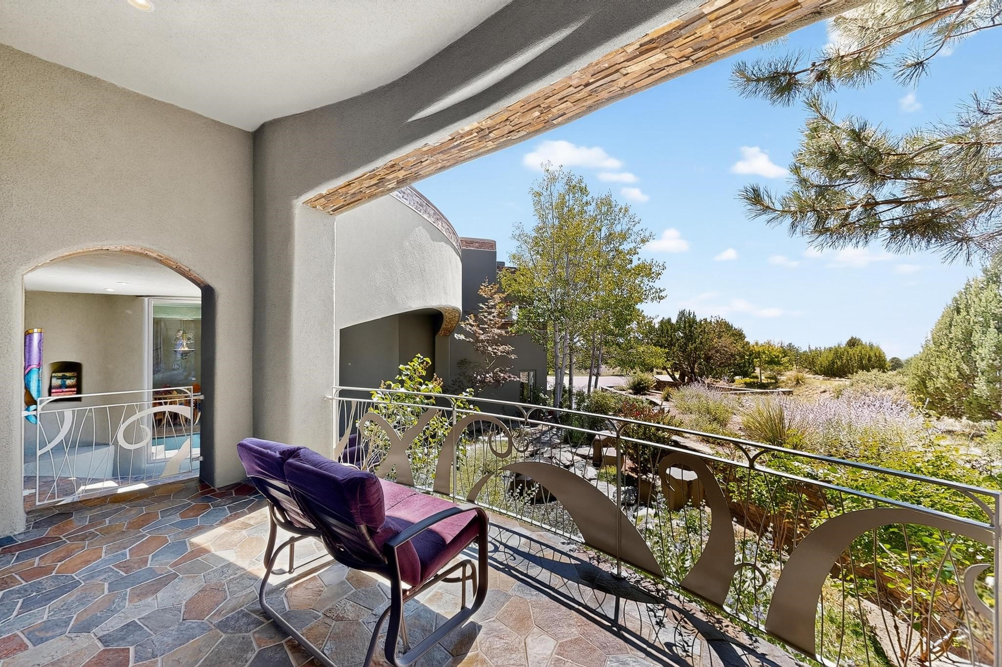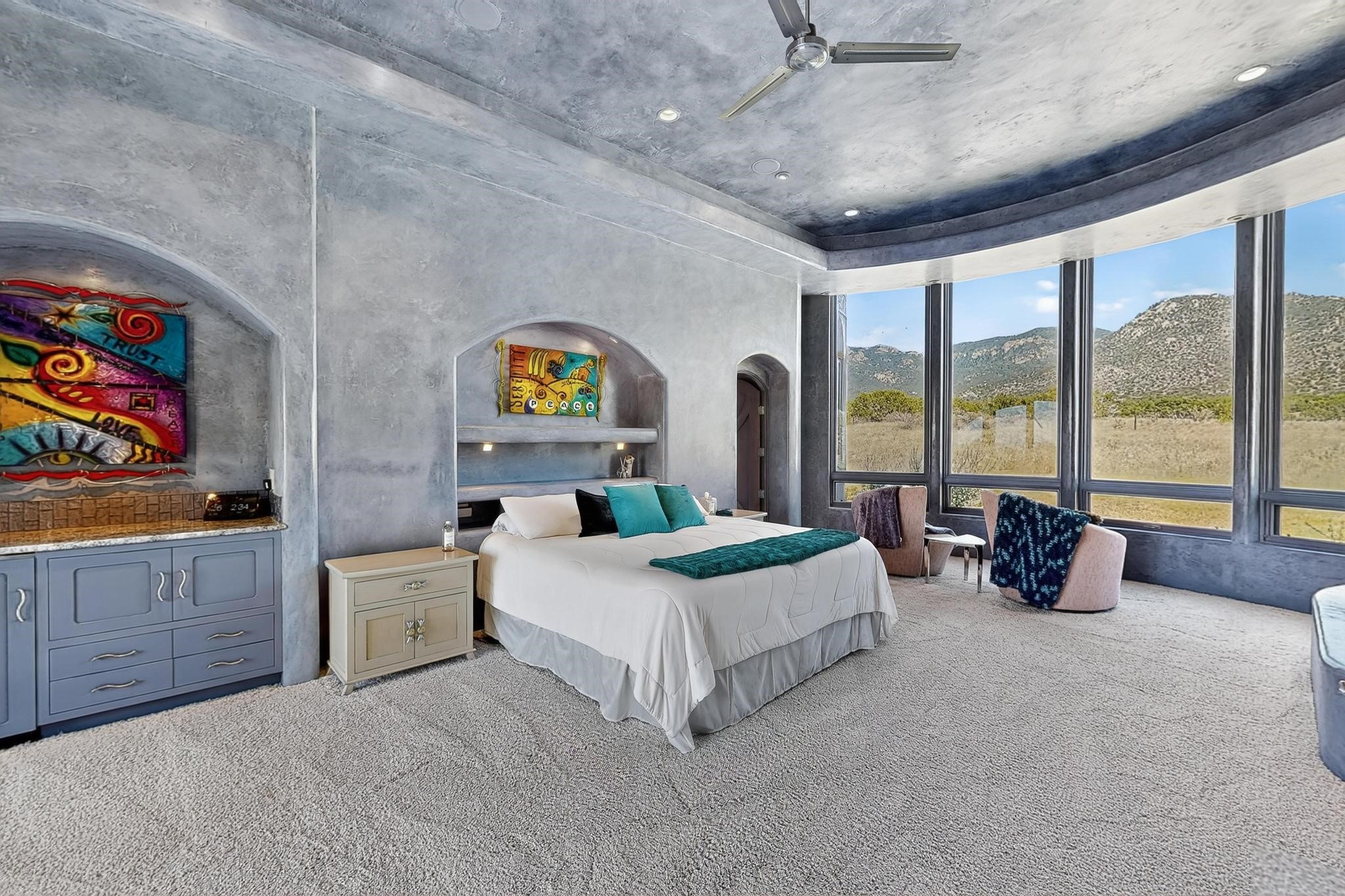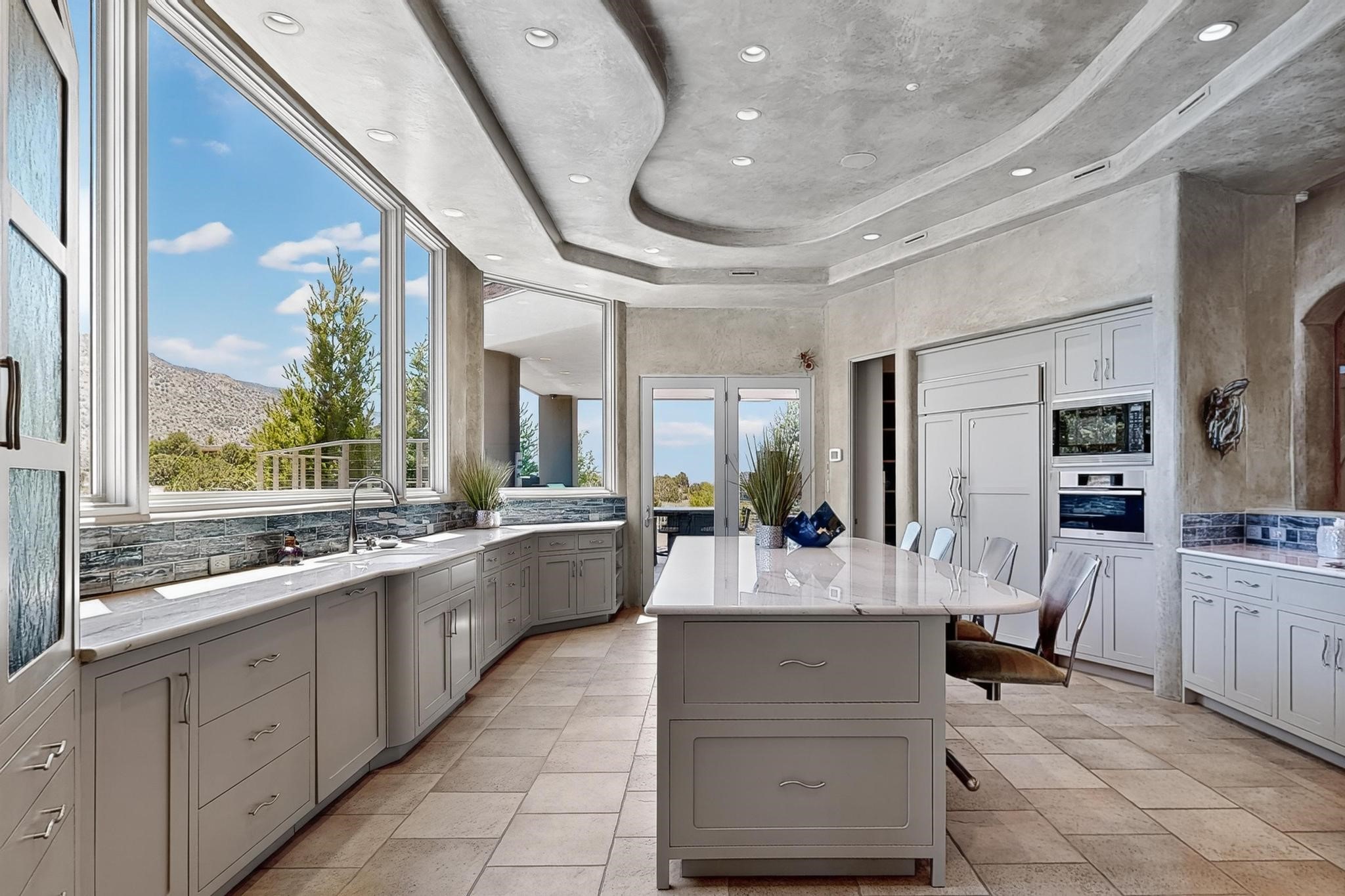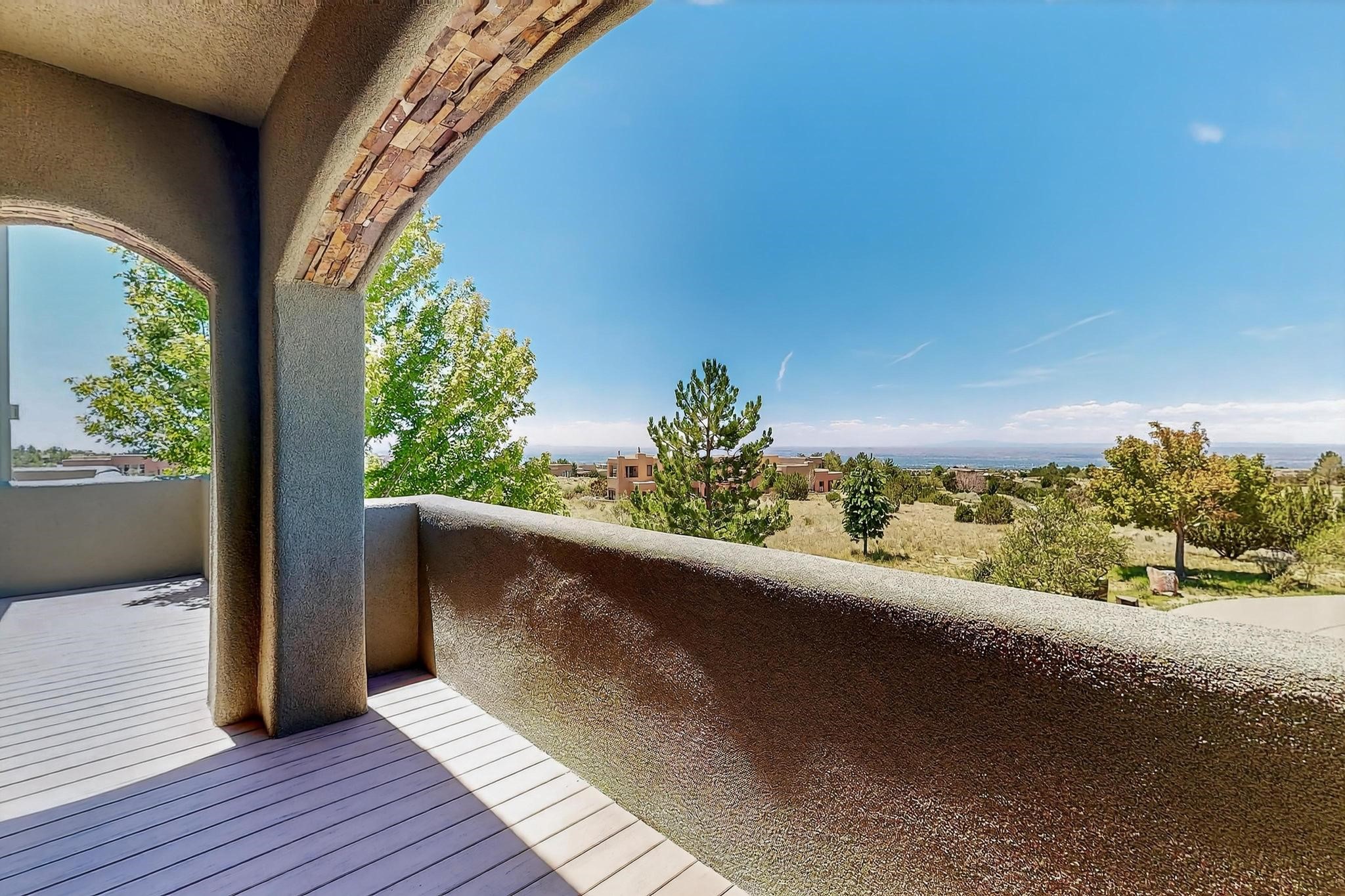 Perched at the pinnacle of High Desert, this extraordinary Custom Built luxury home sits on a private 2.37 acres lot and offers National Forest Views, unmatched privacy, and masterful design throughout. With 4 dedicated bedrooms, including a self-contained guest suite, plus two flexible rooms perfect for a home office and craft space, this home blends spacious living with thoughtful functionality. As you approach the home, you're greeted by an elegant water feature that flows beside a custom fire pit, creating a stunning and serene entry experience that sets the tone for the rest of the property. Bedrooms/Office all have window and balcony views. creating indoor-outdoor living and maximizing the incredible vistas. Designed for both elegance and practicality. Designed for both elegance and practicality, the home features 8 bathrooms (including 3 half baths and 2 three-quarter baths) and is adorned with hand-applied plaster walls by Frank D'Angelico that lend warmth and sophistication. The floor plan was thoughtfully crafted to provide ample wall space for showcasing art, ideal for collectors and design enthusiasts. Enjoy a dedicated theater room with a custom star ceiling designed to replicate a starry Albuquerque night in September, offering a truly immersive cinematic experience. Outside, a private pool serves as a tranquil escape, featuring an automatic cover and custom water features, including a bespoke downspout inspired by European spa architecture all operable at the touch of a button. Separate pool rooms provide convenient storage for pool toys and house the mechanical equipment. Comfort meets control with radiant floor heating and five refrigerated cooling units, all designed for efficiency and luxury. Each bedroom has independent climate controls, allowing for personalized heating and cooling throughout the home. A built-in, bank-grade safe offers secure storage for your most valuable possessions, while the chef's kitchen is outfitted with premium Wolf and Sub-Zero appliances, making it a culinary dream. From its elevated position with sweeping panoramic views to its impeccable craftsmanship and resort-style amenities, this is truly one of High Desert's most distinguished homes.