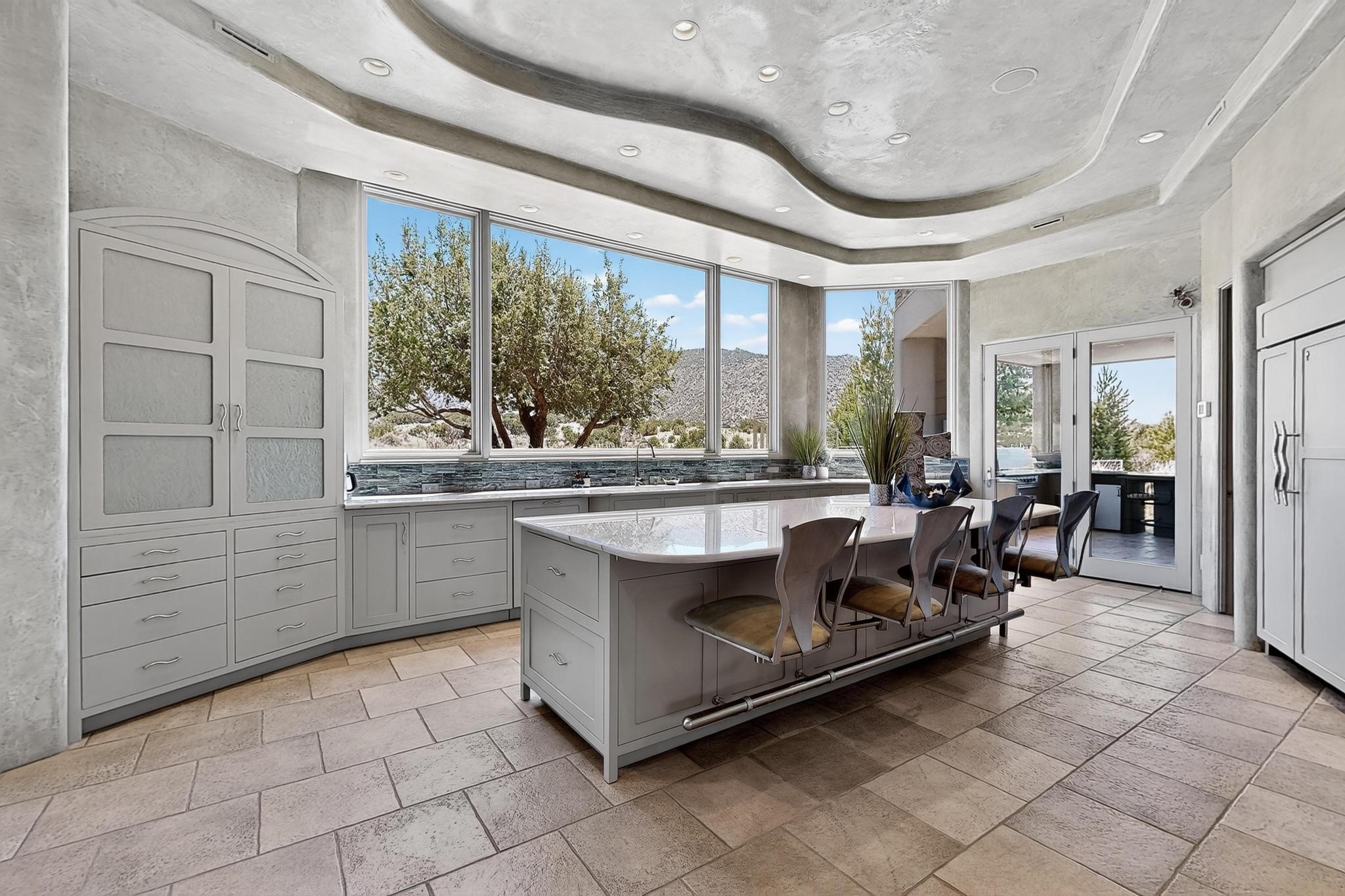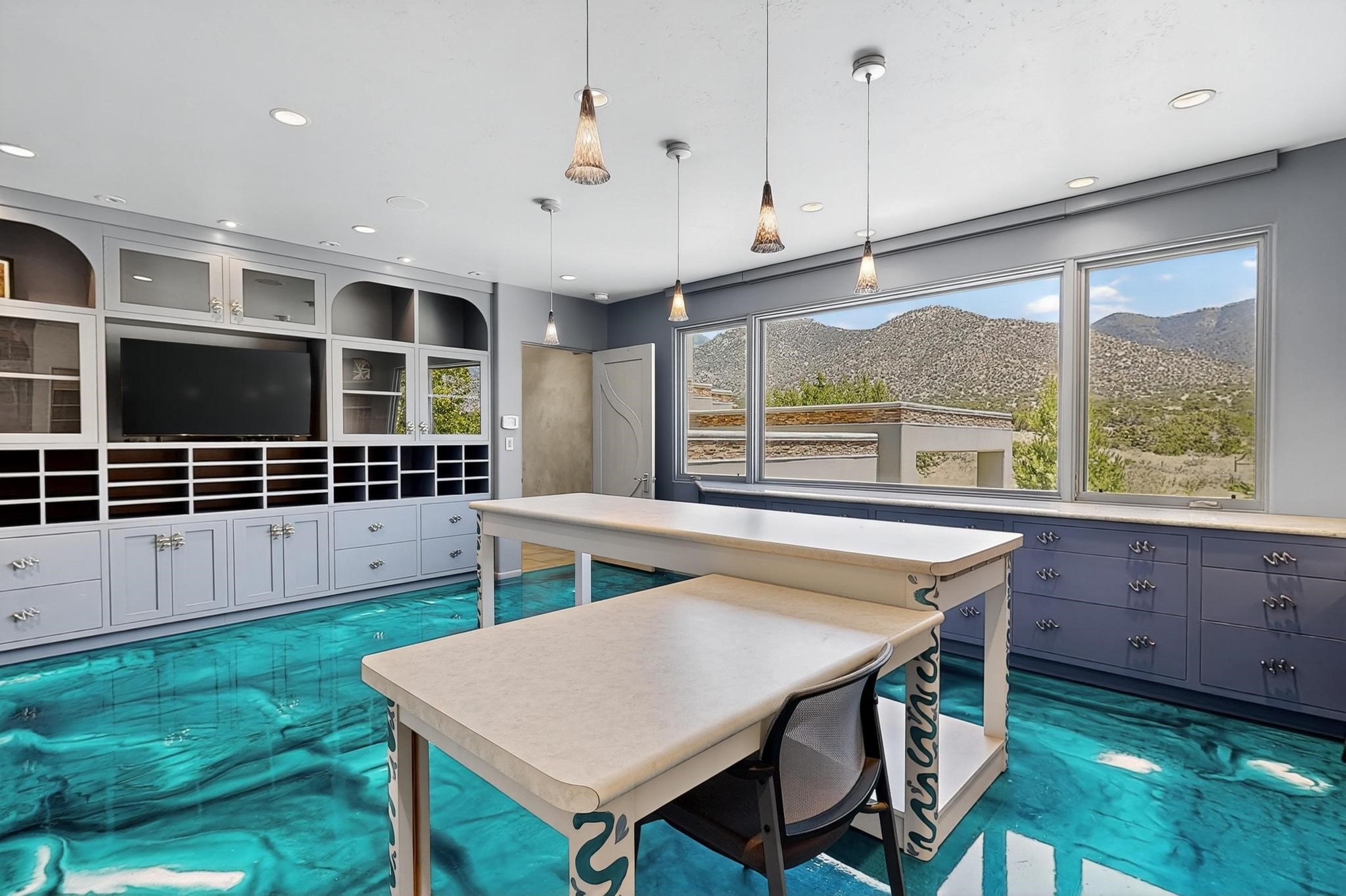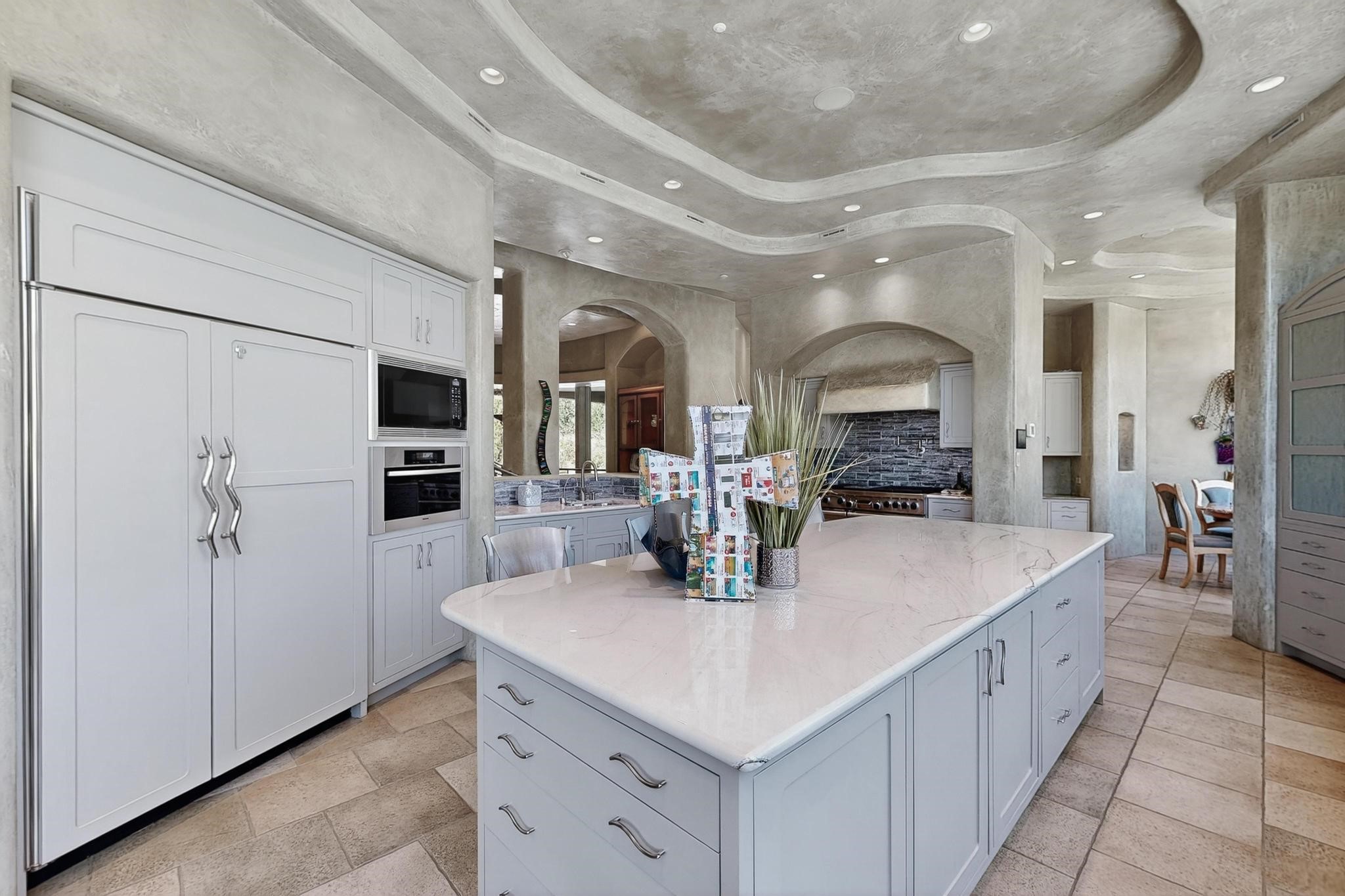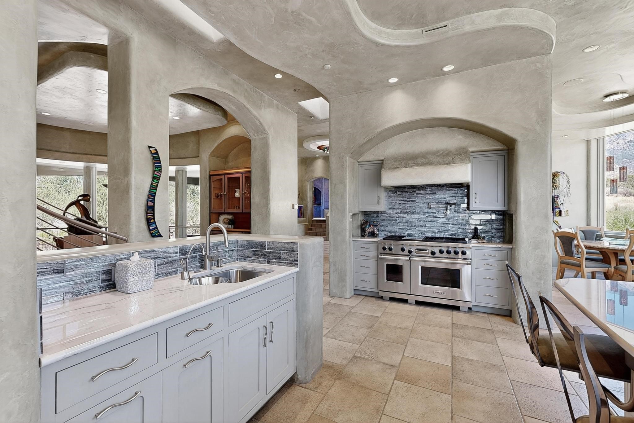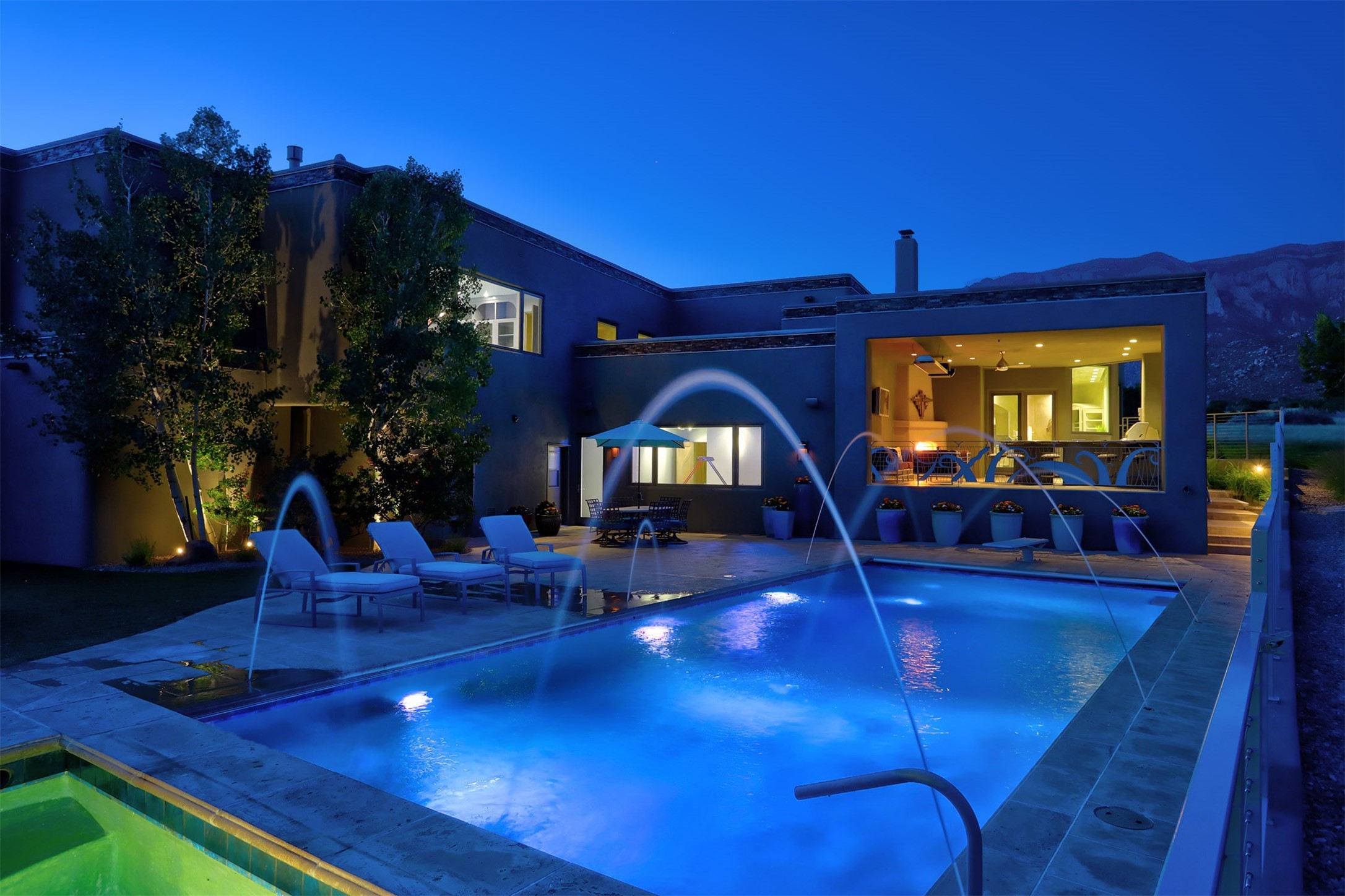Perched at the pinnacle of High Desert, this extraordinary Custom Built luxury home sits on a private 2.37 acres lot and offers National Forest Views, unmatched privacy, and masterful design throughout. With 4 dedicated bedrooms, including a self-contained guest suite, plus two flexible rooms perfect for a home office and craft space, this home blends spacious living with thoughtful functionality. As you approach the home, you're greeted by an elegant water feature that flows beside a custom fire pit, creating a stunning and serene entry experience that sets the tone for the rest of the property. Bedrooms/Office all have window and balcony views. creating indoor-outdoor living and maximizing the incredible vistas. Designed for both elegance and practicality. Designed for both elegance and practicality, the home features 8 bathrooms (including 3 half baths and 2 three-quarter baths) and is adorned with hand-applied plaster walls by Frank D'Angelico that lend warmth and sophistication. The floor plan was thoughtfully crafted to provide ample wall space for showcasing art, ideal for collectors and design enthusiasts. Enjoy a dedicated theater room with a custom star ceiling designed to replicate a starry Albuquerque night in September, offering a truly immersive cinematic experience. Outside, a private pool serves as a tranquil escape, featuring an automatic cover and custom water features, including a bespoke downspout inspired by European spa architecture all operable at the touch of a button. Separate pool rooms provide convenient storage for pool toys and house the mechanical equipment. Comfort meets control with radiant floor heating and five refrigerated cooling units, all designed for efficiency and luxury. Each bedroom has independent climate controls, allowing for personalized heating and cooling throughout the home. A built-in, bank-grade safe offers secure storage for your most valuable possessions, while the chef's kitchen is outfitted with premium Wolf and Sub-Zero appliances, making it a culinary dream. From its elevated position with sweeping panoramic views to its impeccable craftsmanship and resort-style amenities, this is truly one of High Desert's most distinguished homes.