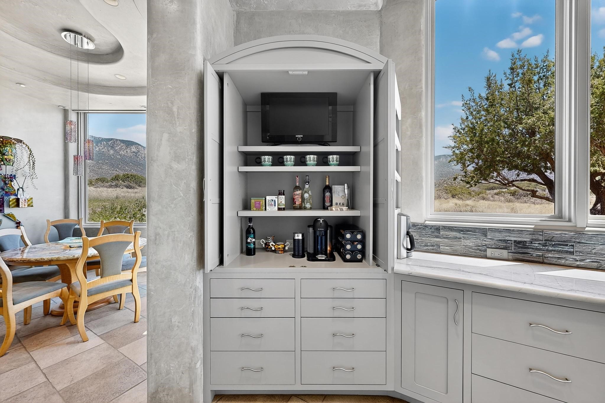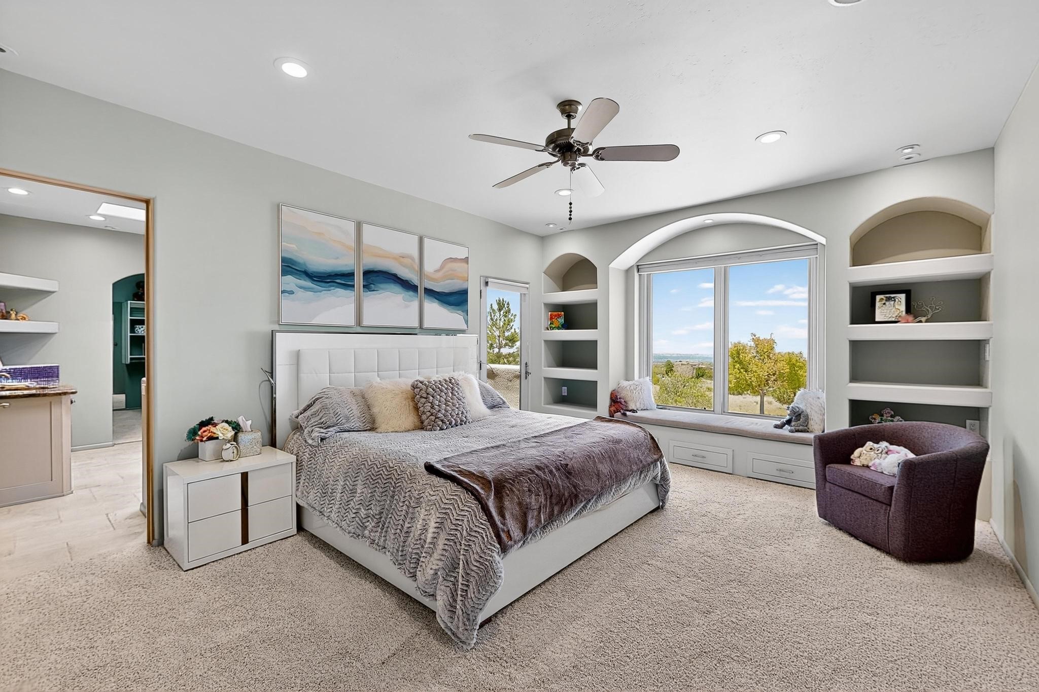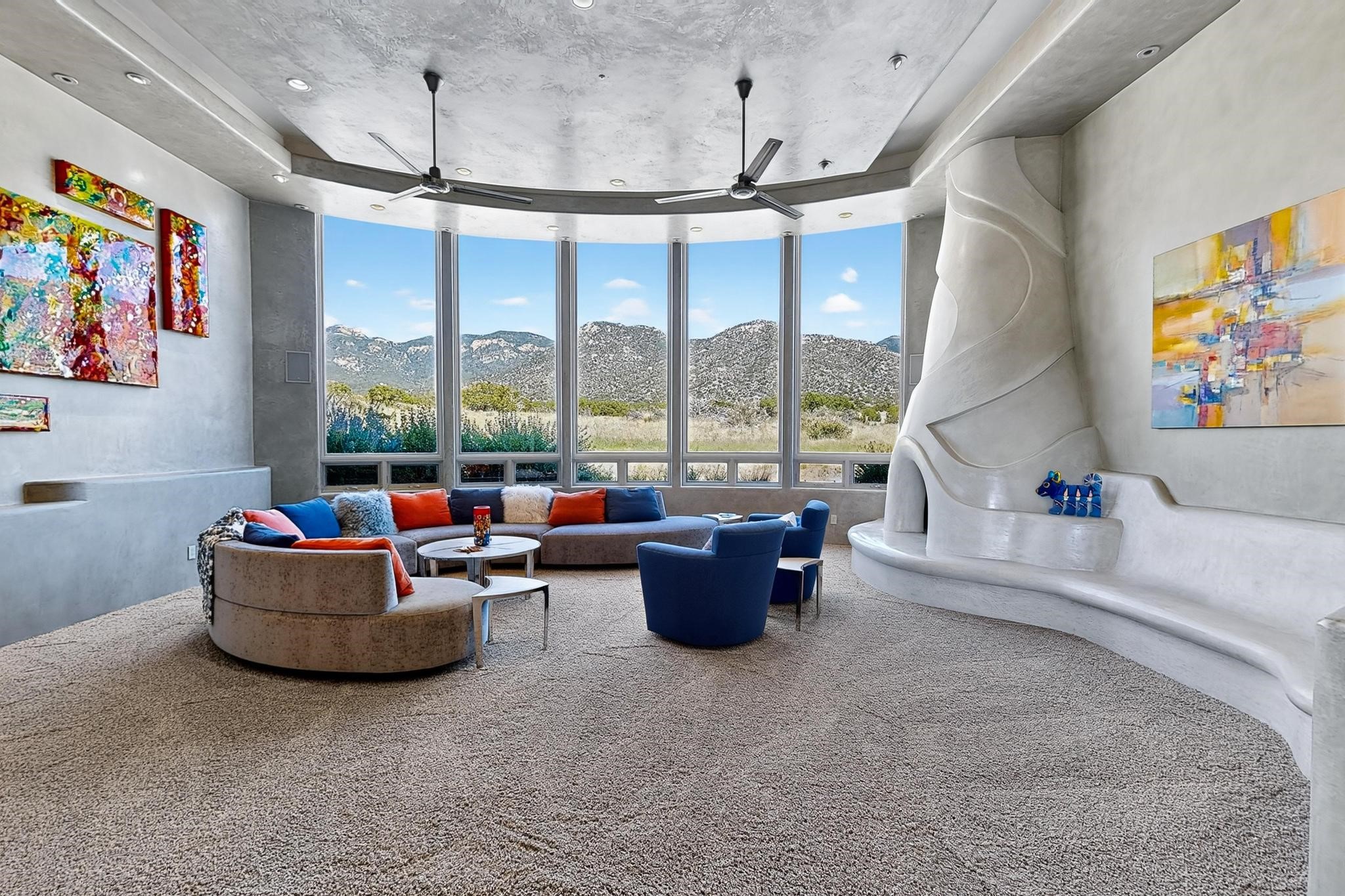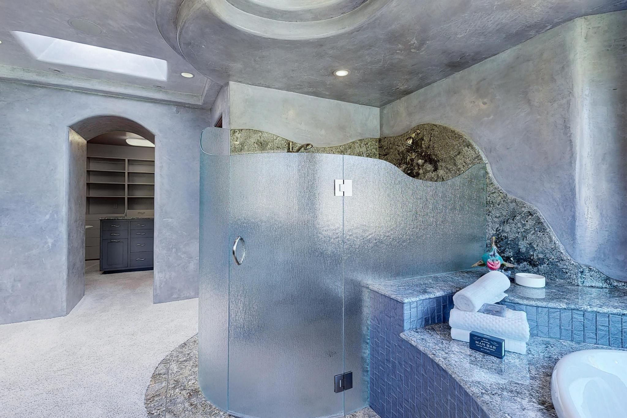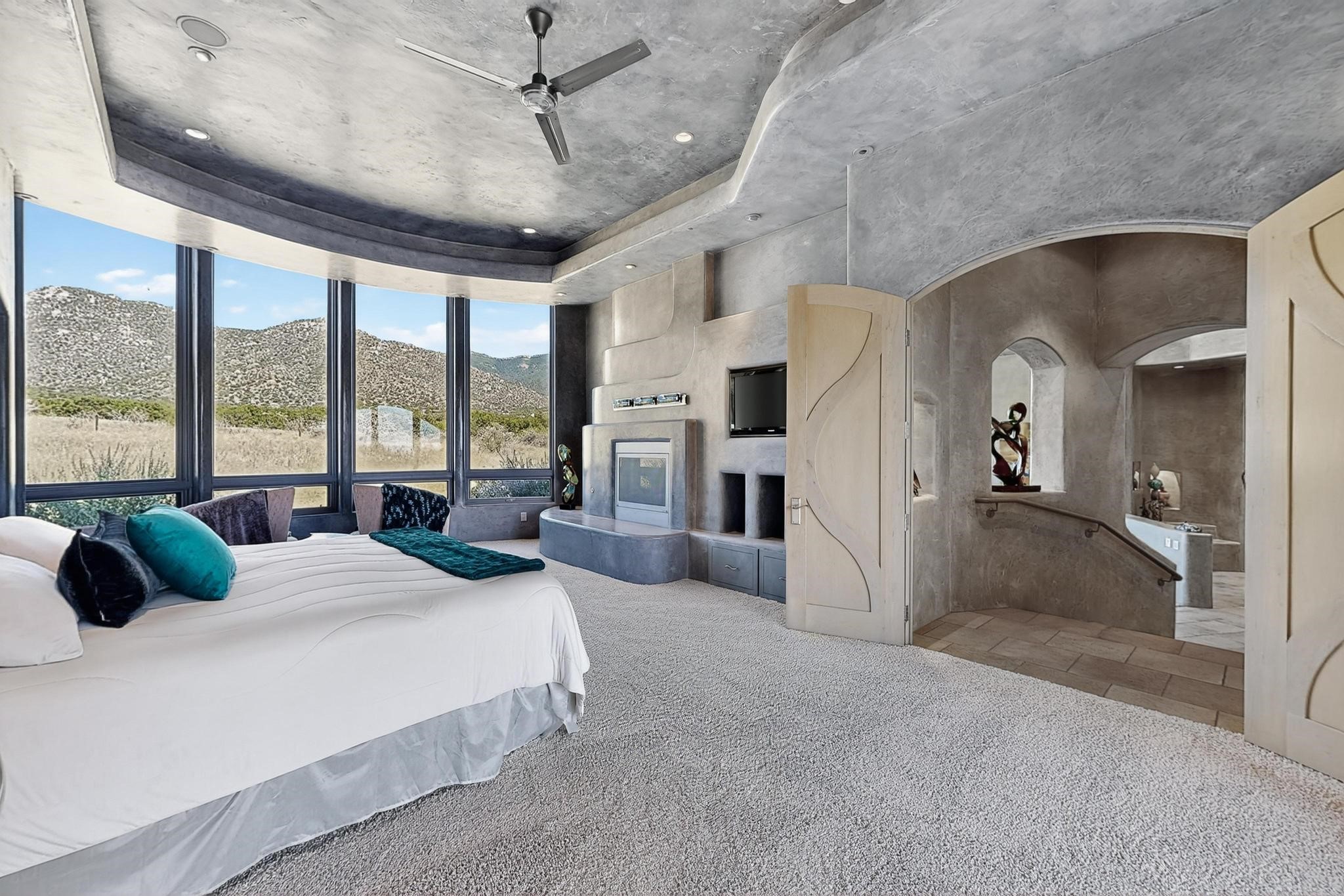 Perched at the pinnacle of High Desert, this extraordinary Custom Built luxury home sits on a private 2.37 acres lot and offers National Forest Views, unmatched privacy, and masterful design throughout. With 4 dedicated bedrooms, including a self-contained guest suite, plus two flexible rooms perfect for a home office and craft space, this home blends spacious living with thoughtful functionality. As you approach the home, you're greeted by an elegant water feature that flows beside a custom fire pit, creating a stunning and serene entry experience that sets the tone for the rest of the property. Bedrooms/Office all have window and balcony views. creating indoor-outdoor living and maximizing the incredible vistas. Designed for both elegance and practicality. Designed for both elegance and practicality, the home features 8 bathrooms (including 3 half baths and 2 three-quarter baths) and is adorned with hand-applied plaster walls by Frank D'Angelico that lend warmth and sophistication. The floor plan was thoughtfully crafted to provide ample wall space for showcasing art, ideal for collectors and design enthusiasts. Enjoy a dedicated theater room with a custom star ceiling designed to replicate a starry Albuquerque night in September, offering a truly immersive cinematic experience. Outside, a private pool serves as a tranquil escape, featuring an automatic cover and custom water features, including a bespoke downspout inspired by European spa architecture all operable at the touch of a button. Separate pool rooms provide convenient storage for pool toys and house the mechanical equipment. Comfort meets control with radiant floor heating and five refrigerated cooling units, all designed for efficiency and luxury. Each bedroom has independent climate controls, allowing for personalized heating and cooling throughout the home. A built-in, bank-grade safe offers secure storage for your most valuable possessions, while the chef's kitchen is outfitted with premium Wolf and Sub-Zero appliances, making it a culinary dream. From its elevated position with sweeping panoramic views to its impeccable craftsmanship and resort-style amenities, this is truly one of High Desert's most distinguished homes.