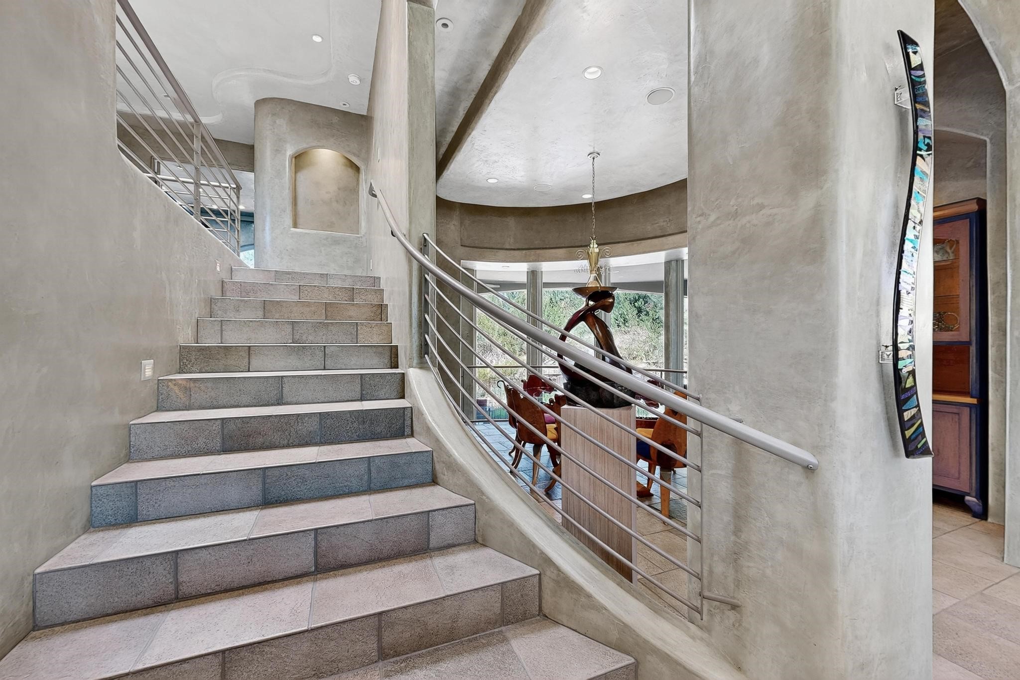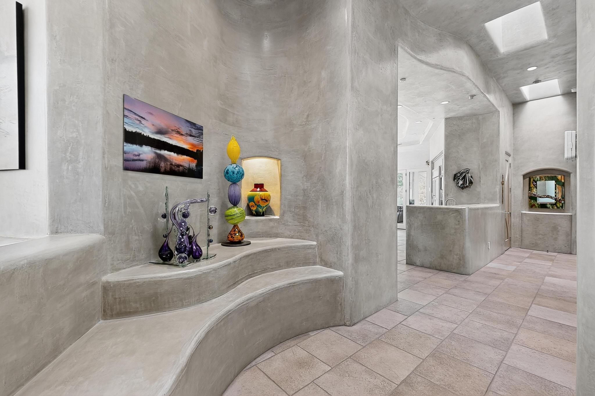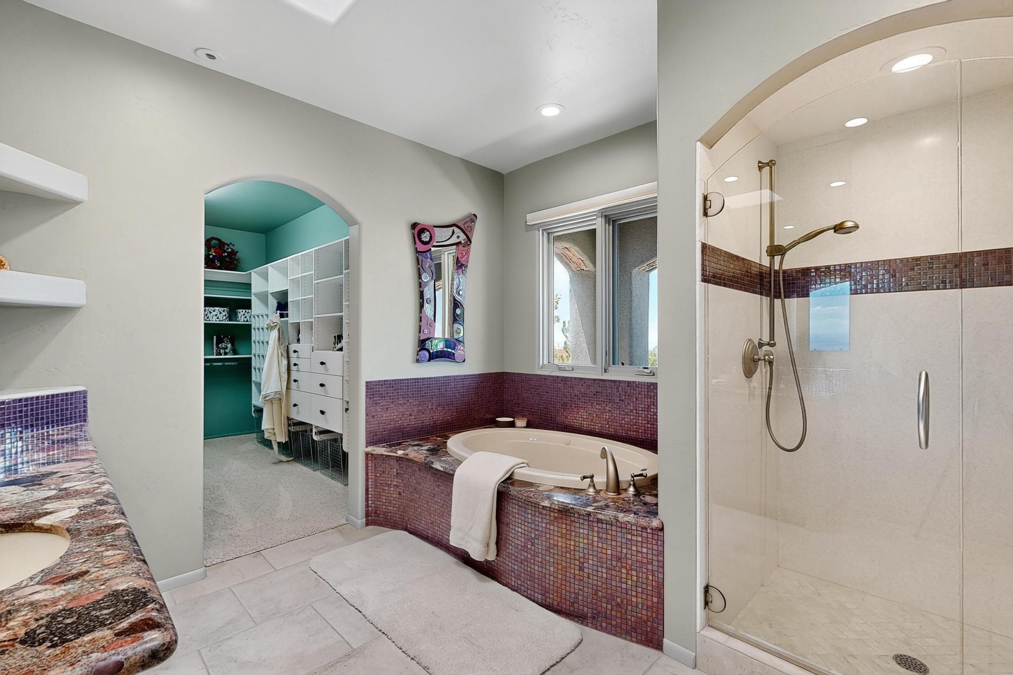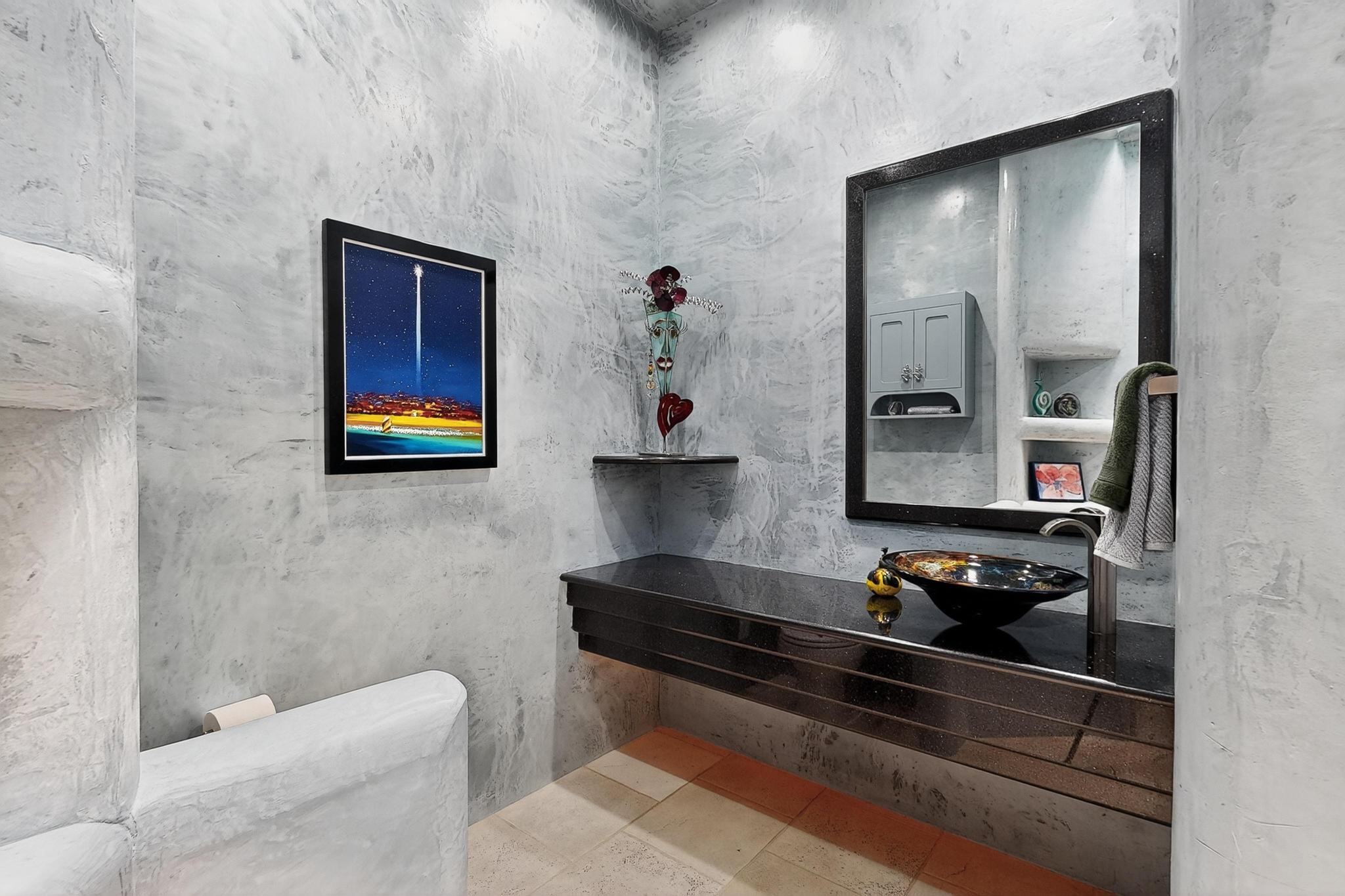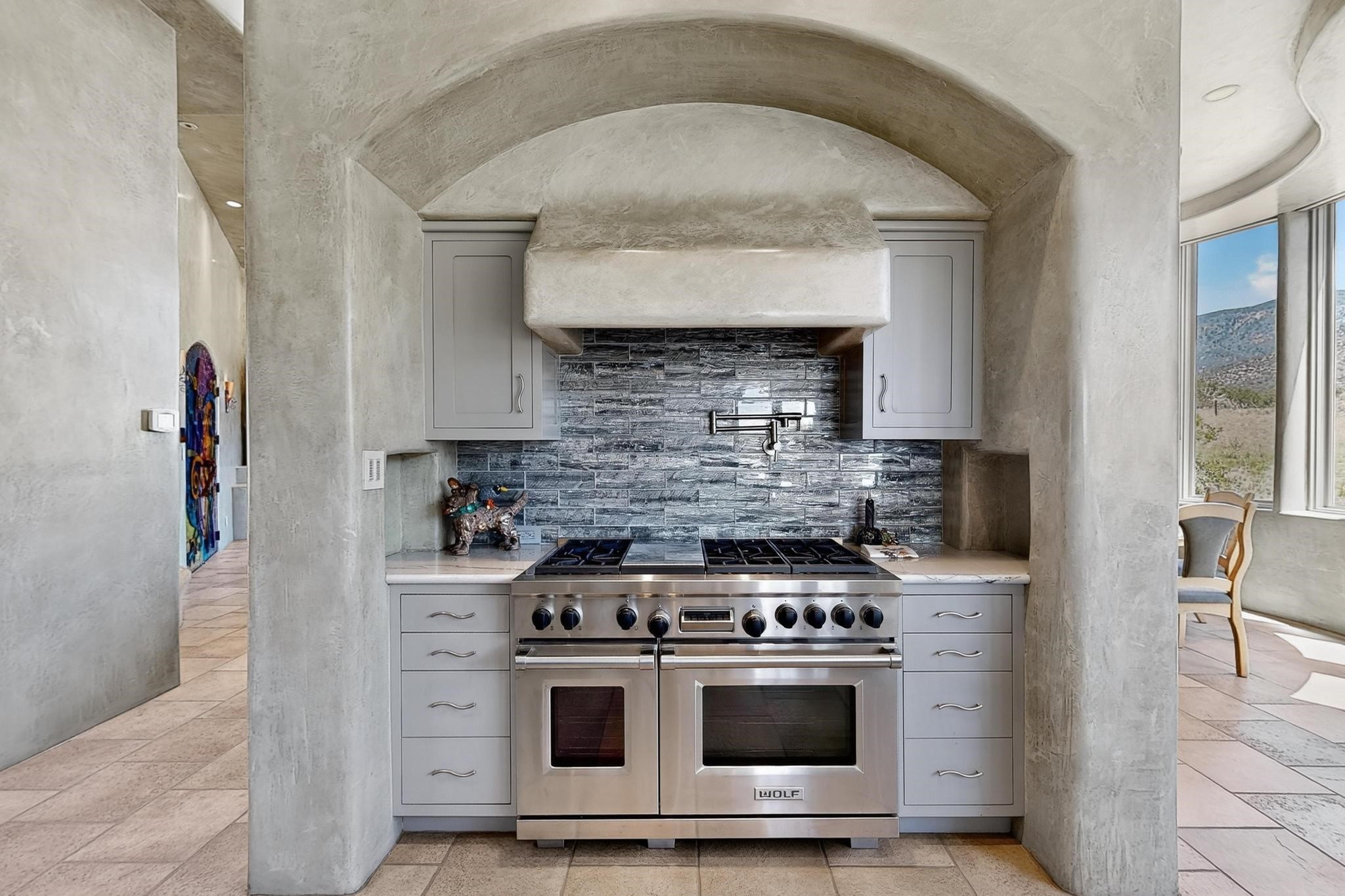 Perched at the pinnacle of High Desert, this extraordinary Custom Built luxury home sits on a private 2.37 acres lot and offers National Forest Views, unmatched privacy, and masterful design throughout. With 4 dedicated bedrooms, including a self-contained guest suite, plus two flexible rooms perfect for a home office and craft space, this home blends spacious living with thoughtful functionality. As you approach the home, you're greeted by an elegant water feature that flows beside a custom fire pit, creating a stunning and serene entry experience that sets the tone for the rest of the property. Bedrooms/Office all have window and balcony views. creating indoor-outdoor living and maximizing the incredible vistas. Designed for both elegance and practicality. Designed for both elegance and practicality, the home features 8 bathrooms (including 3 half baths and 2 three-quarter baths) and is adorned with hand-applied plaster walls by Frank D'Angelico that lend warmth and sophistication. The floor plan was thoughtfully crafted to provide ample wall space for showcasing art, ideal for collectors and design enthusiasts. Enjoy a dedicated theater room with a custom star ceiling designed to replicate a starry Albuquerque night in September, offering a truly immersive cinematic experience. Outside, a private pool serves as a tranquil escape, featuring an automatic cover and custom water features, including a bespoke downspout inspired by European spa architecture all operable at the touch of a button. Separate pool rooms provide convenient storage for pool toys and house the mechanical equipment. Comfort meets control with radiant floor heating and five refrigerated cooling units, all designed for efficiency and luxury. Each bedroom has independent climate controls, allowing for personalized heating and cooling throughout the home. A built-in, bank-grade safe offers secure storage for your most valuable possessions, while the chef's kitchen is outfitted with premium Wolf and Sub-Zero appliances, making it a culinary dream. From its elevated position with sweeping panoramic views to its impeccable craftsmanship and resort-style amenities, this is truly one of High Desert's most distinguished homes.