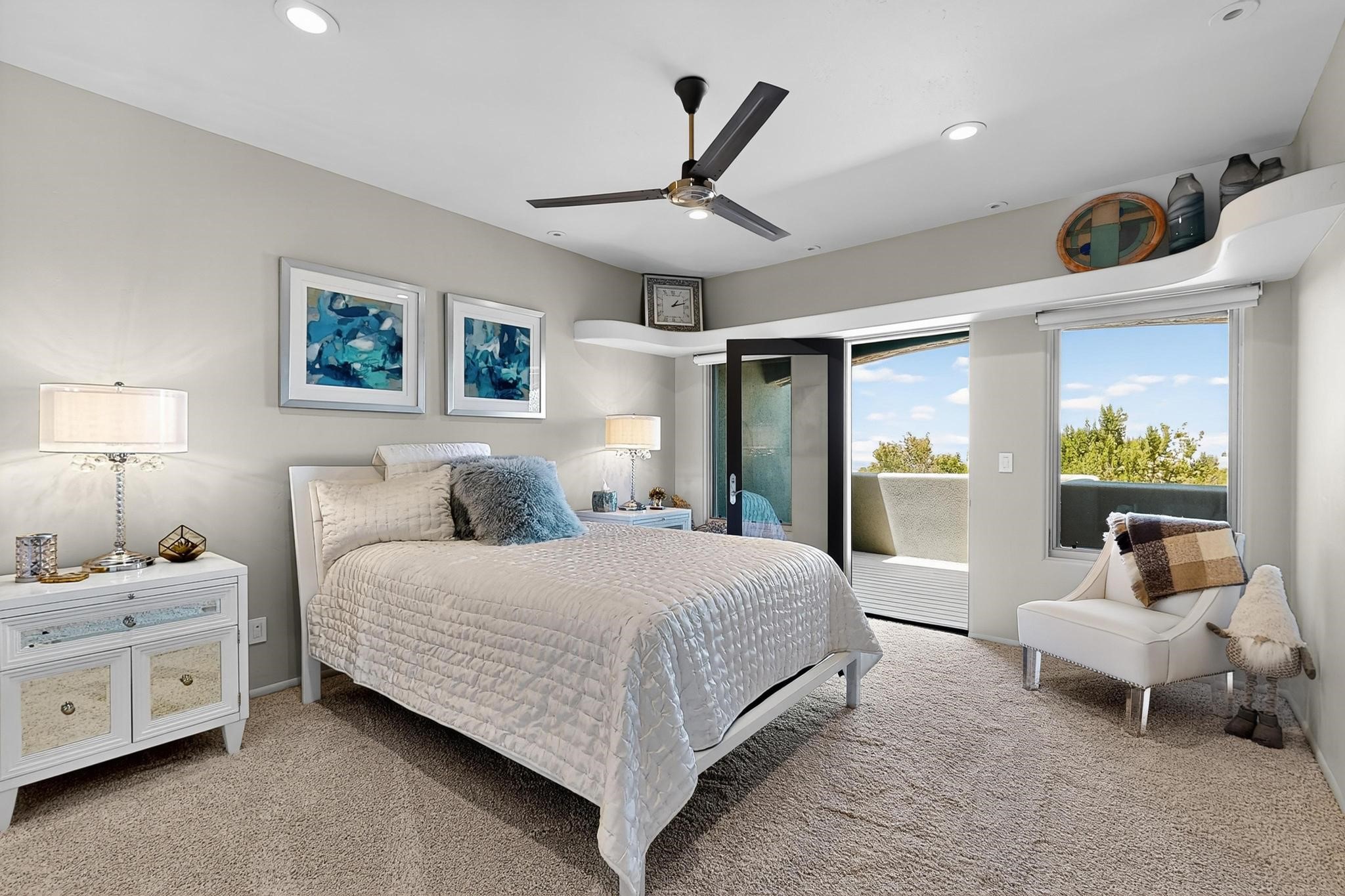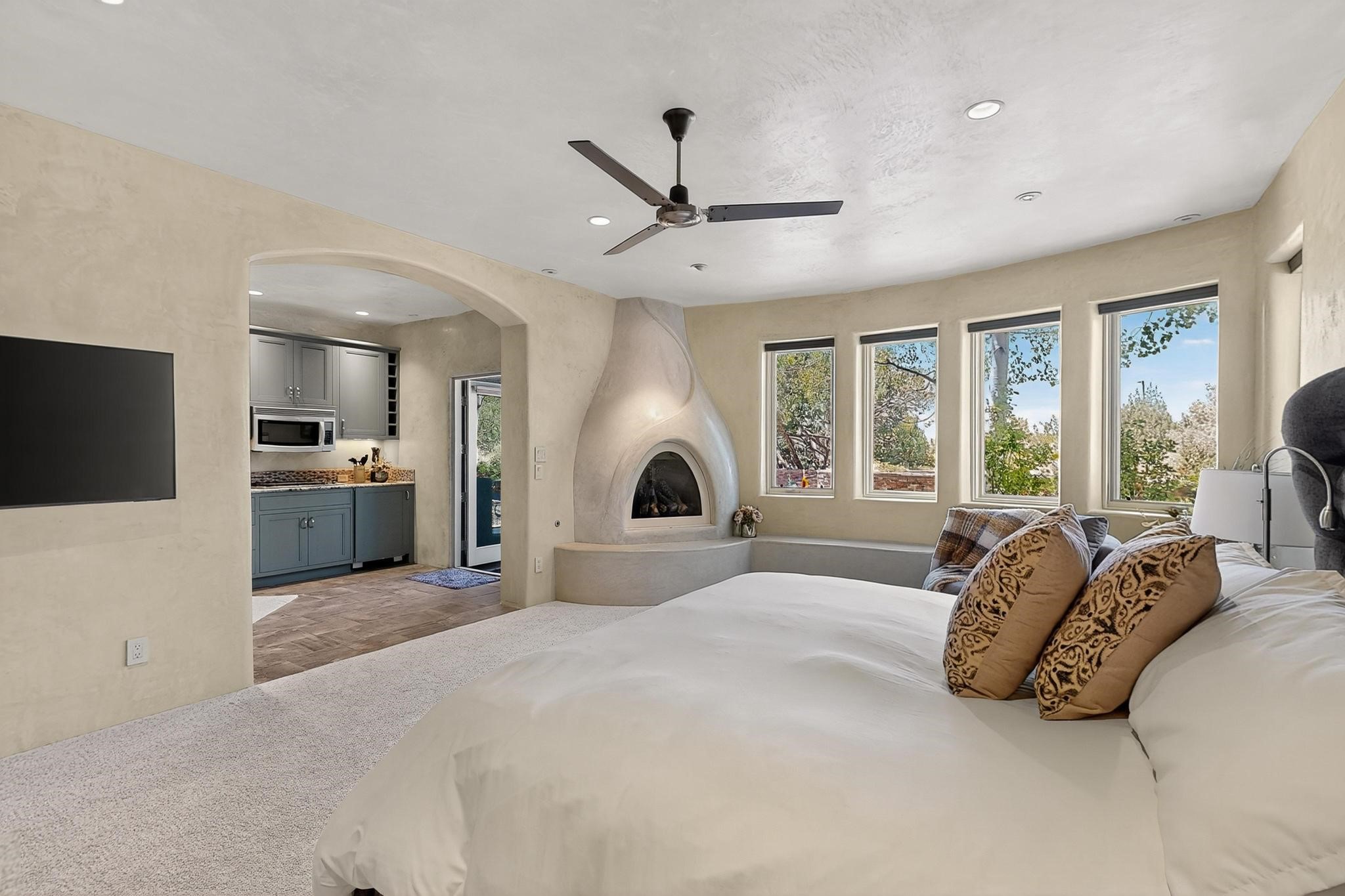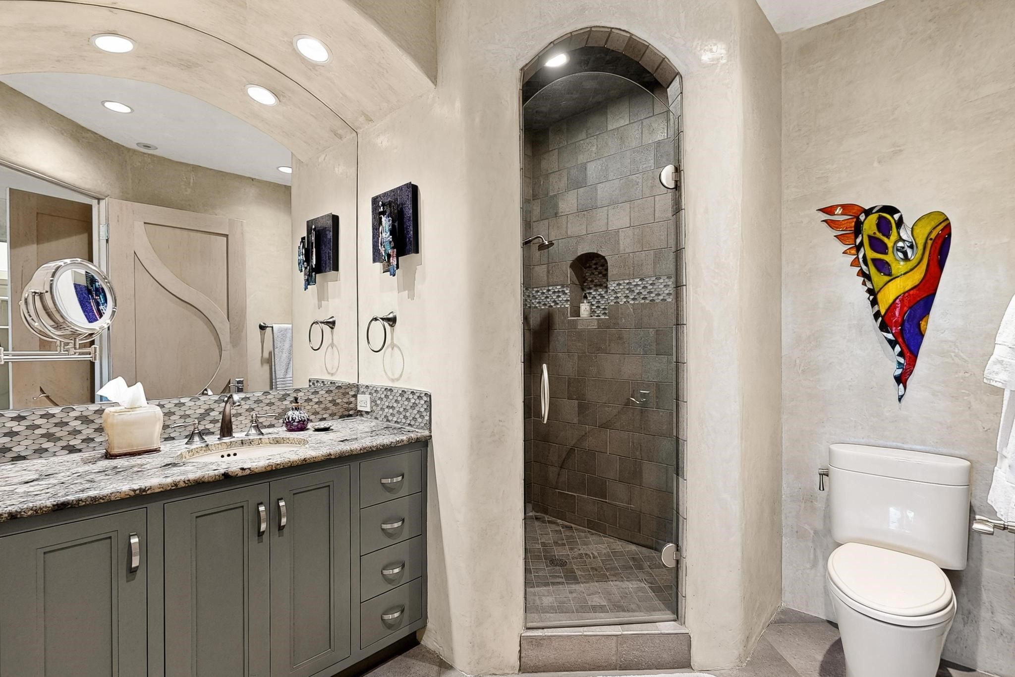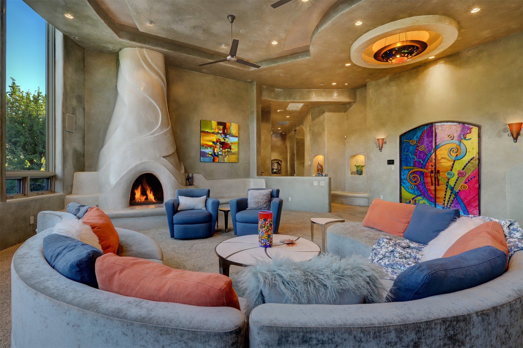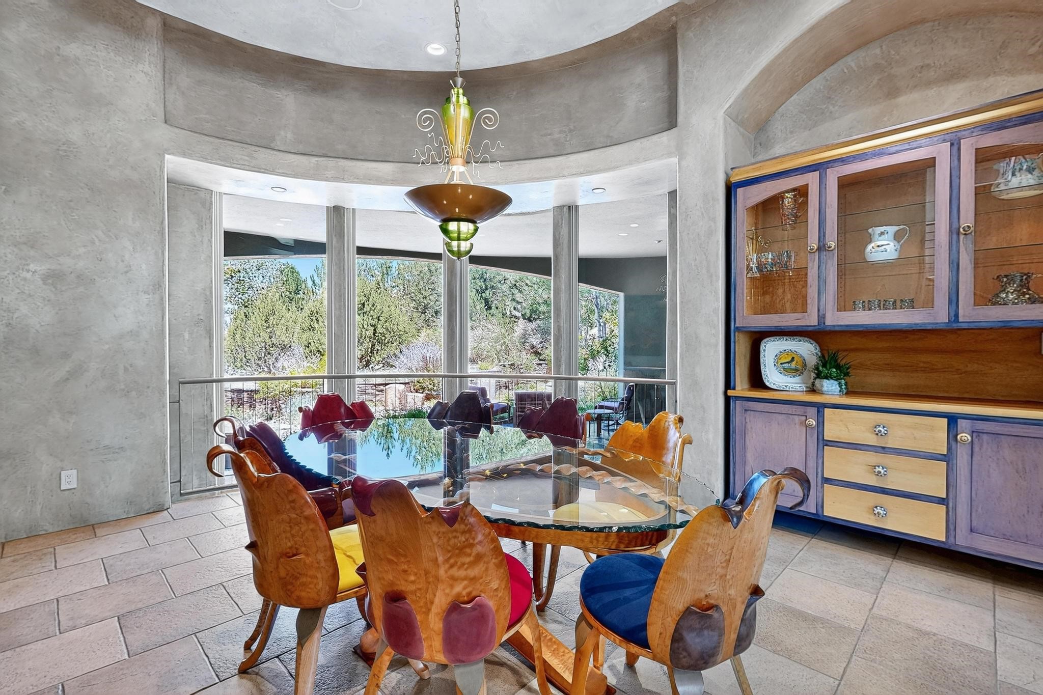 Perched at the pinnacle of High Desert, this extraordinary Custom Built luxury home sits on a private 2.37 acres lot and offers National Forest Views, unmatched privacy, and masterful design throughout. With 4 dedicated bedrooms, including a self-contained guest suite, plus two flexible rooms perfect for a home office and craft space, this home blends spacious living with thoughtful functionality. As you approach the home, you're greeted by an elegant water feature that flows beside a custom fire pit, creating a stunning and serene entry experience that sets the tone for the rest of the property. Bedrooms/Office all have window and balcony views. creating indoor-outdoor living and maximizing the incredible vistas. Designed for both elegance and practicality. Designed for both elegance and practicality, the home features 8 bathrooms (including 3 half baths and 2 three-quarter baths) and is adorned with hand-applied plaster walls by Frank D'Angelico that lend warmth and sophistication. The floor plan was thoughtfully crafted to provide ample wall space for showcasing art, ideal for collectors and design enthusiasts. Enjoy a dedicated theater room with a custom star ceiling designed to replicate a starry Albuquerque night in September, offering a truly immersive cinematic experience. Outside, a private pool serves as a tranquil escape, featuring an automatic cover and custom water features, including a bespoke downspout inspired by European spa architecture all operable at the touch of a button. Separate pool rooms provide convenient storage for pool toys and house the mechanical equipment. Comfort meets control with radiant floor heating and five refrigerated cooling units, all designed for efficiency and luxury. Each bedroom has independent climate controls, allowing for personalized heating and cooling throughout the home. A built-in, bank-grade safe offers secure storage for your most valuable possessions, while the chef's kitchen is outfitted with premium Wolf and Sub-Zero appliances, making it a culinary dream. From its elevated position with sweeping panoramic views to its impeccable craftsmanship and resort-style amenities, this is truly one of High Desert's most distinguished homes.