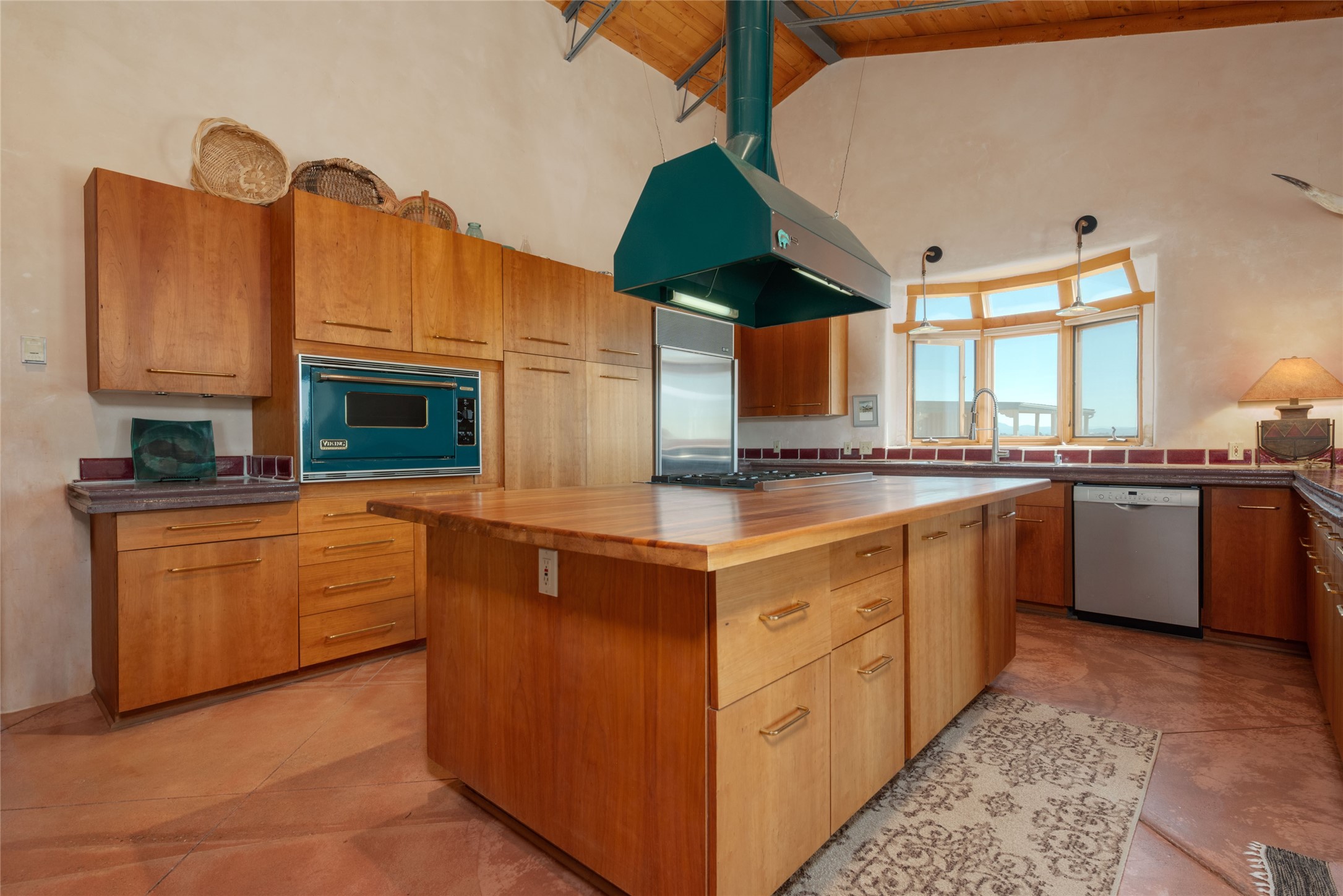 Just minutes from the vibrant City of Santa Fe begins the legendary Turquoise Trail. The iconic and historic byway is the location of this artistically inspired compound. Just minutes from all the conveniences of the City Different but a world away. Sited on a private and fully fenced 5.5 acre parcel the property enjoys expansive vistas, mountain views and dark night skies. The main house features strawbale construction with high cathedral wood deck and exposed steel truss ceilings. The interior walls are hard-trowelled plaster, the floors exposed concrete, and the countertops cast-in-place. The open-floor plan and numerous windows and patio doors invite the natural light while offering a great space for entertaining or just chilling. The chef's kitchen features a 6-burner Viking gas cooktop, Viking dual-burner convection oven, Viking compactor, Sub-Zero refrigerator/freezer, and Bosch dishwasher. Counterspace is beyond generous on the large island, extended counters and peninsula with casual dining bar. The primary bedroom opens to the courtyard and includes a spacious walk-through closet. The primary bath features a resort-sized walk-in shower. A jetted tub in the second bath awaits the end of the day. The stand-alone casita is close enough for convenience but separate enough for privacy. Ideal for visitors or rental income, it's cozy, modern and light-filled. The property also includes a finished garage & studio space, plus carport. The infrastructure includes roof-mounted Solar PV panels and a 3 ac/ft private well. There's plenty of room on the property to add your barn or other improvements. Santa Fe shopping, dining, and medical facilities are just minutes away, as is the Santa Fe airport and I-25 access.