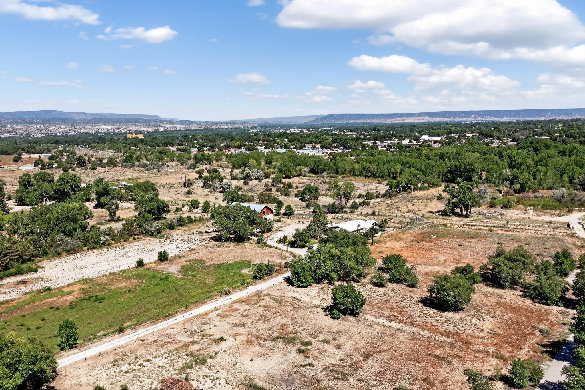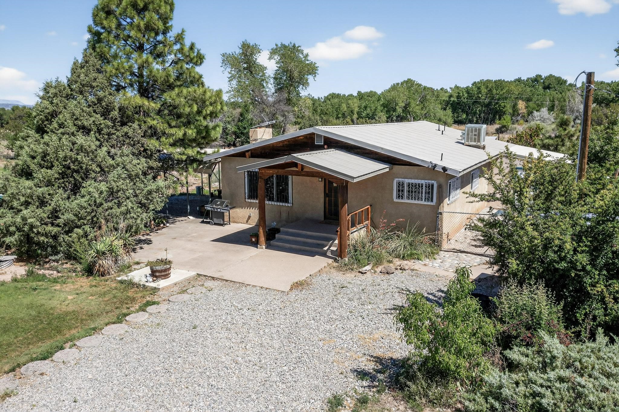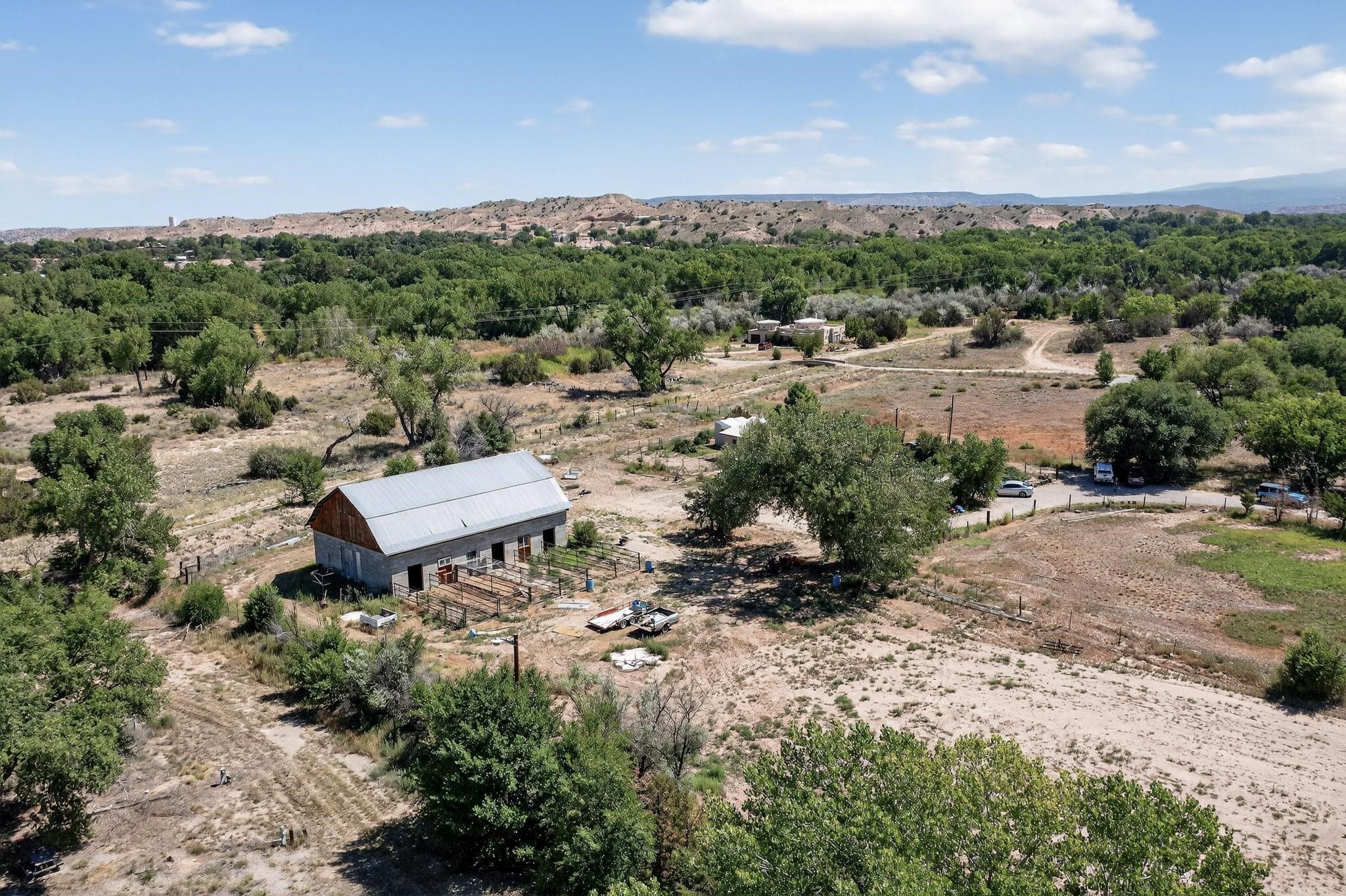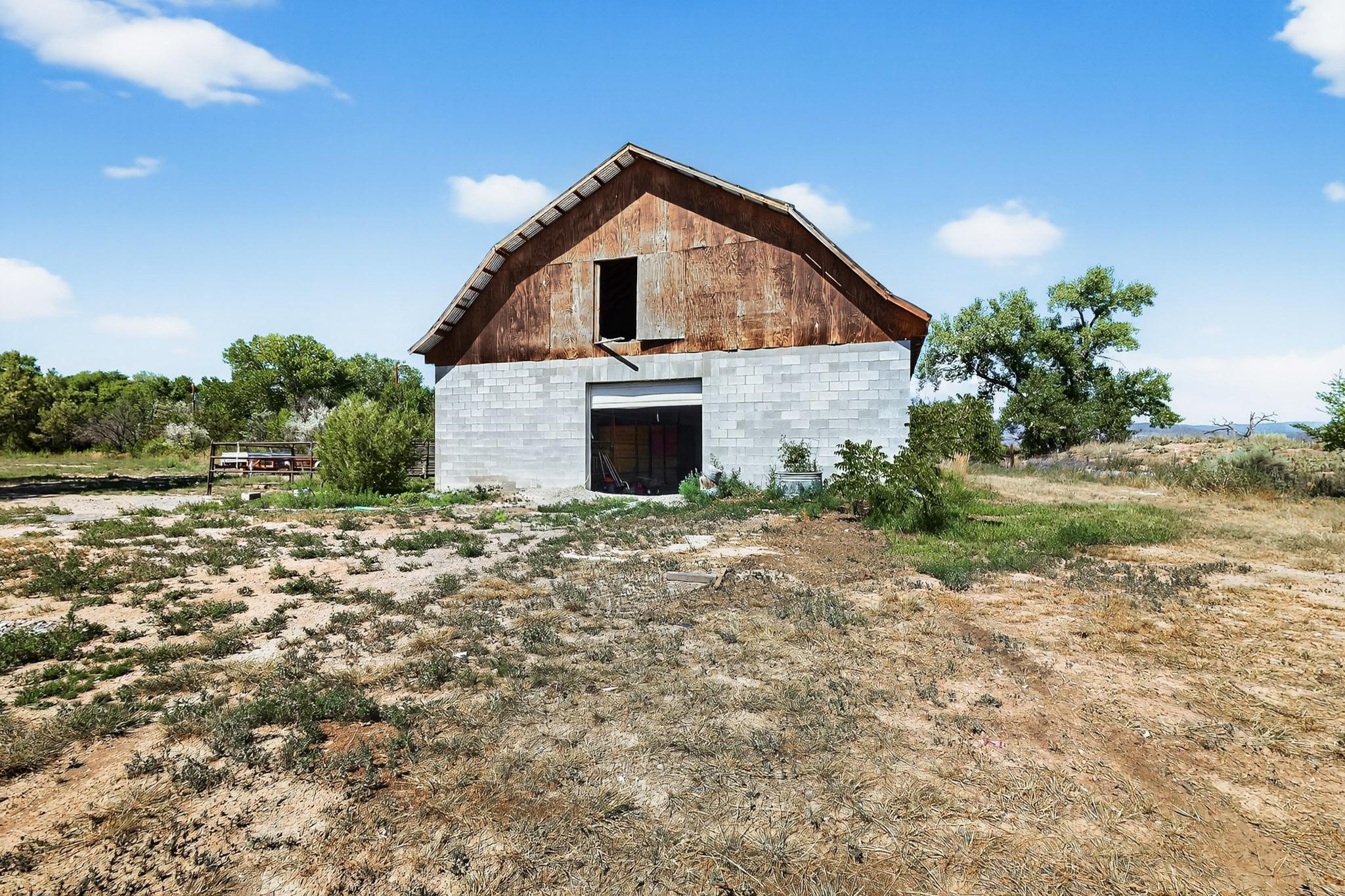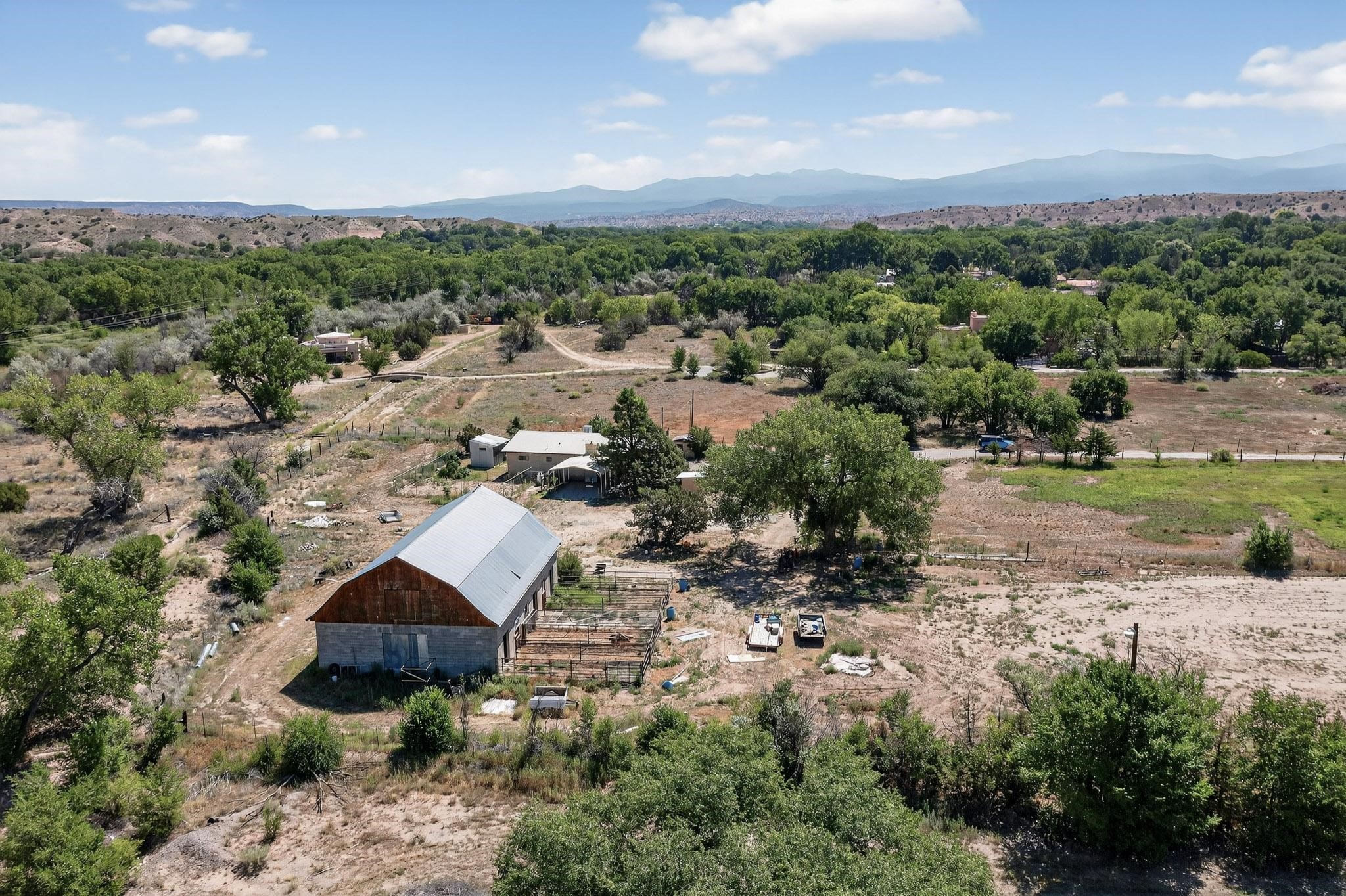 Tucked away in a serene, private haven far from the hustle and bustle, but only 23 miles from Santa Fe, and 21 miles from Los Alamos, this 5.04-acre horse property weaves together rural charm and modern comfort. Enveloped by lush, irrigated land and shaded by towering cottonwood trees, the estate offers a tranquil retreat perfect for those craving peaceful solitude. The property consist of four separate but adjoining parcels, with a well-maintained large barn that stands ready for equestrian pursuits or hobbies, while secure water rights ensure the vibrant pastures and greenery thrive year-round. Scattered across the property, fruit trees yield seasonal delights, adding a touch of homesteading allure. At the heart of this oasis lies a converted and expanded 3-bedroom, 2-bathroom manufactured home. Whether you're an equestrian enthusiast, a nature lover, or simply seeking a secluded sanctuary, this remarkable property invites you to embrace a life of tranquility and endless possibilities. Schedule a showing today to discover this rare gem! Neither seller nor broker warrant any listing information. Areas that are of matrial interest should be independently verified by the buyer.