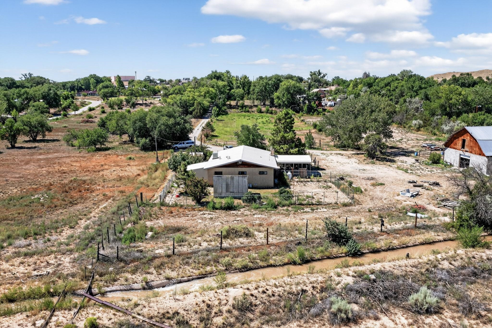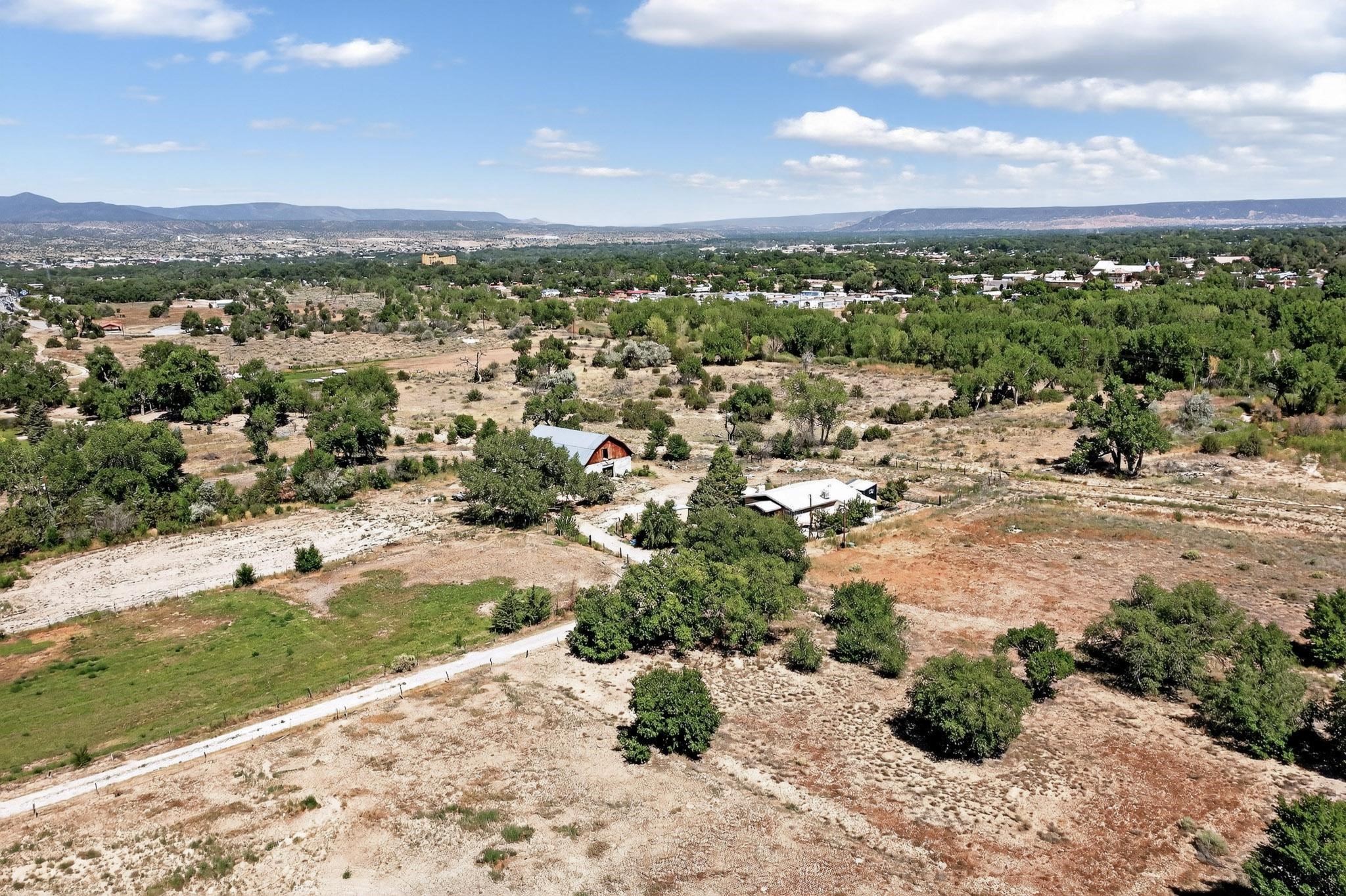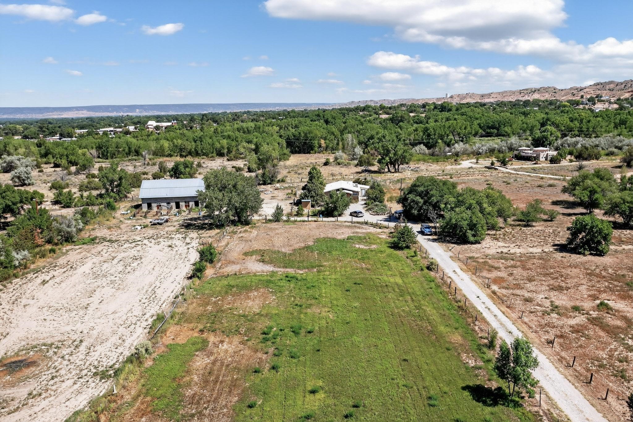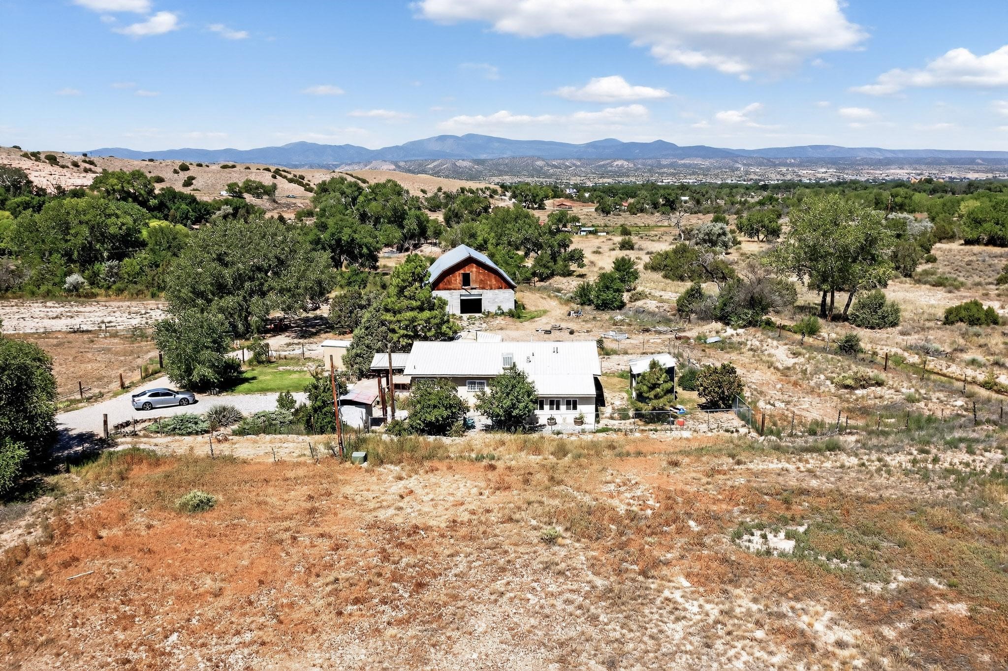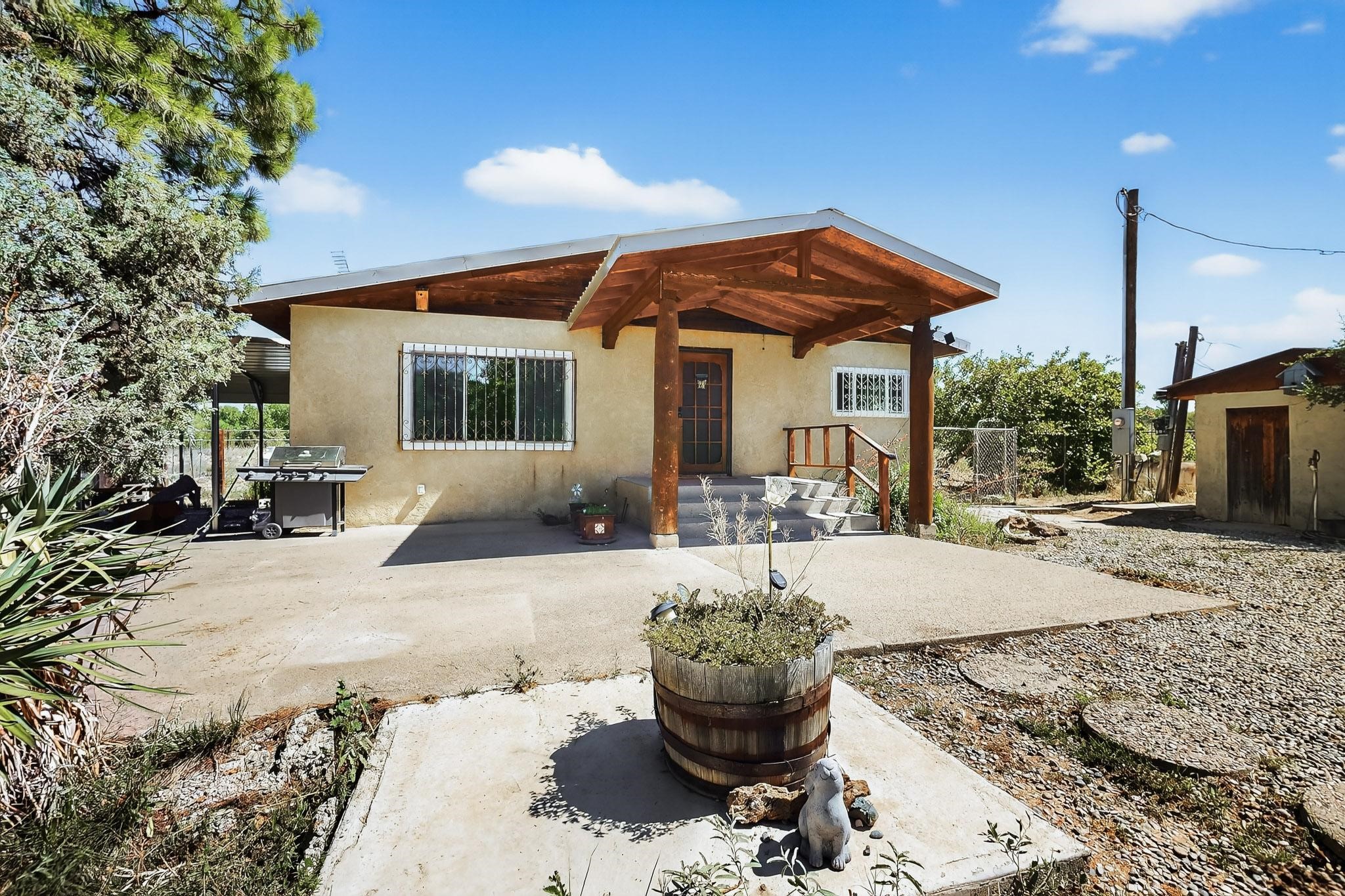 Tucked away in a serene, private haven far from the hustle and bustle, but only 23 miles from Santa Fe, and 21 miles from Los Alamos, this 5.04-acre horse property weaves together rural charm and modern comfort. Enveloped by lush, irrigated land and shaded by towering cottonwood trees, the estate offers a tranquil retreat perfect for those craving peaceful solitude. The property consist of four separate but adjoining parcels, with a well-maintained large barn that stands ready for equestrian pursuits or hobbies, while secure water rights ensure the vibrant pastures and greenery thrive year-round. Scattered across the property, fruit trees yield seasonal delights, adding a touch of homesteading allure. At the heart of this oasis lies a converted and expanded 3-bedroom, 2-bathroom manufactured home. Whether you're an equestrian enthusiast, a nature lover, or simply seeking a secluded sanctuary, this remarkable property invites you to embrace a life of tranquility and endless possibilities. Schedule a showing today to discover this rare gem! Neither seller nor broker warrant any listing information. Areas that are of matrial interest should be independently verified by the buyer.