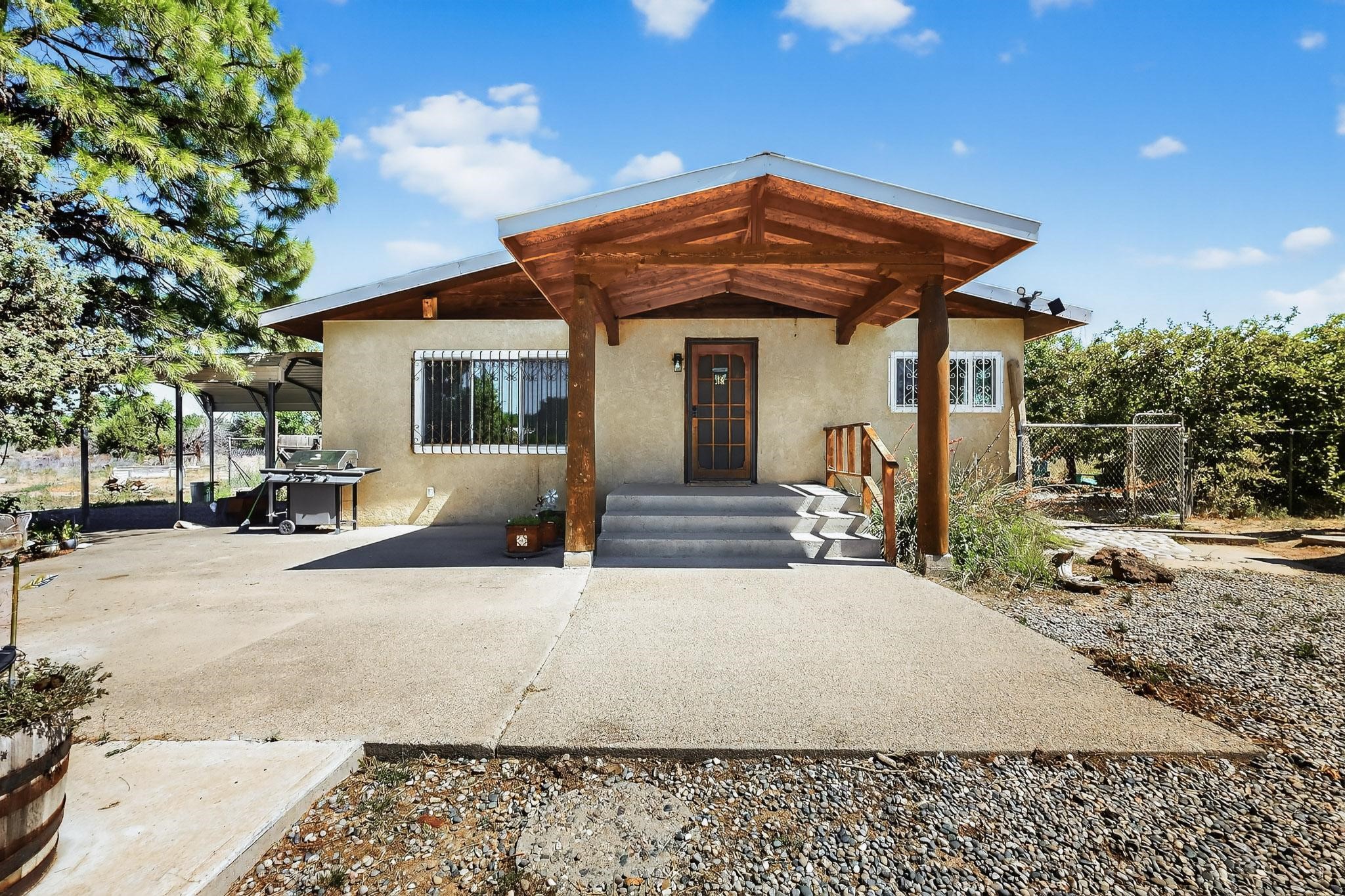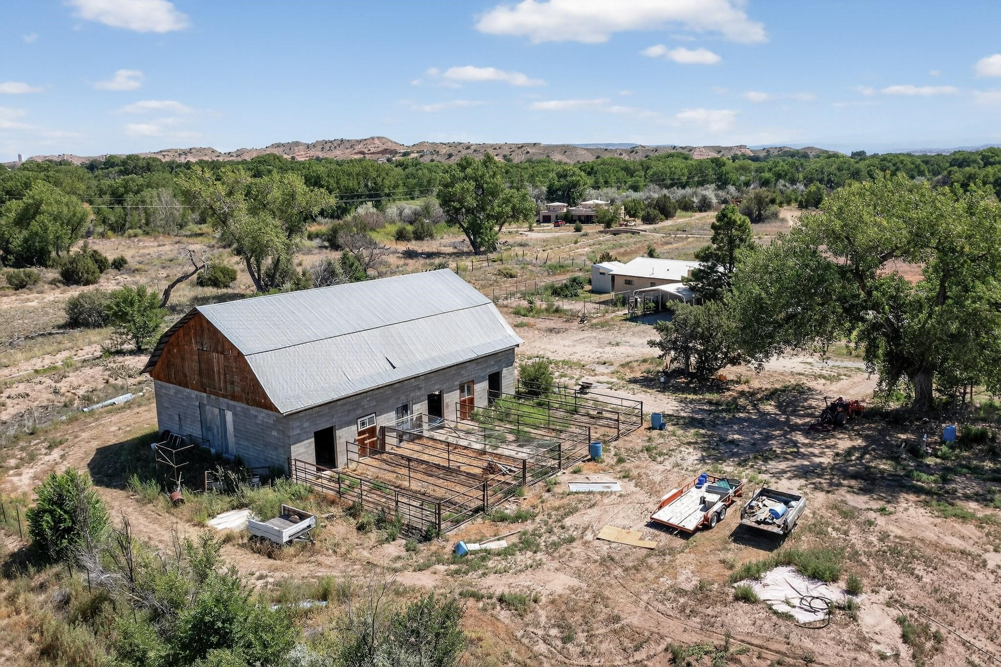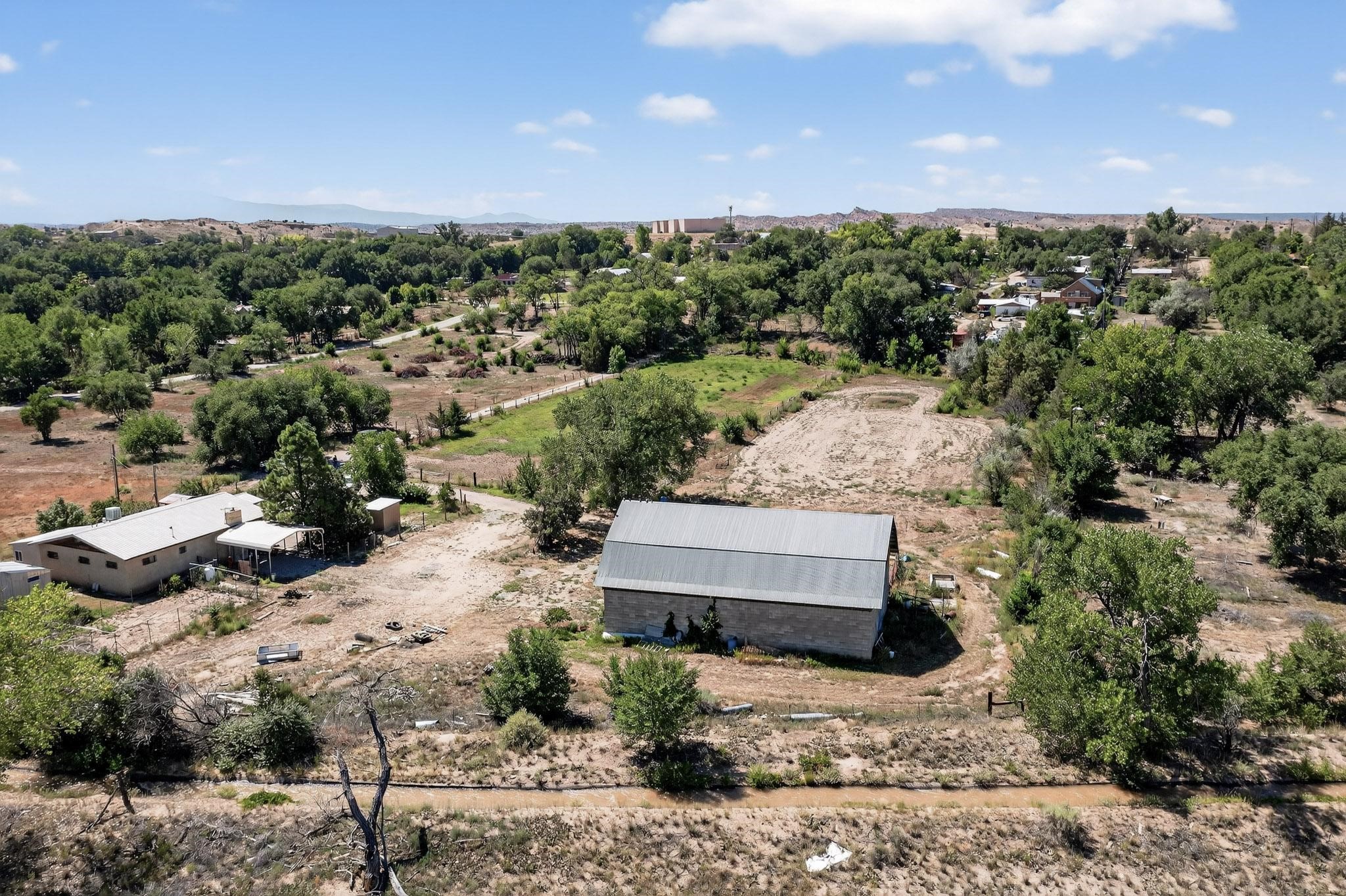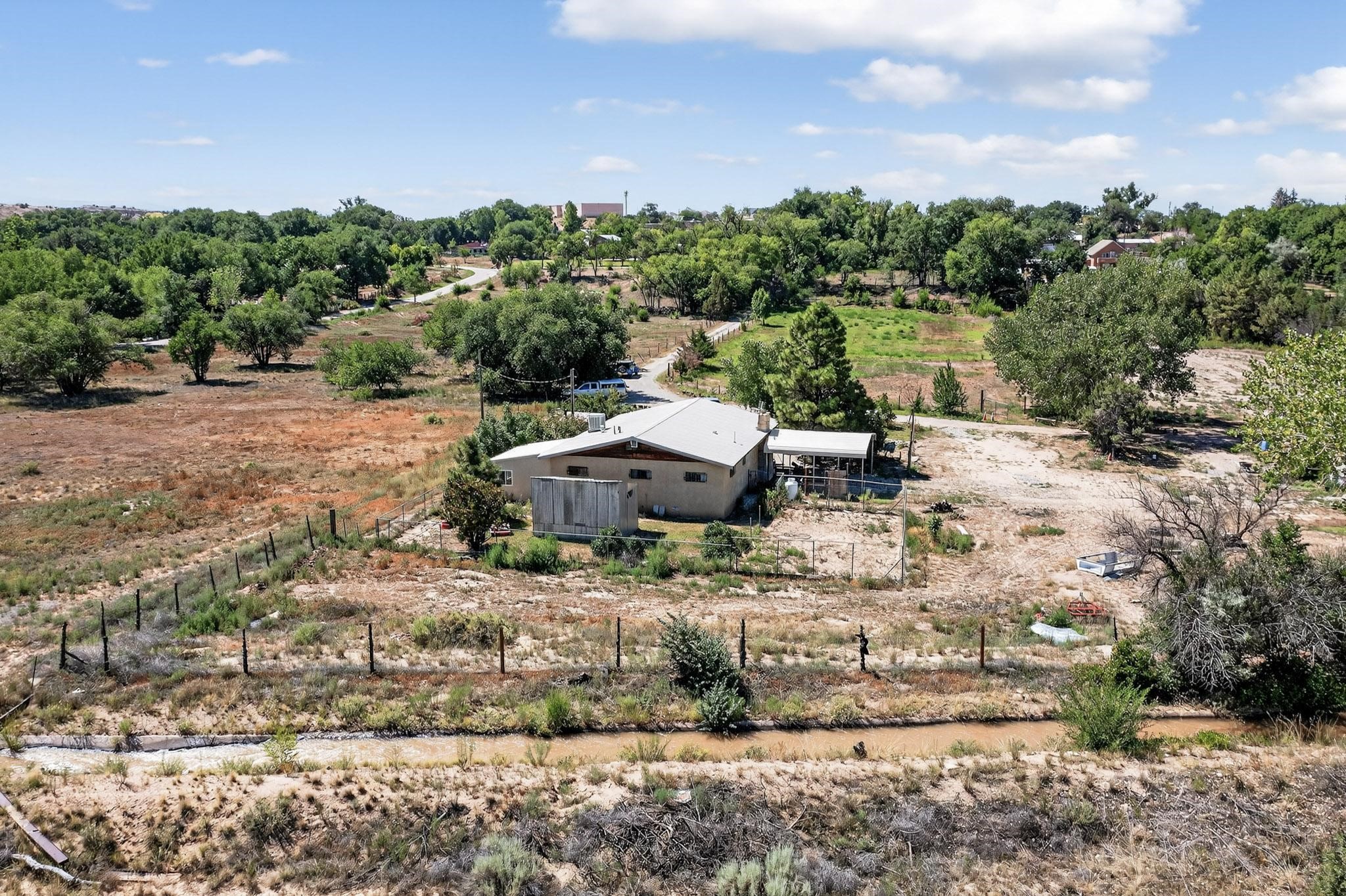 Tucked away in a serene, private haven far from the hustle and bustle, but only 23 miles from Santa Fe, and 21 miles from Los Alamos, this 5.04-acre horse property weaves together rural charm and modern comfort. Enveloped by lush, irrigated land and shaded by towering cottonwood trees, the estate offers a tranquil retreat perfect for those craving peaceful solitude. The property consist of four separate but adjoining parcels, with a well-maintained large barn that stands ready for equestrian pursuits or hobbies, while secure water rights ensure the vibrant pastures and greenery thrive year-round. Scattered across the property, fruit trees yield seasonal delights, adding a touch of homesteading allure. At the heart of this oasis lies a converted and expanded 3-bedroom, 2-bathroom manufactured home. Whether you're an equestrian enthusiast, a nature lover, or simply seeking a secluded sanctuary, this remarkable property invites you to embrace a life of tranquility and endless possibilities. Schedule a showing today to discover this rare gem! Neither seller nor broker warrant any listing information. Areas that are of matrial interest should be independently verified by the buyer.