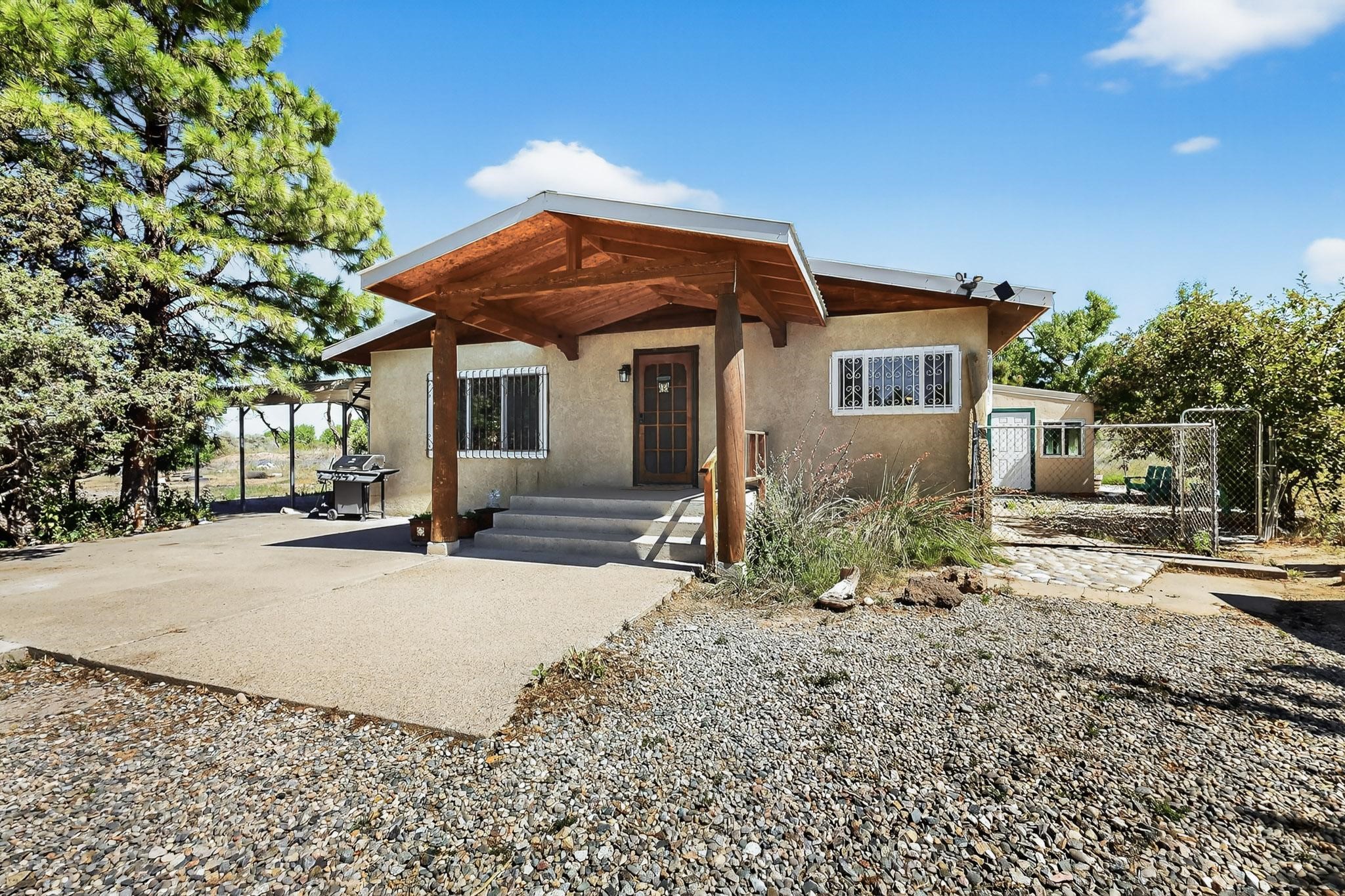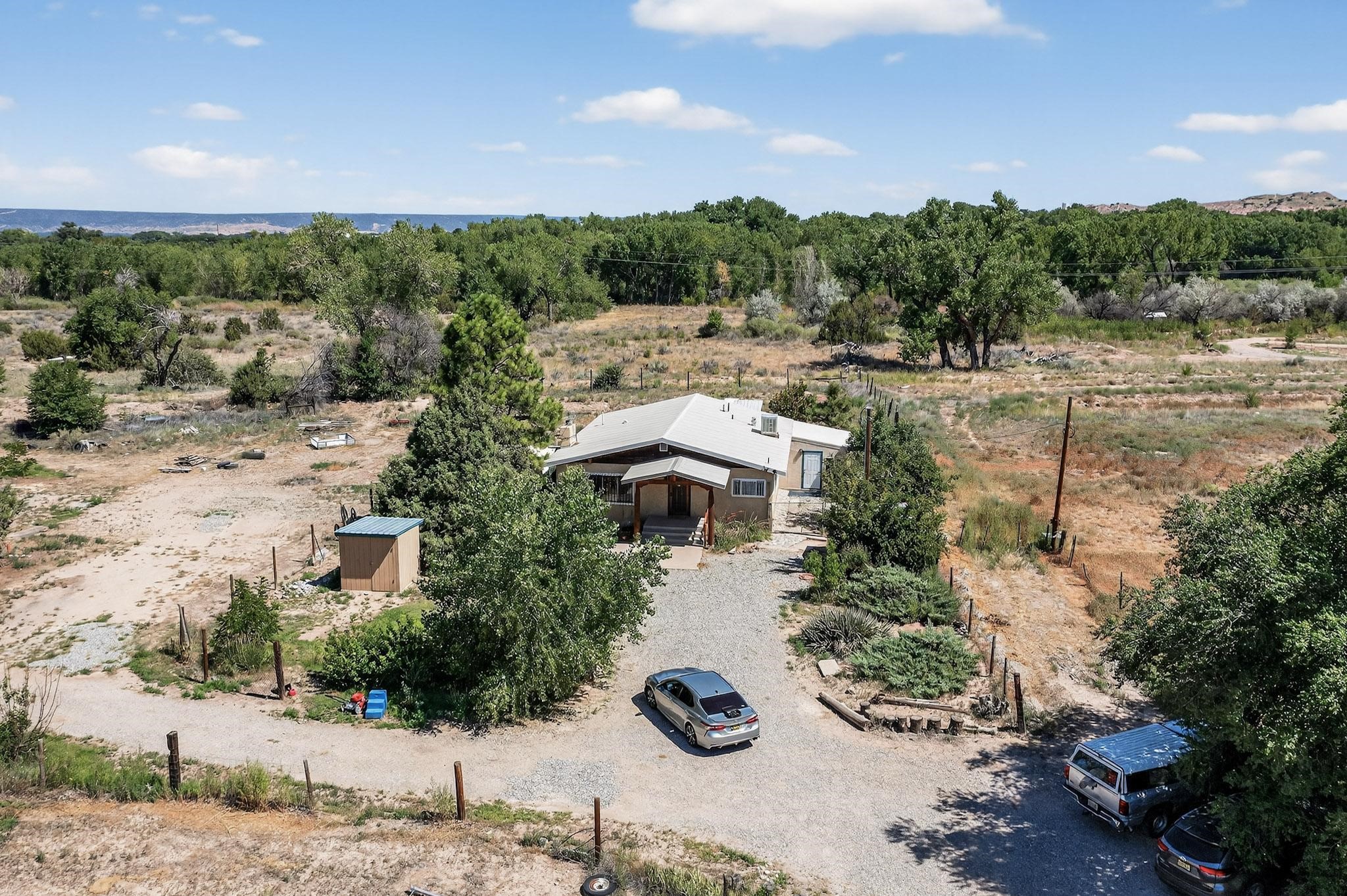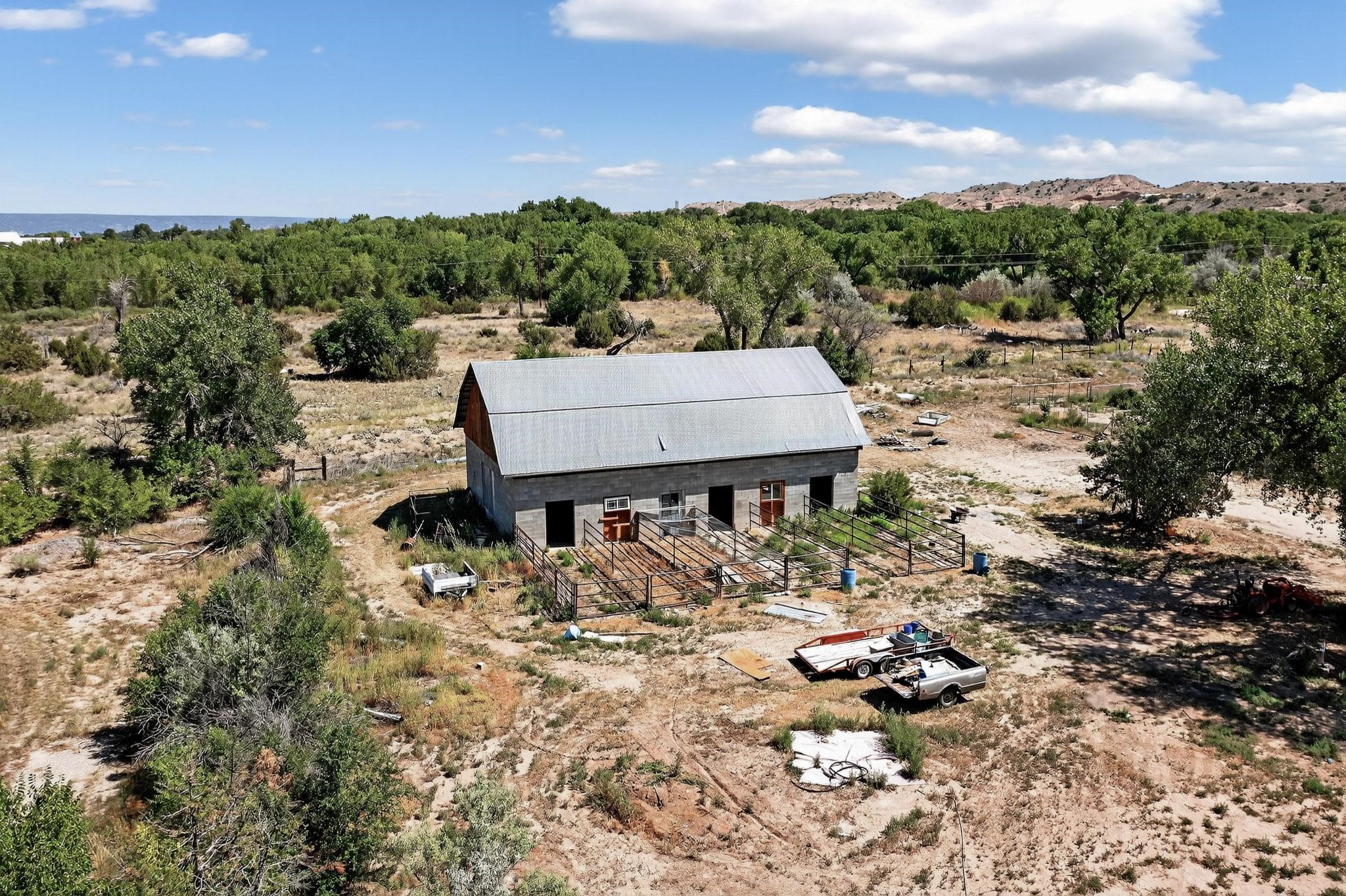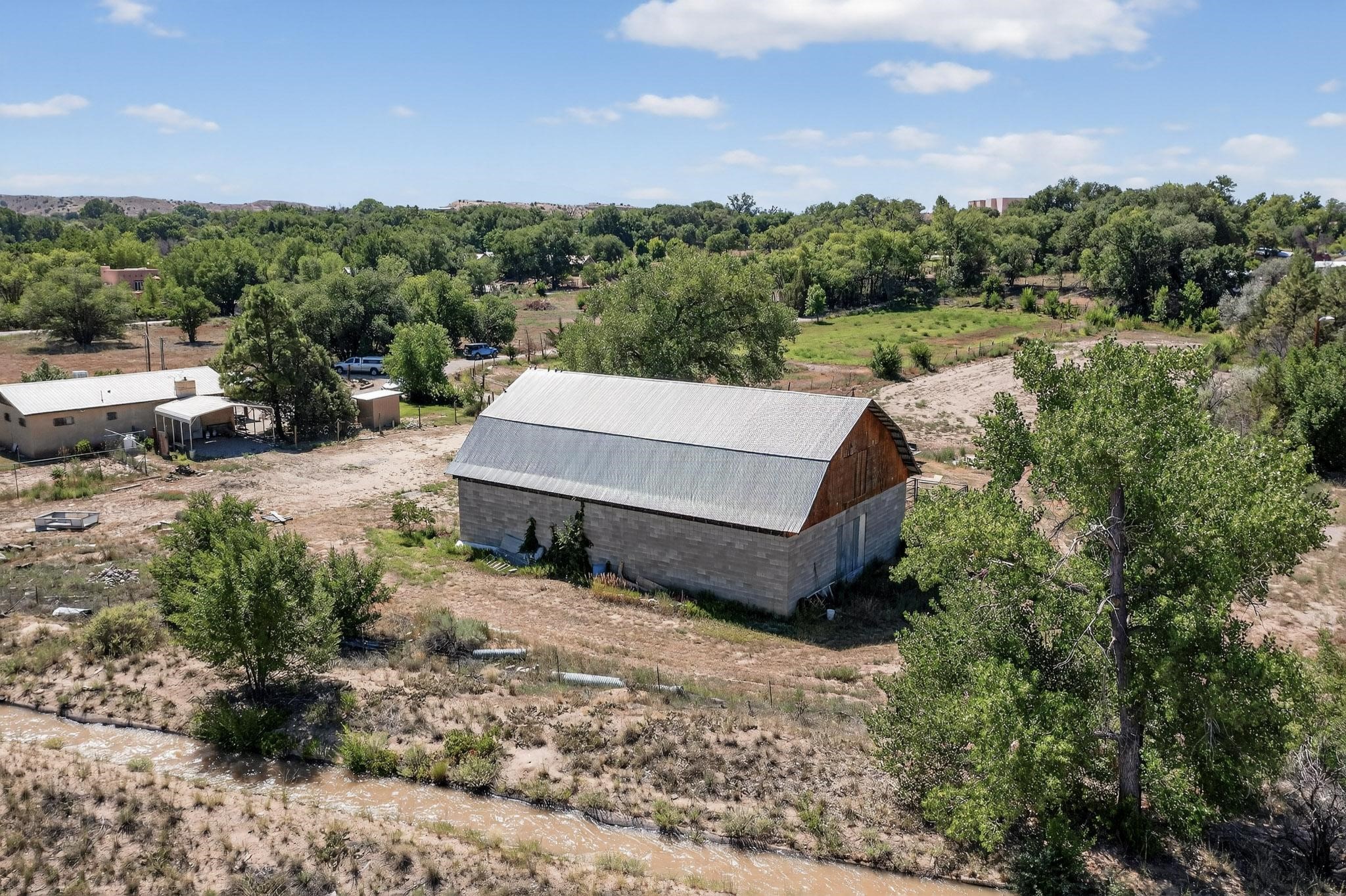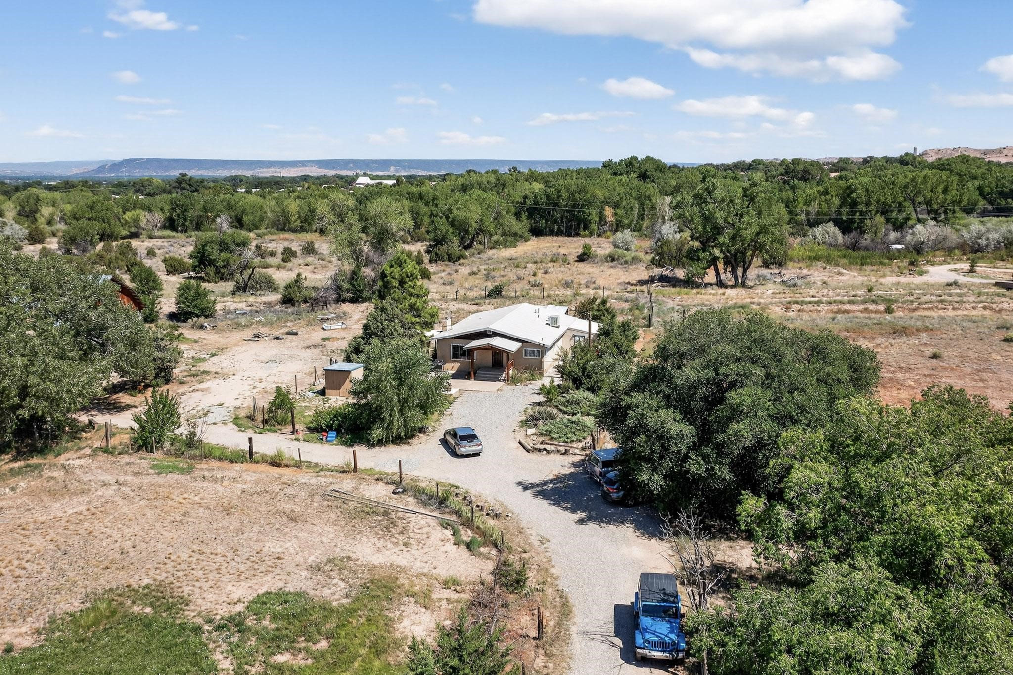 Tucked away in a serene, private haven far from the hustle and bustle, but only 23 miles from Santa Fe, and 21 miles from Los Alamos, this 5.04-acre horse property weaves together rural charm and modern comfort. Enveloped by lush, irrigated land and shaded by towering cottonwood trees, the estate offers a tranquil retreat perfect for those craving peaceful solitude. The property consist of four separate but adjoining parcels, with a well-maintained large barn that stands ready for equestrian pursuits or hobbies, while secure water rights ensure the vibrant pastures and greenery thrive year-round. Scattered across the property, fruit trees yield seasonal delights, adding a touch of homesteading allure. At the heart of this oasis lies a converted and expanded 3-bedroom, 2-bathroom manufactured home. Whether you're an equestrian enthusiast, a nature lover, or simply seeking a secluded sanctuary, this remarkable property invites you to embrace a life of tranquility and endless possibilities. Schedule a showing today to discover this rare gem! Neither seller nor broker warrant any listing information. Areas that are of matrial interest should be independently verified by the buyer.