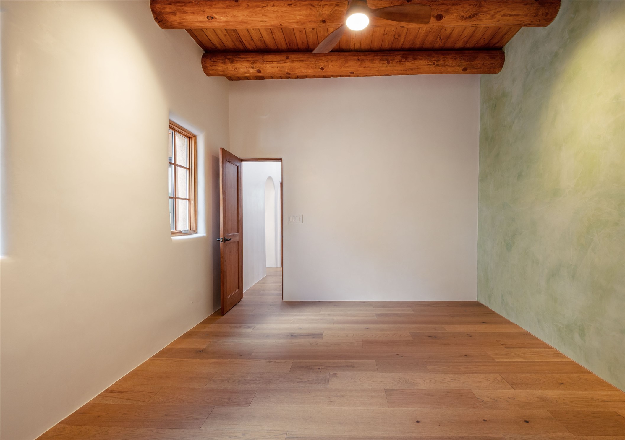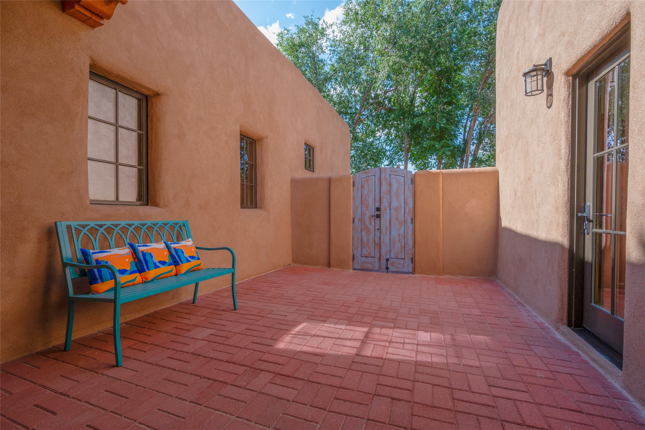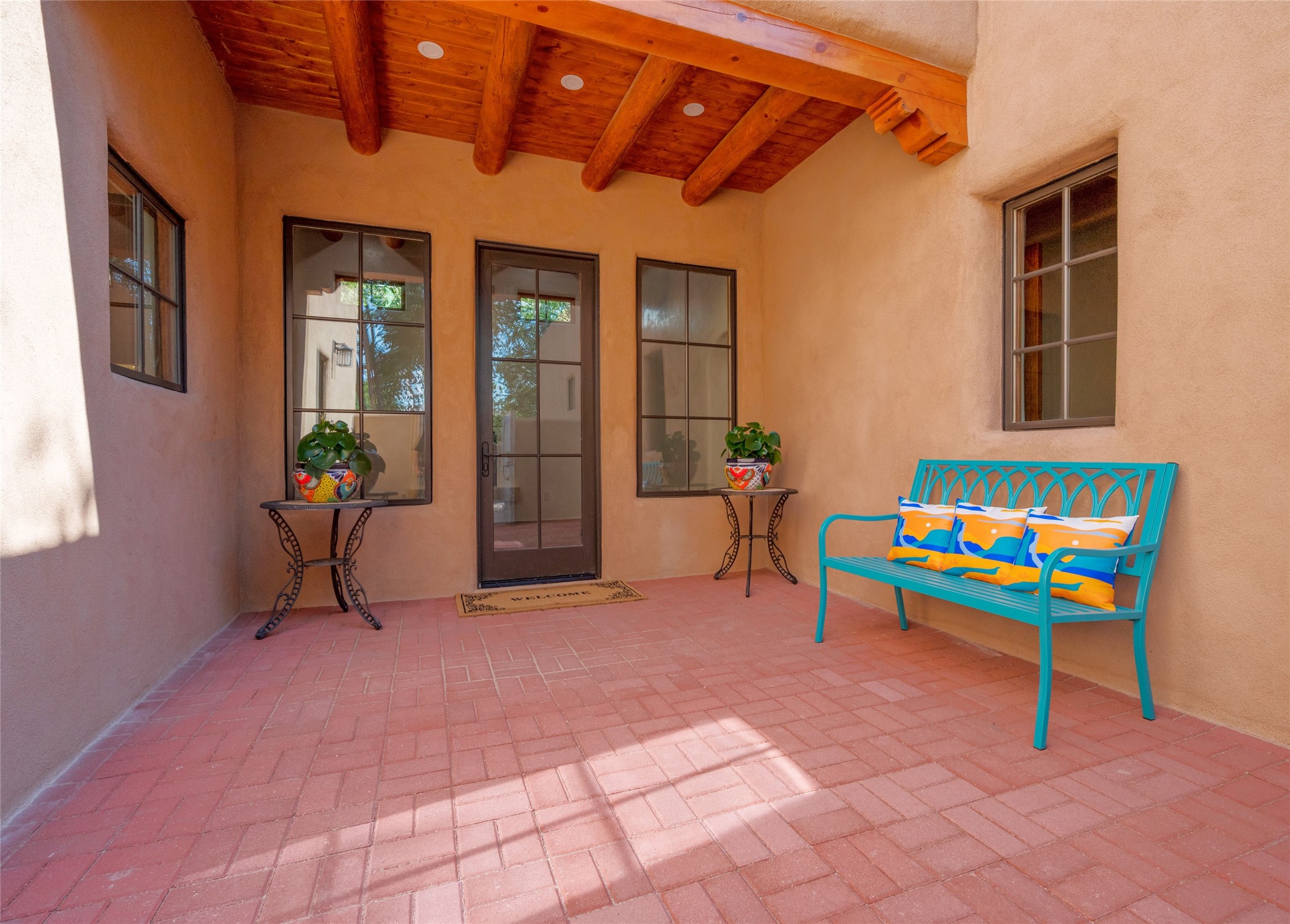 New construction throughout with a beautifully designed and hand-crafted adobe remodel and addition, this home blends classic Santa Fe style with modern comfort. A charming private courtyard greets you before the front door opens to a light-filled living room with high ceilings, exposed vigas, hand-troweled plaster walls, wood floors, and a custom-designed fireplace with quartz stone mantles. The gourmet kitchen features custom Alder cabinets, a built-in Wolf cooktop and oven, Fisher & Paykel refrigerator/freezer, Bosch dishwasher, quartz stone countertops, custom hardware and lighting, and travertine stone tile floors. The thoughtful three-bedroom, two-bath floor plan provides excellent separation between the luxurious primary suite and the additional bedrooms. One bedroom, located near the kitchen with its own entrance, offers flexibility for guests or use as a home office/den, with easy access to the courtyard. The primary suite exudes a spa-like feel, with warm plaster tones, natural wood finishes, custom Alder cabinetry and vanities, Italian porcelain tile surrounds, quartz countertops, a whirlpool bath, and a Kohler shower with body sprays. Additional bath features include mirrored, lighted anti-fog cabinets, a built-in makeup table with a lighted mirror, and elegant fixtures throughout. Other highlights include a custom-built entry gate, solid Alder doors, refrigerated air conditioning and heating, Pella windows, and Hunter Douglas blinds. Ideal as a full-time residence or a Santa Fe getaway, this home combines craftsmanship, comfort, and style in a prime location.