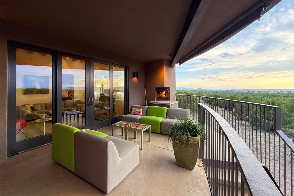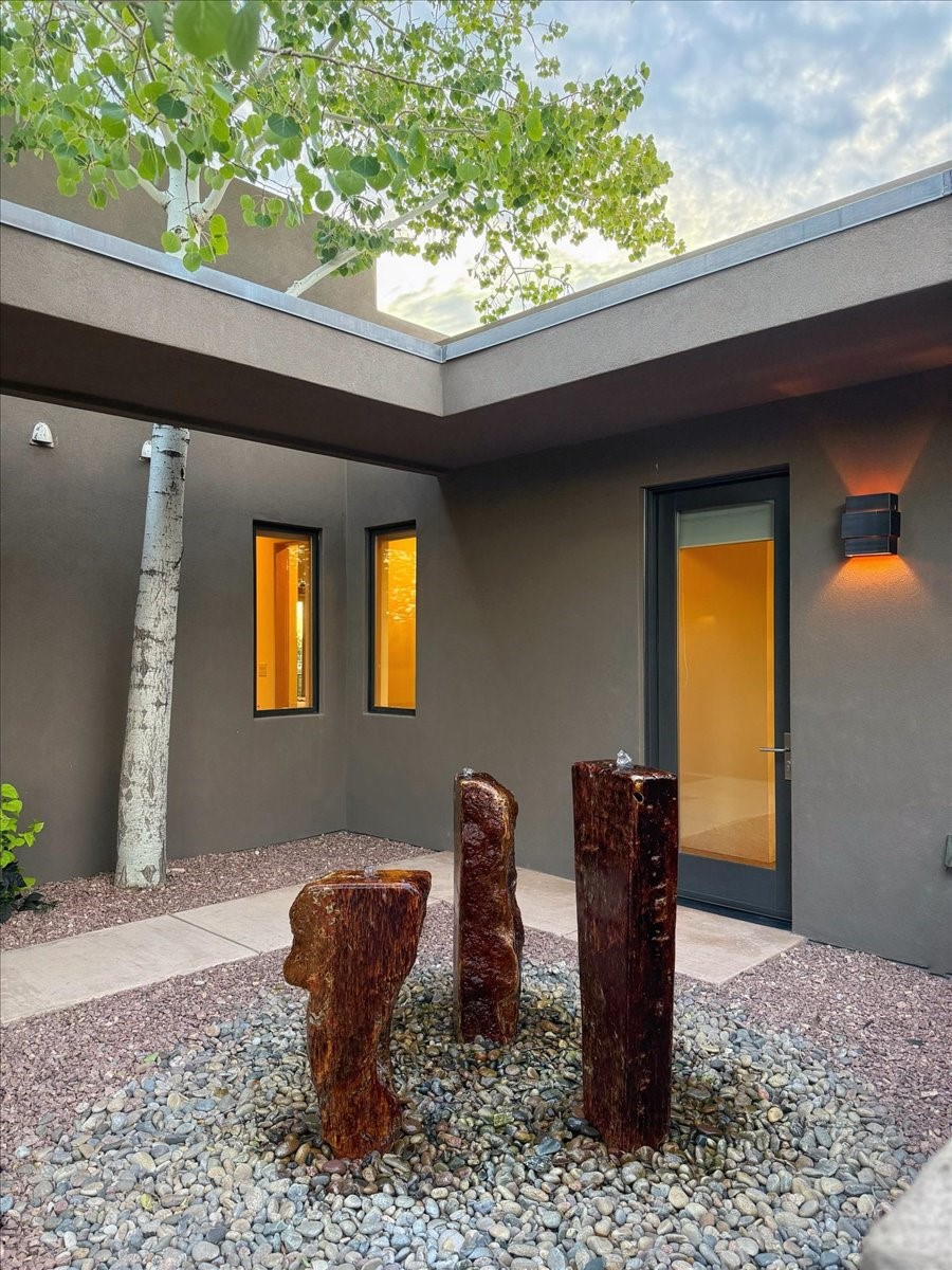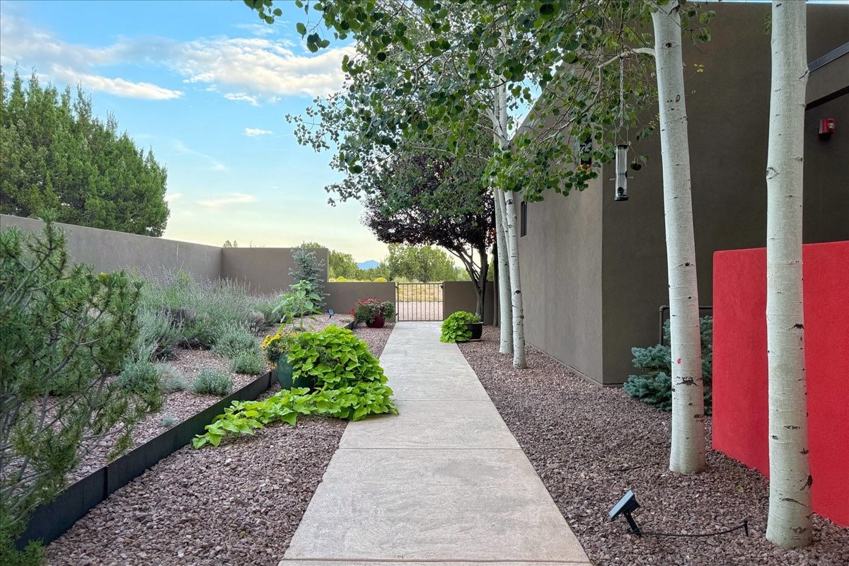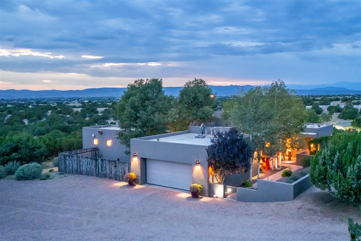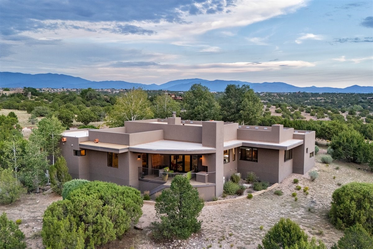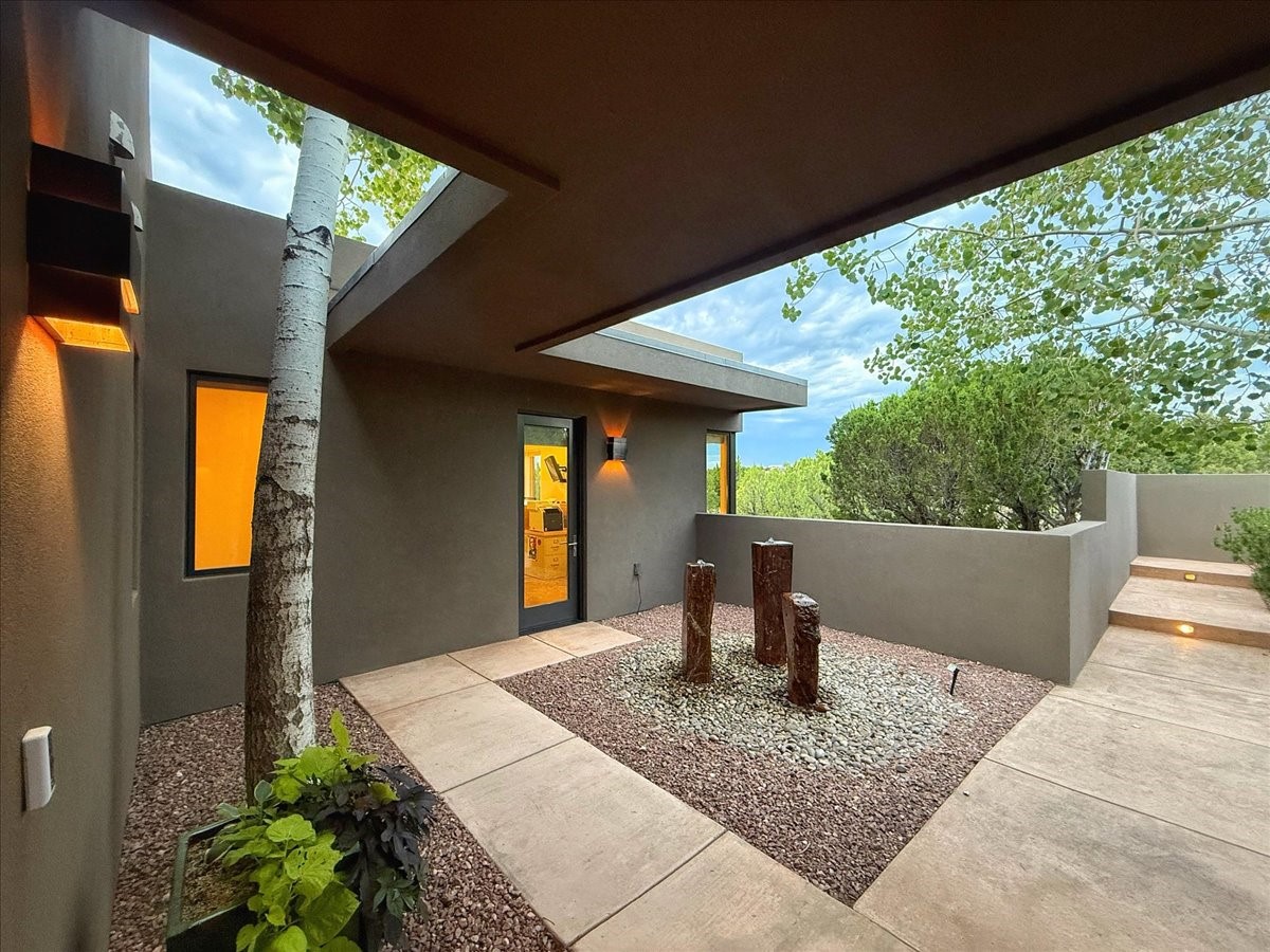 Welcome to this exceptional single-level, custom-built, contemporary-style home, featuring 2,528 sq. ft. of mindfully designed living space on 3.16 acres in the sought-after Tierra Grande subdivision, ~15 minutes from downtown Santa Fe. The home is strategically sited to capture the breathtaking panoramic views from the Jemez to the Sangre de Cristo mountains. This 3-bedroom, 3-bath residence (1 full, 1 three-quarter, and 1 half) boasts a thoughtfully designed floor plan that provides ideal separation between the primary suite and guest suites, offering both privacy and comfort. Blending timeless elegance with everyday livability, the home showcases exceptional craftsmanship throughout. A welcoming courtyard, shaded by mature aspens and enhanced by a serene water feature, sets the tone as you approach the striking 8-foot entry door that invites you into this beautiful home. The great room showcases 12-foot beamed ceilings with tongue-and-groove planking, a striking centerpiece fireplace, and Pella windows that fill the space with natural light while framing sweeping sunset views--also enjoyed from the primary suite, guest bedrooms, and the rear portal with its own fireplace. The kitchen is both functional and stylish, with custom maple cabinetry, Italian porcelain countertops and backsplash, and a wine refrigerator. The owners suite offers sunset exposures, a fireplace, a luxurious full bath, and a spacious walk-in closet with access to the interior courtyard. One guest suite is ensuite with a three-quarter bath and access to the rear portal for outdoor entertaining, while the third guest suite is ideal as an office or additional guest space. The interior courtyard, shaded by mature trees, offers a private, Zen-like retreat--ideal for both relaxation and entertaining. Additional highlights include 8-foot solid-core birch doors throughout, radiant floor heating, an oversized two-car garage, and a newly synthetic stucco system with a 7-year transferable warranty.