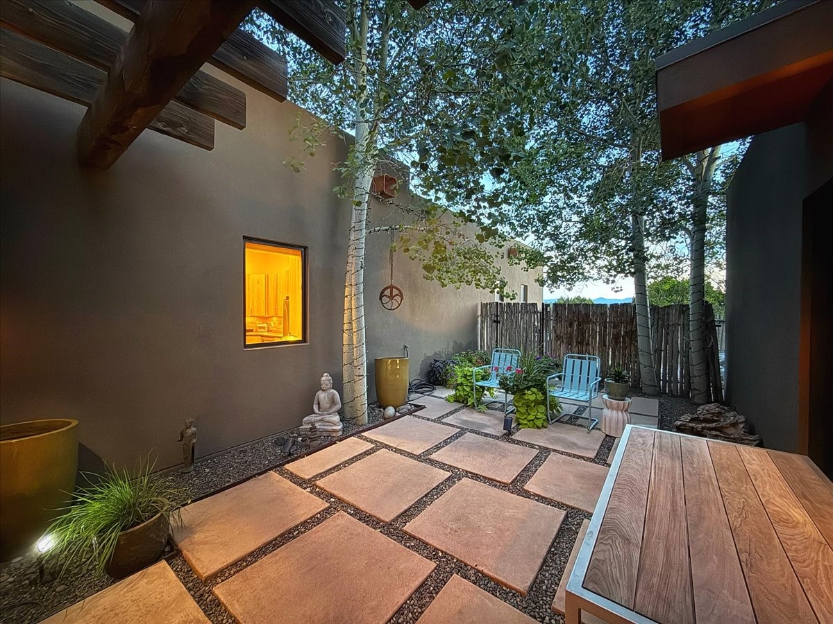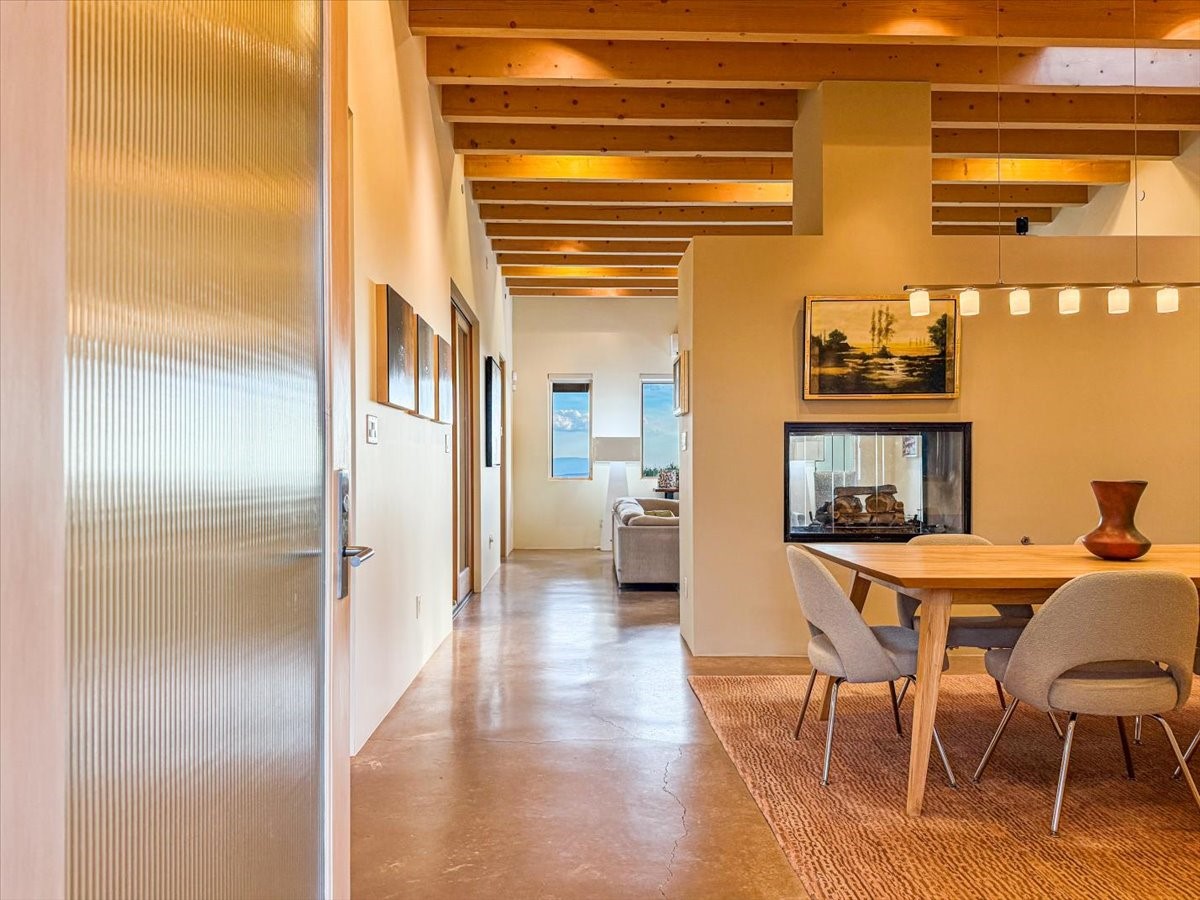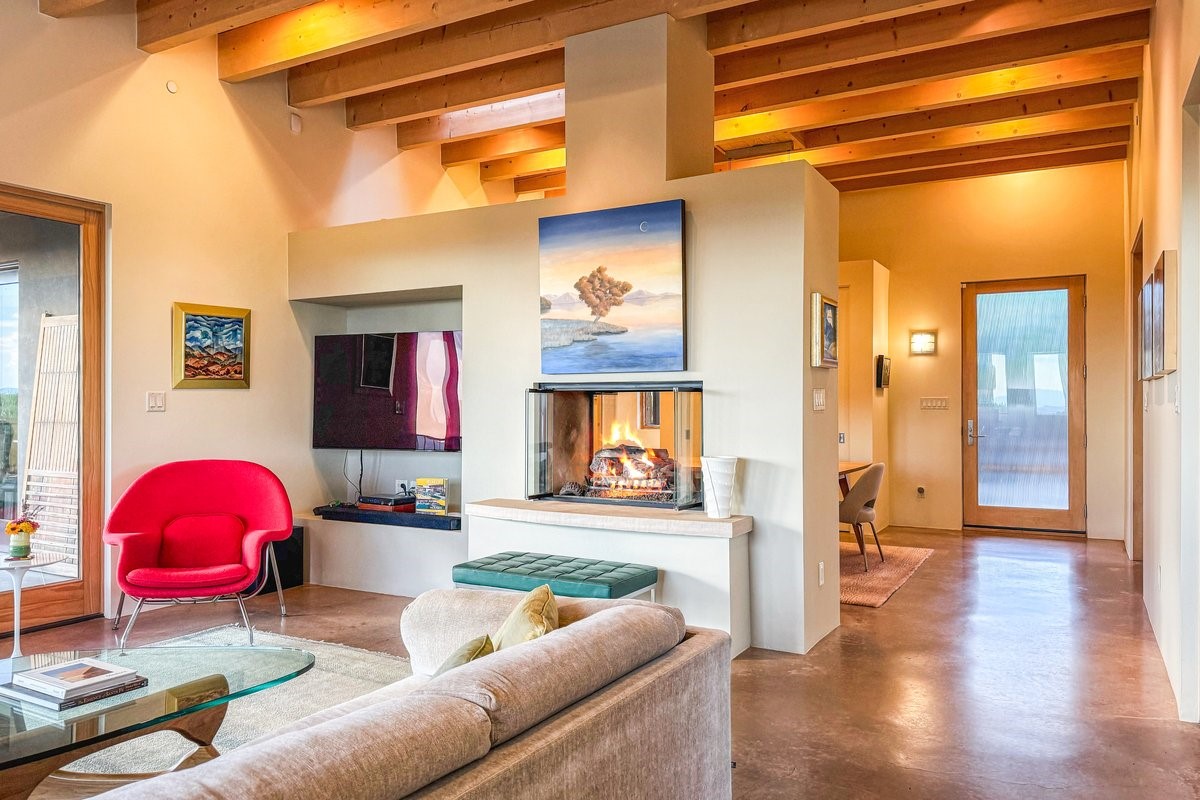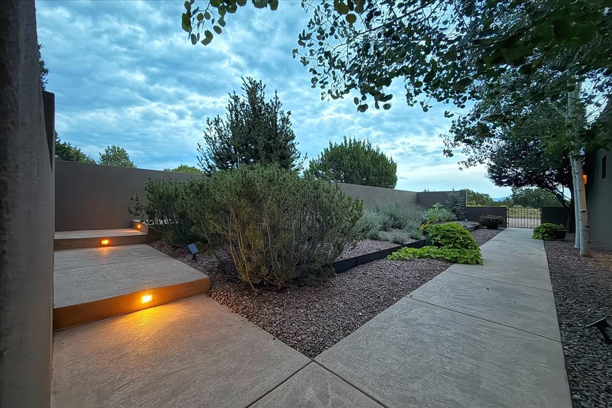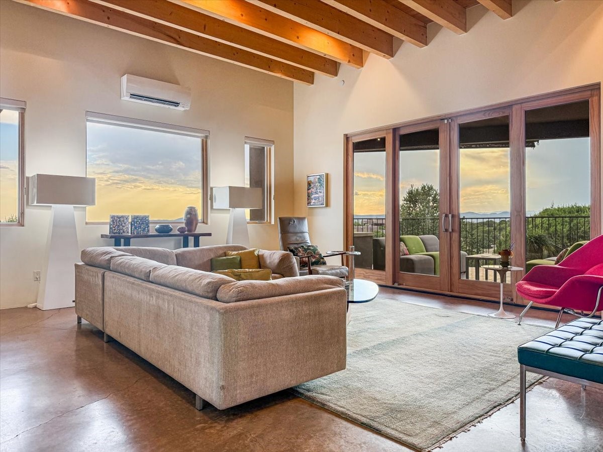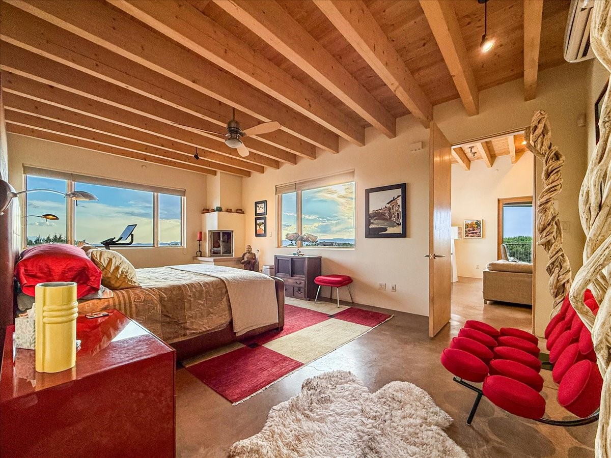 Welcome to this exceptional single-level, custom-built, contemporary-style home, featuring 2,528 sq. ft. of mindfully designed living space on 3.16 acres in the sought-after Tierra Grande subdivision, ~15 minutes from downtown Santa Fe. The home is strategically sited to capture the breathtaking panoramic views from the Jemez to the Sangre de Cristo mountains. This 3-bedroom, 3-bath residence (1 full, 1 three-quarter, and 1 half) boasts a thoughtfully designed floor plan that provides ideal separation between the primary suite and guest suites, offering both privacy and comfort. Blending timeless elegance with everyday livability, the home showcases exceptional craftsmanship throughout. A welcoming courtyard, shaded by mature aspens and enhanced by a serene water feature, sets the tone as you approach the striking 8-foot entry door that invites you into this beautiful home. The great room showcases 12-foot beamed ceilings with tongue-and-groove planking, a striking centerpiece fireplace, and Pella windows that fill the space with natural light while framing sweeping sunset views--also enjoyed from the primary suite, guest bedrooms, and the rear portal with its own fireplace. The kitchen is both functional and stylish, with custom maple cabinetry, Italian porcelain countertops and backsplash, and a wine refrigerator. The owners suite offers sunset exposures, a fireplace, a luxurious full bath, and a spacious walk-in closet with access to the interior courtyard. One guest suite is ensuite with a three-quarter bath and access to the rear portal for outdoor entertaining, while the third guest suite is ideal as an office or additional guest space. The interior courtyard, shaded by mature trees, offers a private, Zen-like retreat--ideal for both relaxation and entertaining. Additional highlights include 8-foot solid-core birch doors throughout, radiant floor heating, an oversized two-car garage, and a newly synthetic stucco system with a 7-year transferable warranty.