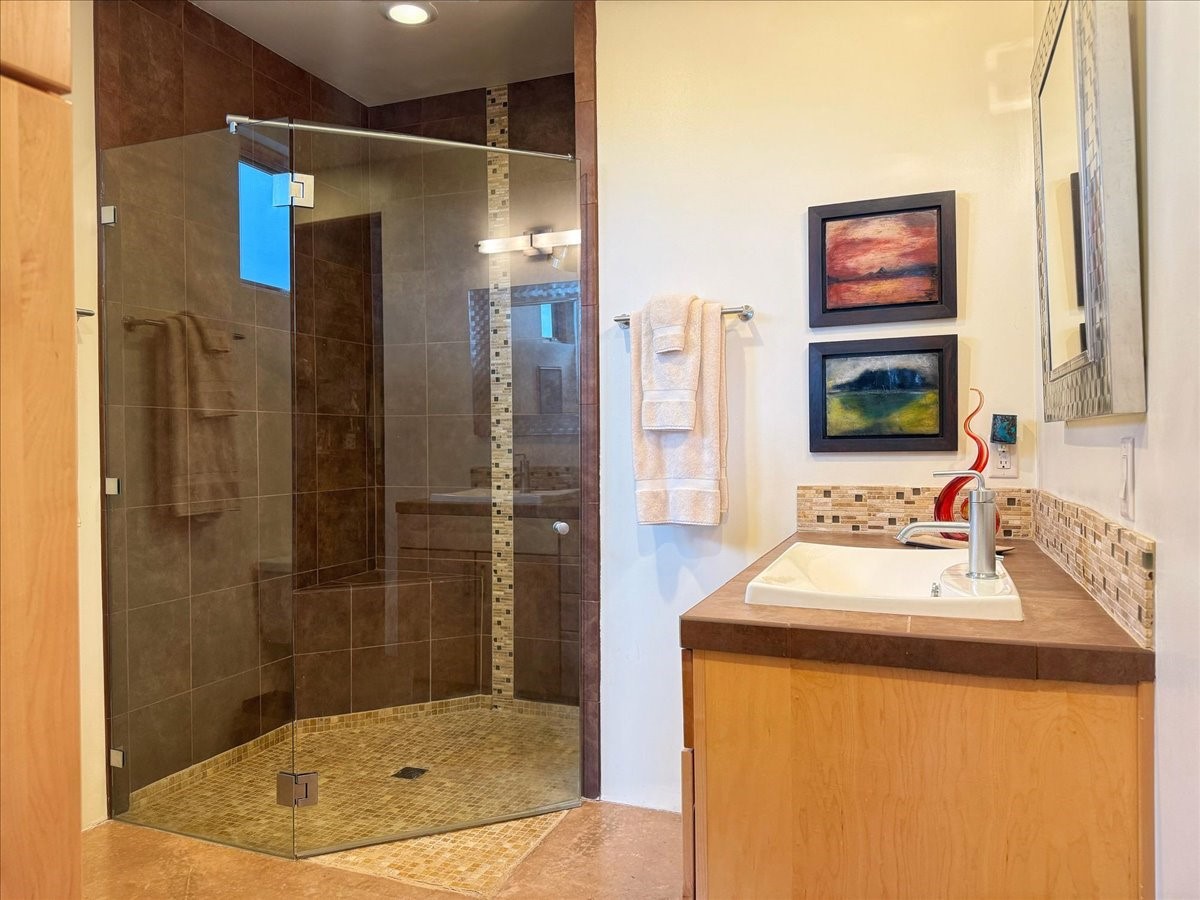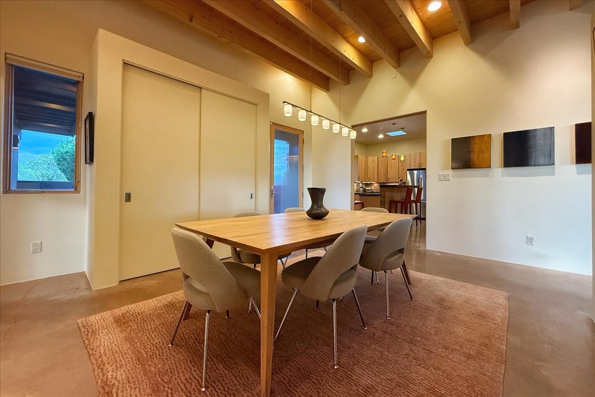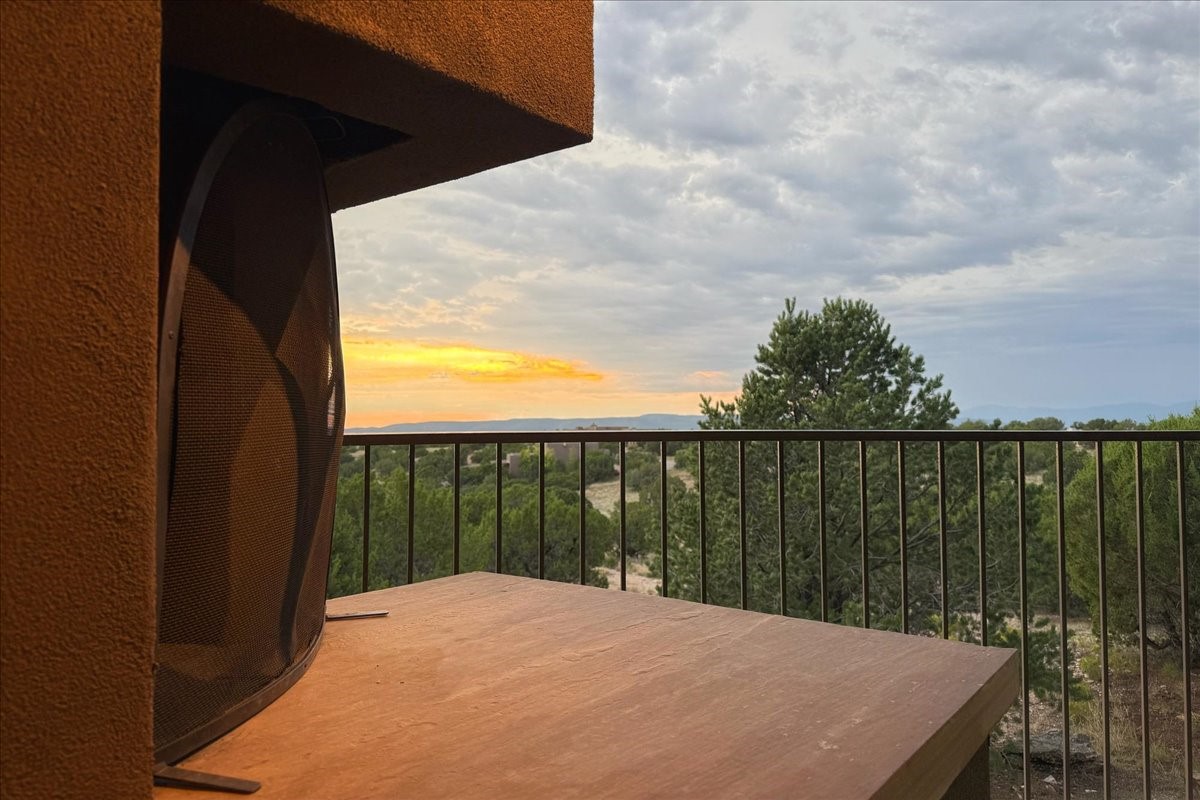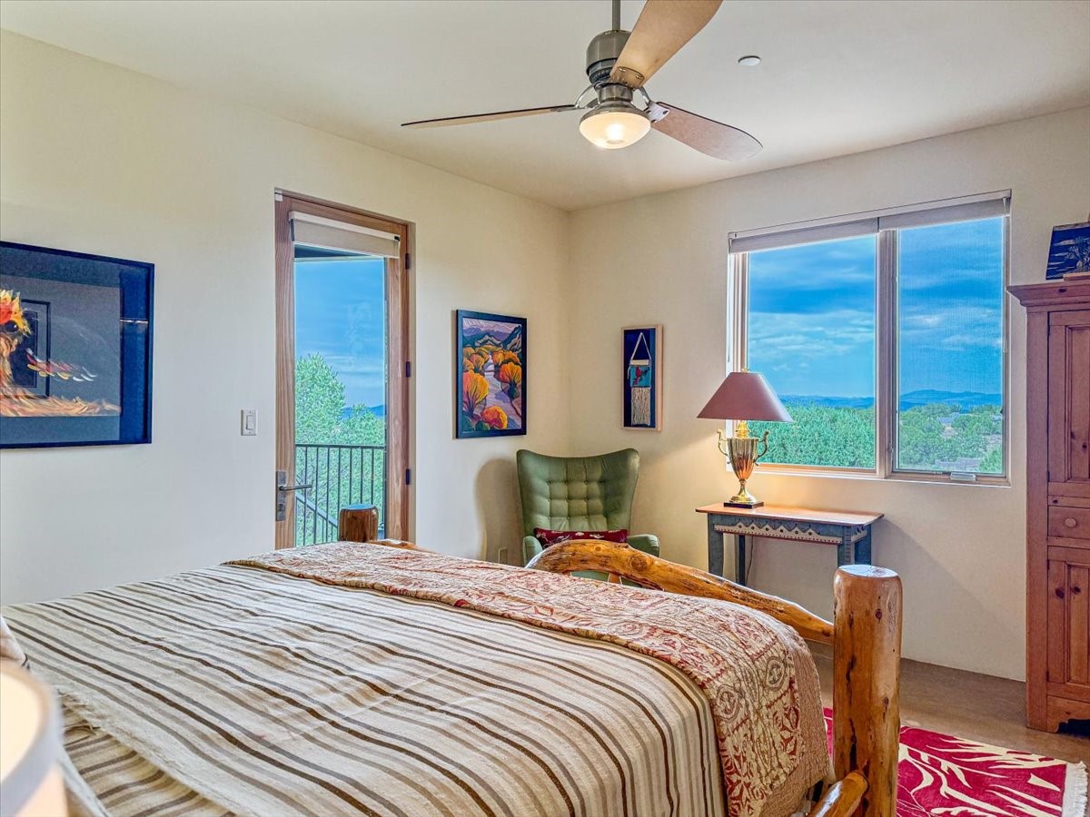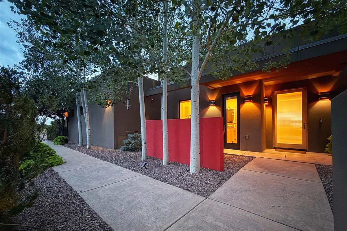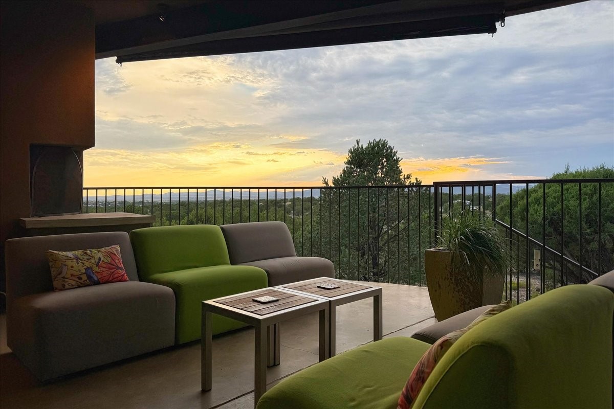 Welcome to this exceptional single-level, custom-built, contemporary-style home, featuring 2,528 sq. ft. of mindfully designed living space on 3.16 acres in the sought-after Tierra Grande subdivision, ~15 minutes from downtown Santa Fe. The home is strategically sited to capture the breathtaking panoramic views from the Jemez to the Sangre de Cristo mountains. This 3-bedroom, 3-bath residence (1 full, 1 three-quarter, and 1 half) boasts a thoughtfully designed floor plan that provides ideal separation between the primary suite and guest suites, offering both privacy and comfort. Blending timeless elegance with everyday livability, the home showcases exceptional craftsmanship throughout. A welcoming courtyard, shaded by mature aspens and enhanced by a serene water feature, sets the tone as you approach the striking 8-foot entry door that invites you into this beautiful home. The great room showcases 12-foot beamed ceilings with tongue-and-groove planking, a striking centerpiece fireplace, and Pella windows that fill the space with natural light while framing sweeping sunset views--also enjoyed from the primary suite, guest bedrooms, and the rear portal with its own fireplace. The kitchen is both functional and stylish, with custom maple cabinetry, Italian porcelain countertops and backsplash, and a wine refrigerator. The owners suite offers sunset exposures, a fireplace, a luxurious full bath, and a spacious walk-in closet with access to the interior courtyard. One guest suite is ensuite with a three-quarter bath and access to the rear portal for outdoor entertaining, while the third guest suite is ideal as an office or additional guest space. The interior courtyard, shaded by mature trees, offers a private, Zen-like retreat--ideal for both relaxation and entertaining. Additional highlights include 8-foot solid-core birch doors throughout, radiant floor heating, an oversized two-car garage, and a newly synthetic stucco system with a 7-year transferable warranty.