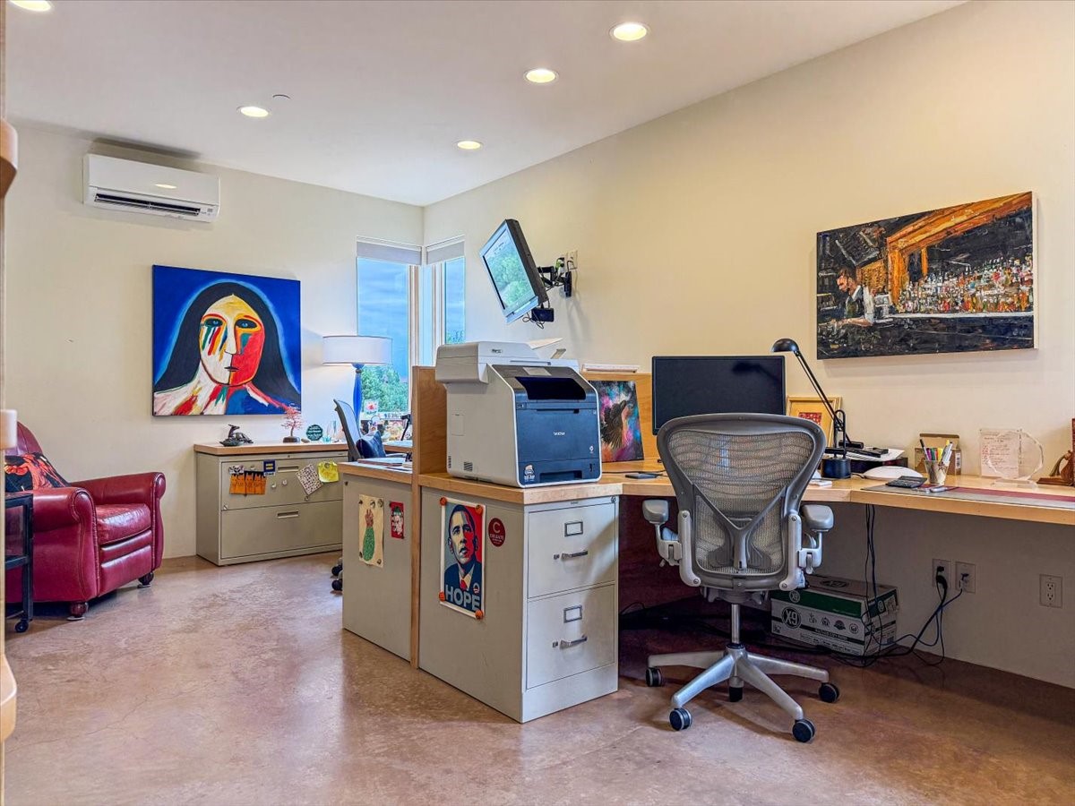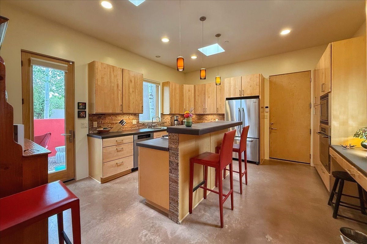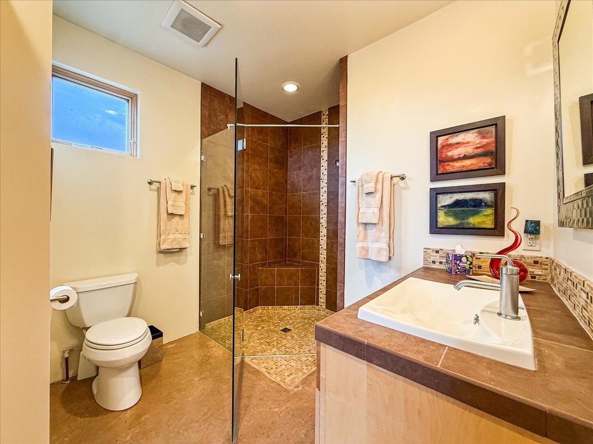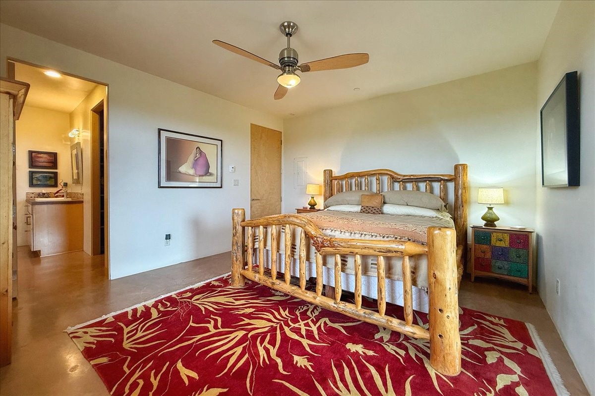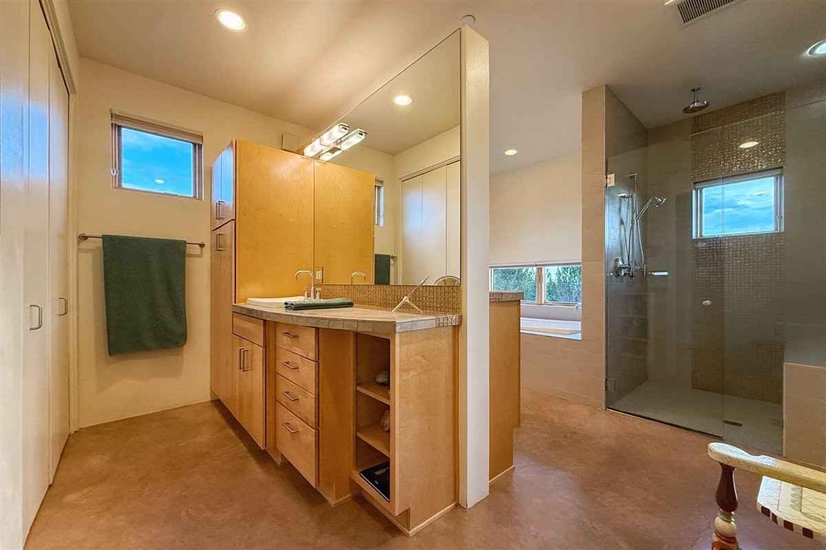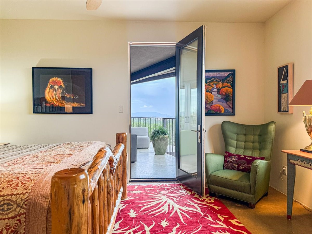Welcome to this exceptional single-level, custom-built, contemporary-style home, featuring 2,528 sq. ft. of mindfully designed living space on 3.16 acres in the sought-after Tierra Grande subdivision, ~15 minutes from downtown Santa Fe. The home is strategically sited to capture the breathtaking panoramic views from the Jemez to the Sangre de Cristo mountains. This 3-bedroom, 3-bath residence (1 full, 1 three-quarter, and 1 half) boasts a thoughtfully designed floor plan that provides ideal separation between the primary suite and guest suites, offering both privacy and comfort. Blending timeless elegance with everyday livability, the home showcases exceptional craftsmanship throughout. A welcoming courtyard, shaded by mature aspens and enhanced by a serene water feature, sets the tone as you approach the striking 8-foot entry door that invites you into this beautiful home. The great room showcases 12-foot beamed ceilings with tongue-and-groove planking, a striking centerpiece fireplace, and Pella windows that fill the space with natural light while framing sweeping sunset views--also enjoyed from the primary suite, guest bedrooms, and the rear portal with its own fireplace. The kitchen is both functional and stylish, with custom maple cabinetry, Italian porcelain countertops and backsplash, and a wine refrigerator. The owners suite offers sunset exposures, a fireplace, a luxurious full bath, and a spacious walk-in closet with access to the interior courtyard. One guest suite is ensuite with a three-quarter bath and access to the rear portal for outdoor entertaining, while the third guest suite is ideal as an office or additional guest space. The interior courtyard, shaded by mature trees, offers a private, Zen-like retreat--ideal for both relaxation and entertaining. Additional highlights include 8-foot solid-core birch doors throughout, radiant floor heating, an oversized two-car garage, and a newly synthetic stucco system with a 7-year transferable warranty.