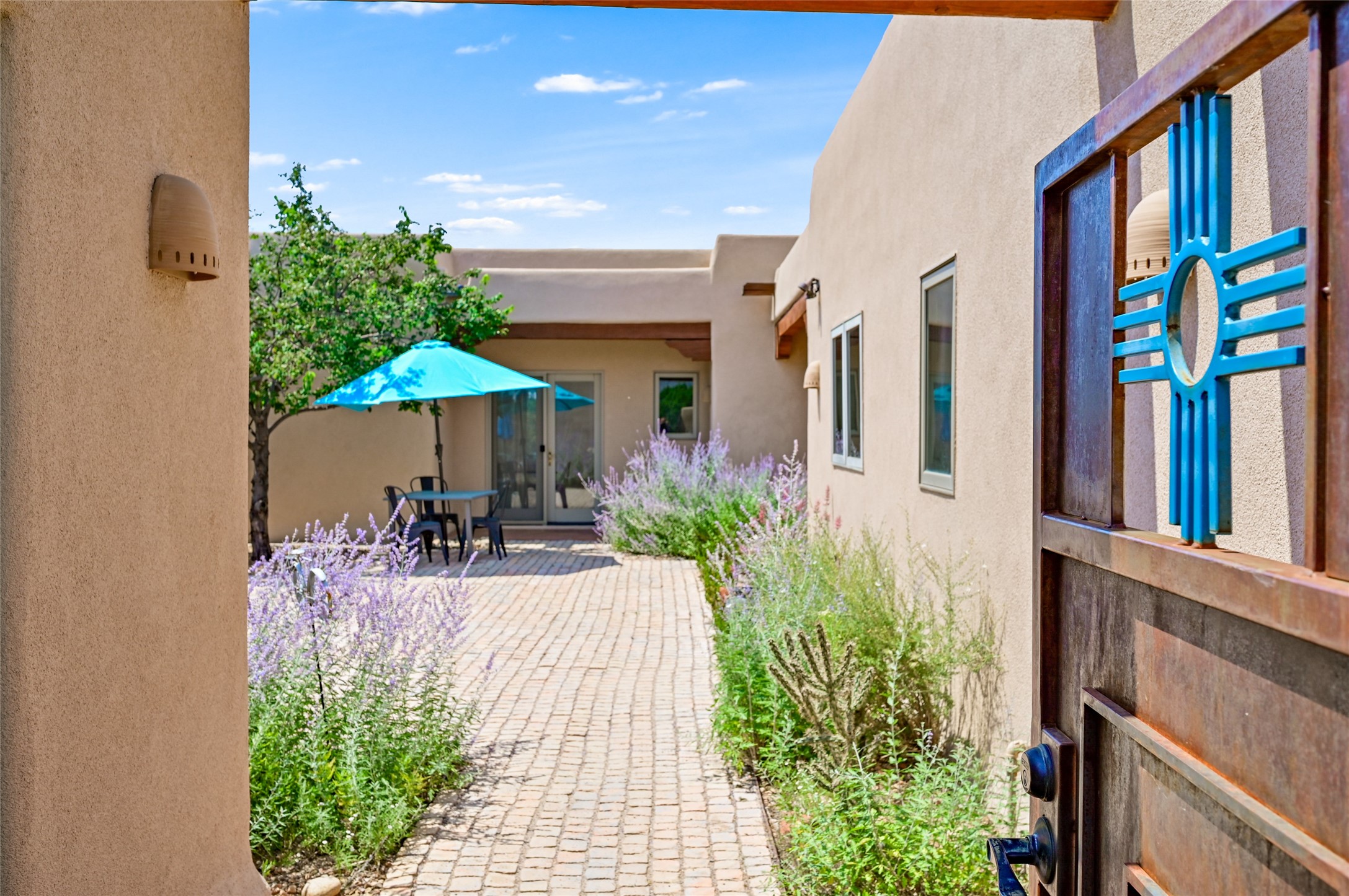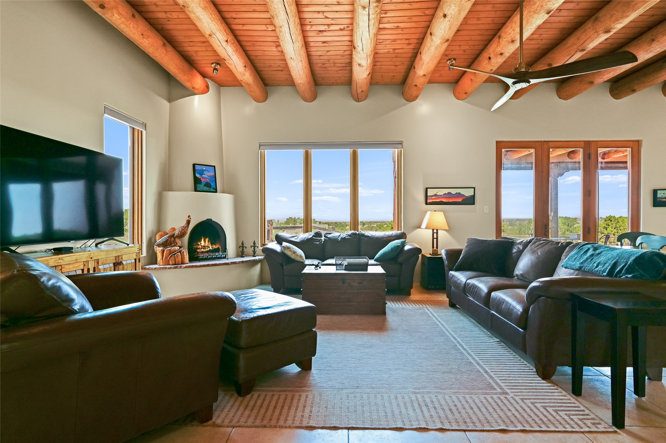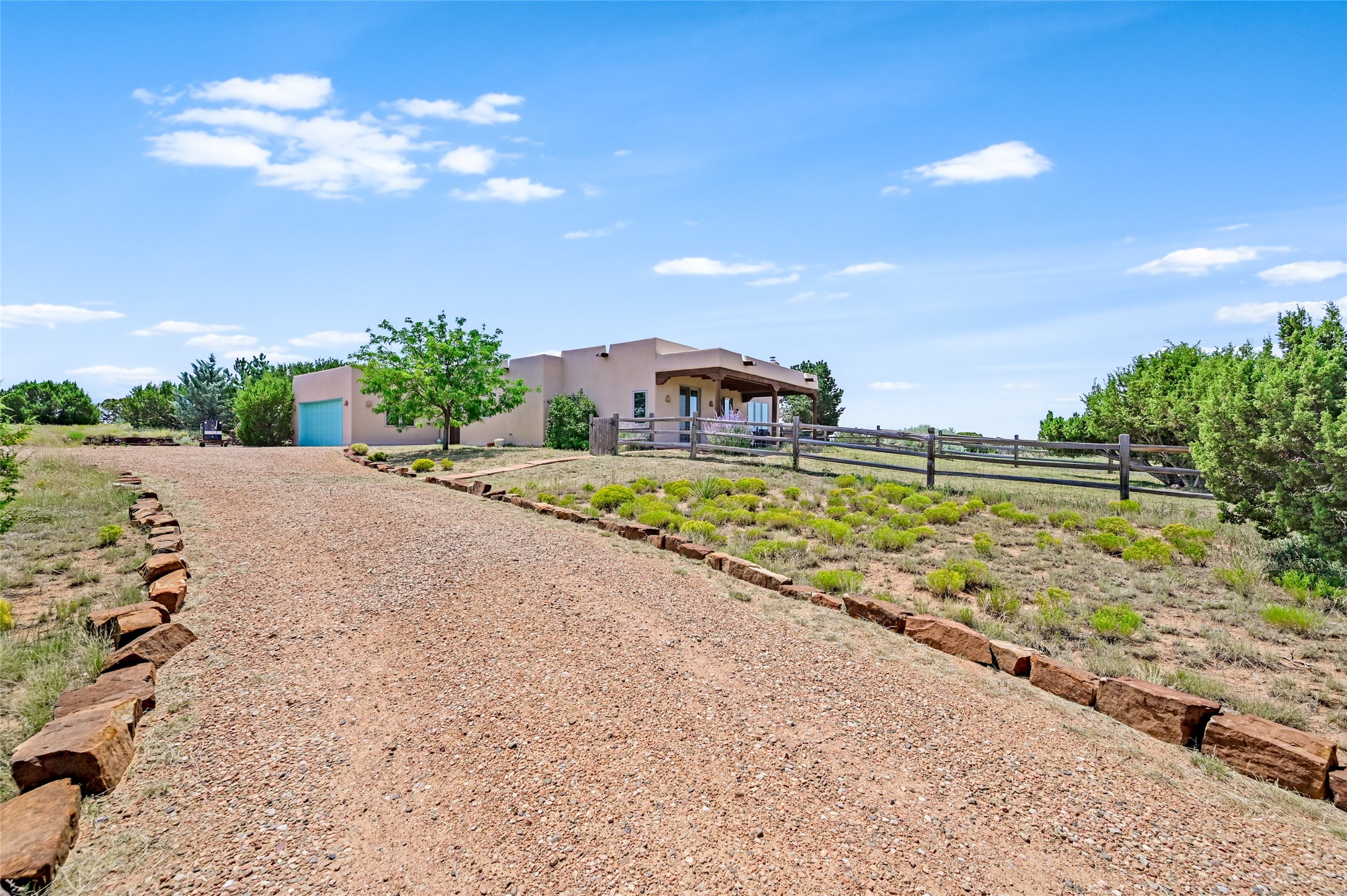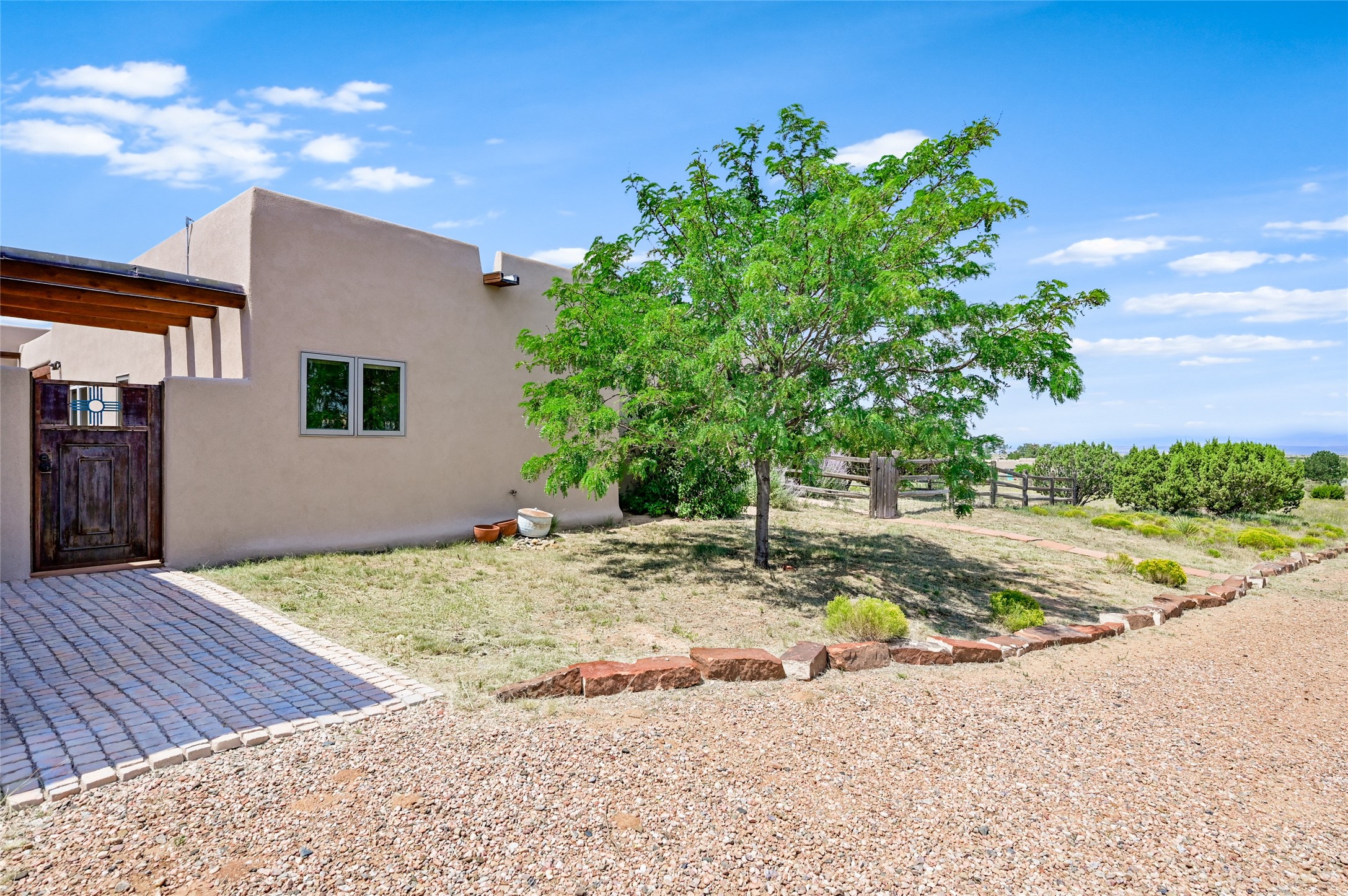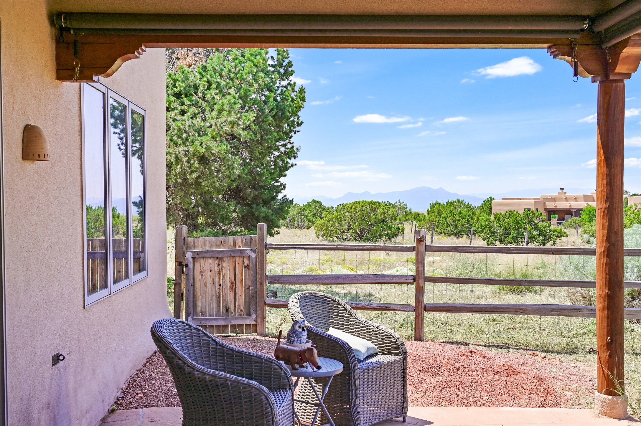 Best views in Eldorado! Built to take advantage of breathtaking views of the Sangre de Cristo, Jemez, Ortiz & Sandia mountain ranges, this pueblo-style, 3 bedroom, 3 bath home has an open layout with 2 bedrooms & 2 full baths arranged around the great room plus a third bedroom/studio/office with half bath & separate entrance. Enjoy outdoor living & dining on the spacious portal with retractable sun shades or in the large, enclosed courtyard. Luxury features include porcelain floor tiles, radiant floor heat, Bosch/Miele appliances, kiva fireplace & an oversized garage. Brand new stucco & exterior paint completed in 2025. Don't miss this one!
