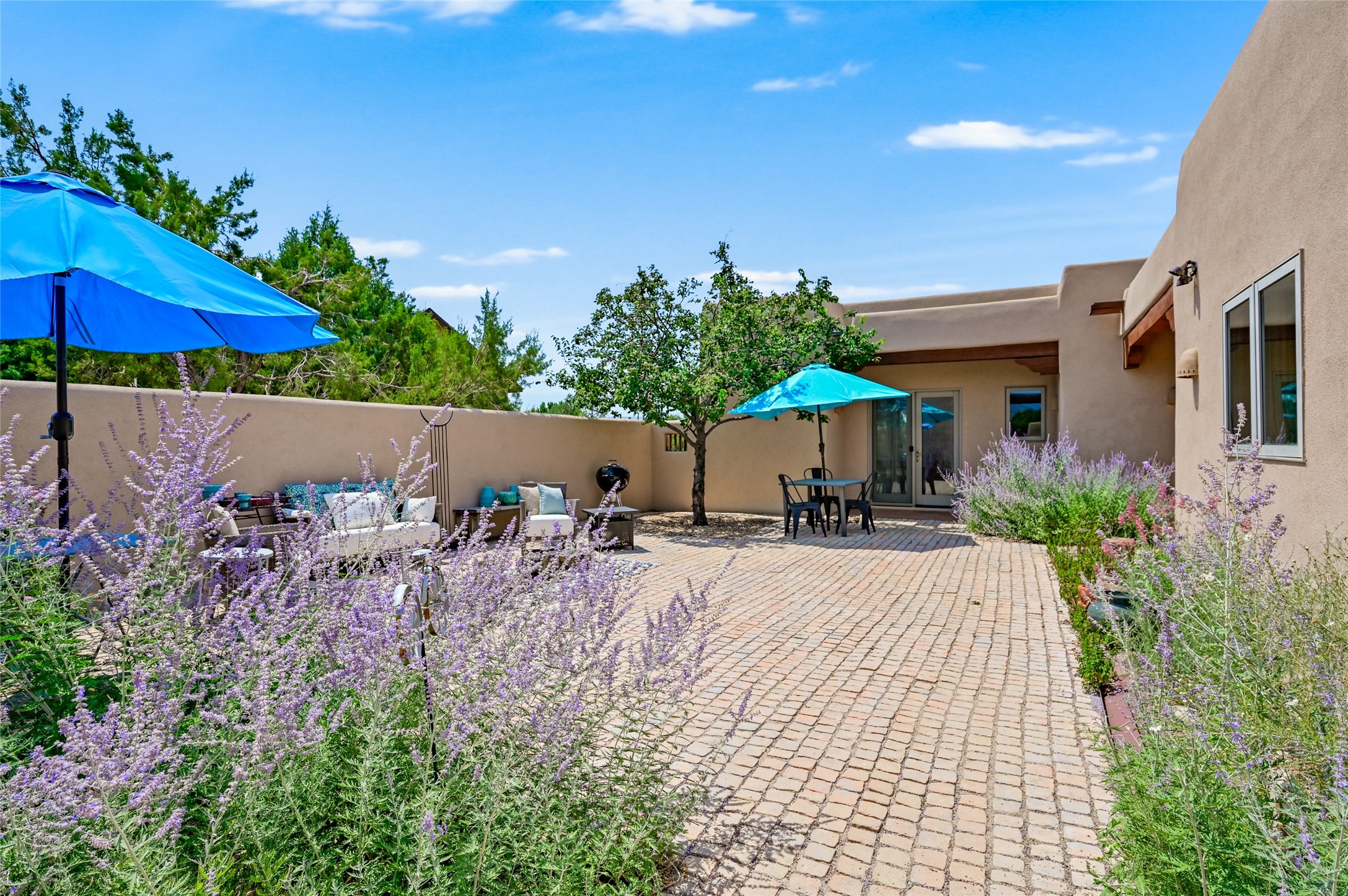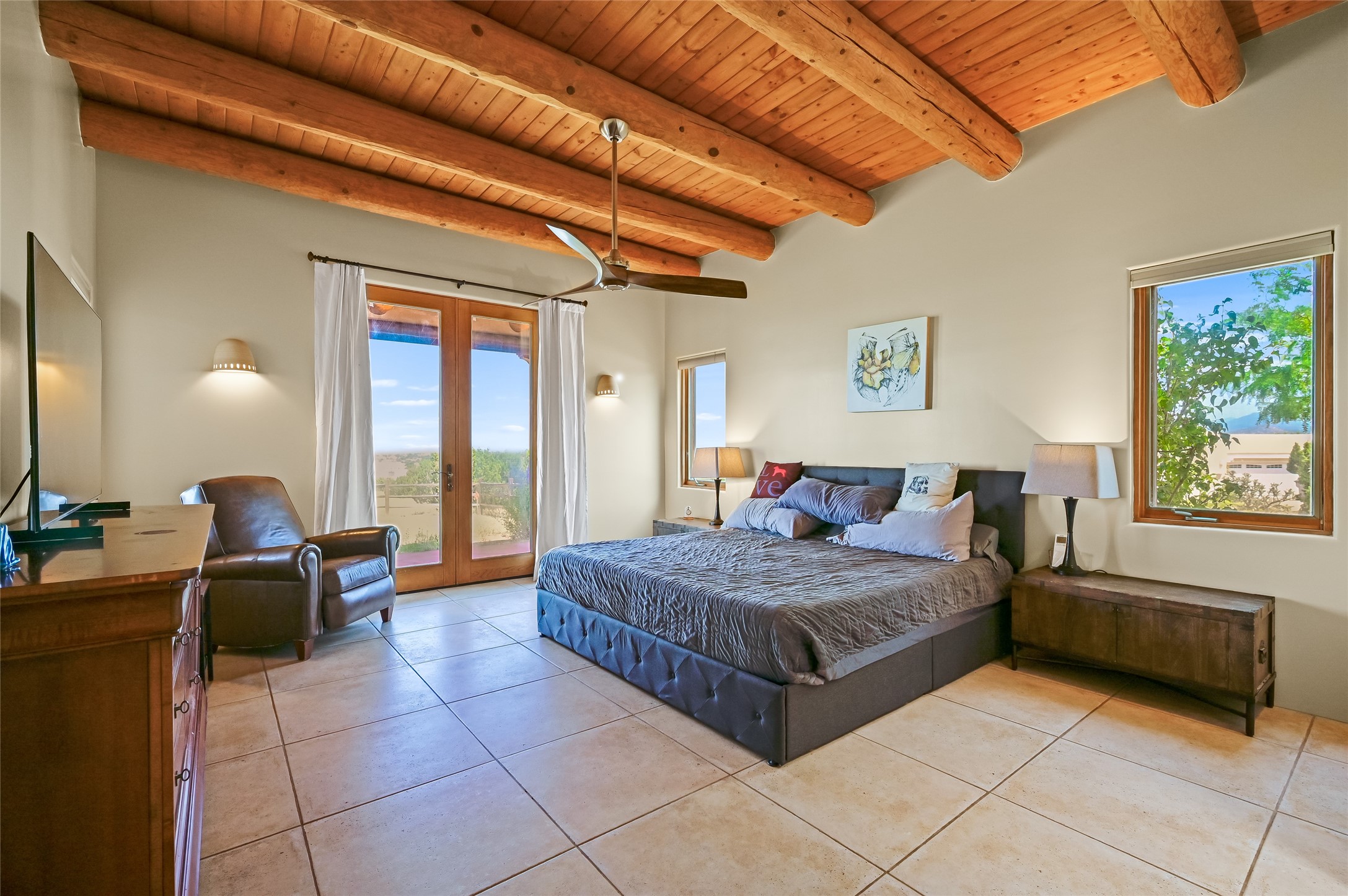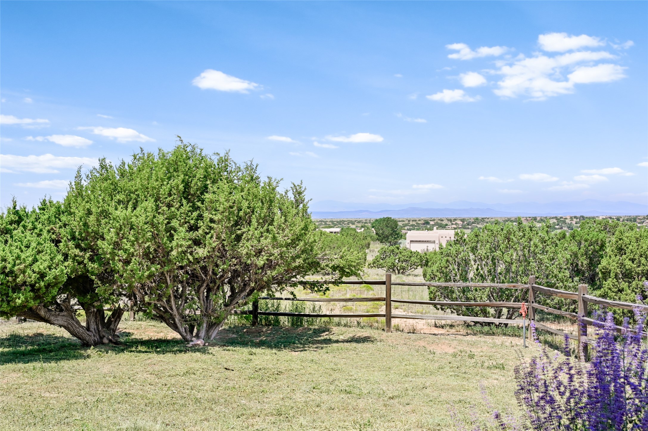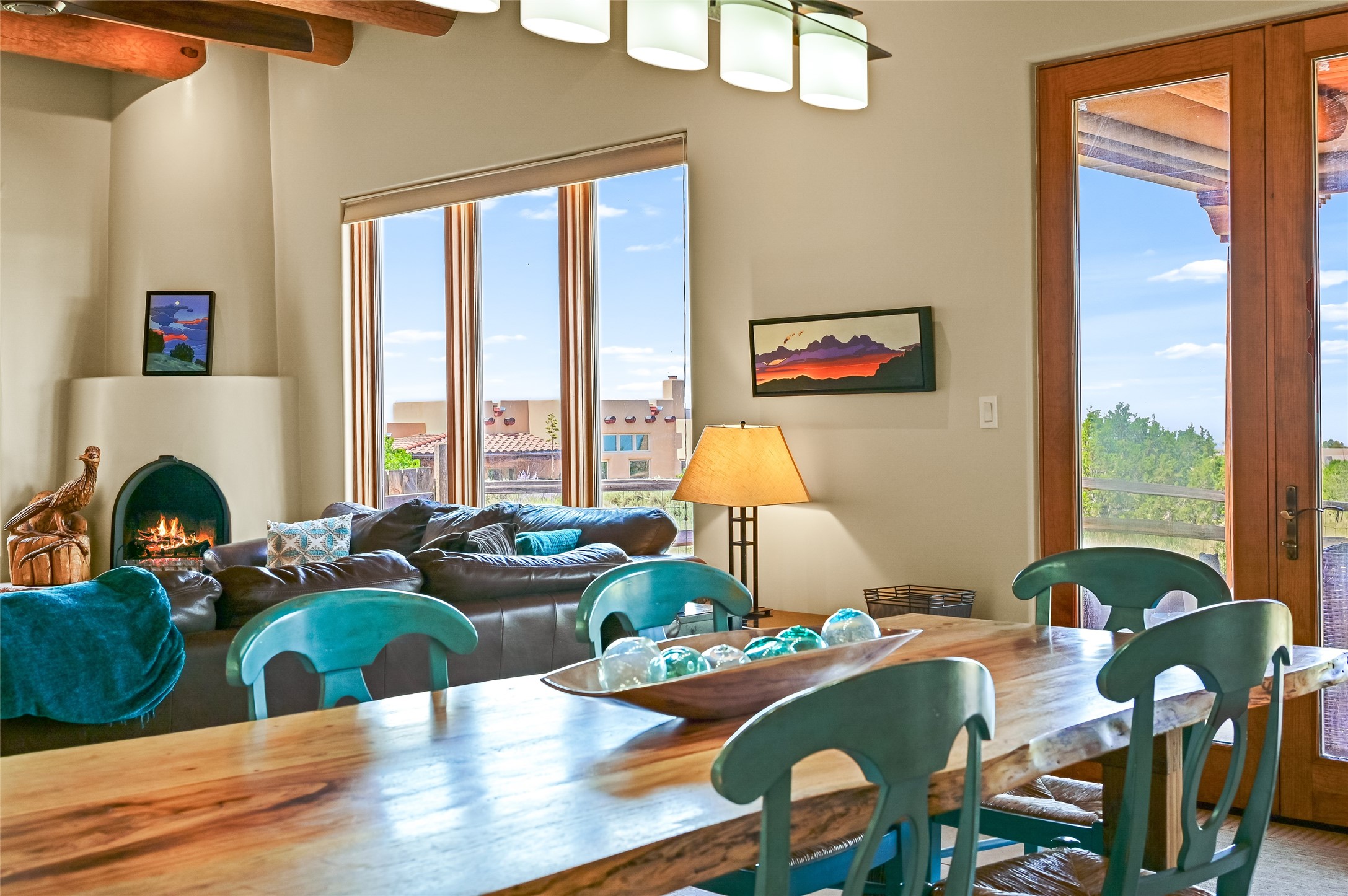 Best views in Eldorado! Built to take advantage of breathtaking views of the Sangre de Cristo, Jemez, Ortiz & Sandia mountain ranges, this pueblo-style, 3 bedroom, 3 bath home has an open layout with 2 bedrooms & 2 full baths arranged around the great room plus a third bedroom/studio/office with half bath & separate entrance. Enjoy outdoor living & dining on the spacious portal with retractable sun shades or in the large, enclosed courtyard. Luxury features include porcelain floor tiles, radiant floor heat, Bosch/Miele appliances, kiva fireplace & an oversized garage. Brand new stucco & exterior paint completed in 2025. Don't miss this one!