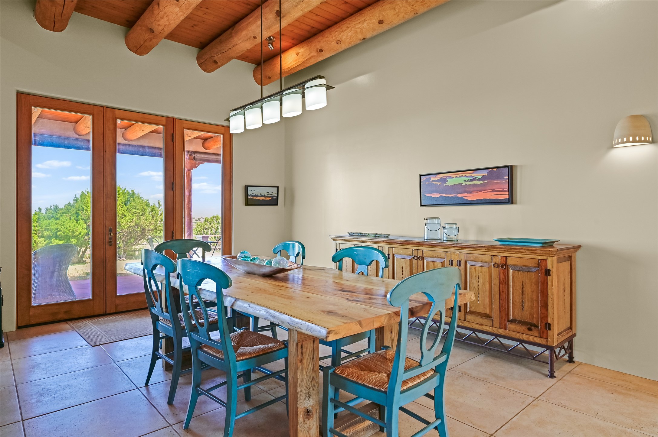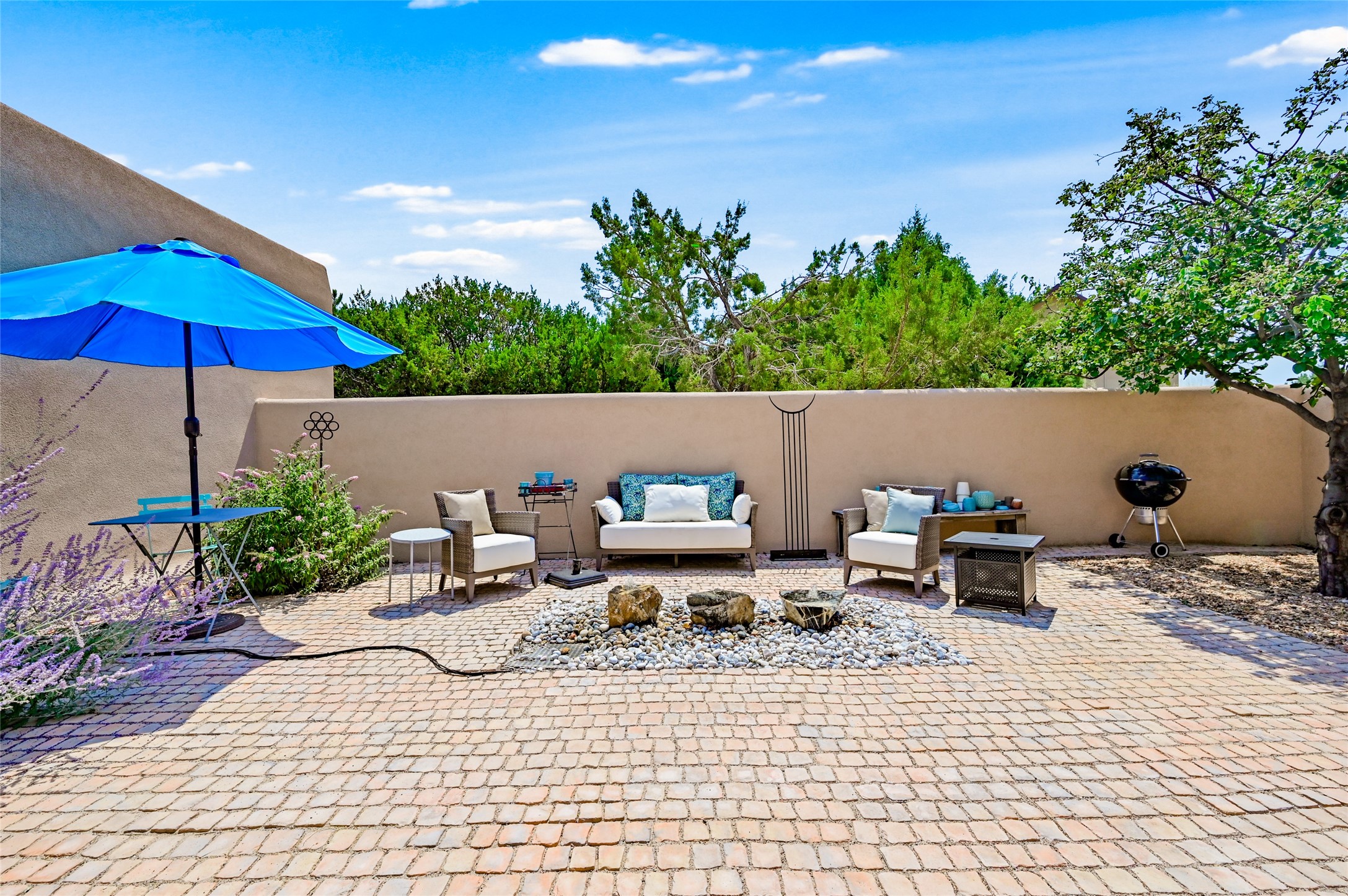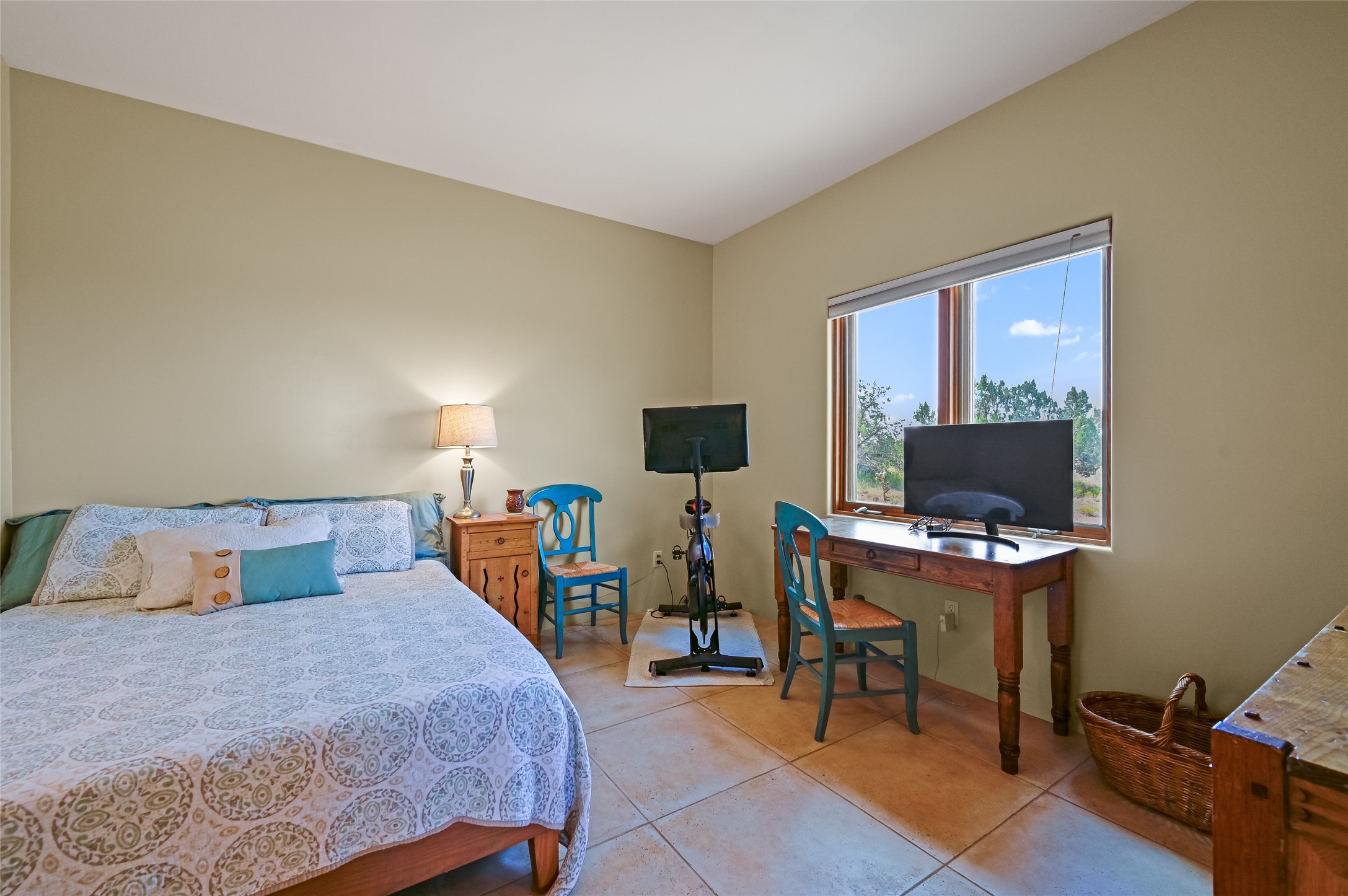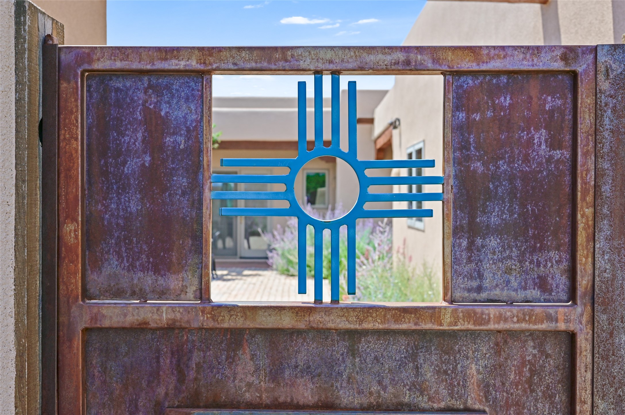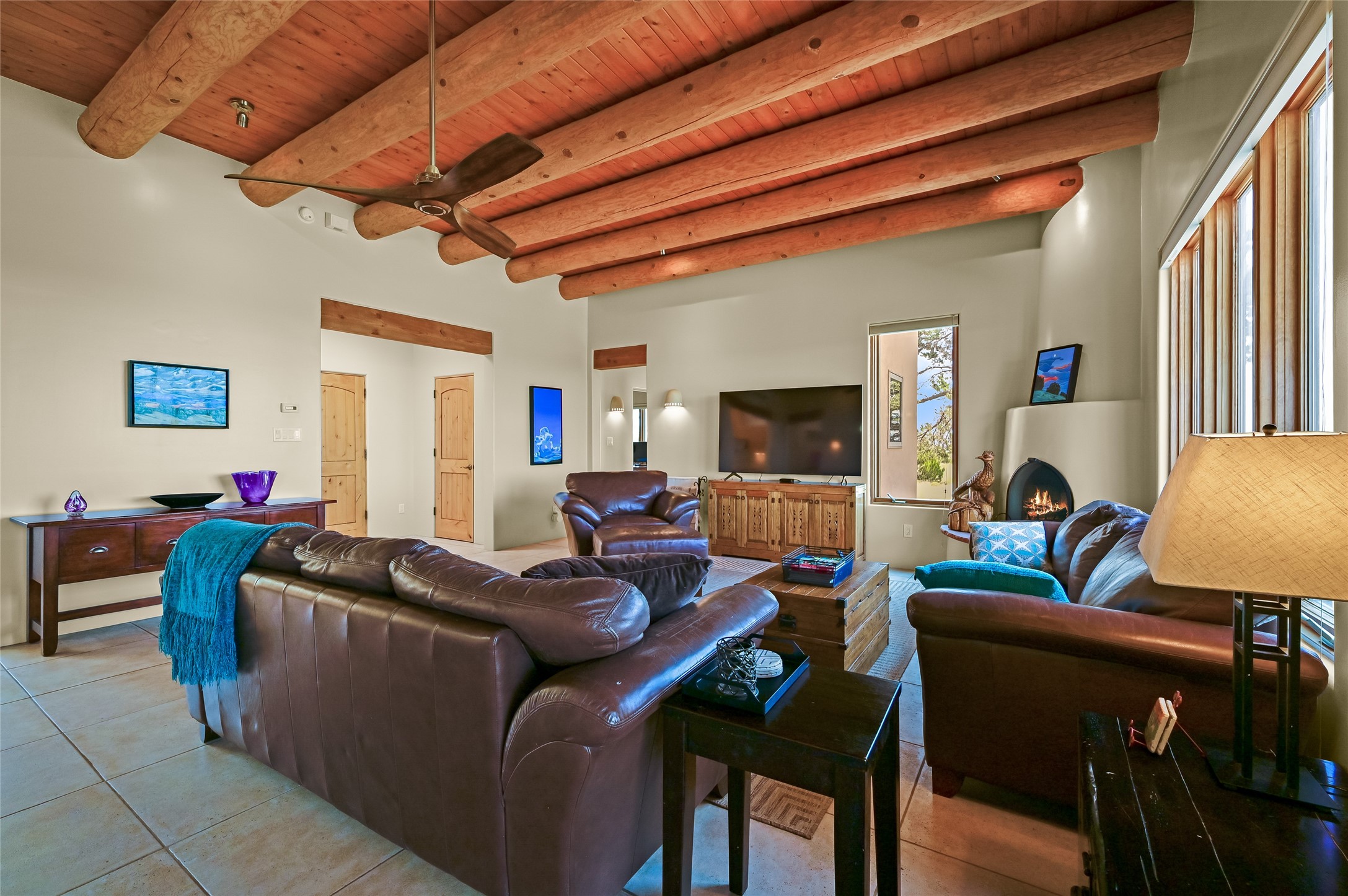 Best views in Eldorado! Built to take advantage of breathtaking views of the Sangre de Cristo, Jemez, Ortiz & Sandia mountain ranges, this pueblo-style, 3 bedroom, 3 bath home has an open layout with 2 bedrooms & 2 full baths arranged around the great room plus a third bedroom/studio/office with half bath & separate entrance. Enjoy outdoor living & dining on the spacious portal with retractable sun shades or in the large, enclosed courtyard. Luxury features include porcelain floor tiles, radiant floor heat, Bosch/Miele appliances, kiva fireplace & an oversized garage. Brand new stucco & exterior paint completed in 2025. Don't miss this one!