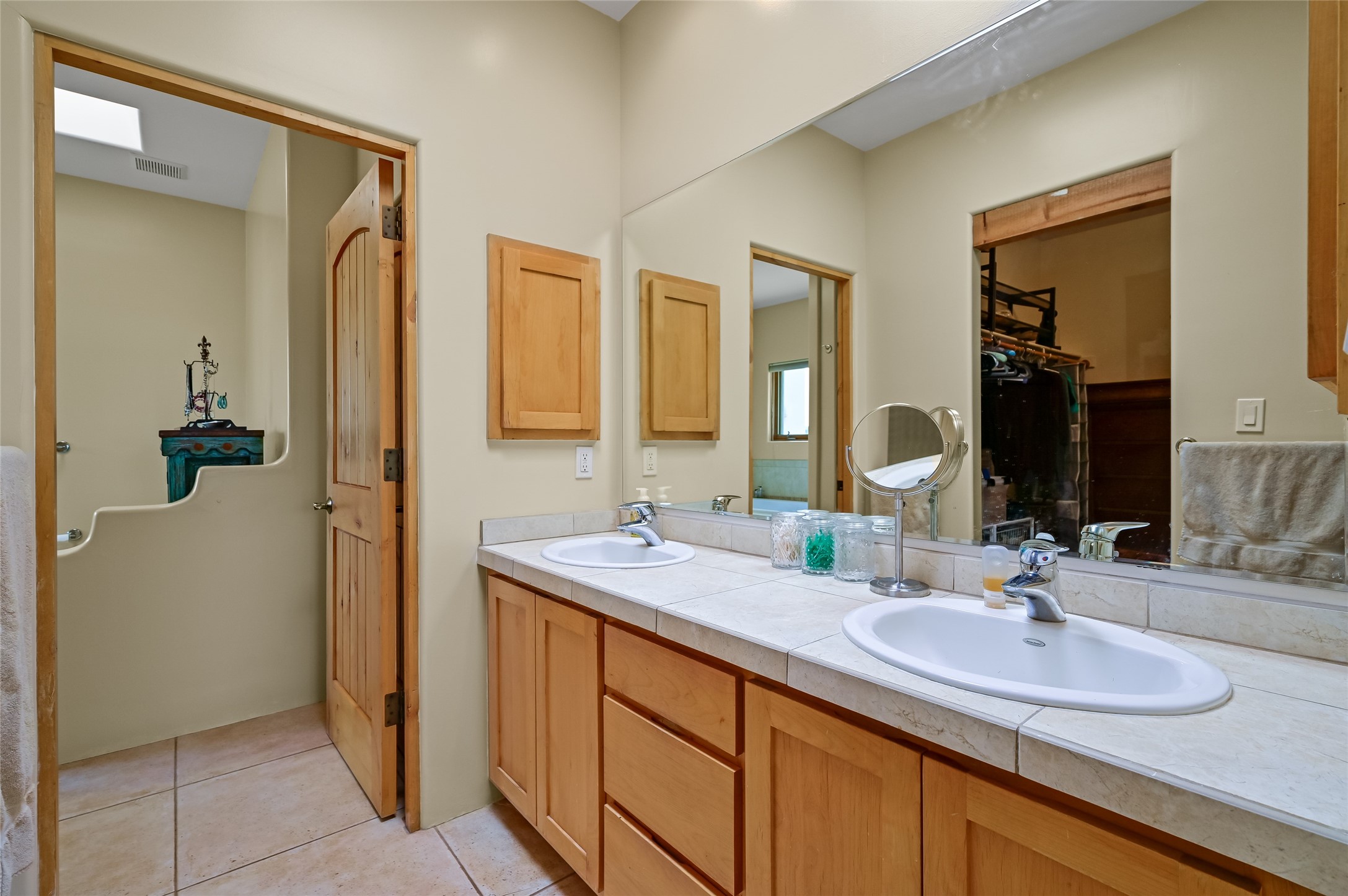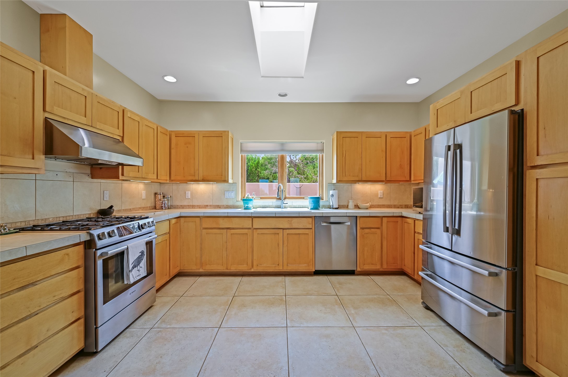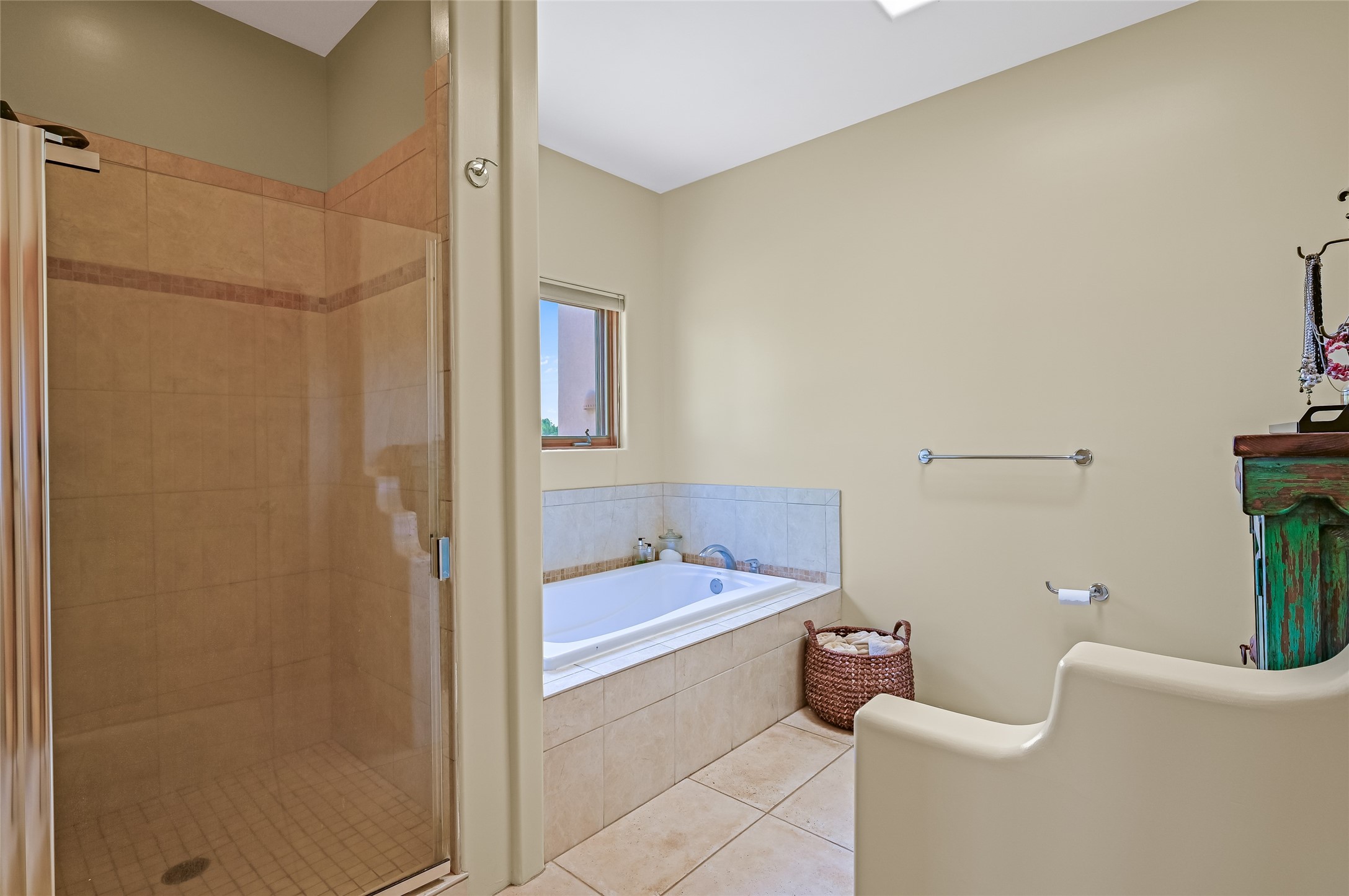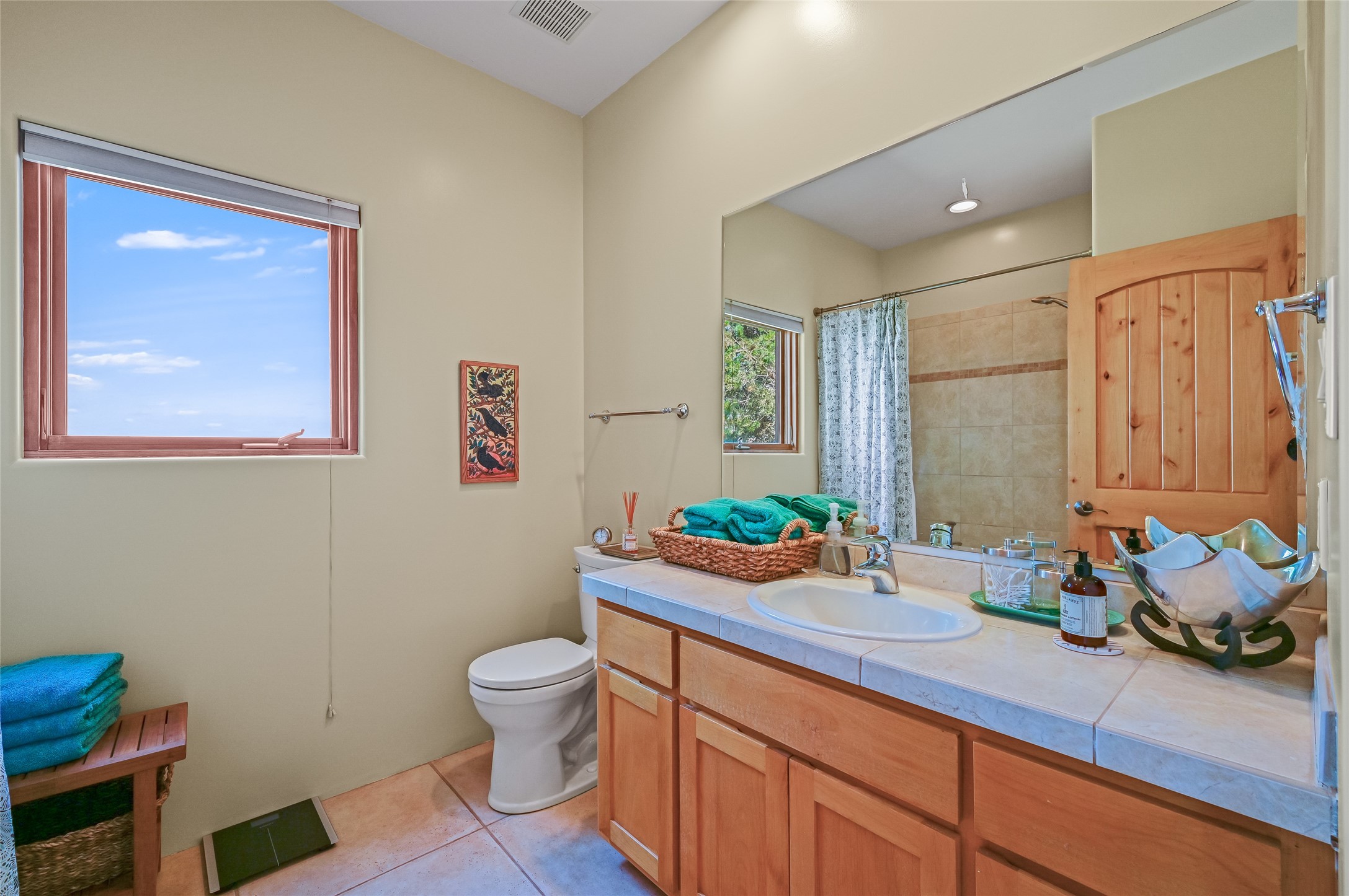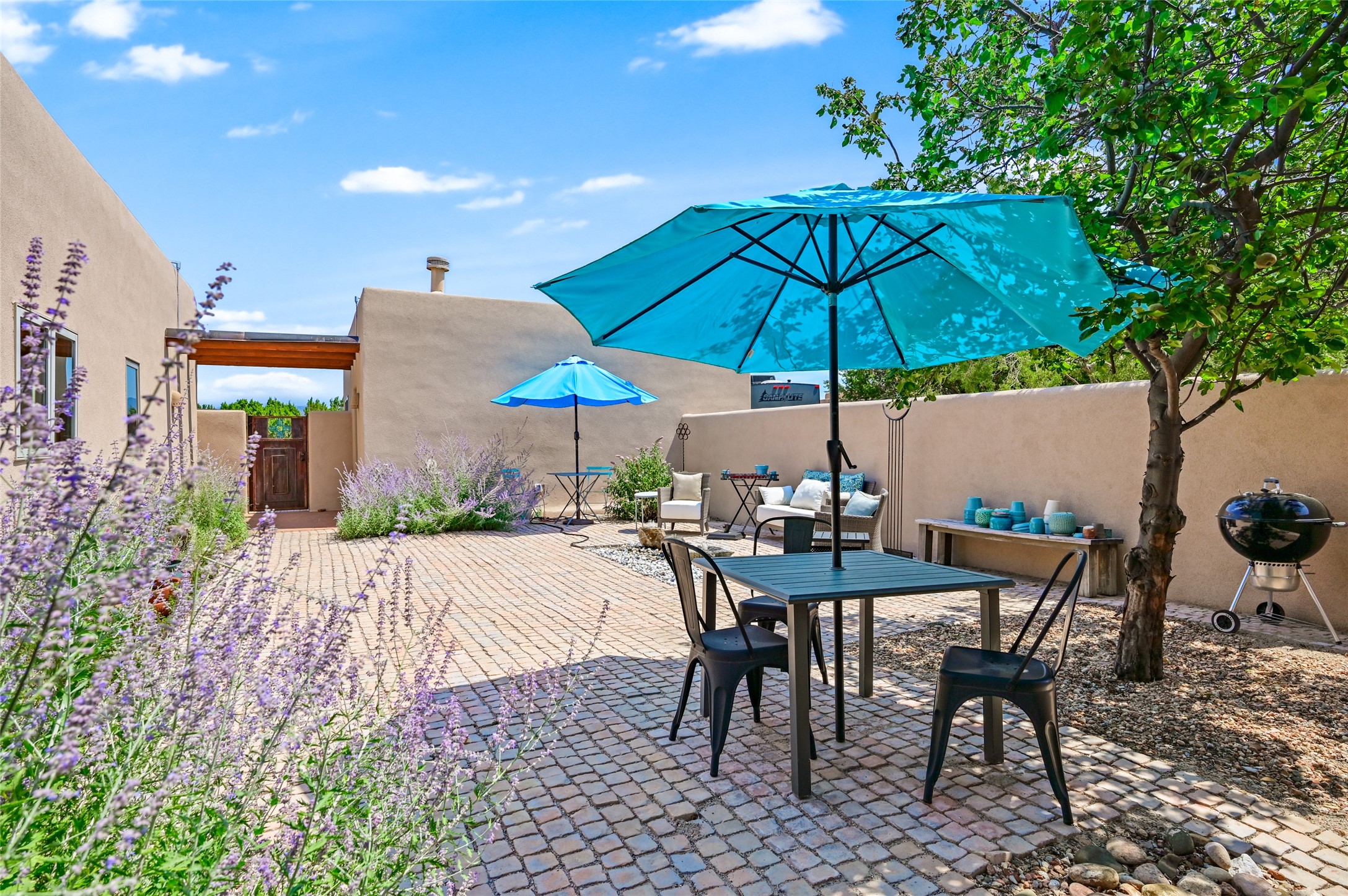 Best views in Eldorado! Built to take advantage of breathtaking views of the Sangre de Cristo, Jemez, Ortiz & Sandia mountain ranges, this pueblo-style, 3 bedroom, 3 bath home has an open layout with 2 bedrooms & 2 full baths arranged around the great room plus a third bedroom/studio/office with half bath & separate entrance. Enjoy outdoor living & dining on the spacious portal with retractable sun shades or in the large, enclosed courtyard. Luxury features include porcelain floor tiles, radiant floor heat, Bosch/Miele appliances, kiva fireplace & an oversized garage. Brand new stucco & exterior paint completed in 2025. Don't miss this one!