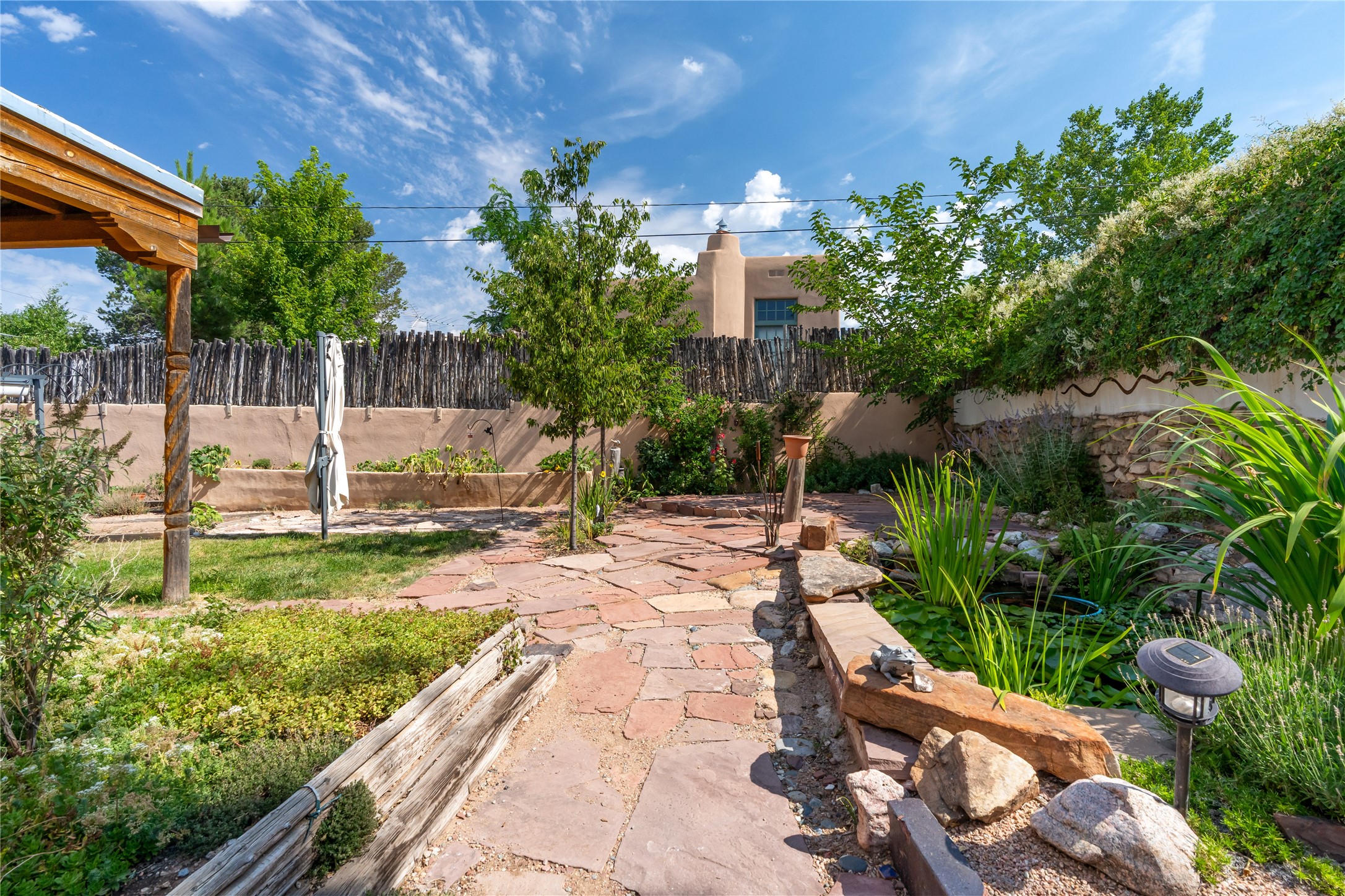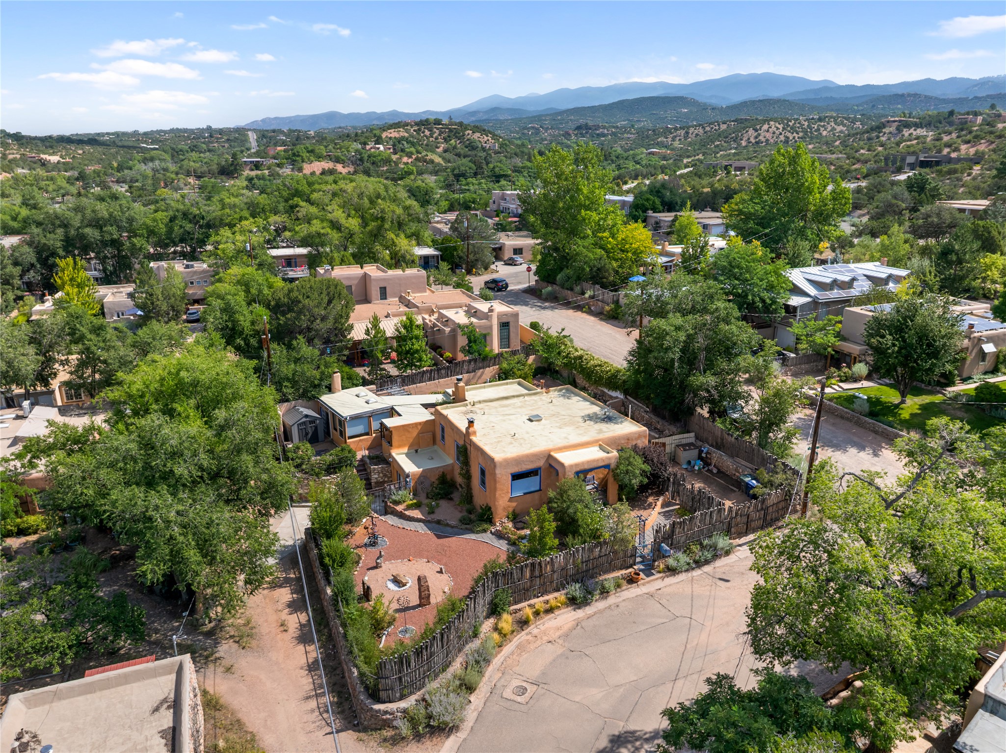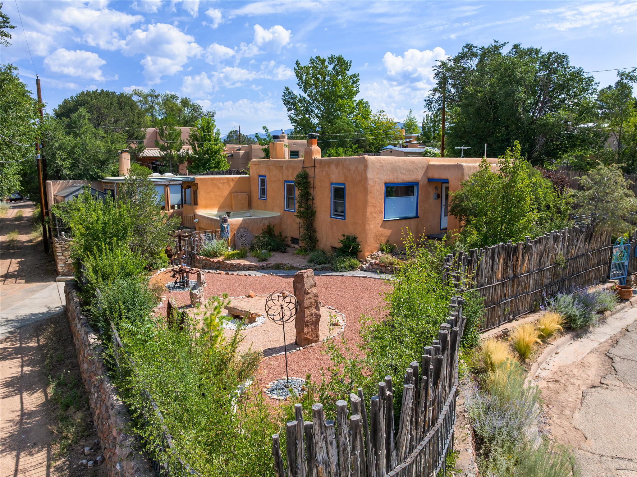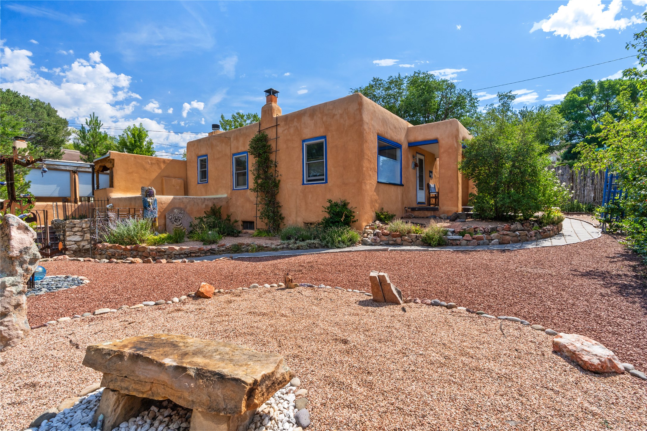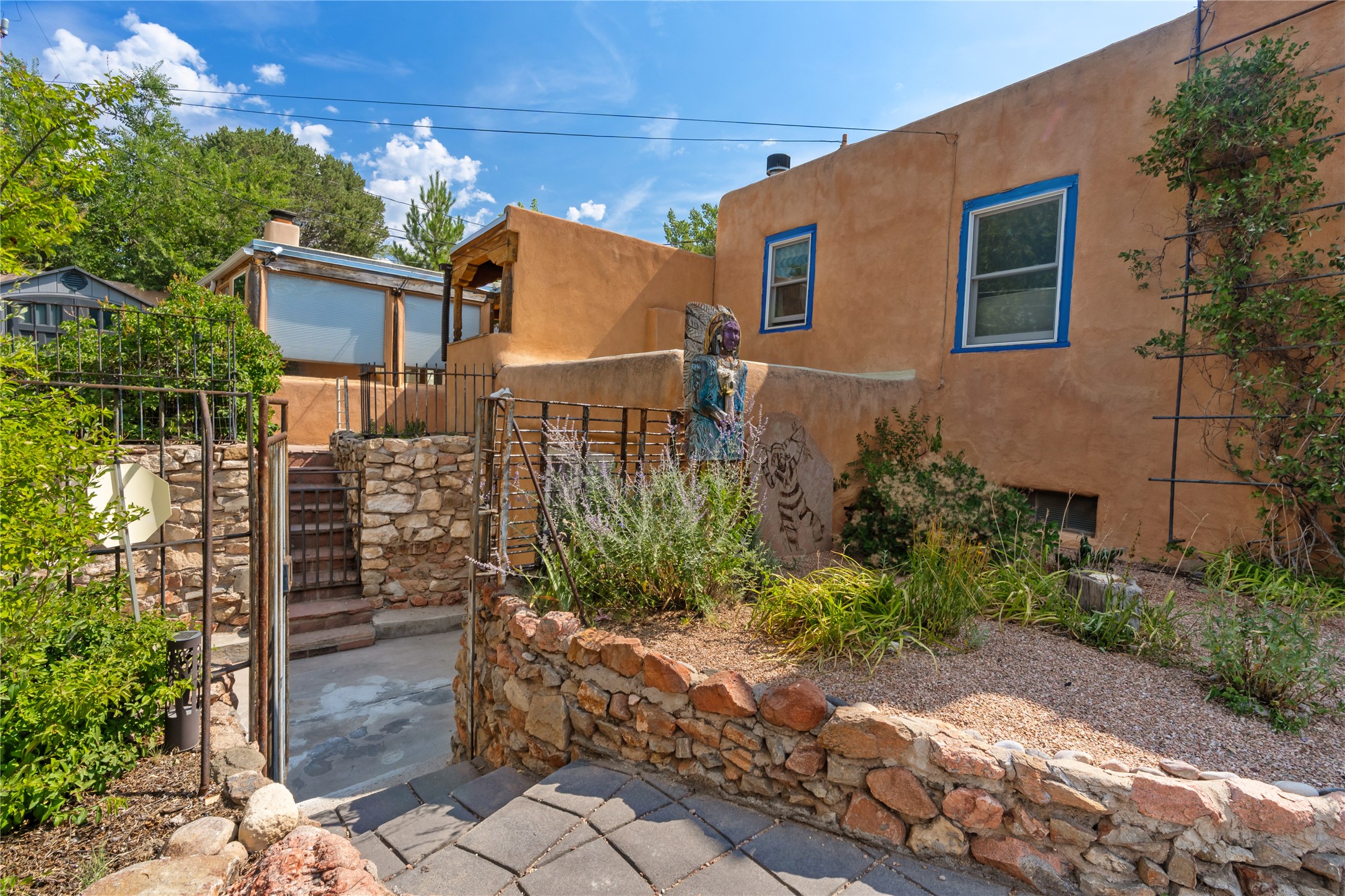 Step into Santa Fe history in this captivating 2,041+/- sq ft pre-war home, where artistic vision meets sustainable living just five blocks from the world-famous Santa Fe Plaza. This unique 3-bedroom, 2-bathroom property enchants from the moment you enter through the whimsical front gate created by renowned Galisteo artist John Massey. The home showcases remarkable historic character with original Santa Fe Penitentiary fencing enclosing the entire property, complete with original iron keys - perfect for pet owners. Venetian plaster finishes & tile flooring downstairs add authentic southwestern elegance, while beautiful hardwood floors grace the main living area and two upper level bedrooms, complemented by a cozy wood-burning kiva fireplace in the living room. Sustainable living features abound in this thoughtfully designed home. The south-facing passive solar design includes a bermed-in lower level that stays naturally cool in summer. The property boasts a 1,400-gallon underground rainwater collection system, mature low-water gardens, and organic raised beds cultivated for 18 years. A super-efficient 92% Lochinvar hydronic heating system minimizes utility costs, while energy-efficient induction cooking and double-pane low-E windows enhance efficiency. The roof was recently recoated in 2025. The outdoor spaces create a true paradise with a tranquil stone and sculpture garden and mature pond featuring over a dozen Koi fish, water lilies, and aquatic plants. A complete outdoor kitchen and dining pavilion with fireplace built from reclaimed Santa Fe Plaza brickwork extends living space seamlessly. Two separate living areas with independent entrances offer exceptional flexibility for multi-generational living, home office space, or rental income potential. The downstairs entrance can be converted back to garage access if desired. This is more than a home--it's a Santa Fe lifestyle combining historic charm, artistic flair, and modern efficiency. Schedule a showing today!