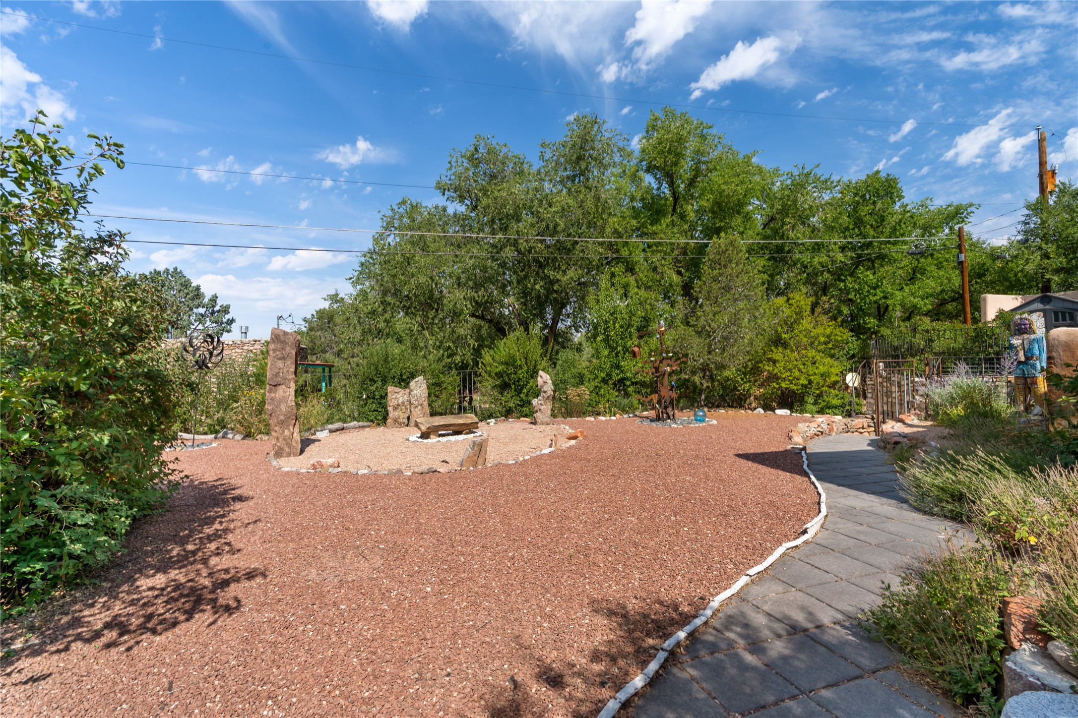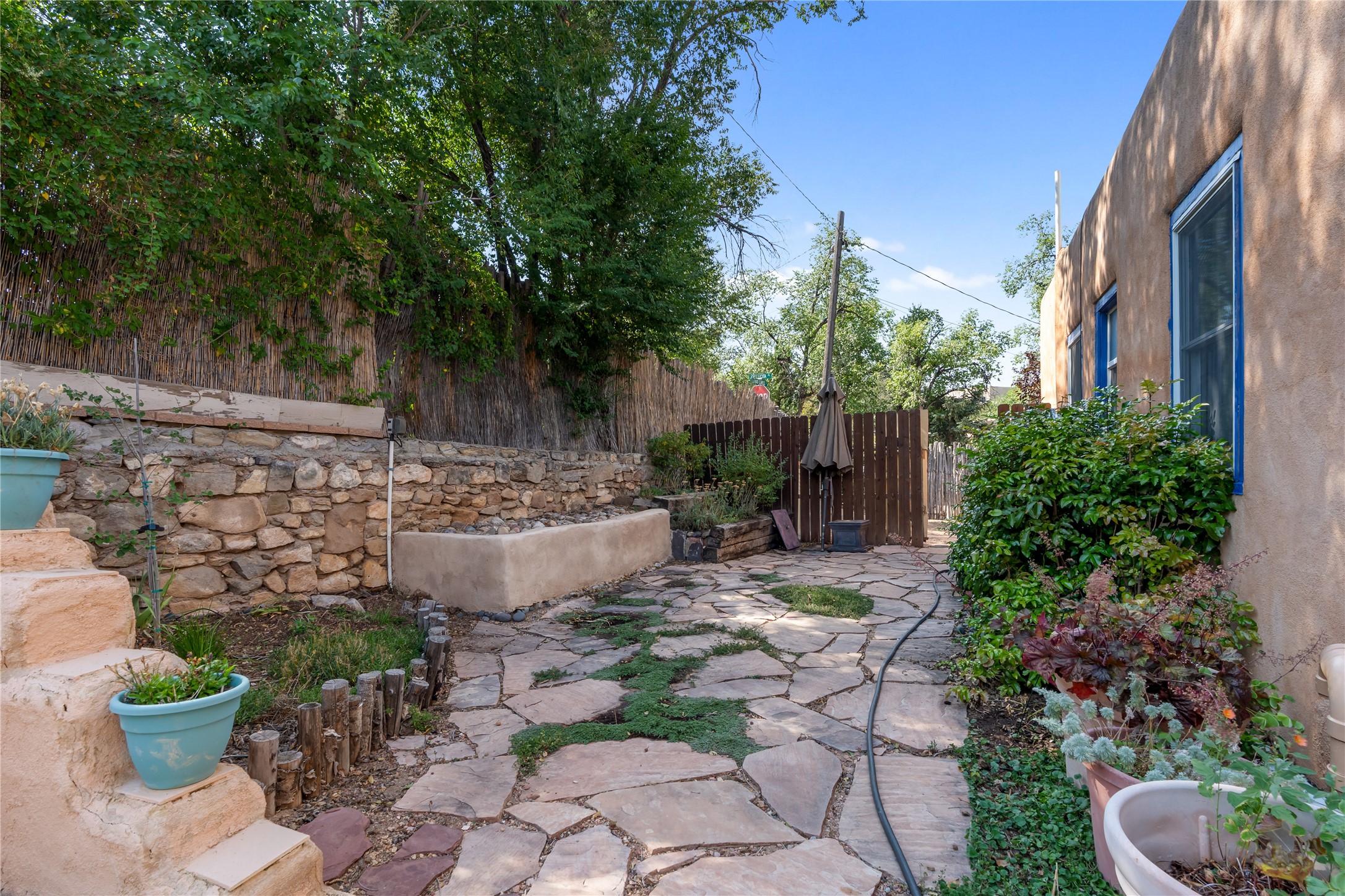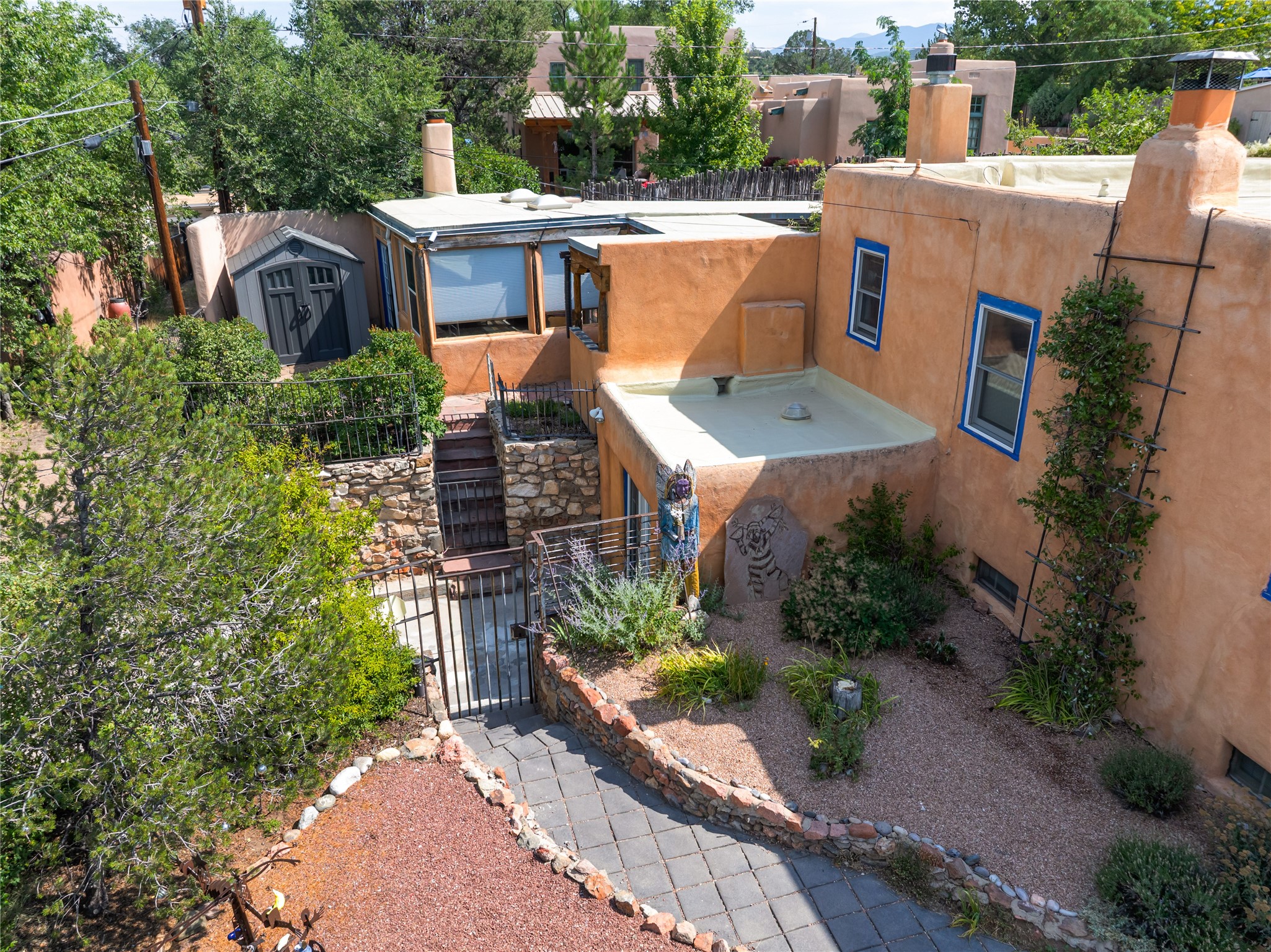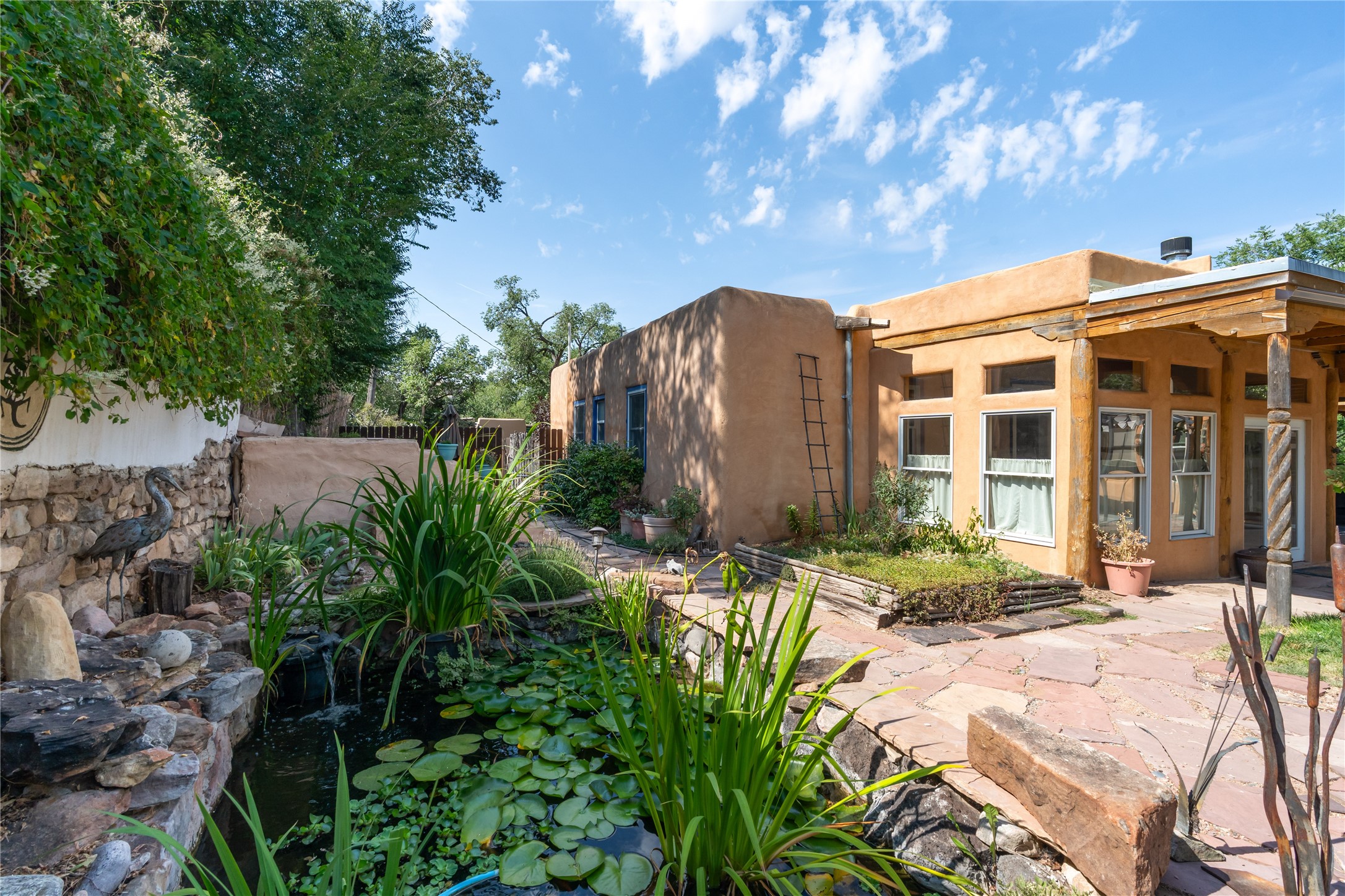 Step into Santa Fe history in this captivating 2,041+/- sq ft pre-war home, where artistic vision meets sustainable living just five blocks from the world-famous Santa Fe Plaza. This unique 3-bedroom, 2-bathroom property enchants from the moment you enter through the whimsical front gate created by renowned Galisteo artist John Massey. The home showcases remarkable historic character with original Santa Fe Penitentiary fencing enclosing the entire property, complete with original iron keys - perfect for pet owners. Venetian plaster finishes & tile flooring downstairs add authentic southwestern elegance, while beautiful hardwood floors grace the main living area and two upper level bedrooms, complemented by a cozy wood-burning kiva fireplace in the living room. Sustainable living features abound in this thoughtfully designed home. The south-facing passive solar design includes a bermed-in lower level that stays naturally cool in summer. The property boasts a 1,400-gallon underground rainwater collection system, mature low-water gardens, and organic raised beds cultivated for 18 years. A super-efficient 92% Lochinvar hydronic heating system minimizes utility costs, while energy-efficient induction cooking and double-pane low-E windows enhance efficiency. The roof was recently recoated in 2025. The outdoor spaces create a true paradise with a tranquil stone and sculpture garden and mature pond featuring over a dozen Koi fish, water lilies, and aquatic plants. A complete outdoor kitchen and dining pavilion with fireplace built from reclaimed Santa Fe Plaza brickwork extends living space seamlessly. Two separate living areas with independent entrances offer exceptional flexibility for multi-generational living, home office space, or rental income potential. The downstairs entrance can be converted back to garage access if desired. This is more than a home--it's a Santa Fe lifestyle combining historic charm, artistic flair, and modern efficiency. Schedule a showing today!