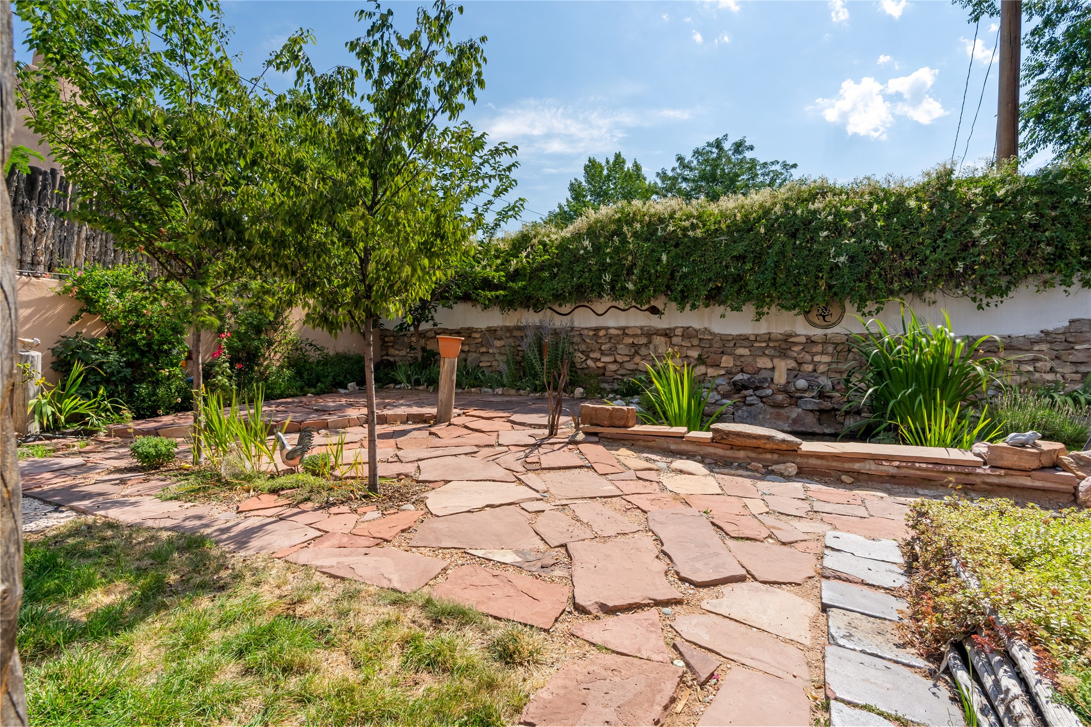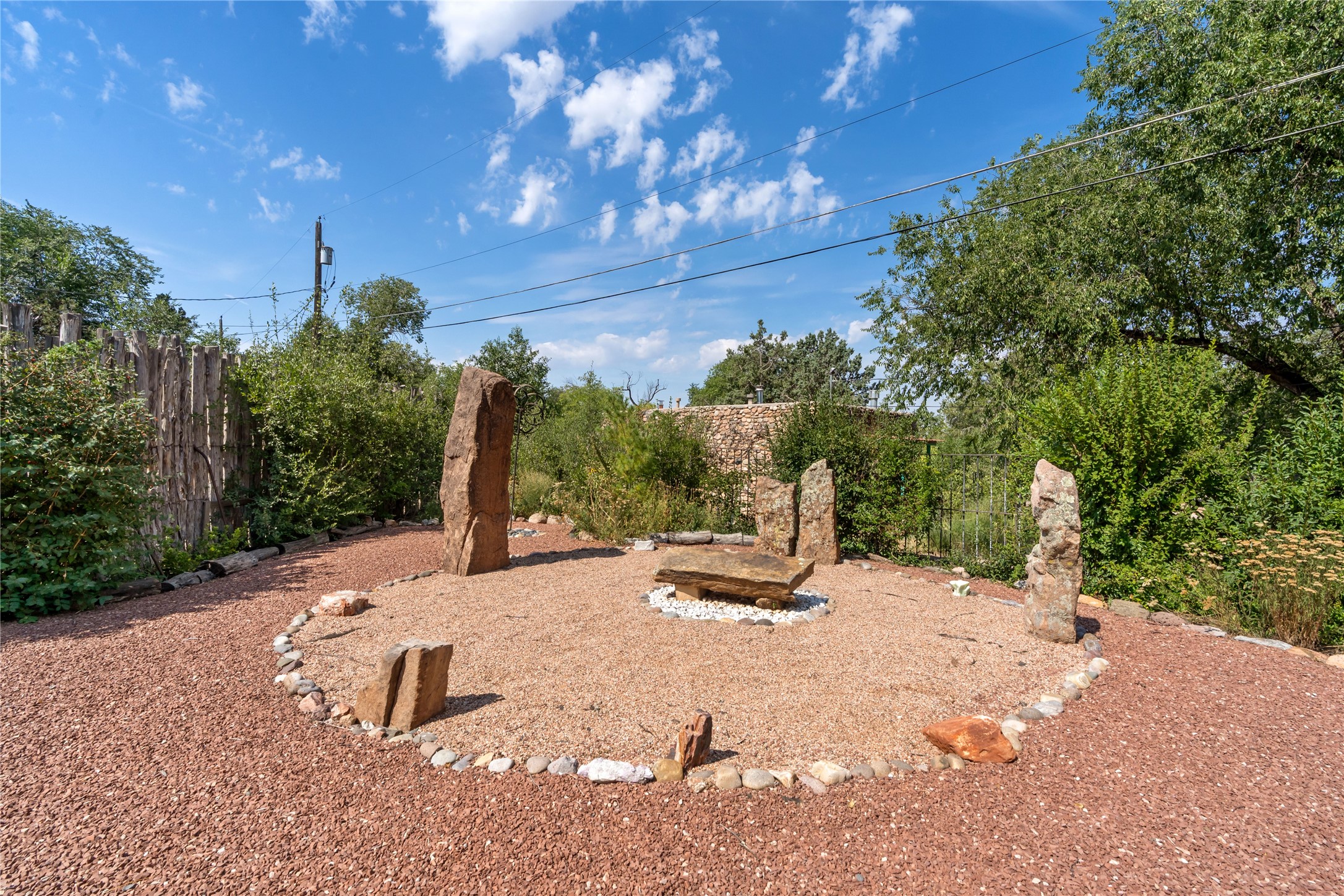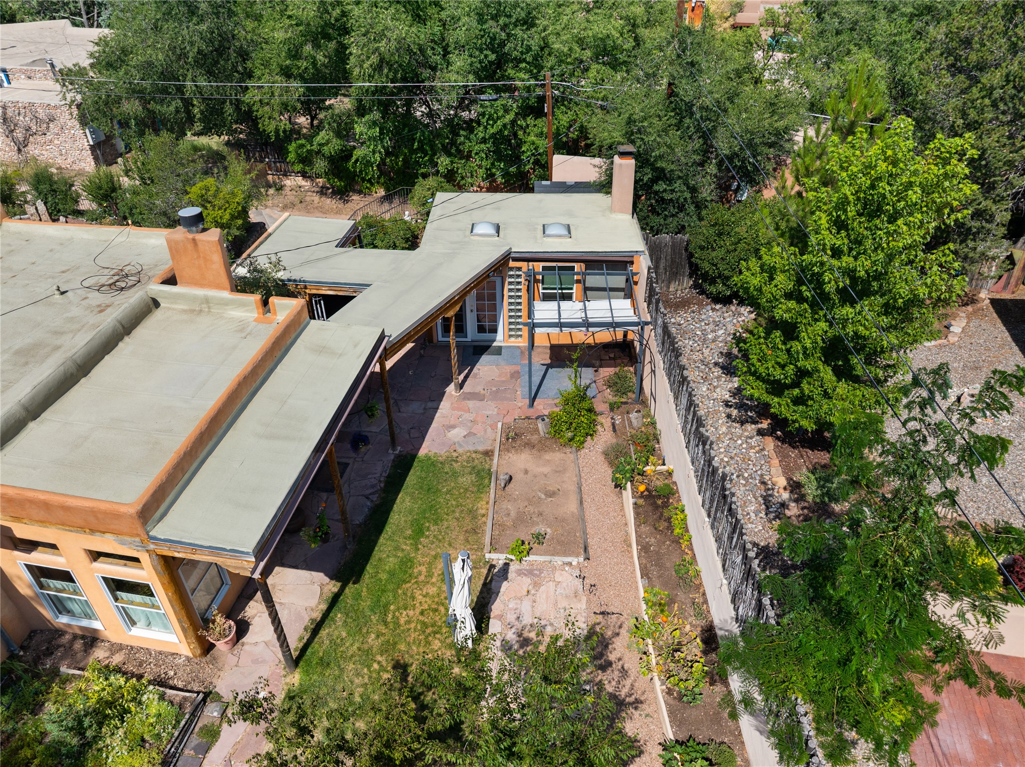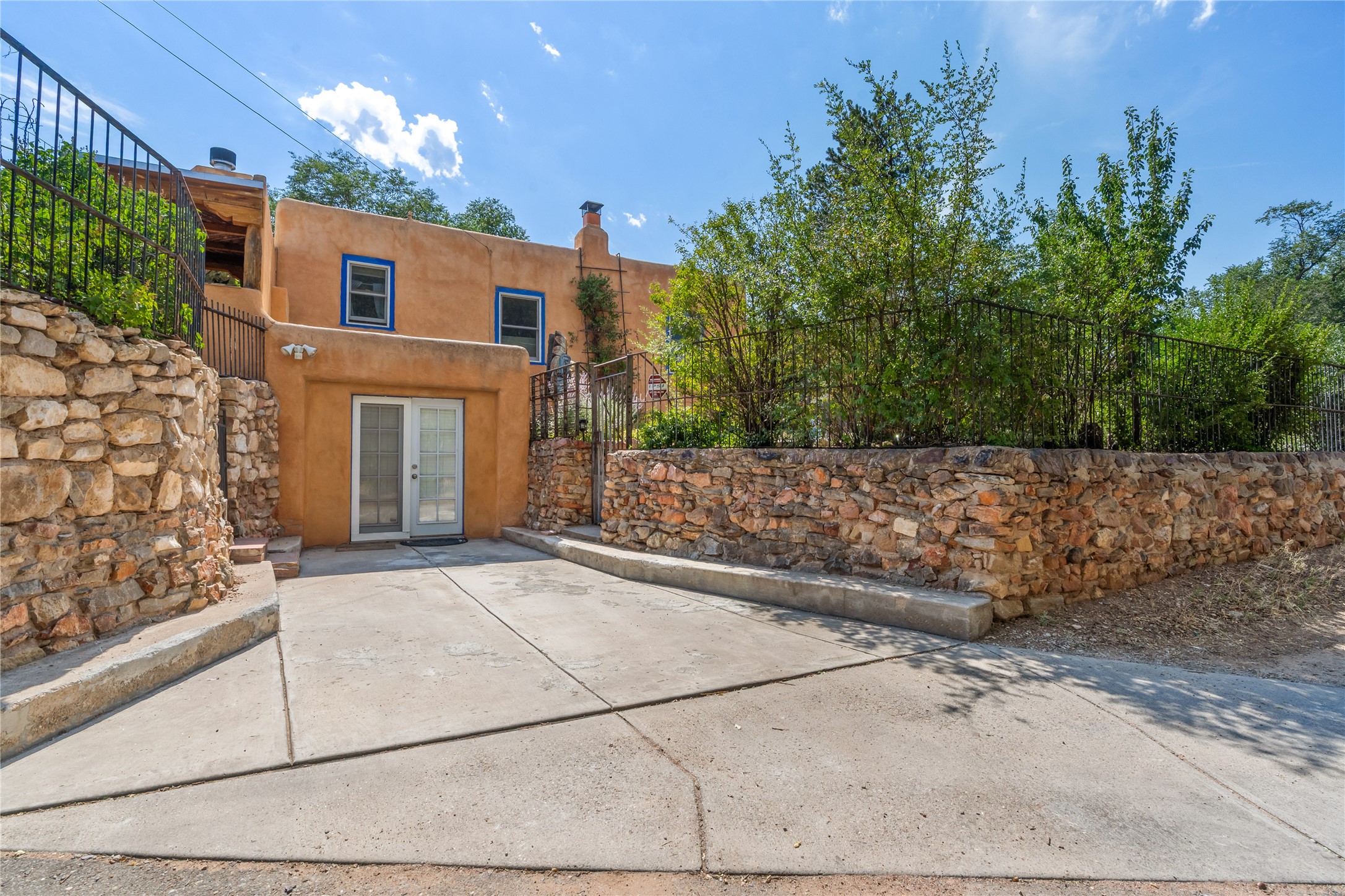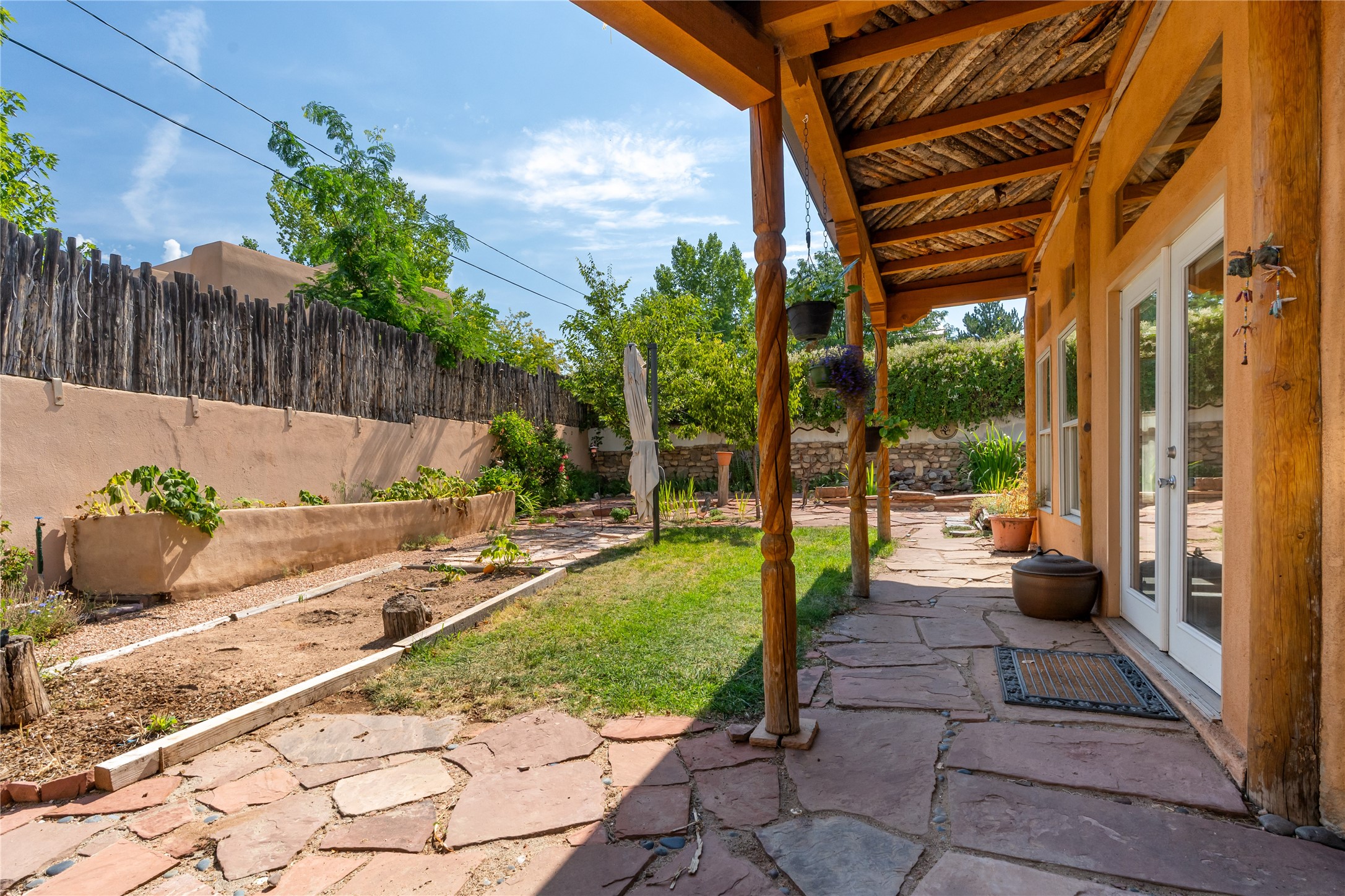 Step into Santa Fe history in this captivating 2,041+/- sq ft pre-war home, where artistic vision meets sustainable living just five blocks from the world-famous Santa Fe Plaza. This unique 3-bedroom, 2-bathroom property enchants from the moment you enter through the whimsical front gate created by renowned Galisteo artist John Massey. The home showcases remarkable historic character with original Santa Fe Penitentiary fencing enclosing the entire property, complete with original iron keys - perfect for pet owners. Venetian plaster finishes & tile flooring downstairs add authentic southwestern elegance, while beautiful hardwood floors grace the main living area and two upper level bedrooms, complemented by a cozy wood-burning kiva fireplace in the living room. Sustainable living features abound in this thoughtfully designed home. The south-facing passive solar design includes a bermed-in lower level that stays naturally cool in summer. The property boasts a 1,400-gallon underground rainwater collection system, mature low-water gardens, and organic raised beds cultivated for 18 years. A super-efficient 92% Lochinvar hydronic heating system minimizes utility costs, while energy-efficient induction cooking and double-pane low-E windows enhance efficiency. The roof was recently recoated in 2025. The outdoor spaces create a true paradise with a tranquil stone and sculpture garden and mature pond featuring over a dozen Koi fish, water lilies, and aquatic plants. A complete outdoor kitchen and dining pavilion with fireplace built from reclaimed Santa Fe Plaza brickwork extends living space seamlessly. Two separate living areas with independent entrances offer exceptional flexibility for multi-generational living, home office space, or rental income potential. The downstairs entrance can be converted back to garage access if desired. This is more than a home--it's a Santa Fe lifestyle combining historic charm, artistic flair, and modern efficiency. Schedule a showing today!