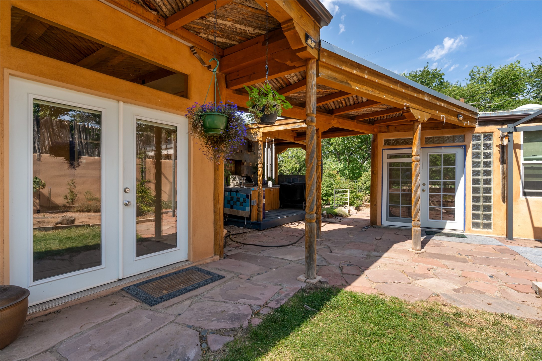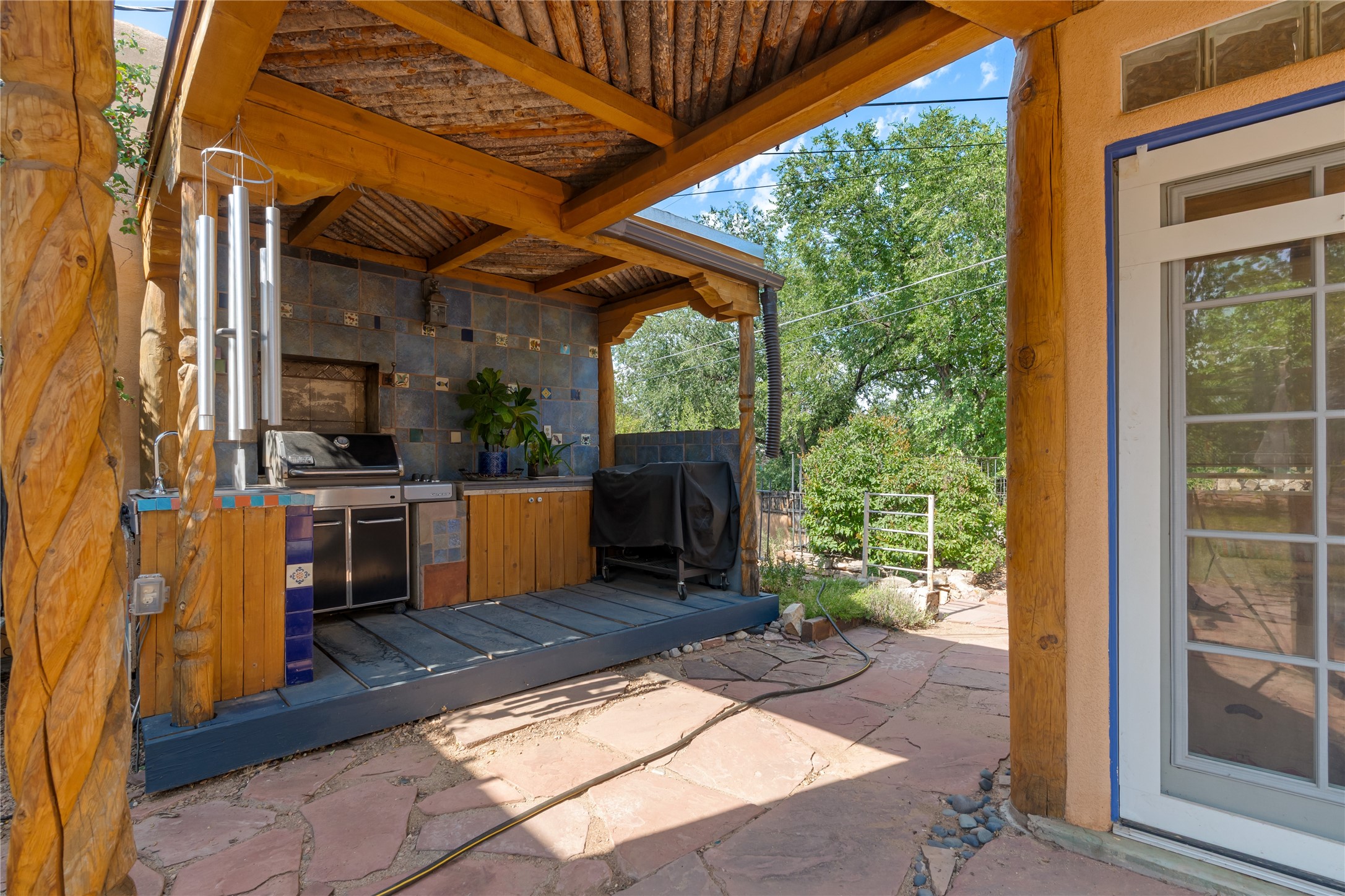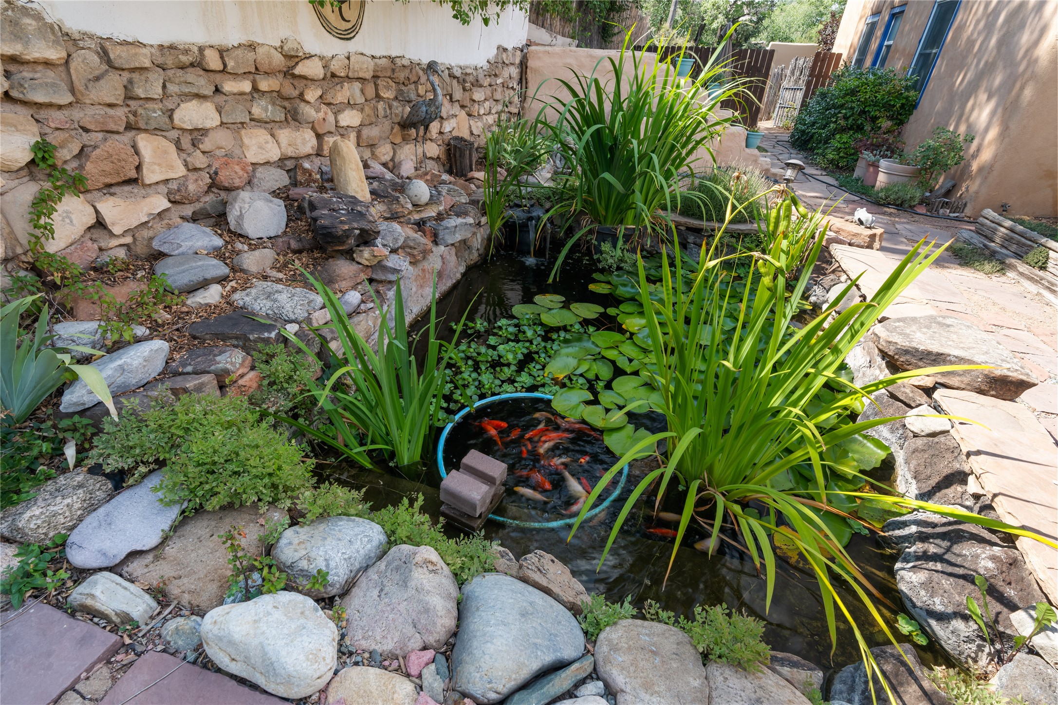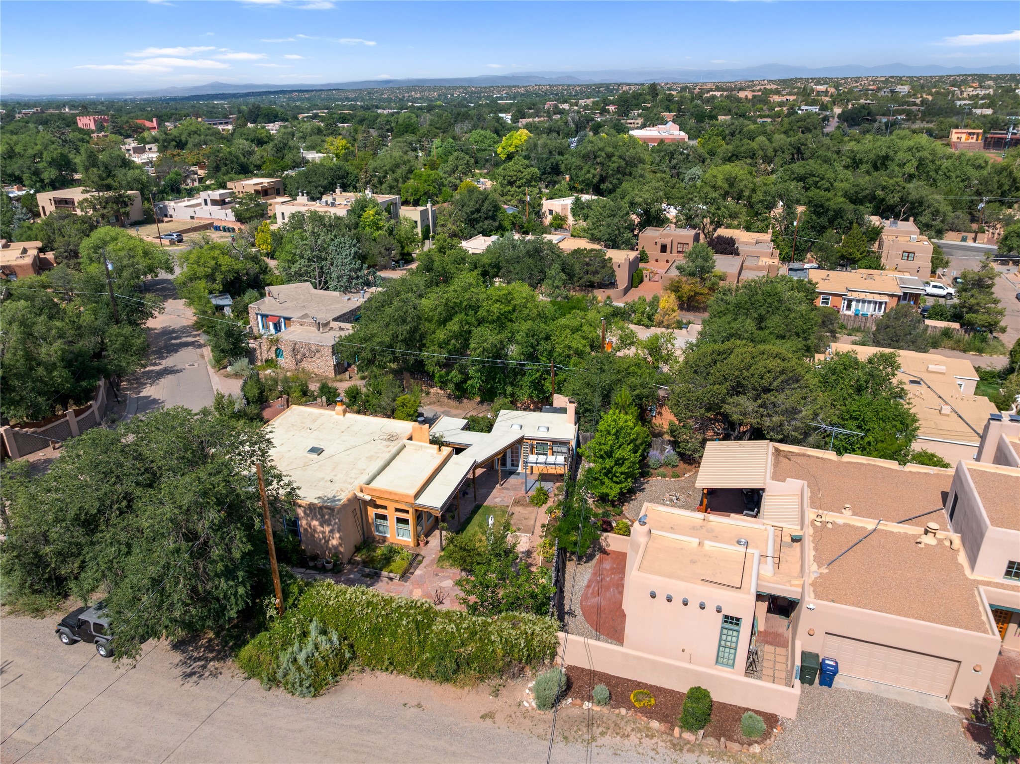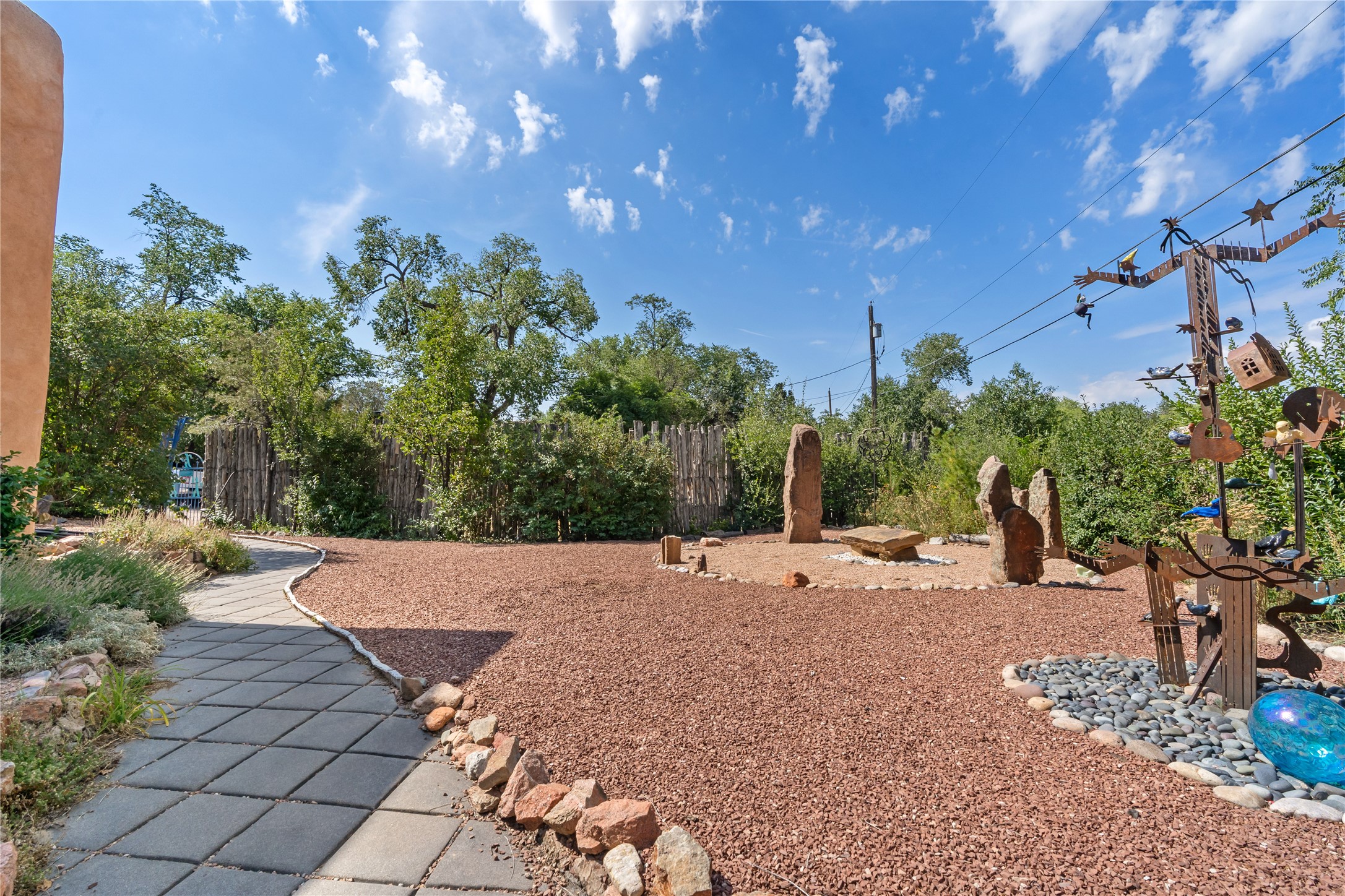 Step into Santa Fe history in this captivating 2,041+/- sq ft pre-war home, where artistic vision meets sustainable living just five blocks from the world-famous Santa Fe Plaza. This unique 3-bedroom, 2-bathroom property enchants from the moment you enter through the whimsical front gate created by renowned Galisteo artist John Massey. The home showcases remarkable historic character with original Santa Fe Penitentiary fencing enclosing the entire property, complete with original iron keys - perfect for pet owners. Venetian plaster finishes & tile flooring downstairs add authentic southwestern elegance, while beautiful hardwood floors grace the main living area and two upper level bedrooms, complemented by a cozy wood-burning kiva fireplace in the living room. Sustainable living features abound in this thoughtfully designed home. The south-facing passive solar design includes a bermed-in lower level that stays naturally cool in summer. The property boasts a 1,400-gallon underground rainwater collection system, mature low-water gardens, and organic raised beds cultivated for 18 years. A super-efficient 92% Lochinvar hydronic heating system minimizes utility costs, while energy-efficient induction cooking and double-pane low-E windows enhance efficiency. The roof was recently recoated in 2025. The outdoor spaces create a true paradise with a tranquil stone and sculpture garden and mature pond featuring over a dozen Koi fish, water lilies, and aquatic plants. A complete outdoor kitchen and dining pavilion with fireplace built from reclaimed Santa Fe Plaza brickwork extends living space seamlessly. Two separate living areas with independent entrances offer exceptional flexibility for multi-generational living, home office space, or rental income potential. The downstairs entrance can be converted back to garage access if desired. This is more than a home--it's a Santa Fe lifestyle combining historic charm, artistic flair, and modern efficiency. Schedule a showing today!