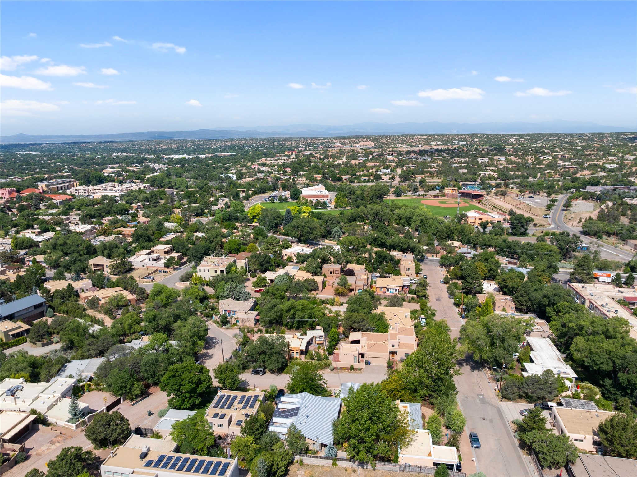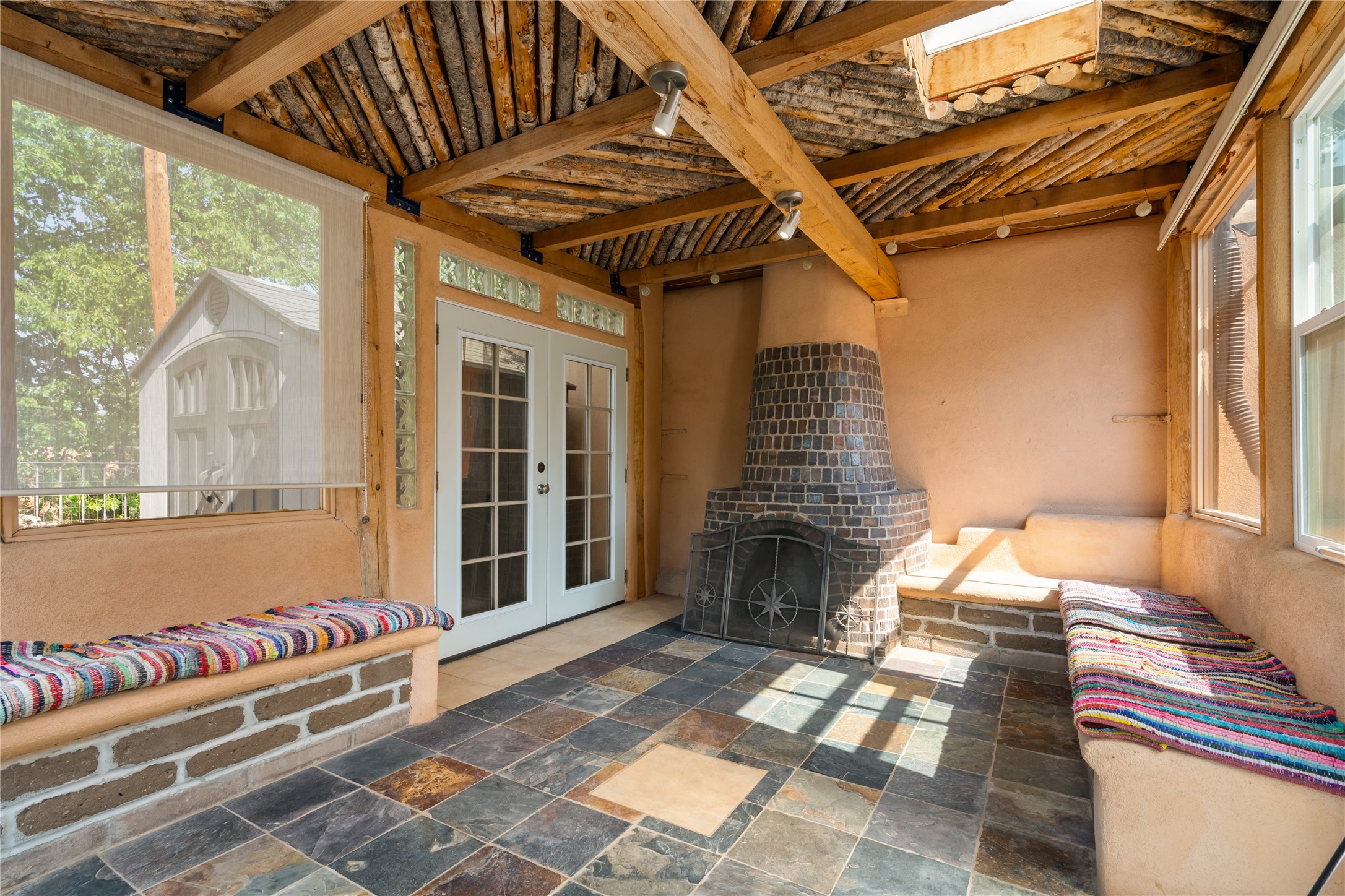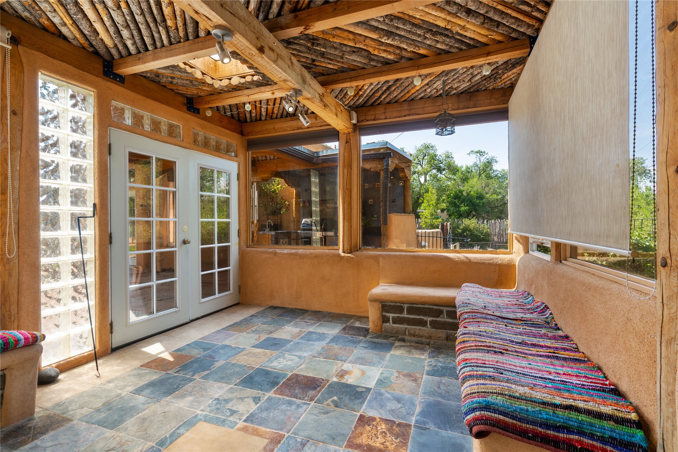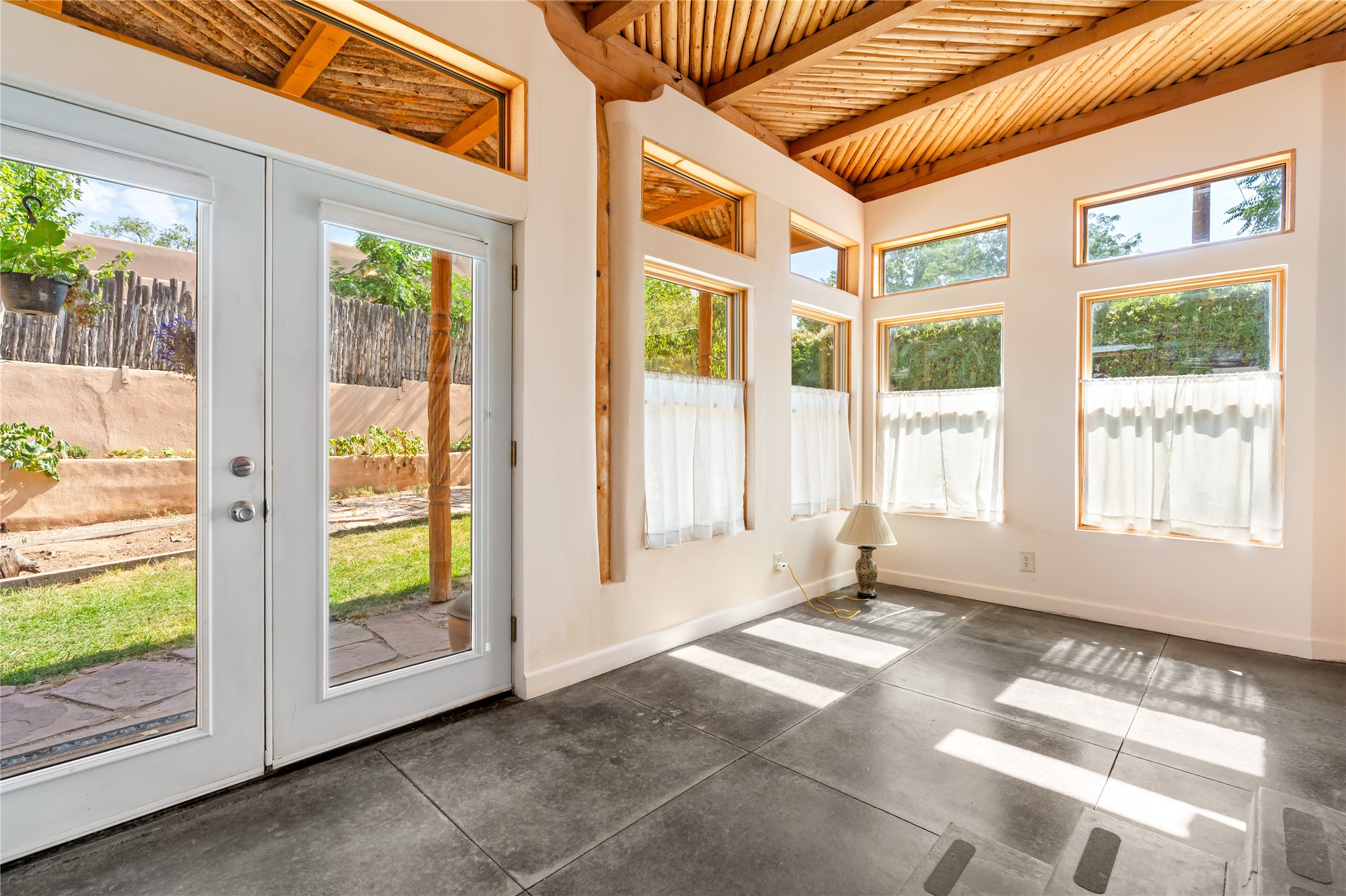 Step into Santa Fe history in this captivating 2,041+/- sq ft pre-war home, where artistic vision meets sustainable living just five blocks from the world-famous Santa Fe Plaza. This unique 3-bedroom, 2-bathroom property enchants from the moment you enter through the whimsical front gate created by renowned Galisteo artist John Massey. The home showcases remarkable historic character with original Santa Fe Penitentiary fencing enclosing the entire property, complete with original iron keys - perfect for pet owners. Venetian plaster finishes & tile flooring downstairs add authentic southwestern elegance, while beautiful hardwood floors grace the main living area and two upper level bedrooms, complemented by a cozy wood-burning kiva fireplace in the living room. Sustainable living features abound in this thoughtfully designed home. The south-facing passive solar design includes a bermed-in lower level that stays naturally cool in summer. The property boasts a 1,400-gallon underground rainwater collection system, mature low-water gardens, and organic raised beds cultivated for 18 years. A super-efficient 92% Lochinvar hydronic heating system minimizes utility costs, while energy-efficient induction cooking and double-pane low-E windows enhance efficiency. The roof was recently recoated in 2025. The outdoor spaces create a true paradise with a tranquil stone and sculpture garden and mature pond featuring over a dozen Koi fish, water lilies, and aquatic plants. A complete outdoor kitchen and dining pavilion with fireplace built from reclaimed Santa Fe Plaza brickwork extends living space seamlessly. Two separate living areas with independent entrances offer exceptional flexibility for multi-generational living, home office space, or rental income potential. The downstairs entrance can be converted back to garage access if desired. This is more than a home--it's a Santa Fe lifestyle combining historic charm, artistic flair, and modern efficiency. Schedule a showing today!