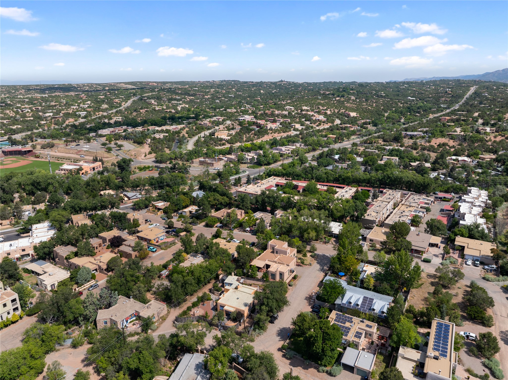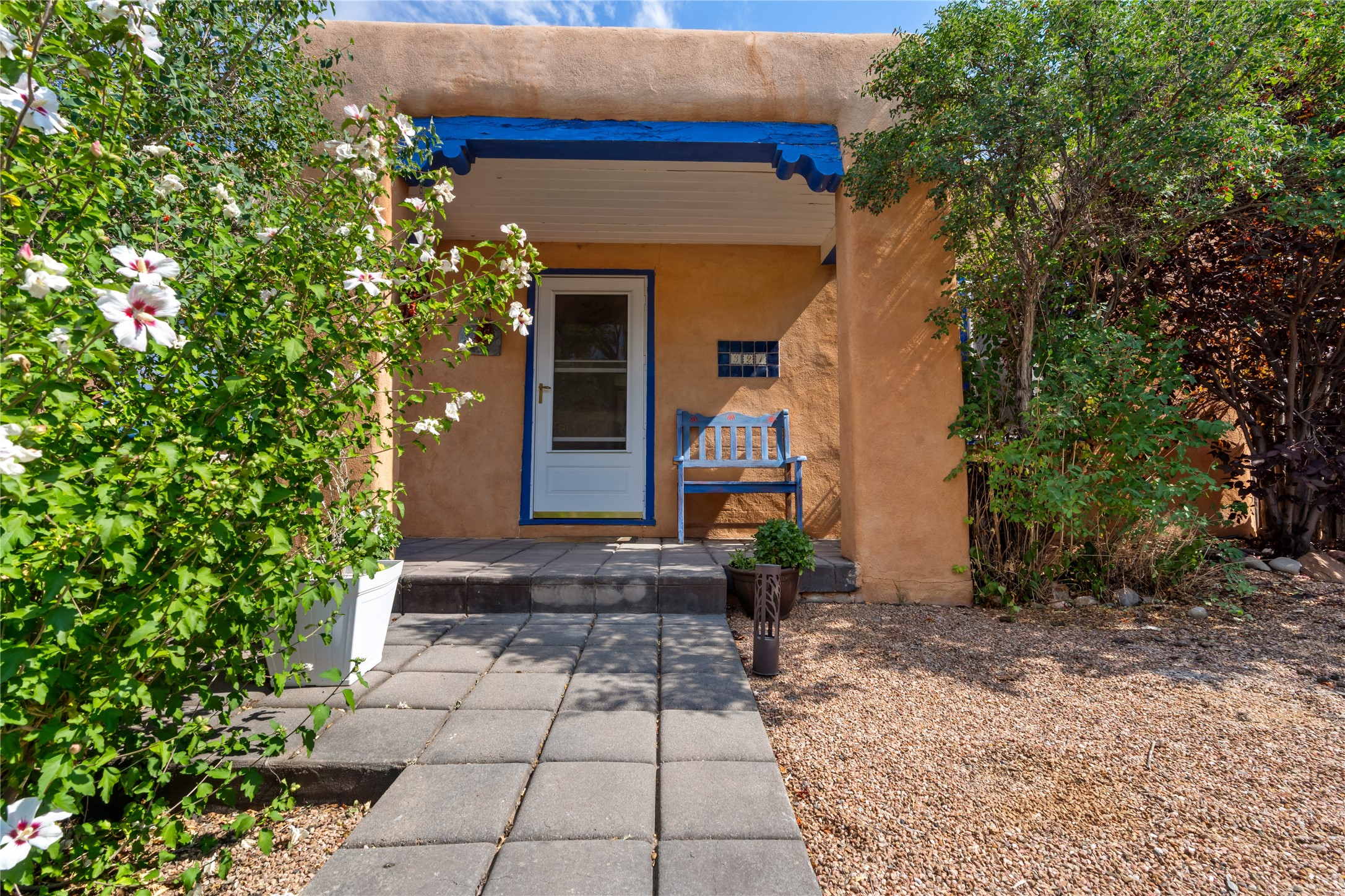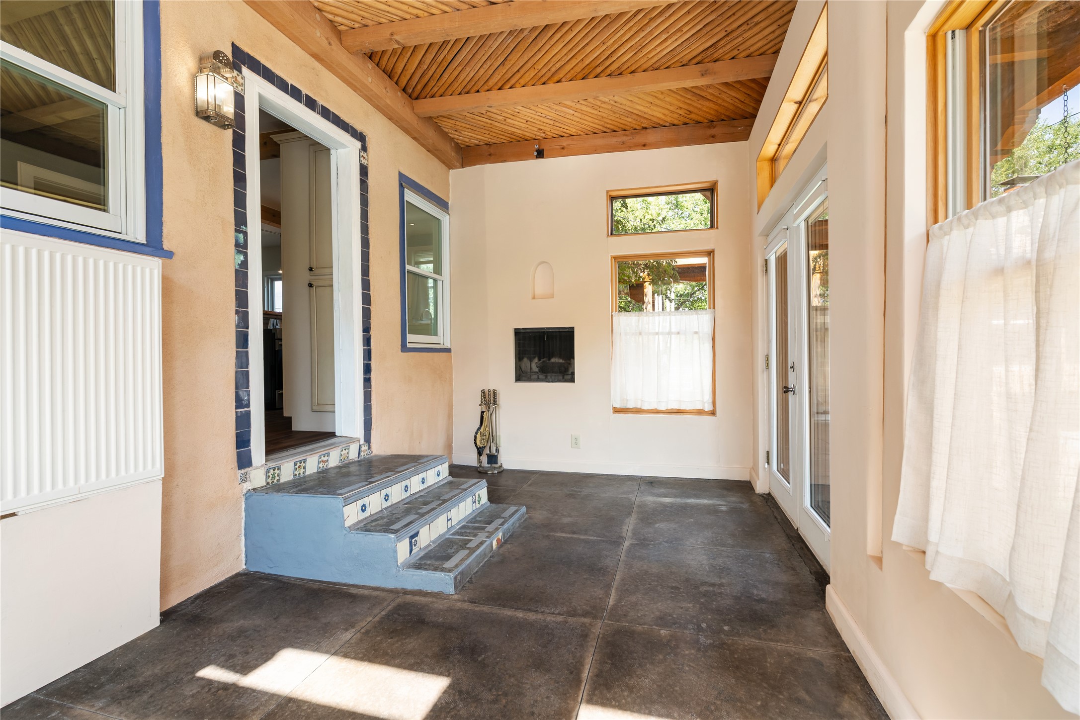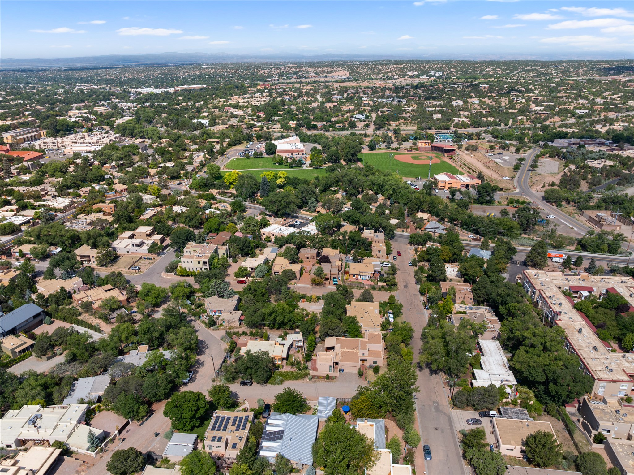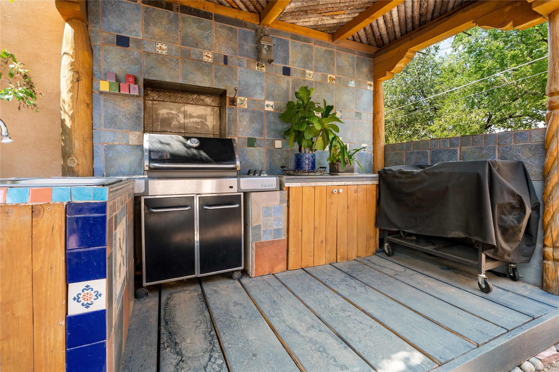 Step into Santa Fe history in this captivating 2,041+/- sq ft pre-war home, where artistic vision meets sustainable living just five blocks from the world-famous Santa Fe Plaza. This unique 3-bedroom, 2-bathroom property enchants from the moment you enter through the whimsical front gate created by renowned Galisteo artist John Massey. The home showcases remarkable historic character with original Santa Fe Penitentiary fencing enclosing the entire property, complete with original iron keys - perfect for pet owners. Venetian plaster finishes & tile flooring downstairs add authentic southwestern elegance, while beautiful hardwood floors grace the main living area and two upper level bedrooms, complemented by a cozy wood-burning kiva fireplace in the living room. Sustainable living features abound in this thoughtfully designed home. The south-facing passive solar design includes a bermed-in lower level that stays naturally cool in summer. The property boasts a 1,400-gallon underground rainwater collection system, mature low-water gardens, and organic raised beds cultivated for 18 years. A super-efficient 92% Lochinvar hydronic heating system minimizes utility costs, while energy-efficient induction cooking and double-pane low-E windows enhance efficiency. The roof was recently recoated in 2025. The outdoor spaces create a true paradise with a tranquil stone and sculpture garden and mature pond featuring over a dozen Koi fish, water lilies, and aquatic plants. A complete outdoor kitchen and dining pavilion with fireplace built from reclaimed Santa Fe Plaza brickwork extends living space seamlessly. Two separate living areas with independent entrances offer exceptional flexibility for multi-generational living, home office space, or rental income potential. The downstairs entrance can be converted back to garage access if desired. This is more than a home--it's a Santa Fe lifestyle combining historic charm, artistic flair, and modern efficiency. Schedule a showing today!