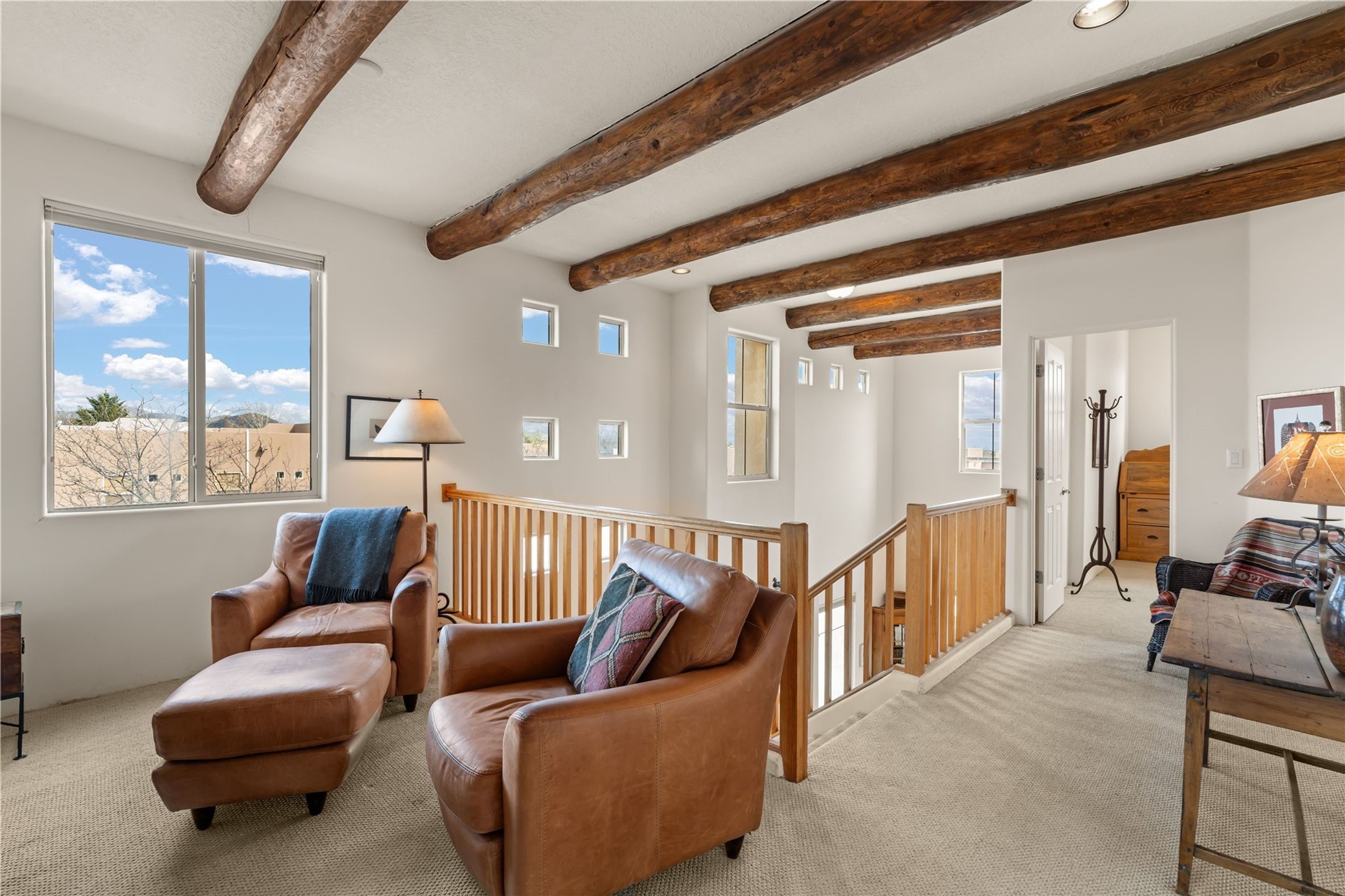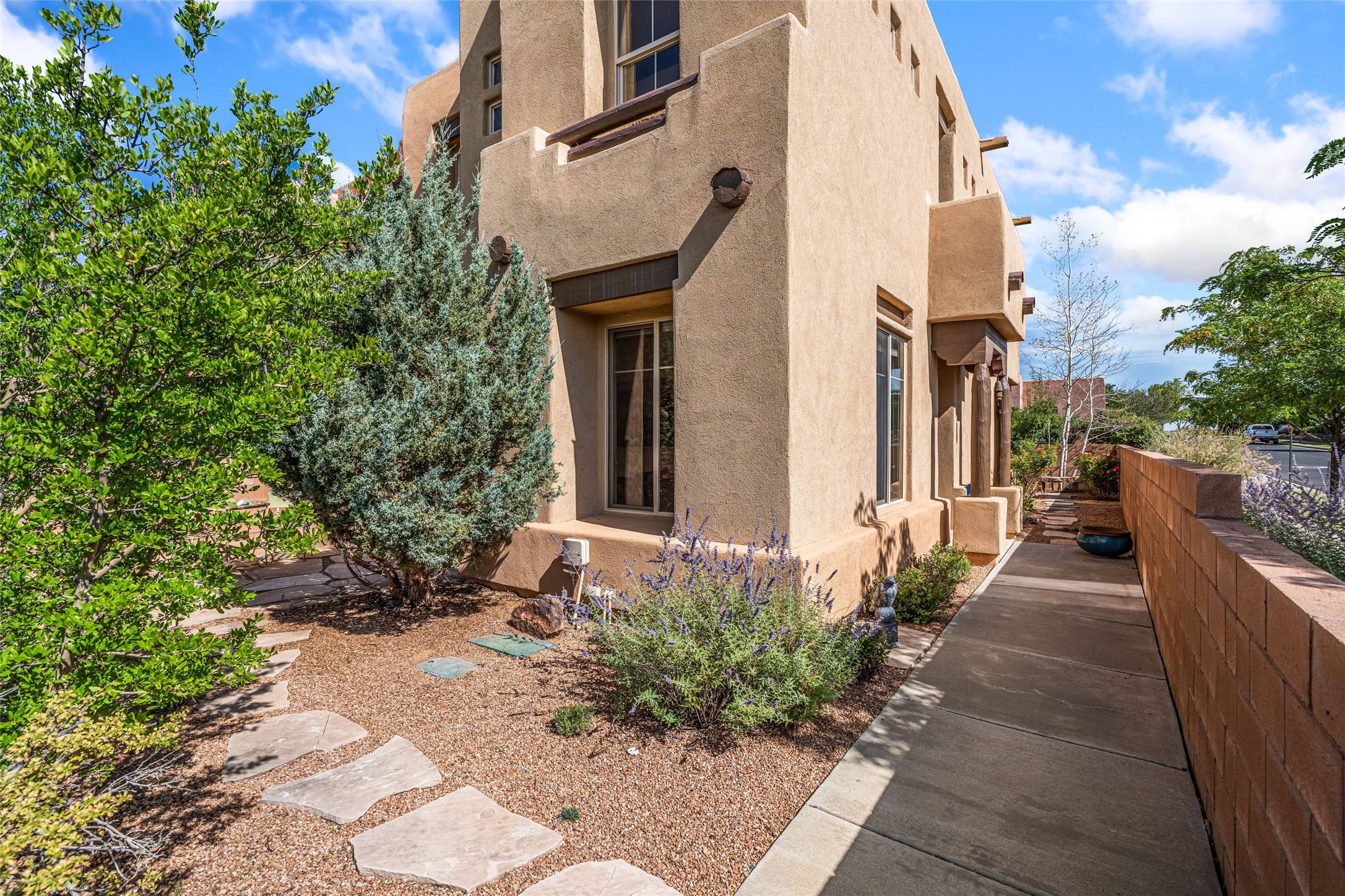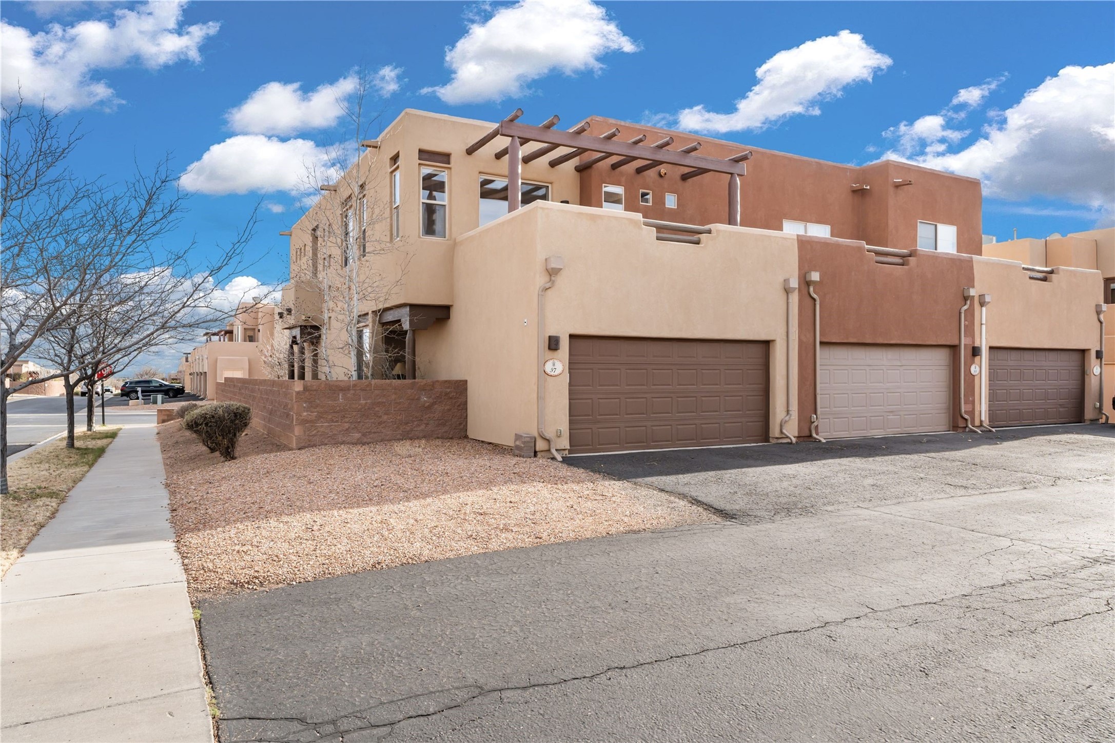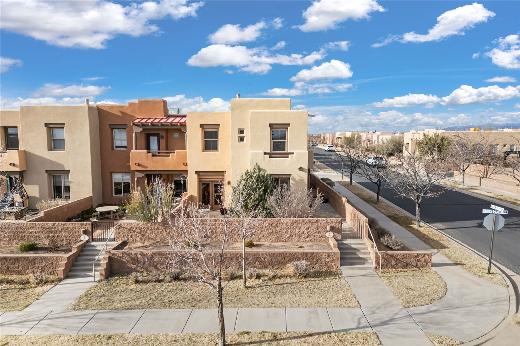 This updated end-unit townhome in Rancho Viejo offers low-maintenance living, modern upgrades, and convenient access to parks, trails, and Santa Fe amenities. With 2 bedrooms, 3 bathrooms, and 1,642 square feet of living space, the home features an open, light-filled layout ideal for comfortable living and entertaining. The living room with gas fireplace flows into a dining area and kitchen with new stainless steel appliances installed in July 2025. Upstairs, the spacious primary suite includes a balcony with northeast orientation capturing both sunrise and sunset light, along with a walk-in closet and ensuite bath. A second bedroom and full bath complete the upper level. Major systems and components have been updated, including a new HVAC system and hot water heater (2023), new balcony decking and roof (2024), and all exterior maintenance covered by the HOA. High-speed internet is available, and the attached two-car garage provides direct interior access. Enjoy outdoor space with a private deck and courtyard, plus proximity to trails, a park directly across the street, and Santa Fe Community College just 1.6 miles (about 5 minutes) away. Shopping and restaurants are 4.7 miles (about 12 minutes) away, and downtown Santa Fe is within easy reach. HOA dues also cover exterior maintenance, adding to the property's lock-and-leave appeal. Combining a prime location with significant recent improvements, this townhome offers a turnkey lifestyle in a peaceful community setting.