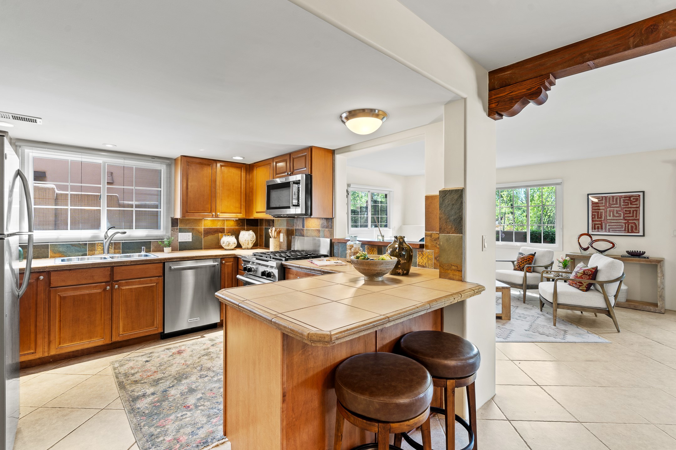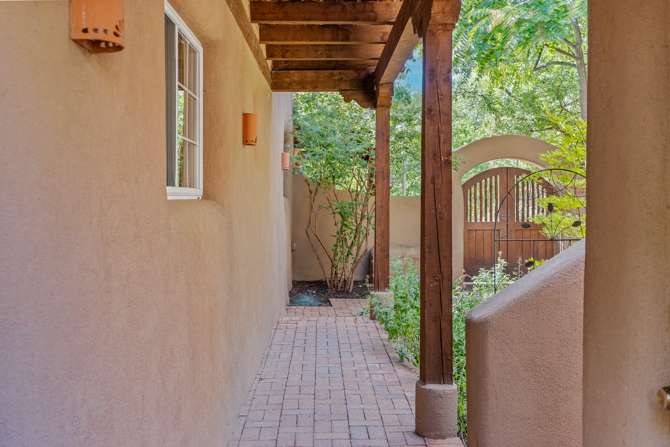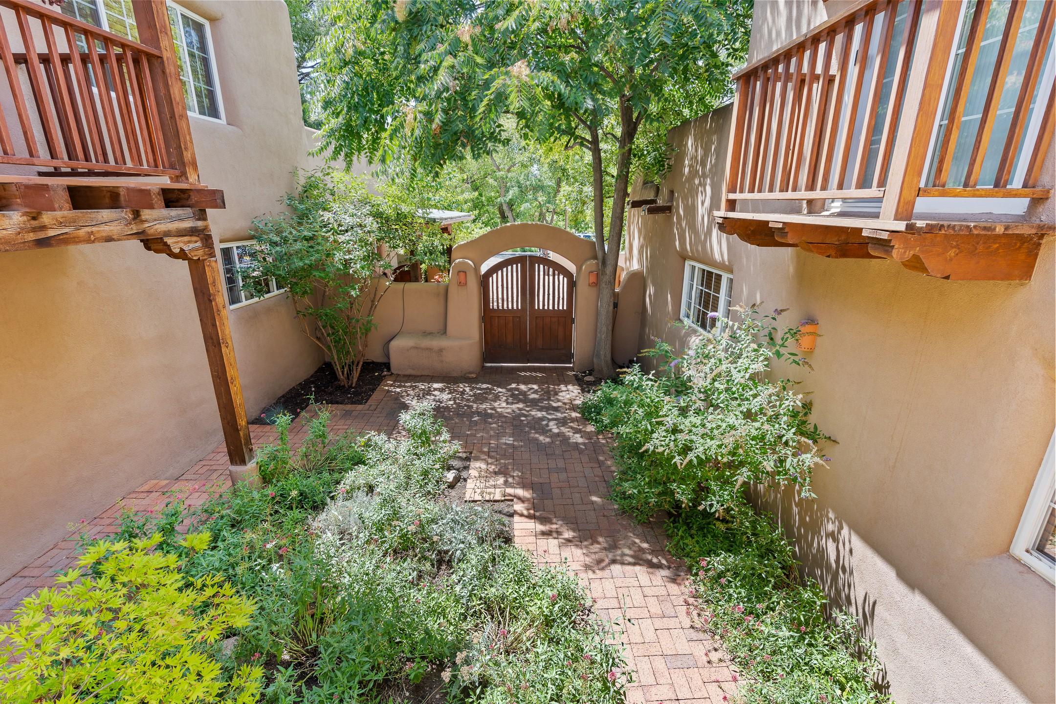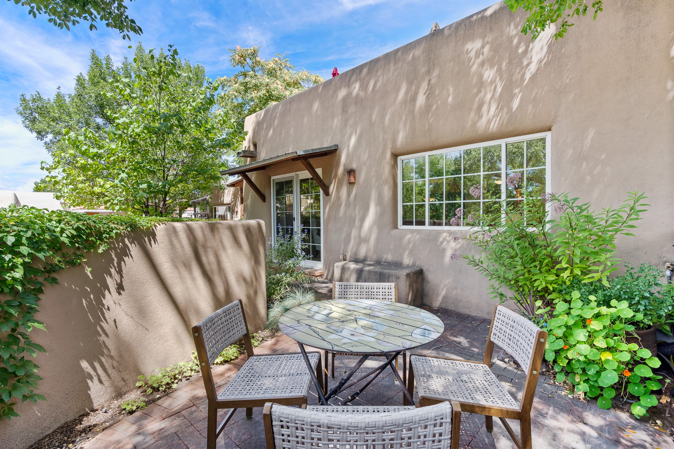 Just a short stroll from the historic Plaza, this inviting 2-bedroom, 2-bath condo blends modern comfort with timeless Southwestern charm. Located across from the Santa Fe River, you can wander its peaceful banks straight into downtown, where world-class dining, art galleries, and cultural landmarks await. With a desirable southeast orientation, the open concept living spaces are bathed in natural light. Tile floors, spacious bedrooms, and custom finishes reflect Santa Fe's distinctive artistry, while the gourmet kitchen--featuring high-end stainless-steel appliances, tile countertops, and warm wood cabinetry--offers both style and function. A dedicated dining room provides the perfect setting for family meals or entertaining guests. The primary bedroom opens to a private patio, ideal for morning coffee or quiet reflection. In the evening, enjoy the lively neighborhood atmosphere from the front patio, or unwind with a glass of wine beneath the surrounding cottonwoods. Additional highlights include two off-street parking spaces, forced-air heating and air conditioning, and a shared courtyard that fosters a welcoming sense of community. With only four units in the complex and modest dues of just $155 per month, this rare Santa Fe enclave offers both privacy and charm. Whether you're seeking a full-time home or a sophisticated pied--terre, this condo is your gateway to the very best of Santa Fe living.