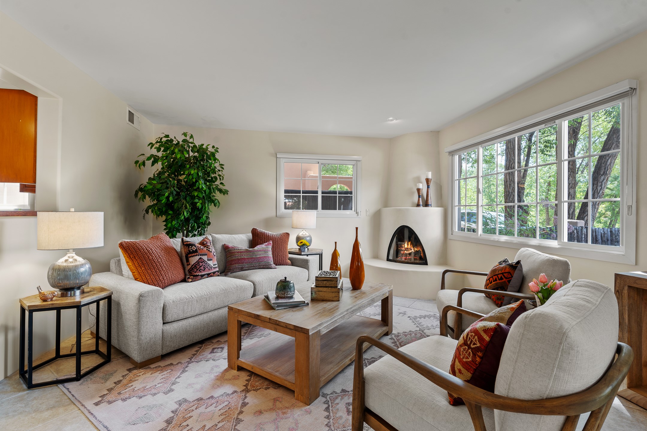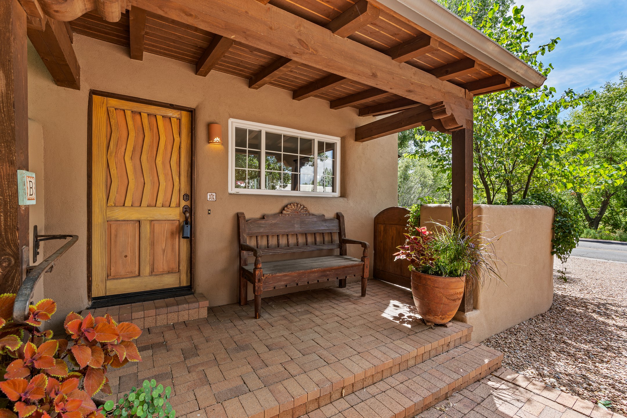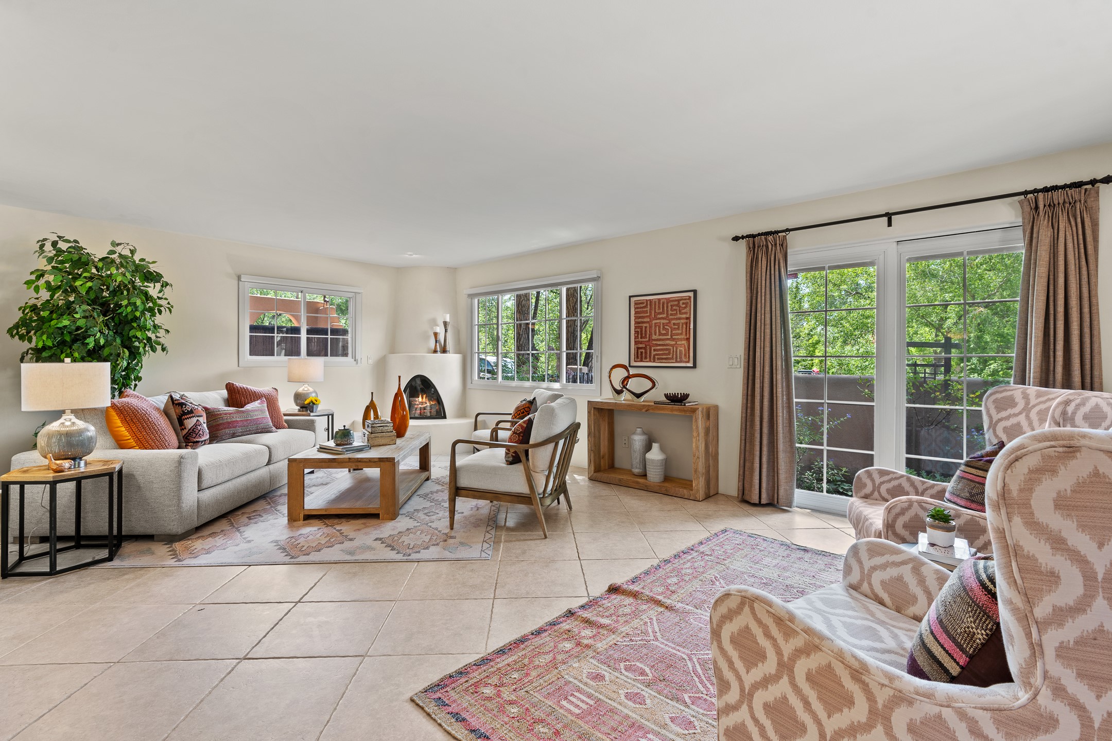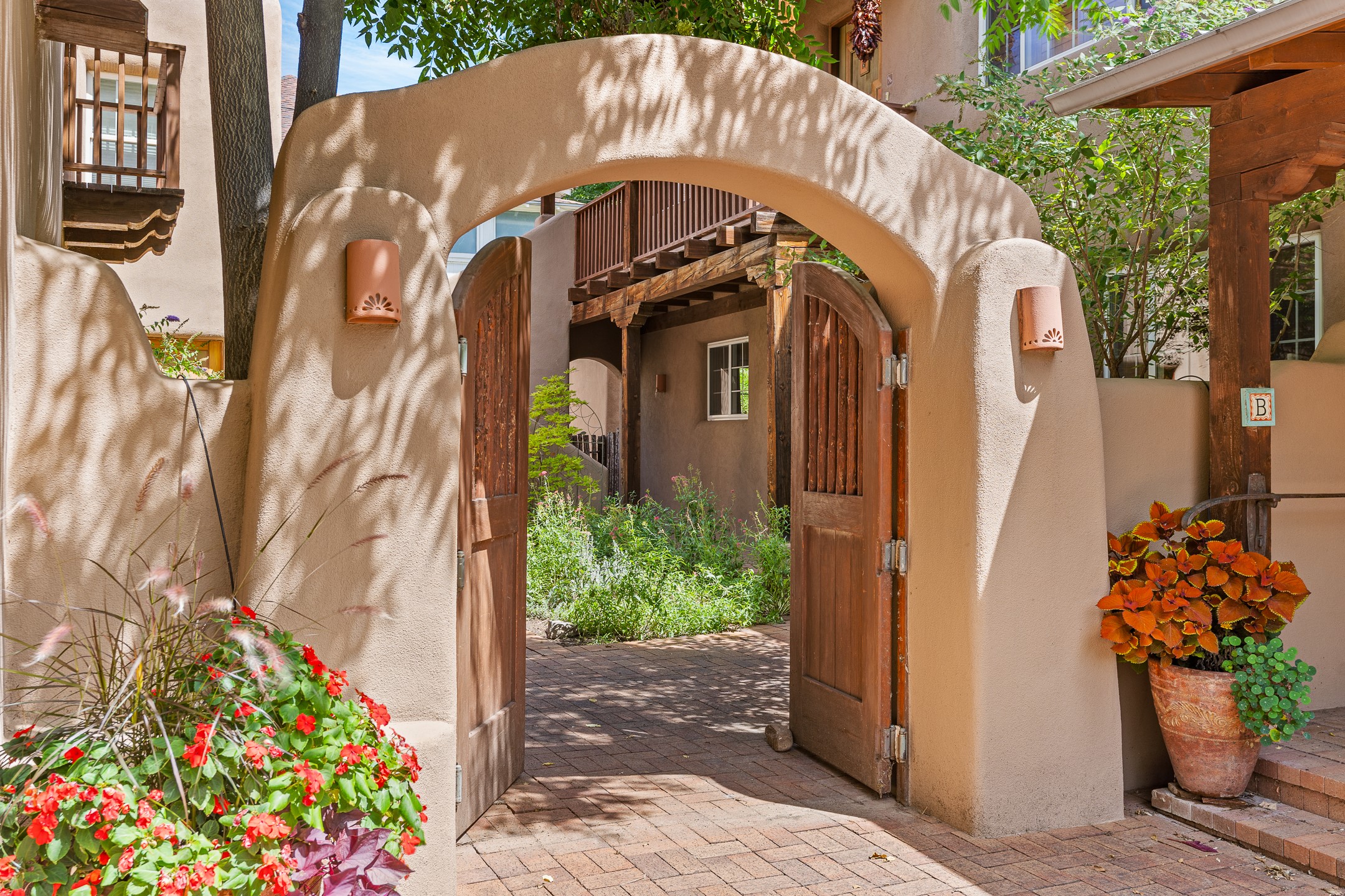 Just a short stroll from the historic Plaza, this inviting 2-bedroom, 2-bath condo blends modern comfort with timeless Southwestern charm. Located across from the Santa Fe River, you can wander its peaceful banks straight into downtown, where world-class dining, art galleries, and cultural landmarks await. With a desirable southeast orientation, the open concept living spaces are bathed in natural light. Tile floors, spacious bedrooms, and custom finishes reflect Santa Fe's distinctive artistry, while the gourmet kitchen--featuring high-end stainless-steel appliances, tile countertops, and warm wood cabinetry--offers both style and function. A dedicated dining room provides the perfect setting for family meals or entertaining guests. The primary bedroom opens to a private patio, ideal for morning coffee or quiet reflection. In the evening, enjoy the lively neighborhood atmosphere from the front patio, or unwind with a glass of wine beneath the surrounding cottonwoods. Additional highlights include two off-street parking spaces, forced-air heating and air conditioning, and a shared courtyard that fosters a welcoming sense of community. With only four units in the complex and modest dues of just $155 per month, this rare Santa Fe enclave offers both privacy and charm. Whether you're seeking a full-time home or a sophisticated pied--terre, this condo is your gateway to the very best of Santa Fe living.