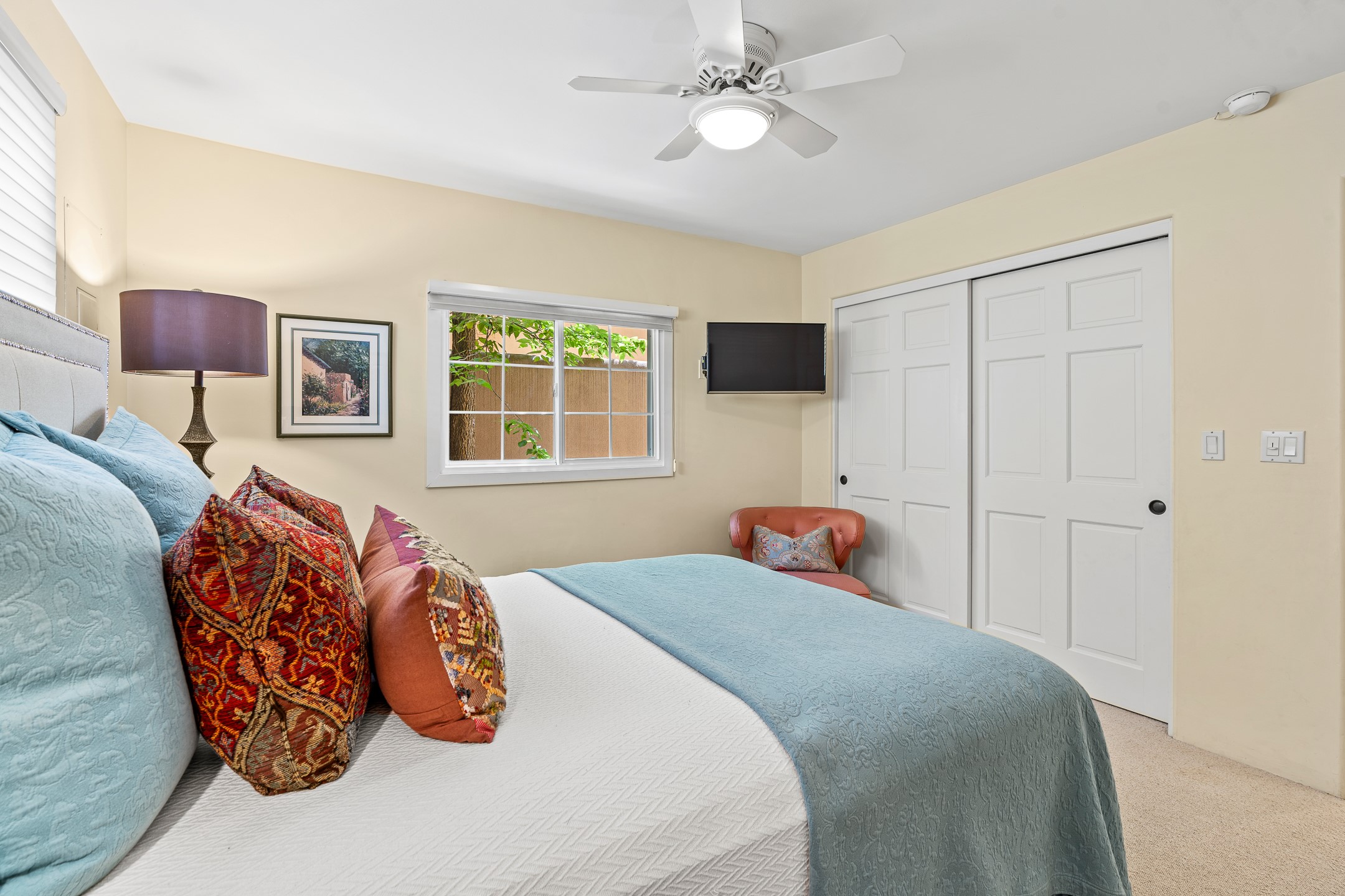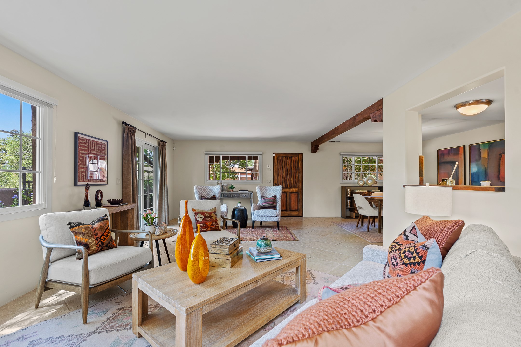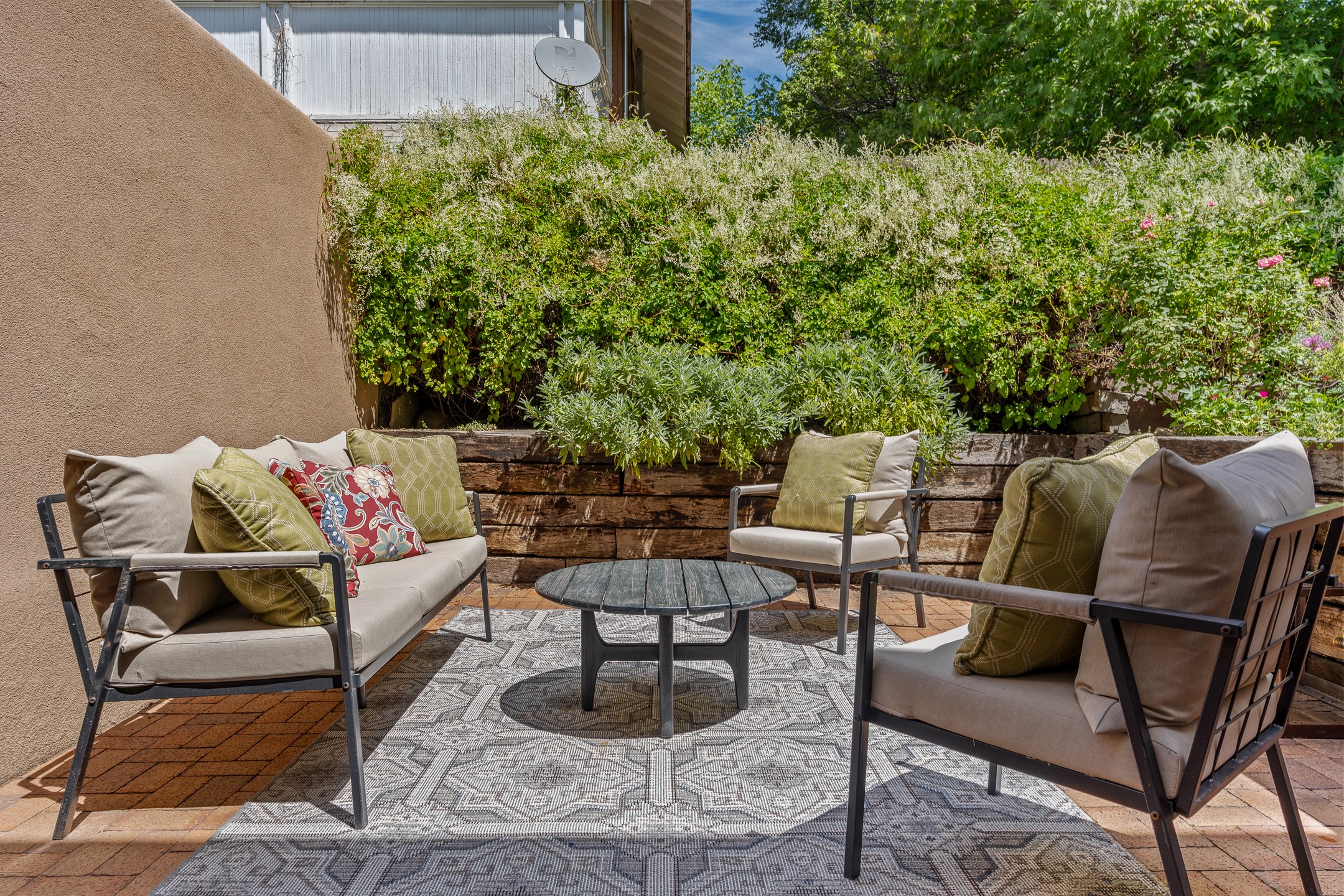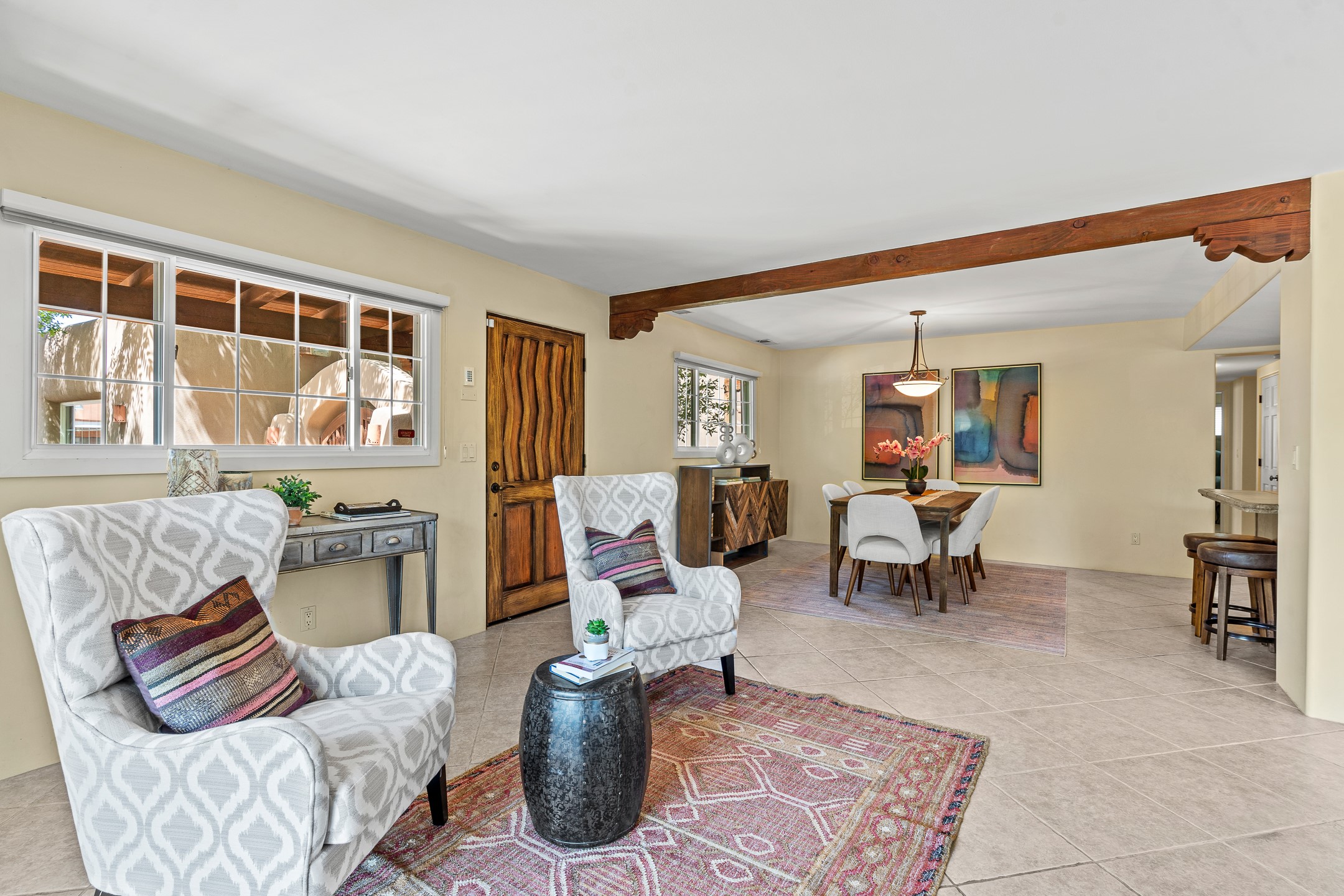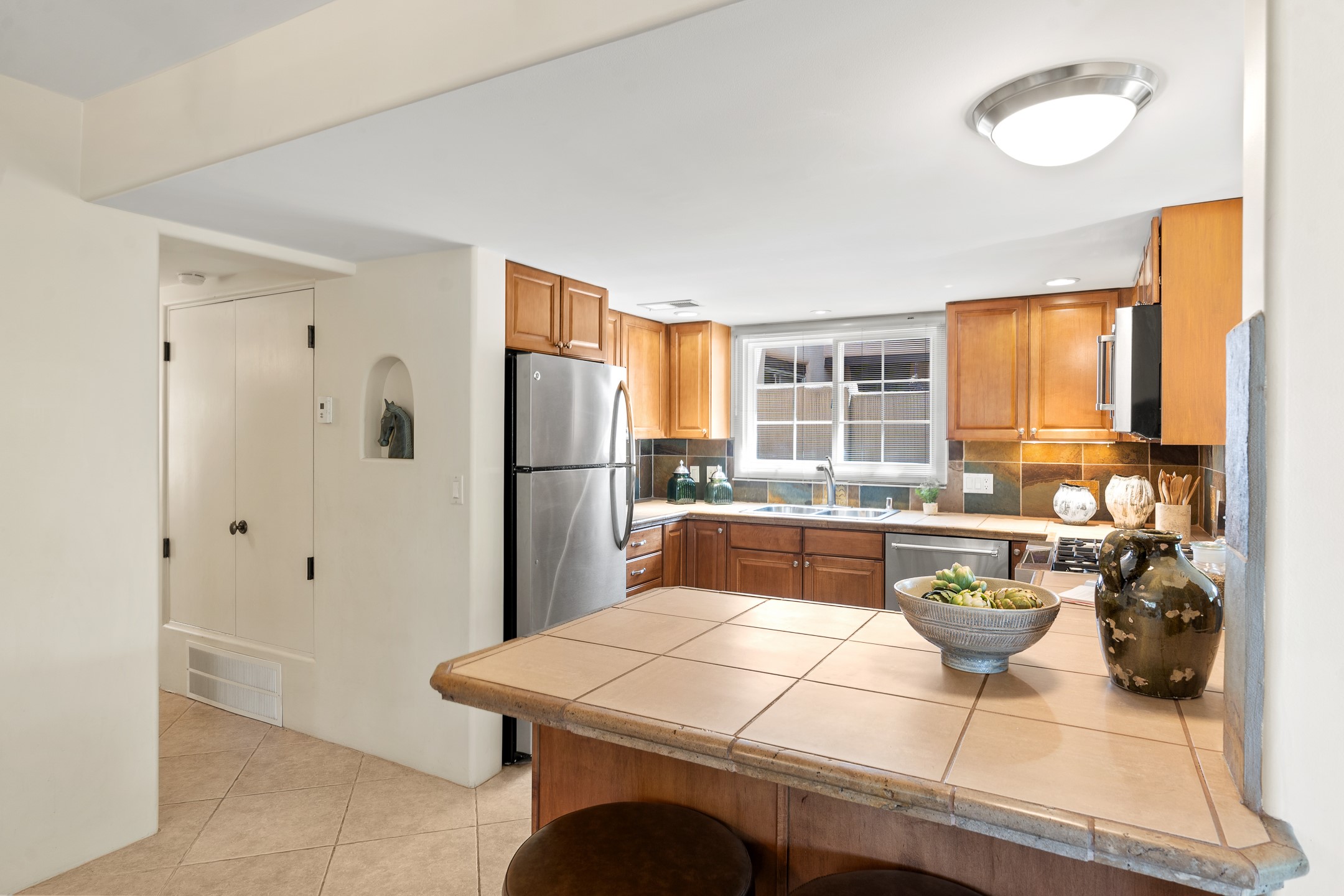Just a short stroll from the historic Plaza, this inviting 2-bedroom, 2-bath condo blends modern comfort with timeless Southwestern charm. Located across from the Santa Fe River, you can wander its peaceful banks straight into downtown, where world-class dining, art galleries, and cultural landmarks await. With a desirable southeast orientation, the open concept living spaces are bathed in natural light. Tile floors, spacious bedrooms, and custom finishes reflect Santa Fe's distinctive artistry, while the gourmet kitchen--featuring high-end stainless-steel appliances, tile countertops, and warm wood cabinetry--offers both style and function. A dedicated dining room provides the perfect setting for family meals or entertaining guests. The primary bedroom opens to a private patio, ideal for morning coffee or quiet reflection. In the evening, enjoy the lively neighborhood atmosphere from the front patio, or unwind with a glass of wine beneath the surrounding cottonwoods. Additional highlights include two off-street parking spaces, forced-air heating and air conditioning, and a shared courtyard that fosters a welcoming sense of community. With only four units in the complex and modest dues of just $155 per month, this rare Santa Fe enclave offers both privacy and charm. Whether you're seeking a full-time home or a sophisticated pied--terre, this condo is your gateway to the very best of Santa Fe living.