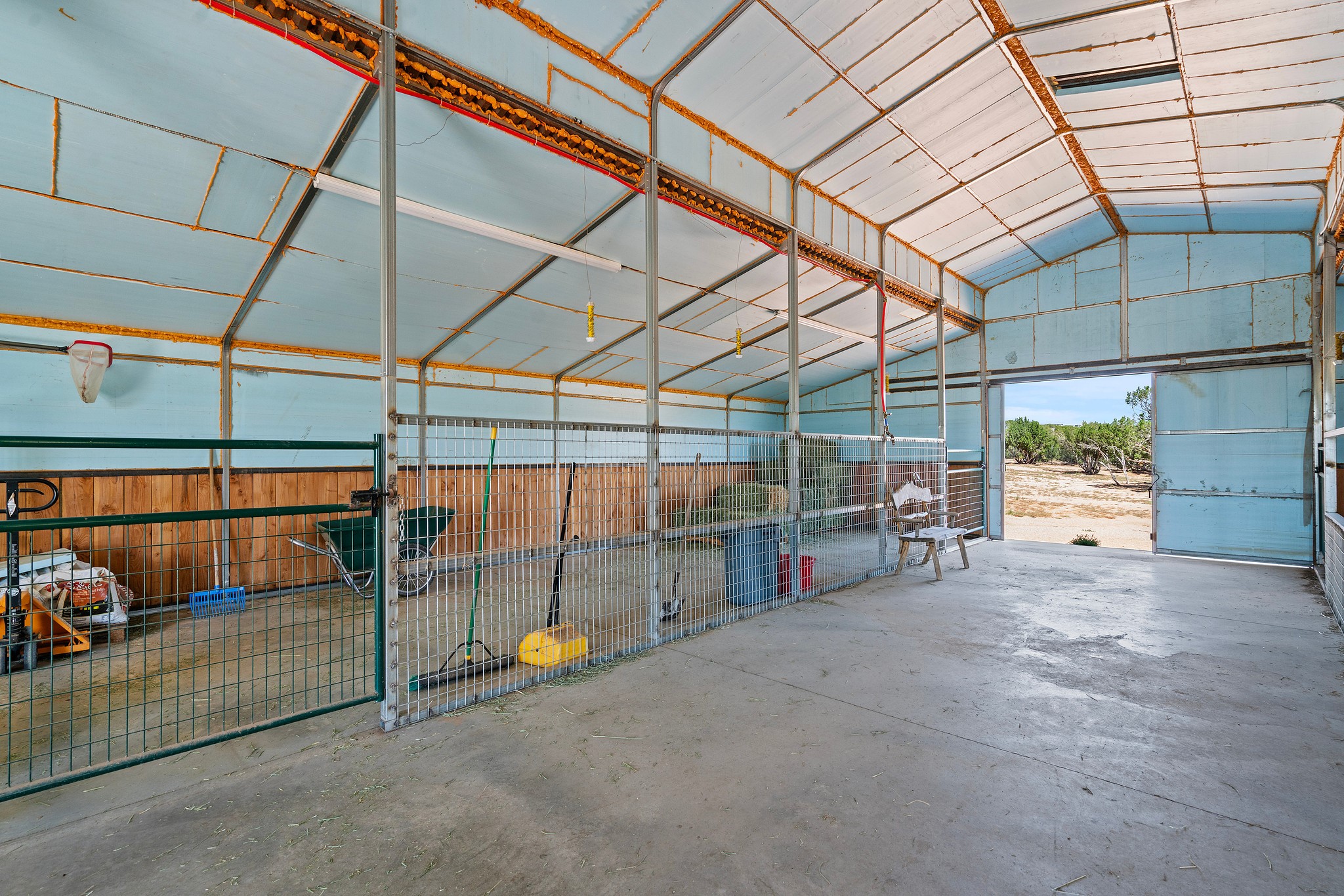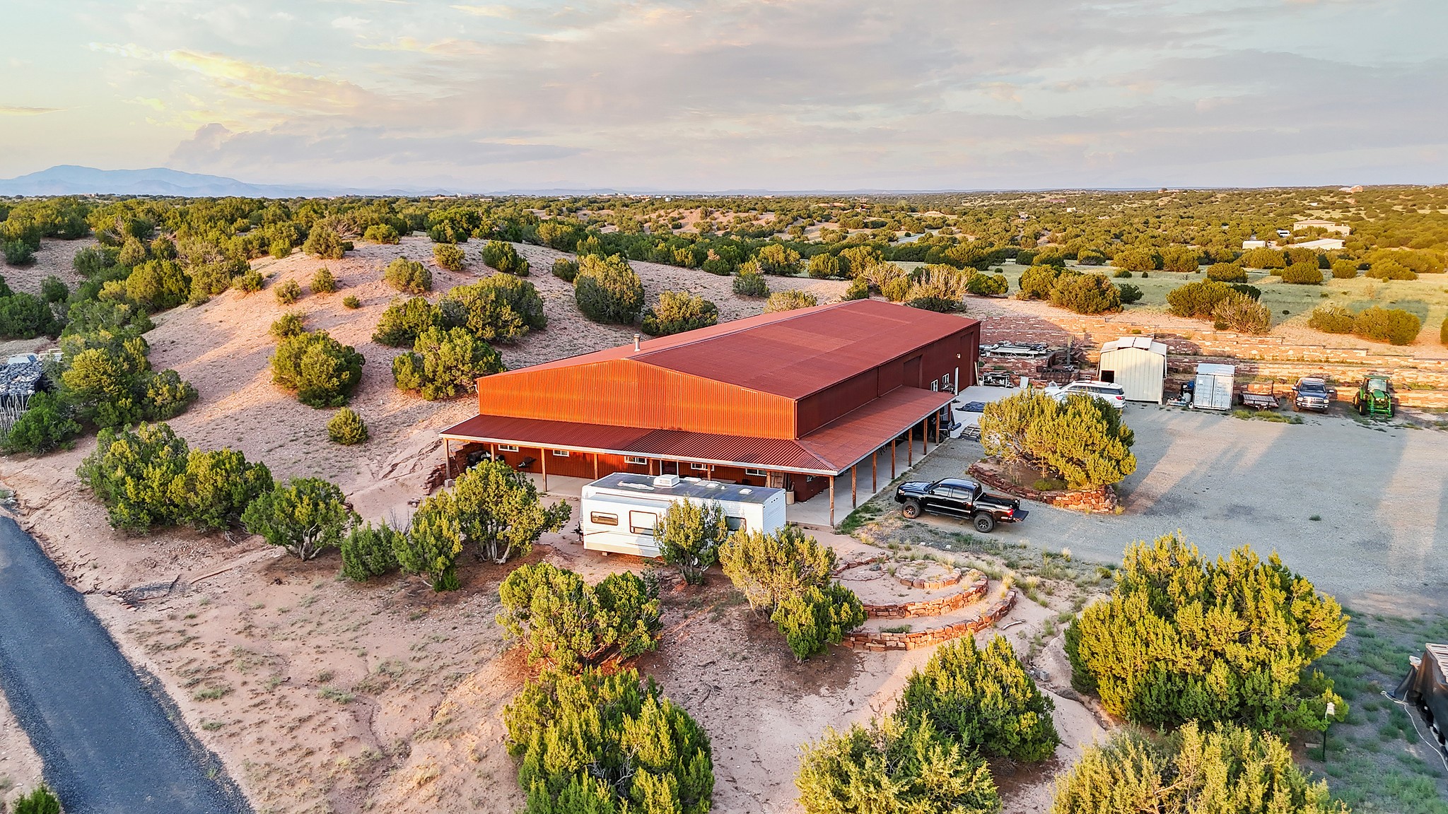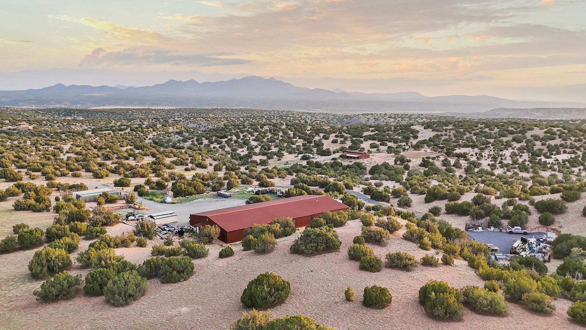 Welcome to this one-of-a-kind property just south of Santa Fe, featuring 364 prime and private acres with some of the best expansive mountain views around! The exceptional acreage consists of three contiguous and separately deeded parcels, providing tremendous versatility and numerous development possibilities for a new owner. The phenomenal 8,000+/- sqft steel-framed and insulated workshop/warehouse (constructed in 2018) is equipped with all one could dream of, including a 2-bedroom, 2-bath living quarters. Additional features include: 220v power, a strong producing well with 11,000 gallon holding tanks, 2 internet boosters, and a reverse osmosis water system, to name a few. There is also a fully-fenced/well-constructed/insulated barn with water and power in addition to a separate shelter for the animals. The unparalleled majestic views of the Ortiz Mountains are truly outstanding. This opportunity is the one you've been waiting for! Come make your dream a reality today by taking advantage of this rare offering.