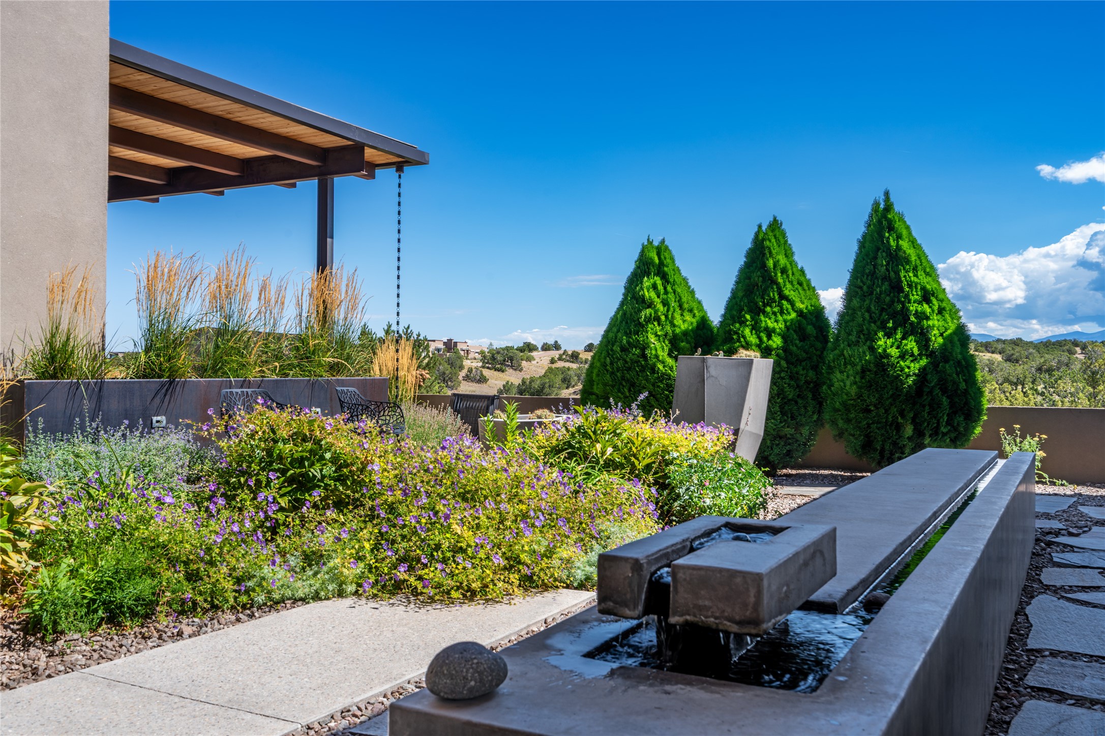 CONTEMPORARY MASTERPIECE IN LAS CAMPANAS WITH UNPARALLELED VIEWS TO BOTH MOUNTAIN RANGES. Bordering Bureau of Land Management Land, this exceptional property offers sweeping Eastern and Western Mountain vistas with uncompromised privacy. The 3,947 sqft main home has plenty of natural light, towering wood and steel ceilings and clerestory windows - designed by noted architect Lorn Tryk and executed by Prull Custom Builders - featuring 1 bedroom, 2 offices, a media room, and gallery-like spaces enhanced by travertine floors, warm stacked-stone masonry walls, custom ironwork, and motorized shades. The Owner's suite looks to the landscape and is a haven of tranquility. A detached guest house provides 2 bedrooms, 2 bathrooms, and a kitchenette - perfect for extended stays of hosting in style. Smart-home systems, a whole-home natural gas generator, and a 3-car garage with an oversized truck bay ensure convenience and peace of mind. Designed for modern living, the chef's kitchen includes Wolf and Sub-Zero appliances, dual dishwashers & ovens, steam oven, large wine fridge, pantry, and striking Spanish woven-metal light fixtures. Outdoor living is extraordinary with patios accessible from nearly every room, 3 fountains, hot tub with outdoor shower, and a custom Agave mural by artist Pam Platt. Four fireplaces add warmth and ambience indoors and out. Phenomenal cross-lighting, gorgeous driveway approach, and refined details throughout complete this contemporary retreat in one of Santa Fe's most prestigious communities.