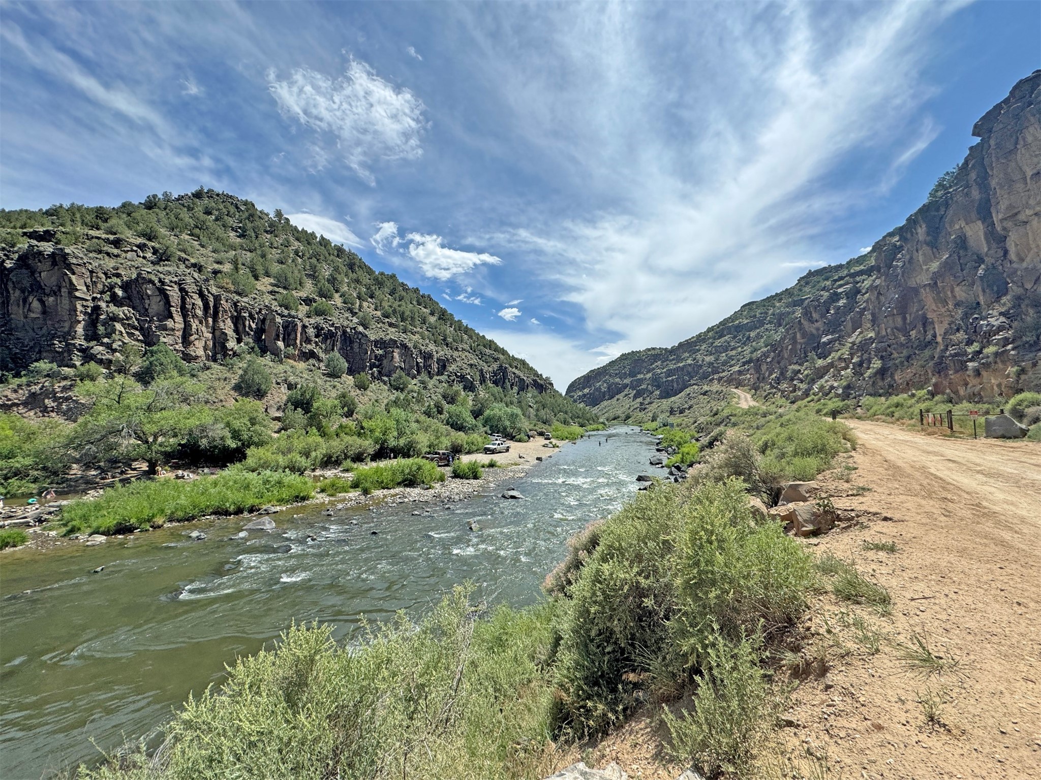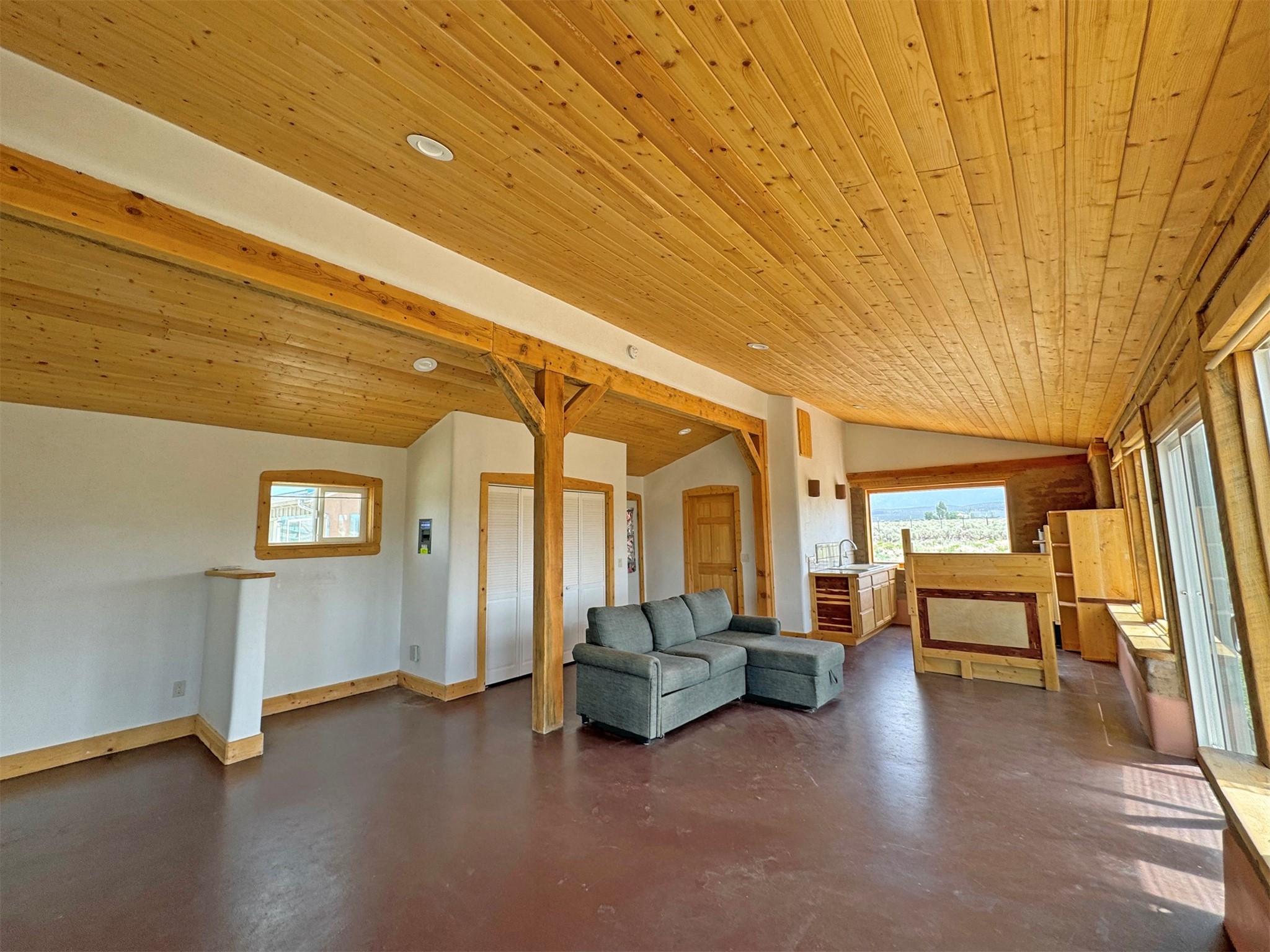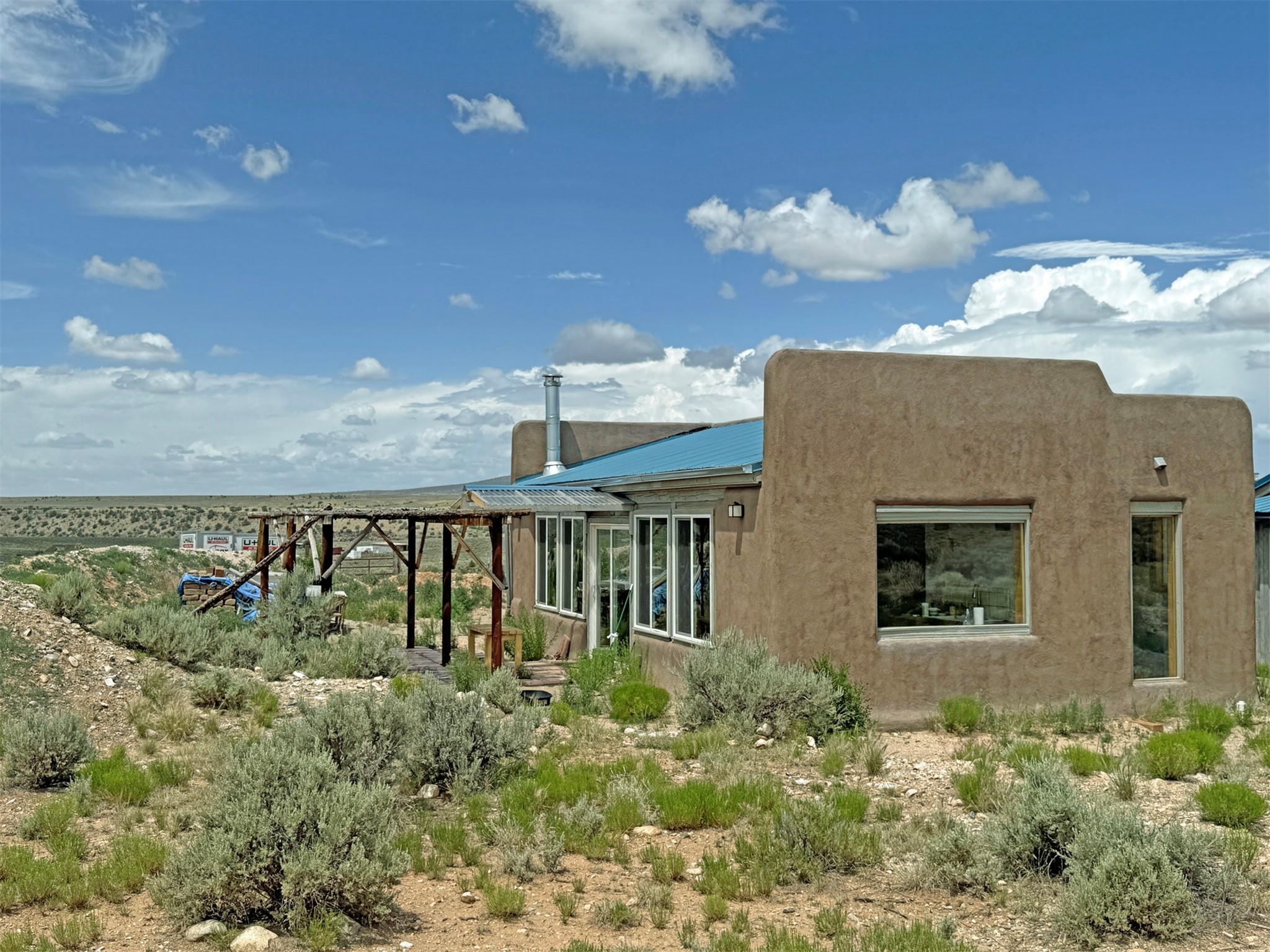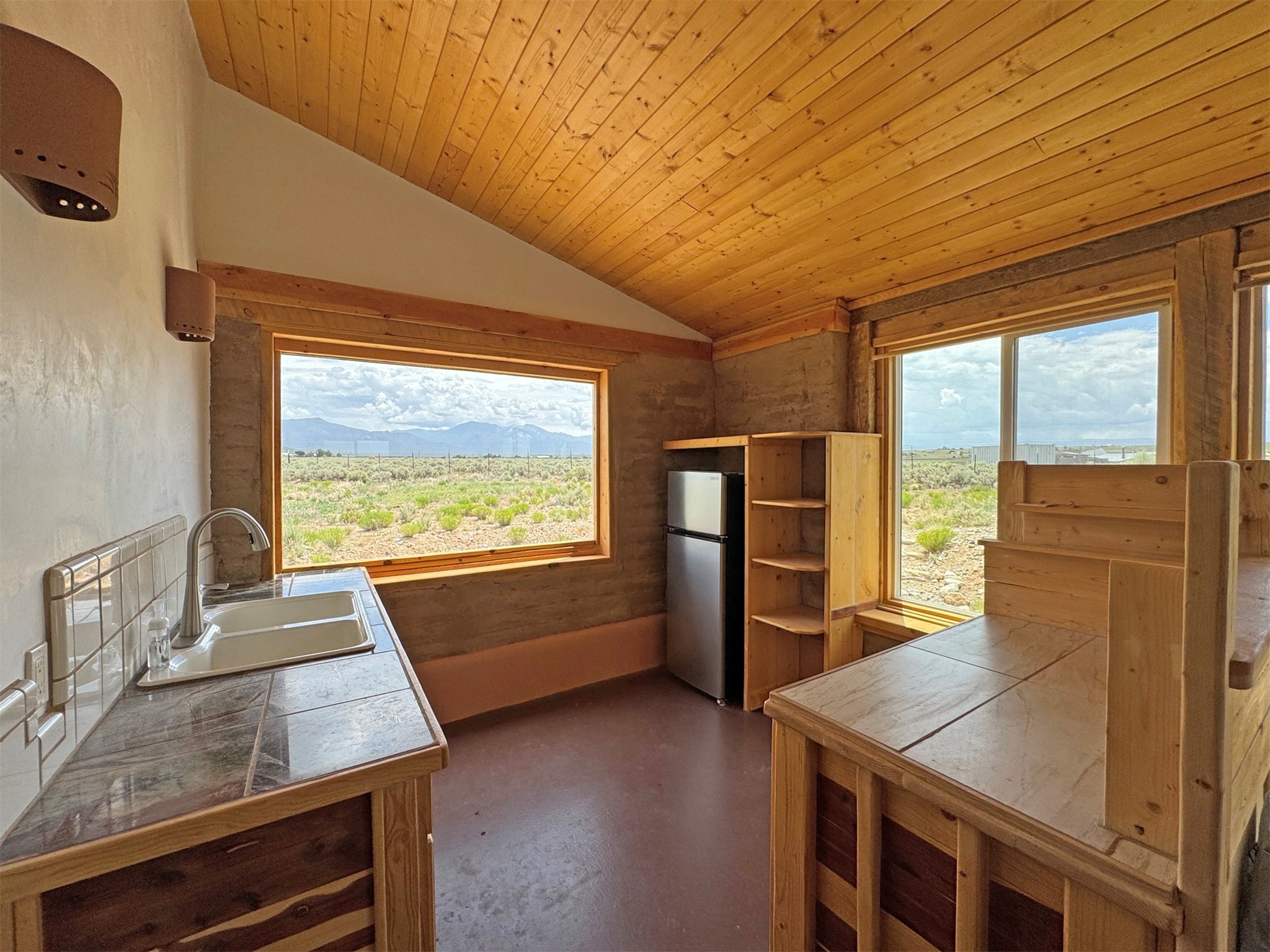 Here's a flexible property featuring two 700 square feet casitas on 2.53 unrestricted acres! Main house constructed in 2017 has entrymud room and open living/dining/kitchen areas with lots of windows framing wrap around views of sunset, Taos Mountain and Sangre deCristo Mountains. Painted concrete floors with in floor radiant heat. Pitched tongue and groove ceiling, ceiling fan and woodstovemaintain comfortable temperatures year round. Easily accessible, finished loft with cabinets provides ample storage. Cook's kitchen hasgranite tile countertops, is wired for under counter lighting, and has a propane gas range and fridge. Comfortable bedroom with T&G andbeams ceiling features a spacious ensuite bathroom with cast iron tub, personal shower and ample linen storage. Mechanical/utility roomincludes a washer which conveys with sale and storage shelving. On the north side is a sweet exposed adobe wall courtyard containinga paver stone patio and latilla ramada, perfect for dining al fresco and star gazing. Pitched Propanel roof delivers water catchment for a1700 gallon buried cistern in lieu of conventional well. Seller typically orders supplemental water 1-2 times a year for a cost ofapproximately $230 each delivery of 1700 gallons. Exterior siding is a combination of stucco and Cape Cod wood siding. Guest houseis 714 square feet of flexible space built in 2023 featuring kitchenette with fridge, full bath, wood stove, exposed adobes, and vaultedT&G ceiling with beams and columns. Comfortable full bathroom with linen storage, tub and shower. This structure is heated and cooledwith a heat pump mini split system. This space could serve as a studio/workshop, studio apartment rental, or additional property livingspace. Painted cement floors and wrap around windows with mountain views. Entertain outside with a latilla ramada over paver stonepatio. Propanel metal shed roof is plumbed for cistern catchment. Landscape berms cradle both structures, adding privacy and providinga canvass for gardeners. Taosnet broadband Internet in both houses (Kit Carson fiber optic in Tune Drive); cell service on site. Locatedon a rise with stellar 360 degree views and easy walk to the Rio Grande Gorge and John Dunn bridge, Mamby/Stagecoach and BlackRock springs. GPS: 36.52508202679919, -05.70209218650817. Approximately one acre around the structures is fully fence with a farmgate at the entrance. Wood board fencing provides additional privacy. Circle drive and ample guest parking. Property could besubdivided into three separate parcels. Electric transformer has been installed in lower part of property for future development. Allconstruction county permitted with C/Os in Associated Documents. Seller has left firewood, Colorado red flagstone, adobe bricks andnew generator in the original box for the buyer. Approximately twenty minutes from Taos Plaza and half an hour from Taos Ski Valley.Only half a mile off the paved road. This quiet, peaceful property could be developed into three residential properties, a family compound, investment rentals, or horse property. So many options for this creative, energy efficient property built with love!