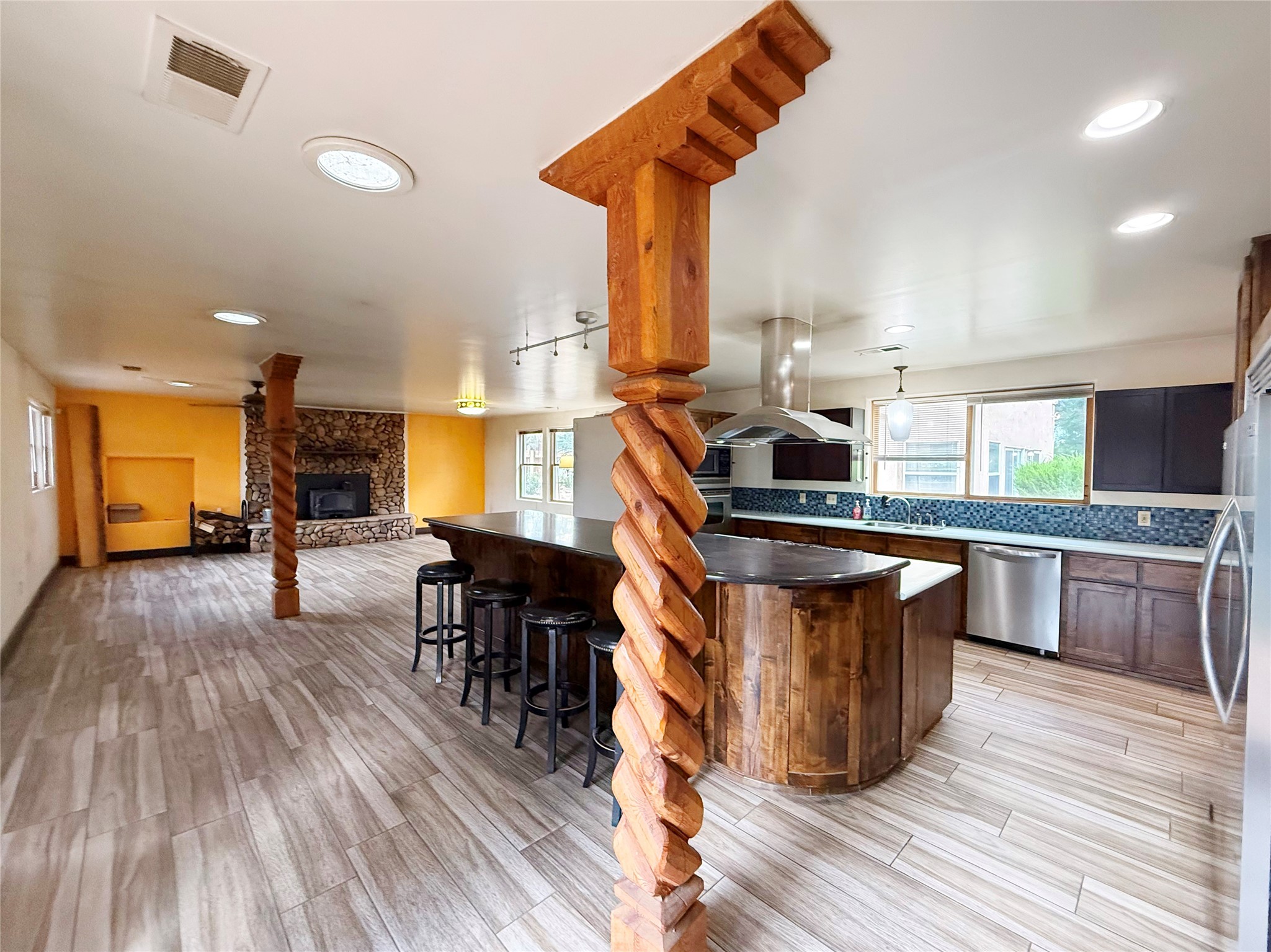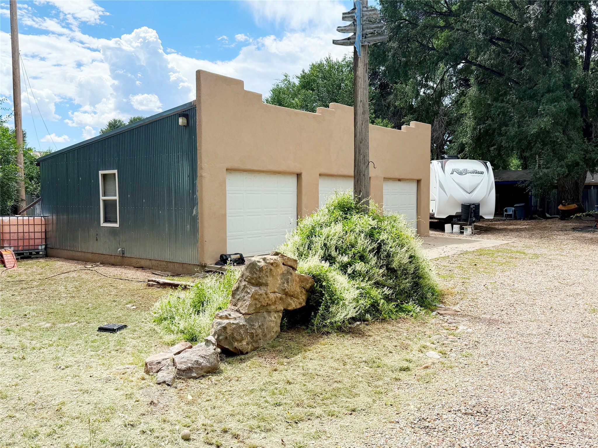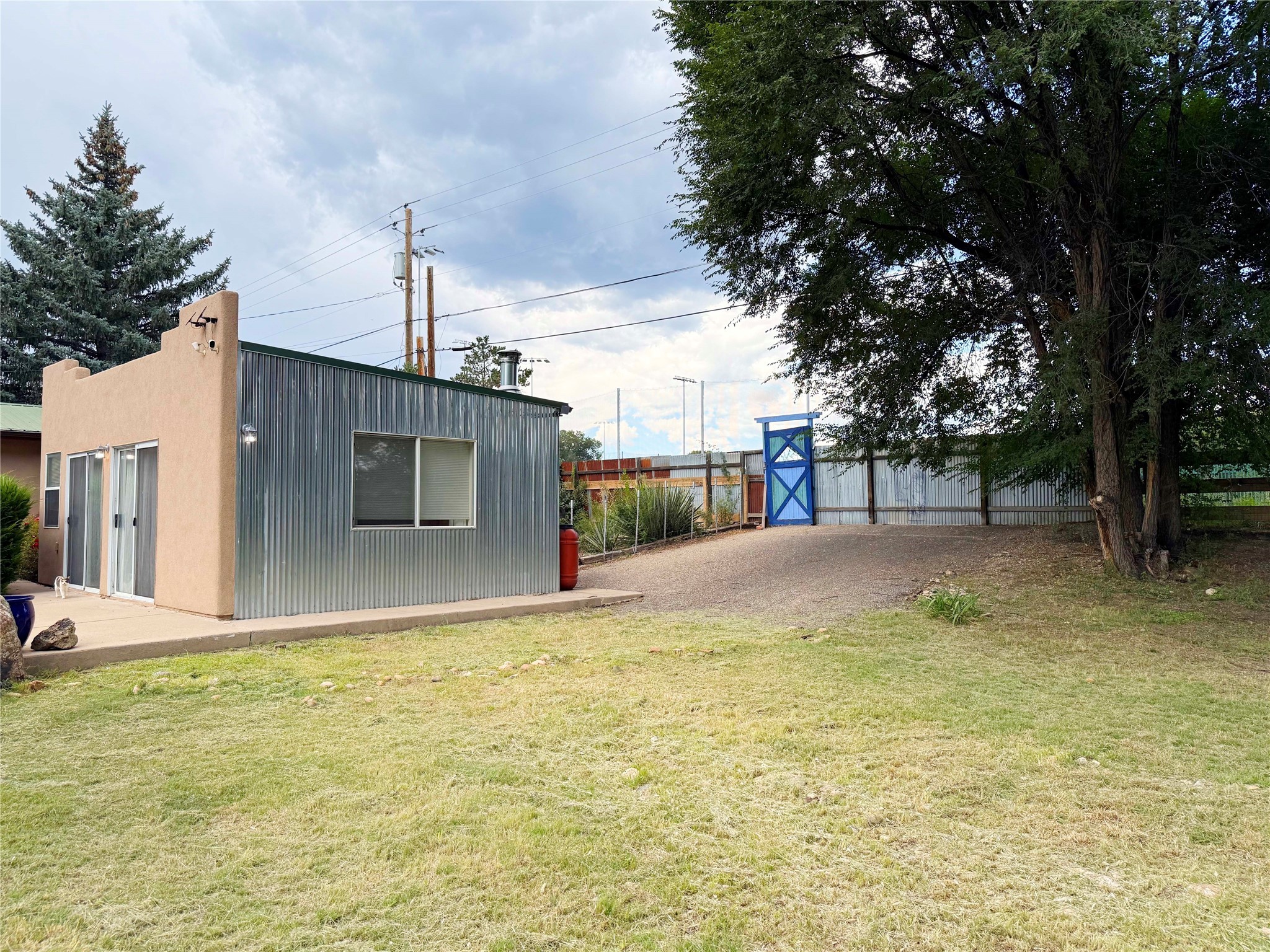Stunning former hotel transformed into a luxurious 3-bedroom, 2.5-bathroom residence on almost 3/4 acre along the Gallinas River. This chef's dream home features an open-concept living area anchored by a beautiful river rock fireplace, seamlessly connecting to a gourmet kitchen with double-sized refrigerator and freezer, 6-burner gas cooktop island with bar seating, wine refrigerator, double oven, microwave, and abundant pantry and cabinet space with stunning display cabinets, space for a butler's pantry or coffee bar and hard surface countertops. The master suite features a gas kiva fireplace, dual closets, step-down rainfall shower, and French doors opening to landscaped gardens and patios. A versatile sunroom/den with gas fireplace offers endless possibilities for relaxation or entertainment. Three bedrooms are accessed via a dramatic long hallway, with rooms tastefully numbered as a nod to the property's historic hotel past. Nearly every living area in the home features French doors leading to beautifully landscaped patios throughout the lush, green grounds. The property includes a three-car detached garage with workshop, storage shed, garden shed, and covered firewood storage. Grounds are accented with beautiful large mountain rocks and offer wide open spaces perfect for outdoor living. Located directly next to the Gallinas River, this unique property combines luxury amenities with historic charm and natural beauty - truly a must-see opportunity.