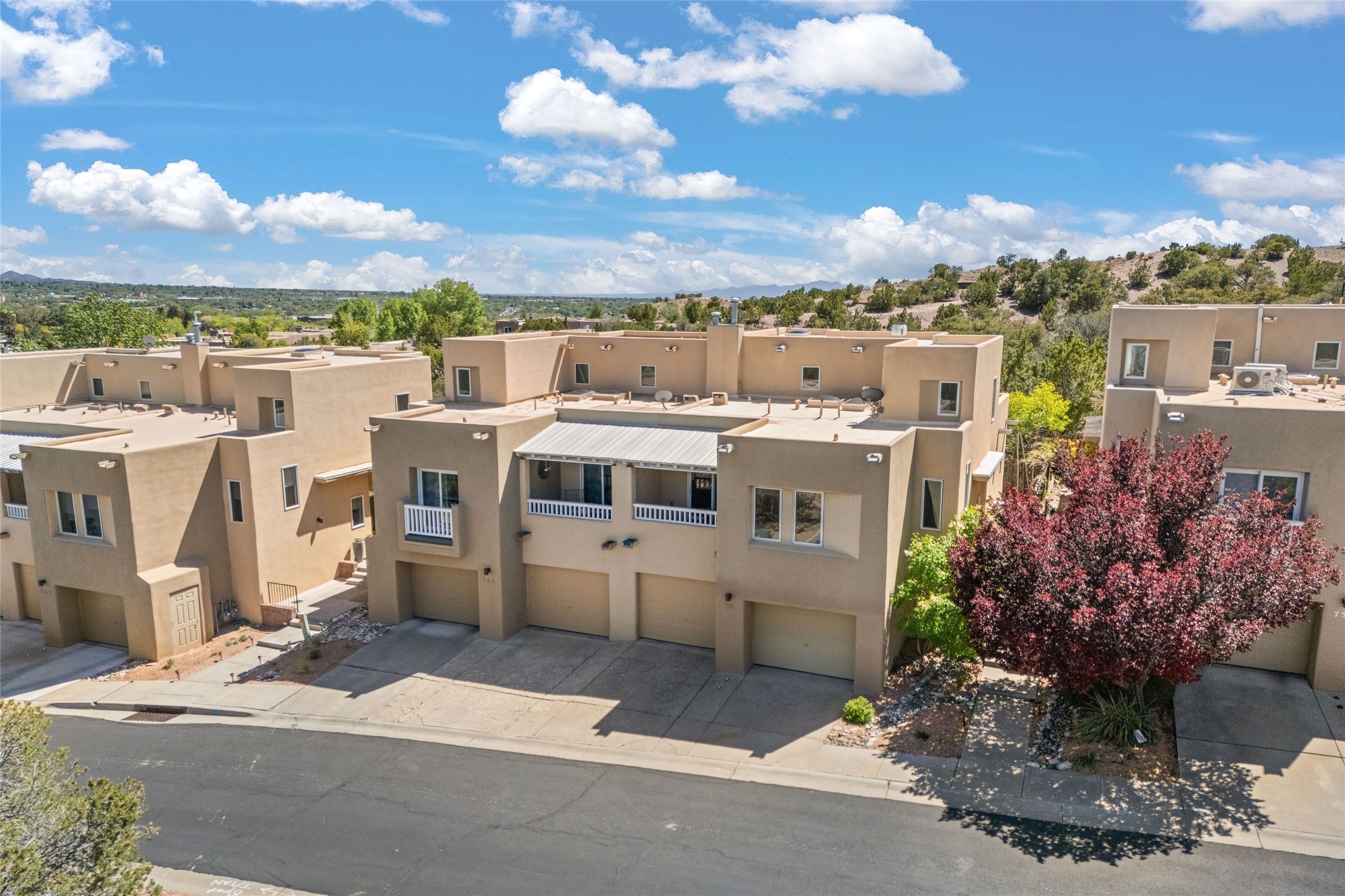 Northside 3-bedroom, 2.5-bath condominium offering captivating views and a thoughtfully designed multi-level layout. The first level features a two-car garage, mechanical room, and generous storage options. Move up to the second level, where the living area includes a welcoming fireplace, providing a focal point for relaxation. The open living room and kitchen design encourages easy interaction, complemented by a convenient half bath. Enjoy access to a private patio and outdoor area, perfect for unwinding or entertaining. On the third level, discover a guest bedroom, a laundry area, an office, and a full bath. A balcony enhances this level, offering an additional outdoor retreat. The primary suite occupies the fourth level, serving as a tranquil getaway. Recent updates add to this home's charm, featuring upgraded fireplace with granite, modern lighting, ceiling fans, and practical shelving. The addition of flagstone and aspen trees enhances the outdoor environment, creating a serene atmosphere. Conveniently located, this condo is just moments away from the DeVargas Center, Frank Ortiz Dog Park, Ft. Marcy Recreation Center, and the Historic Santa Fe Plaza.