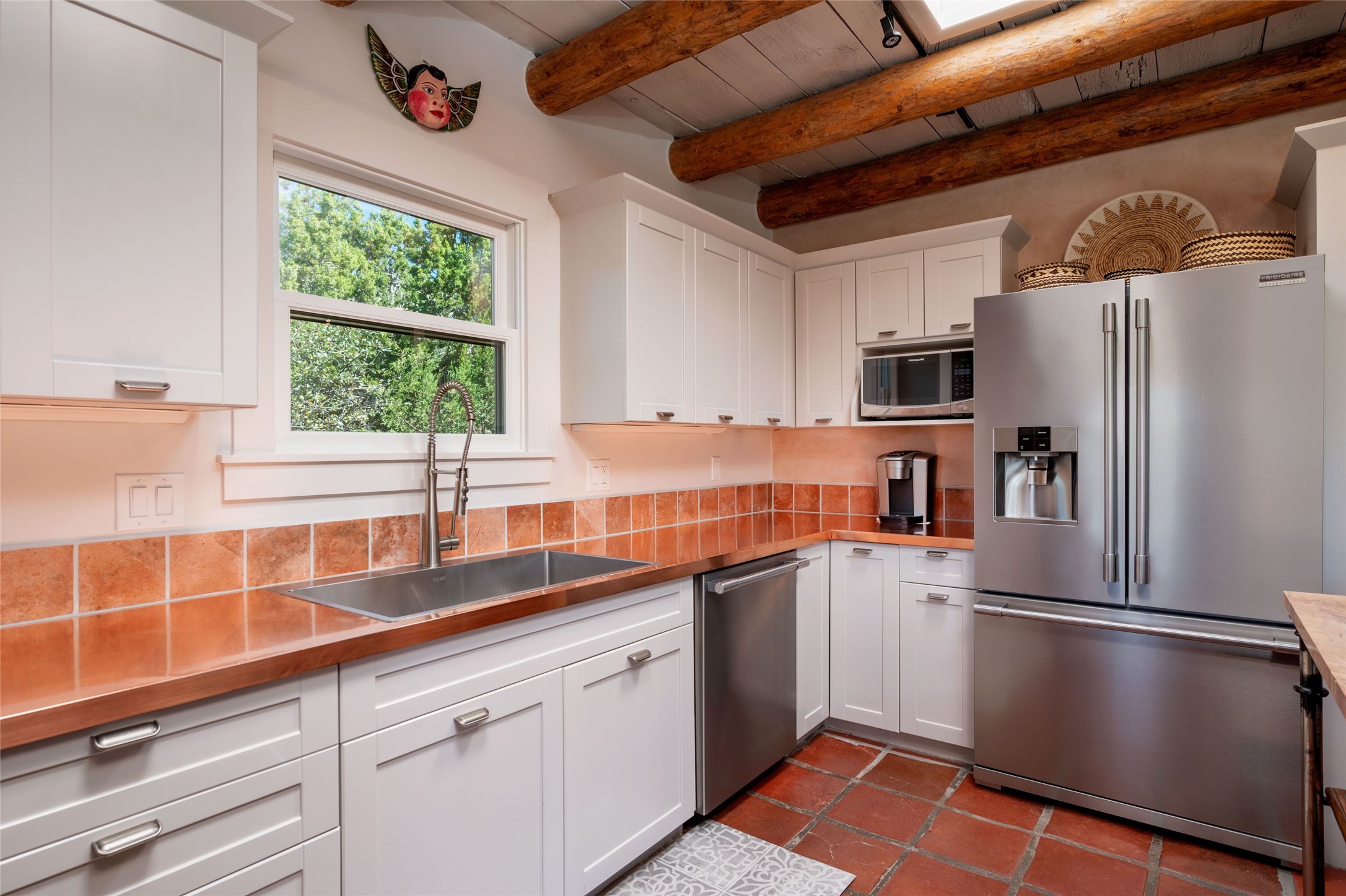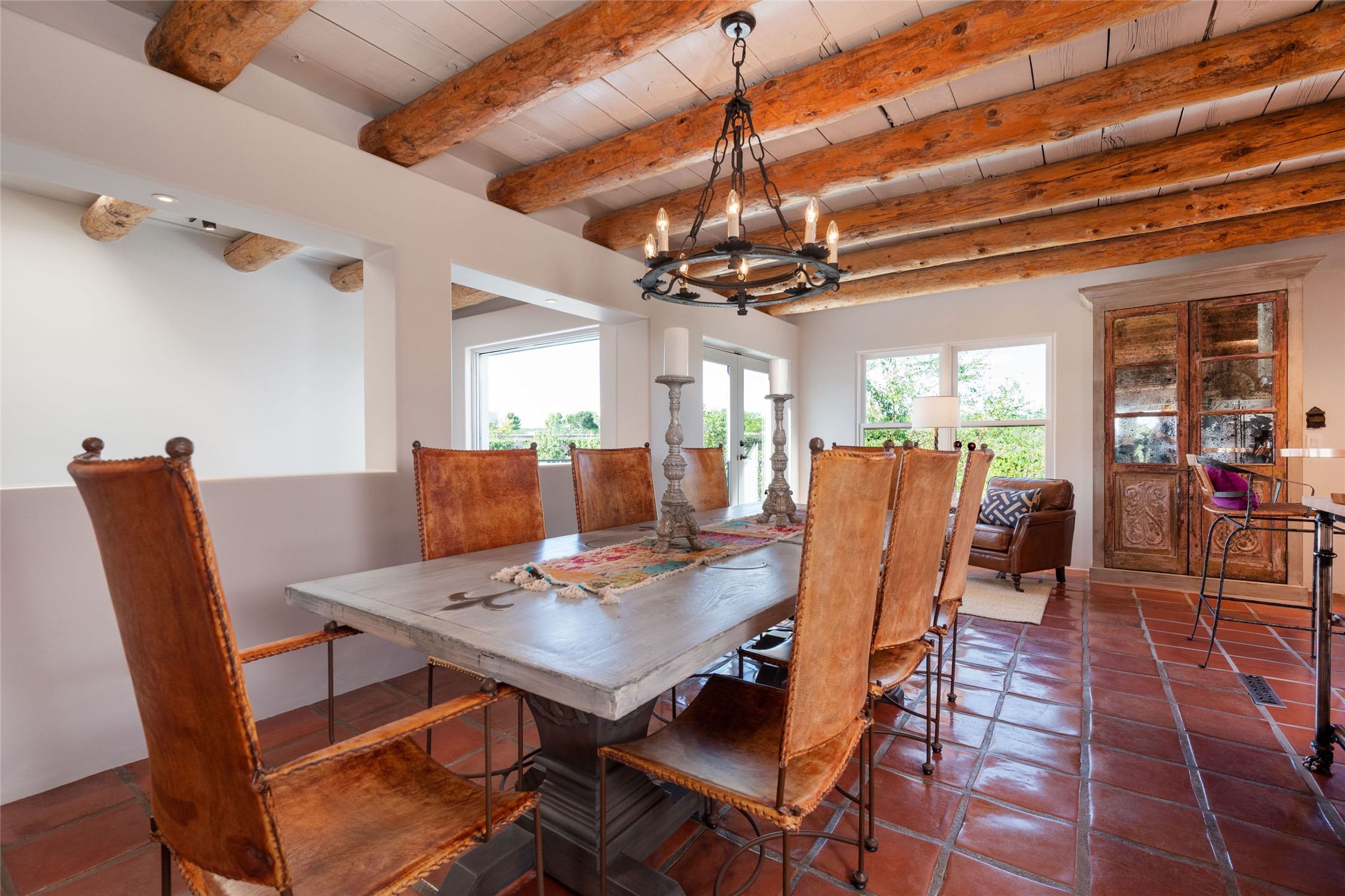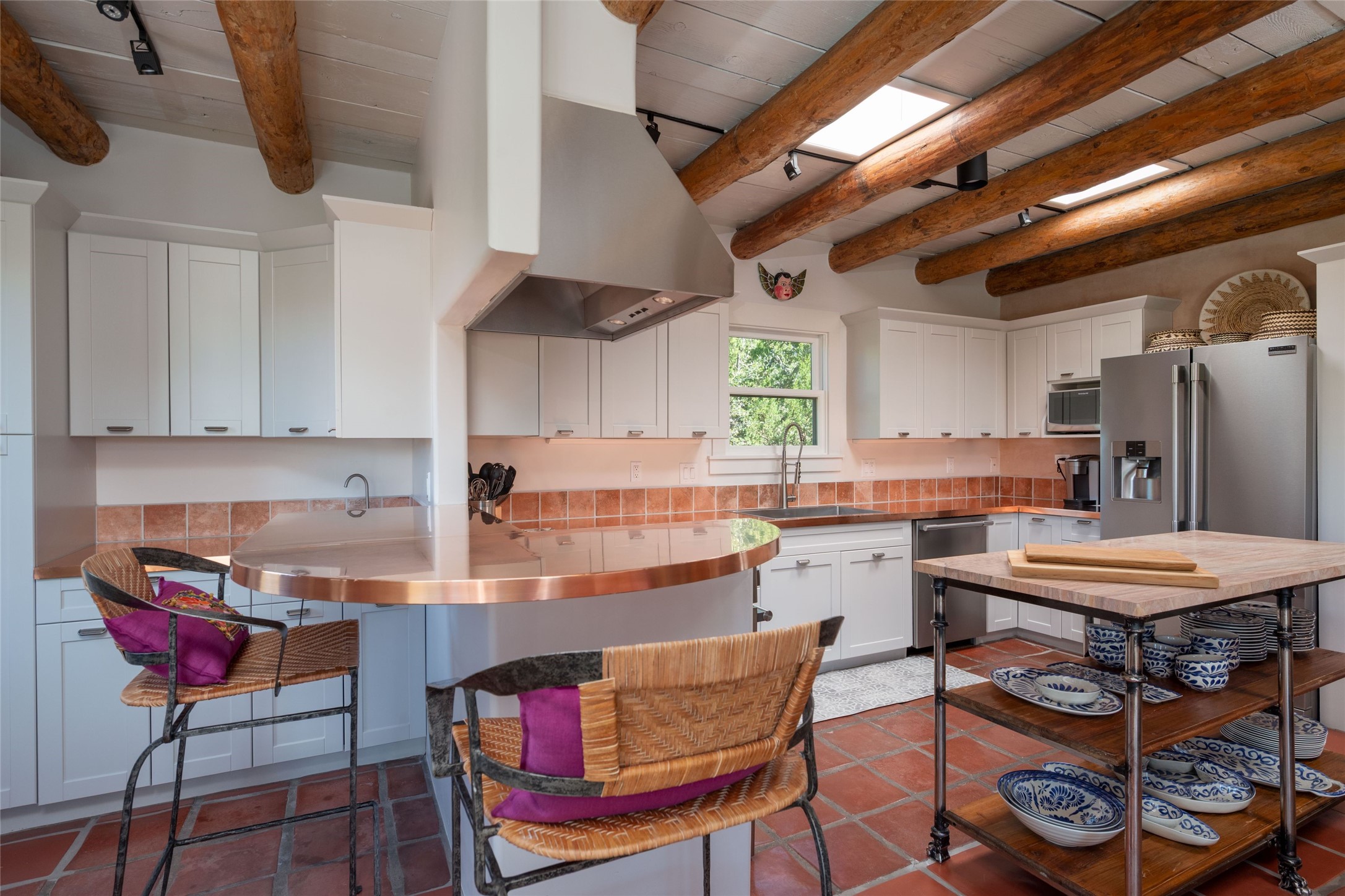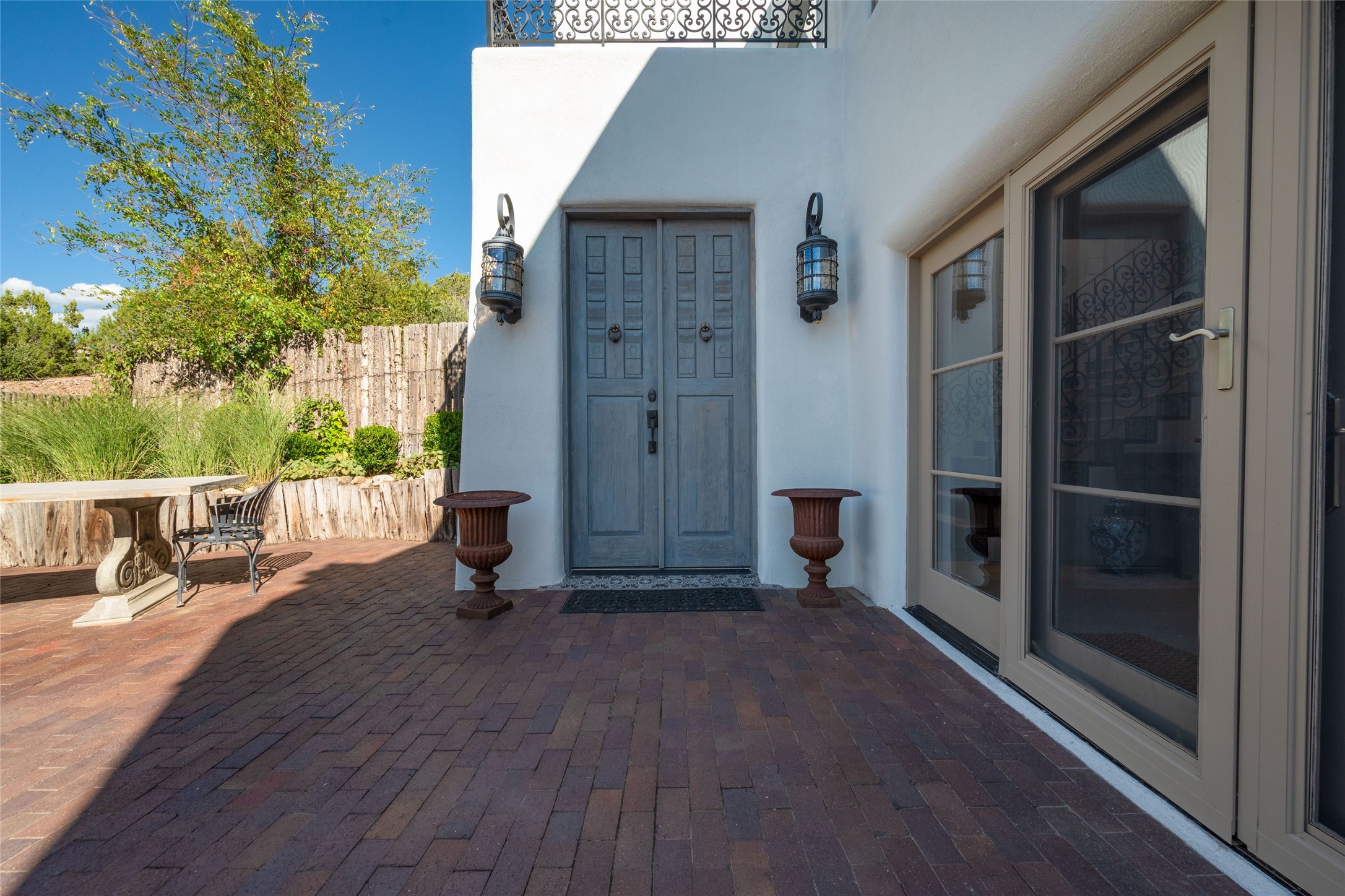 Located mere minutes from the Plaza at the end of the street on just over an acre with some sweet South and West views, this 4,250 sq ft 4 bedroom, 3 bath two story home is stylishly and tastefully updated and enjoys several outdoor living areas. Entering through wrought iron gates, the walled front courtyard has a corner kiva fireplace around which to sit and enjoy the evening, as well as the soothing sound of the big Mexican fountain. The front foyer has fun decorative tile floors, and this level also has a large family room with fireplace, big windows and French doors opening to the enclosed courtyard, laundry room and private guest room with a full bath. Up a grand staircase is the main living area, with a nice large living room with gorgeous fireplace, that is open to both the dining area and kitchen. The gourmet kitchen with copper countertops, gas cooking, wet bar and pizza oven is both functional and beautiful. A flagstone patio off the landing by the living room, enjoys a wonderful protected Southern exposure so as to enjoy the out of doors nearly year round! The primary bedroom is large and has a deck facing West for sunset skies, plenty of closet space, a luxurious bath with custom limestone sinks, big soaking tub and a separate shower. The other two bedrooms on this upper level are generously sized and share a full bath. Many custom architectural details and finishes; from custom fixtures and doors, to hardwood, sisal and tile floors. With plenty of guest parking, a two-car garage, AC and a furniture package if desired, this is a special home showing great pride of ownership and love.