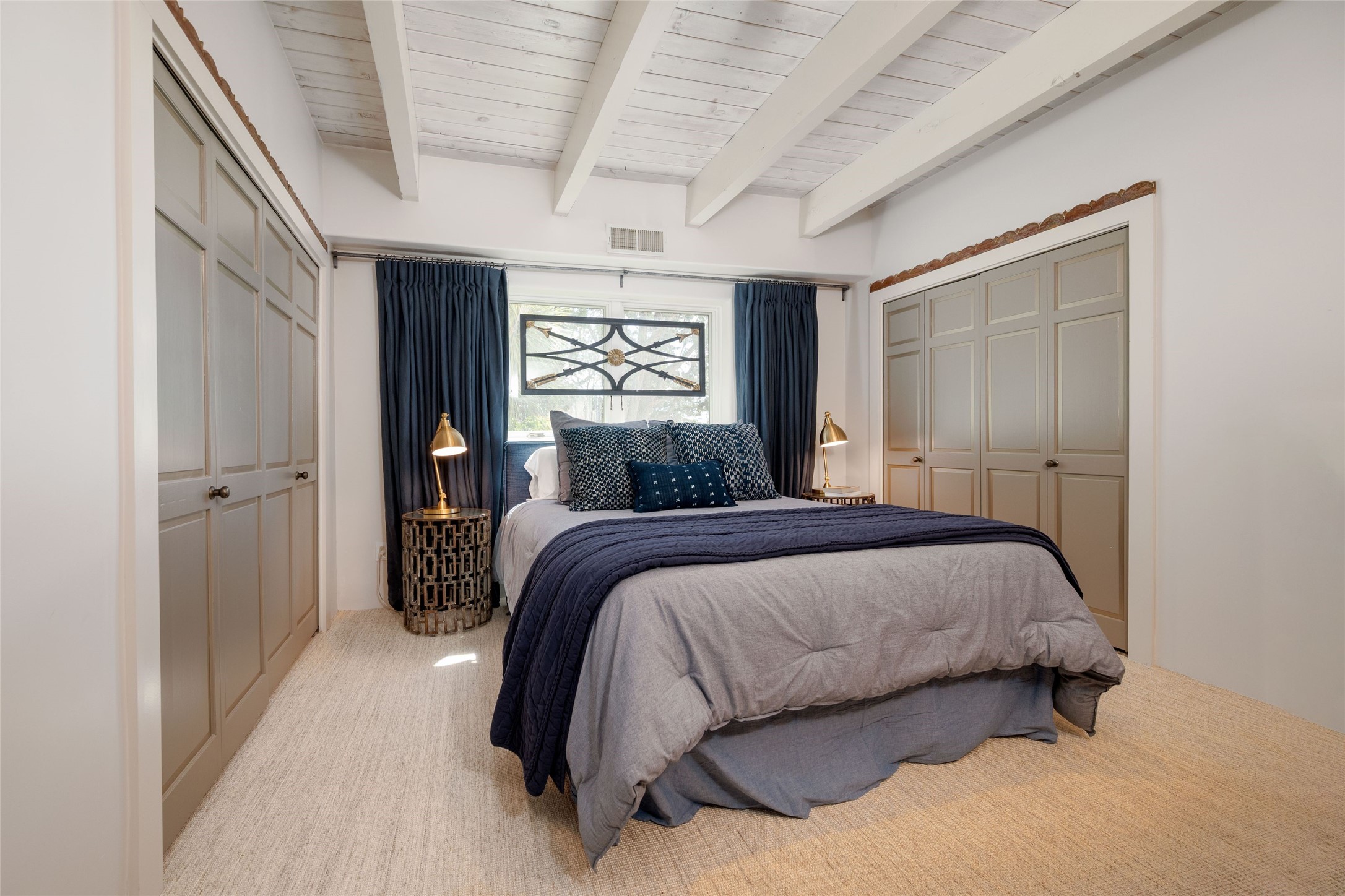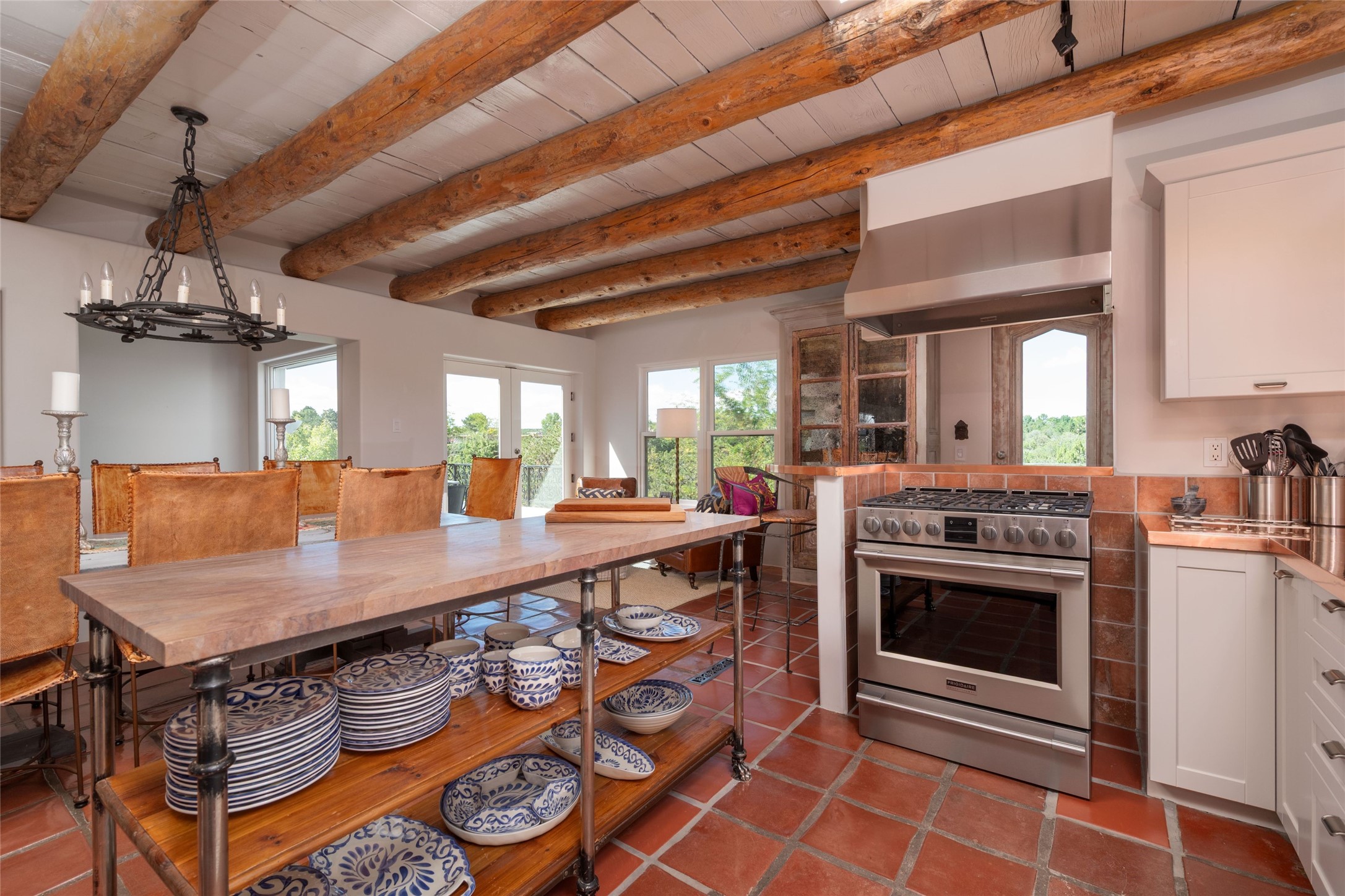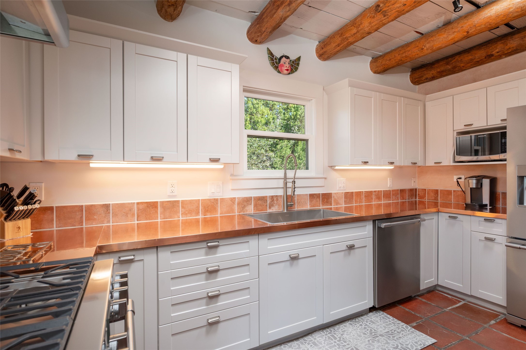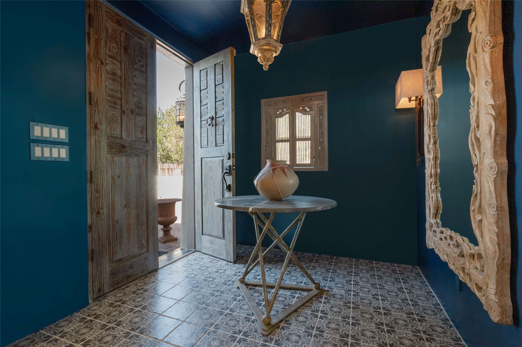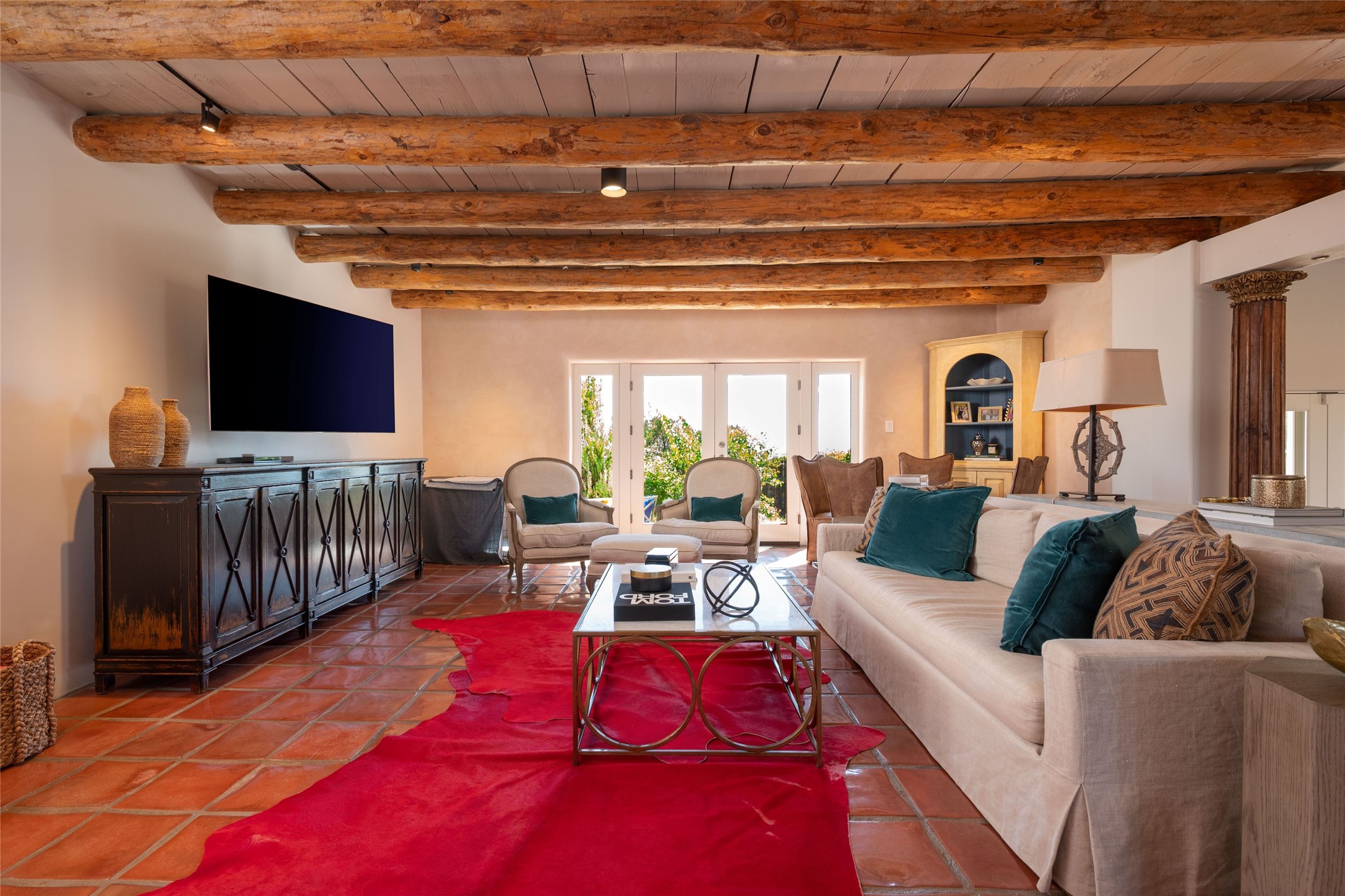 Located mere minutes from the Plaza at the end of the street on just over an acre with some sweet South and West views, this 4,250 sq ft 4 bedroom, 3 bath two story home is stylishly and tastefully updated and enjoys several outdoor living areas. Entering through wrought iron gates, the walled front courtyard has a corner kiva fireplace around which to sit and enjoy the evening, as well as the soothing sound of the big Mexican fountain. The front foyer has fun decorative tile floors, and this level also has a large family room with fireplace, big windows and French doors opening to the enclosed courtyard, laundry room and private guest room with a full bath. Up a grand staircase is the main living area, with a nice large living room with gorgeous fireplace, that is open to both the dining area and kitchen. The gourmet kitchen with copper countertops, gas cooking, wet bar and pizza oven is both functional and beautiful. A flagstone patio off the landing by the living room, enjoys a wonderful protected Southern exposure so as to enjoy the out of doors nearly year round! The primary bedroom is large and has a deck facing West for sunset skies, plenty of closet space, a luxurious bath with custom limestone sinks, big soaking tub and a separate shower. The other two bedrooms on this upper level are generously sized and share a full bath. Many custom architectural details and finishes; from custom fixtures and doors, to hardwood, sisal and tile floors. With plenty of guest parking, a two-car garage, AC and a furniture package if desired, this is a special home showing great pride of ownership and love.