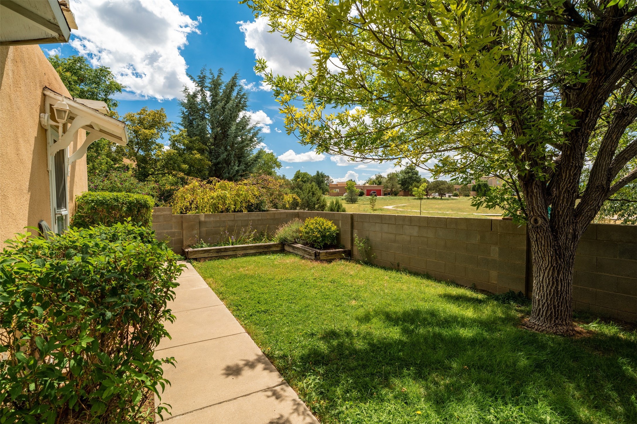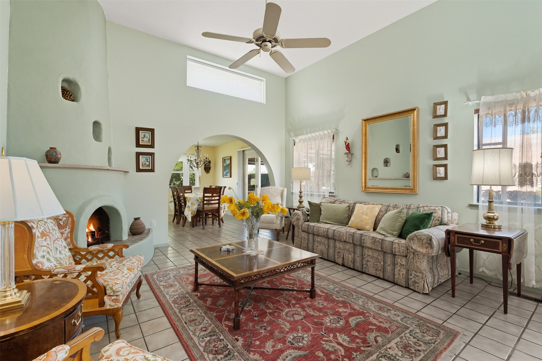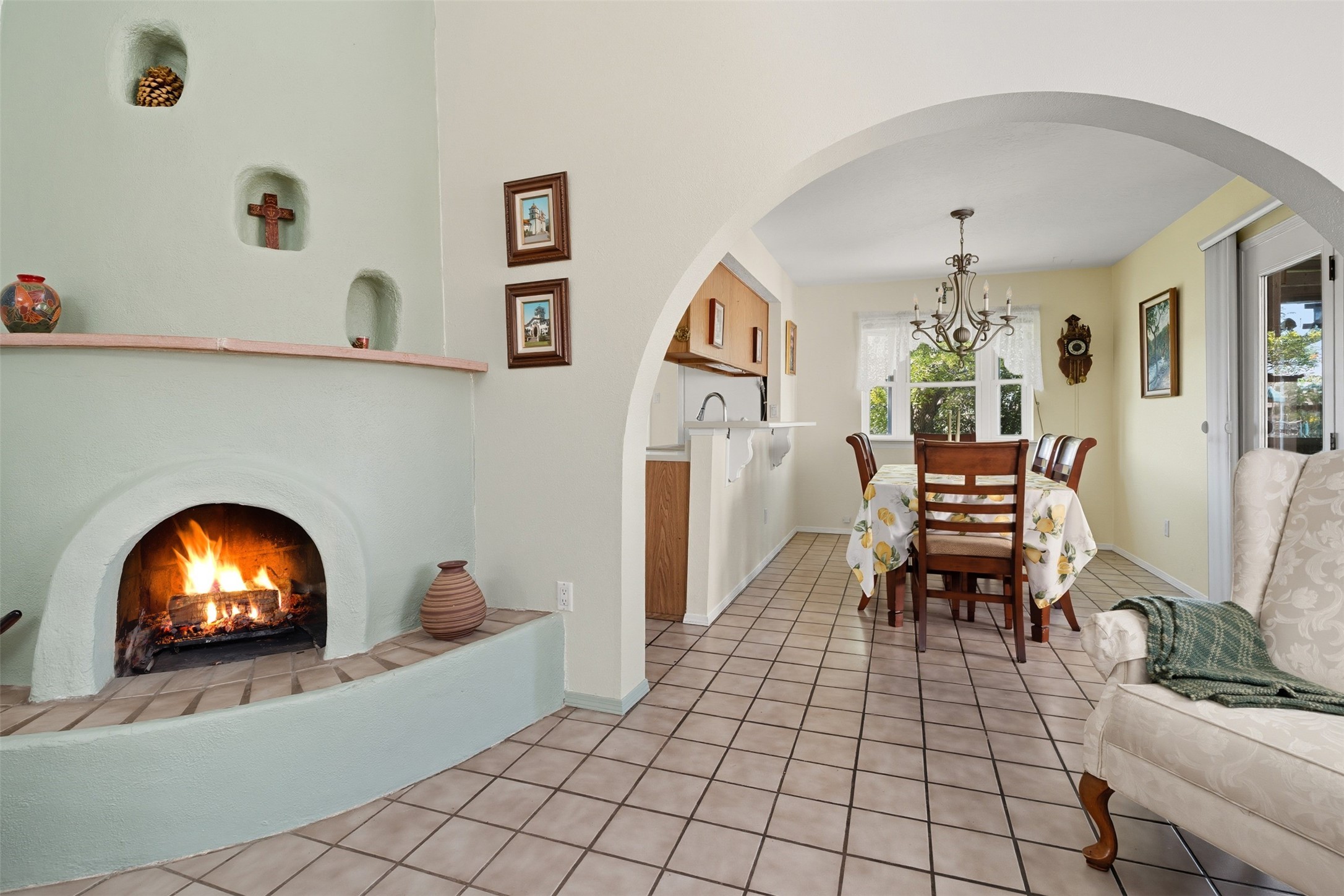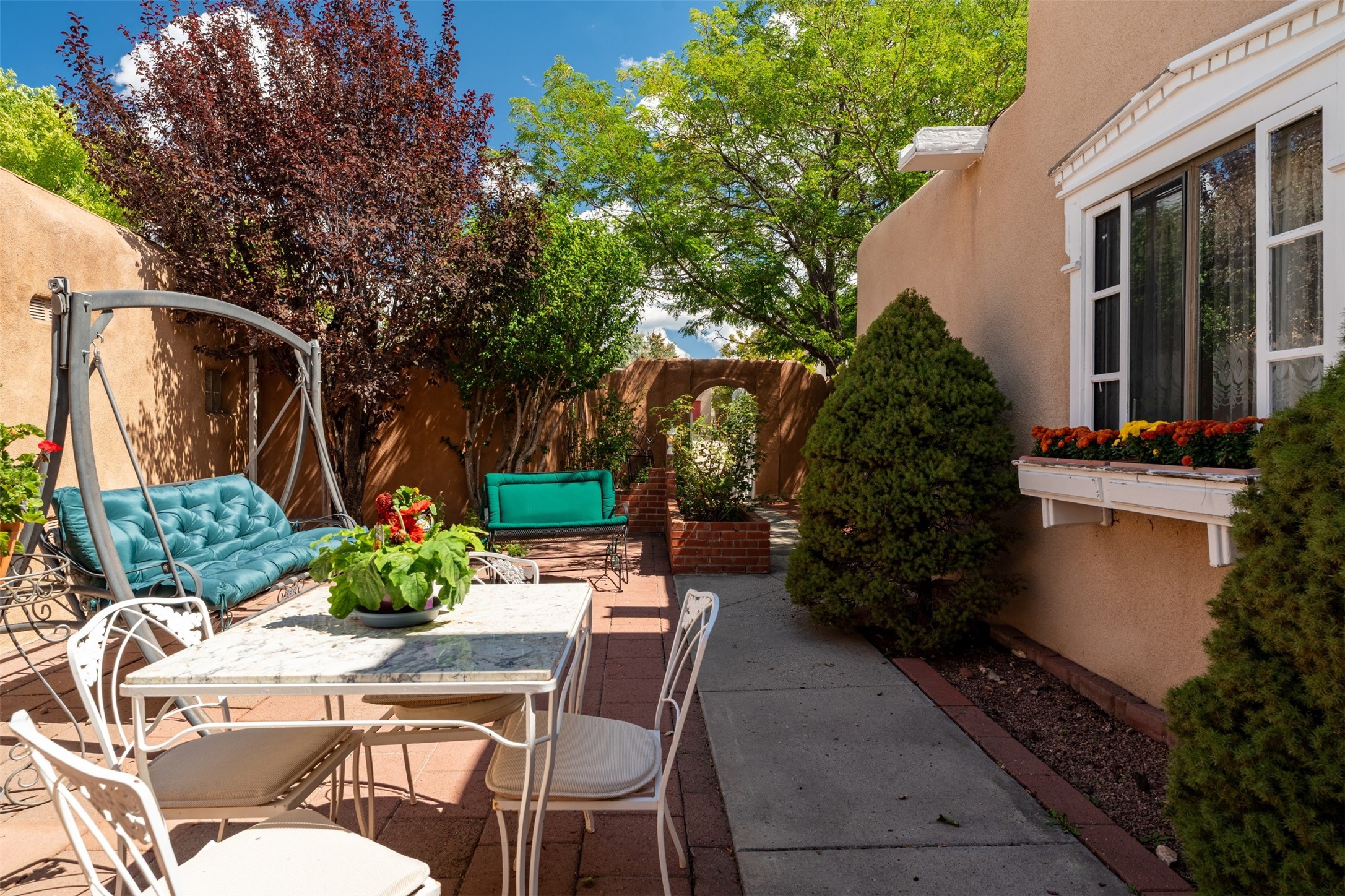 Patio home with two bedrooms and two bathrooms, plus a bonus room off the main living area that could be used as a den or office. The living room has a high ceiling and lots of light. Formal dining area adjacent to the kitchen that leads to the spacious outdoor area with covered portal, patio space and the backyard area which backs up to the Las Estancias Park. The primary bedroom is spacious and the second bedroom is at the opposite side of the hall. An oversized garage includes built-in cabinetry for storage and an additional freezer that conveys with the home. Enjoy outdoor entertaining or quiet evenings in the private gated courtyard. A perfect blend of comfort, functionality, and outdoor living!