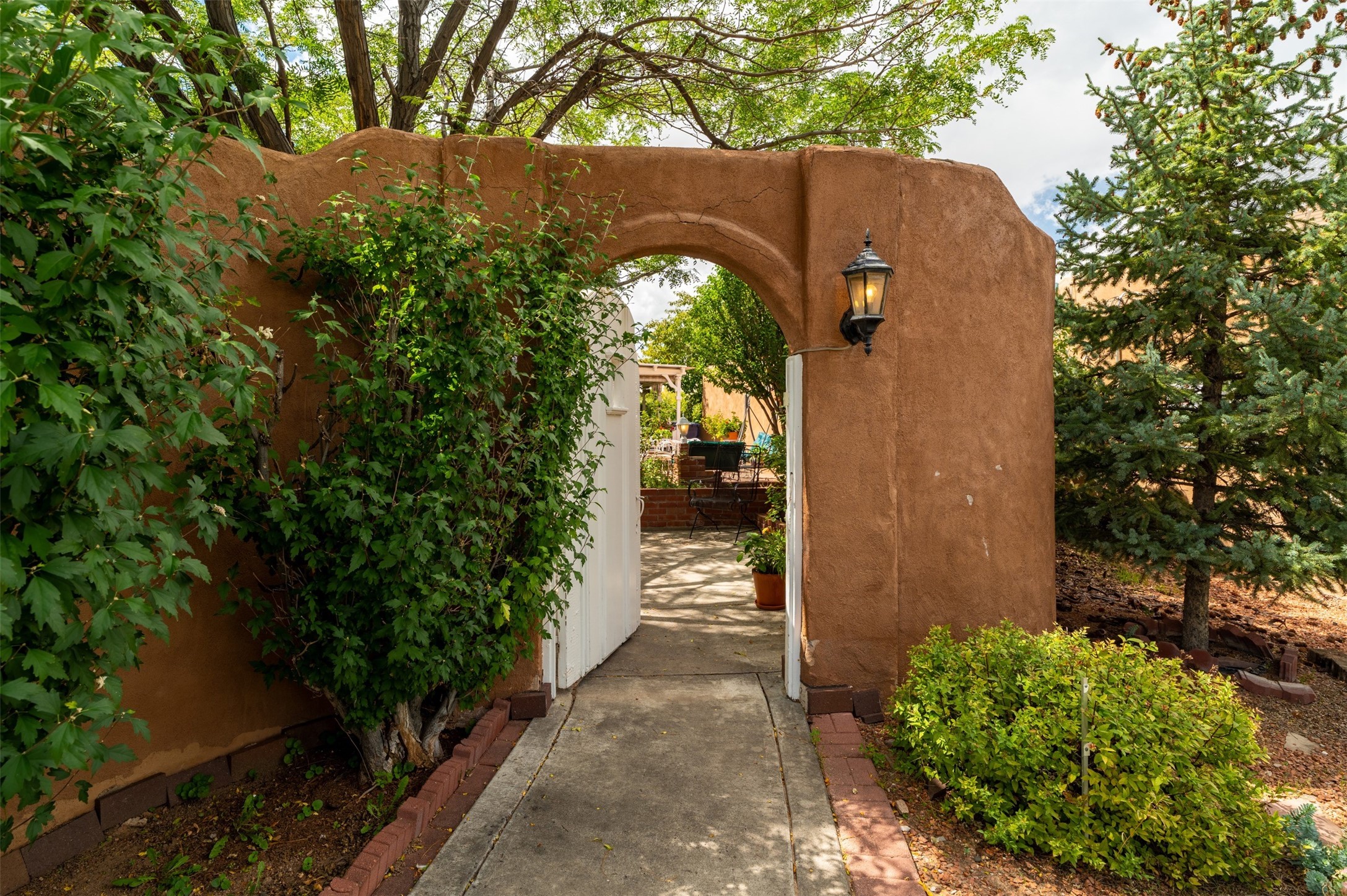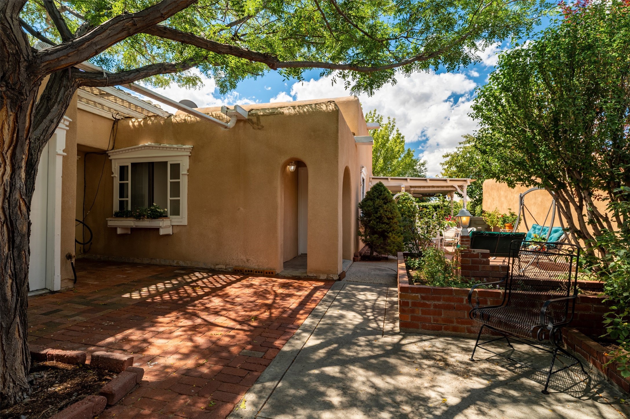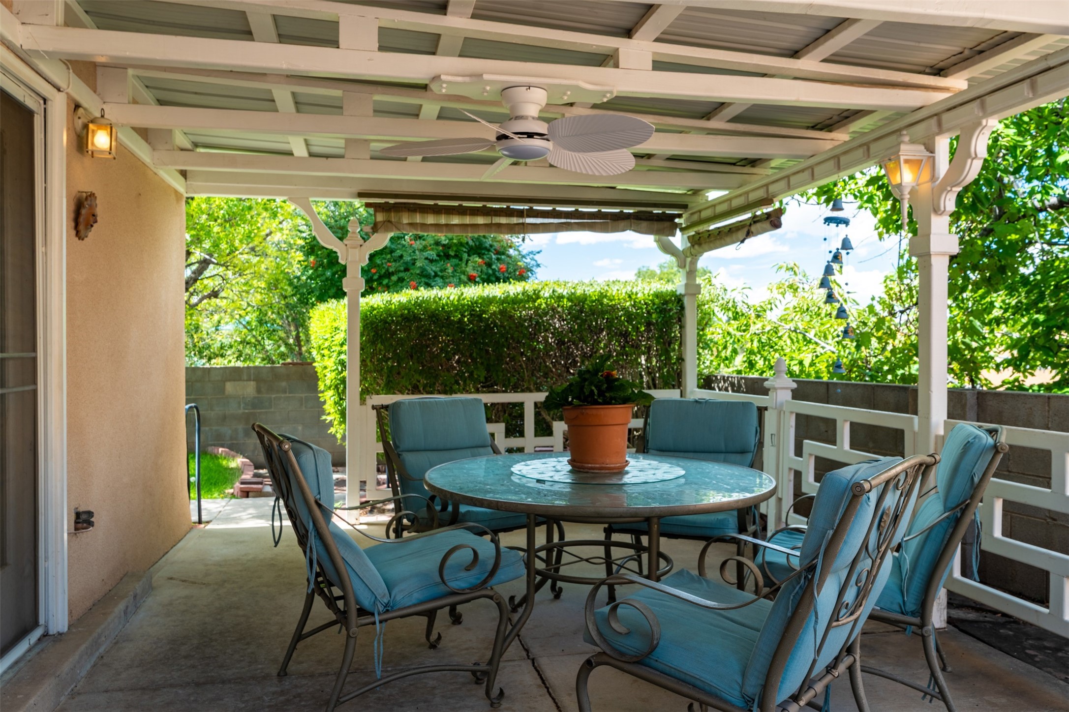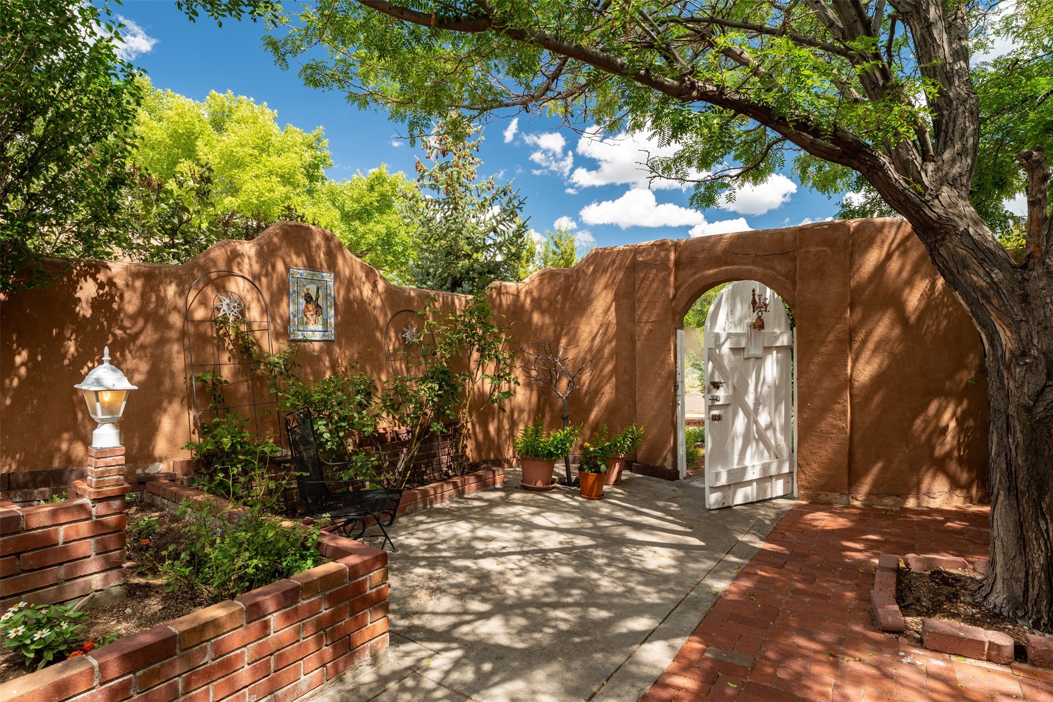 Patio home with two bedrooms and two bathrooms, plus a bonus room off the main living area that could be used as a den or office. The living room has a high ceiling and lots of light. Formal dining area adjacent to the kitchen that leads to the spacious outdoor area with covered portal, patio space and the backyard area which backs up to the Las Estancias Park. The primary bedroom is spacious and the second bedroom is at the opposite side of the hall. An oversized garage includes built-in cabinetry for storage and an additional freezer that conveys with the home. Enjoy outdoor entertaining or quiet evenings in the private gated courtyard. A perfect blend of comfort, functionality, and outdoor living!