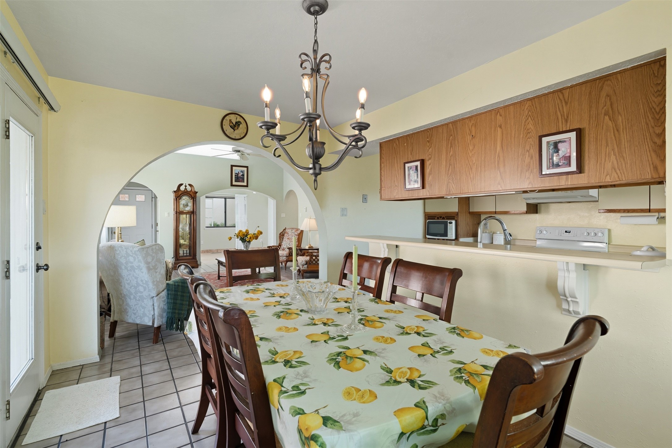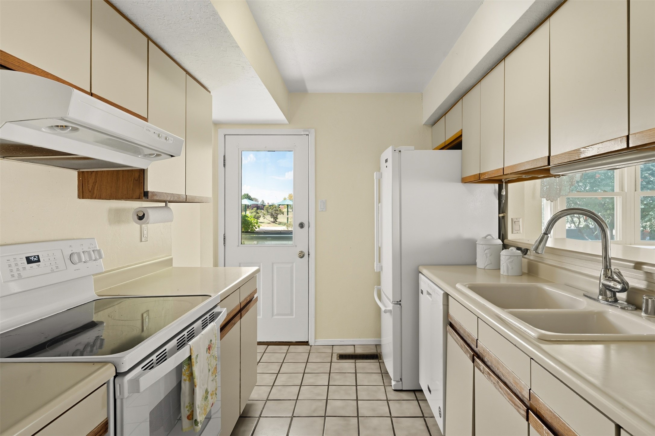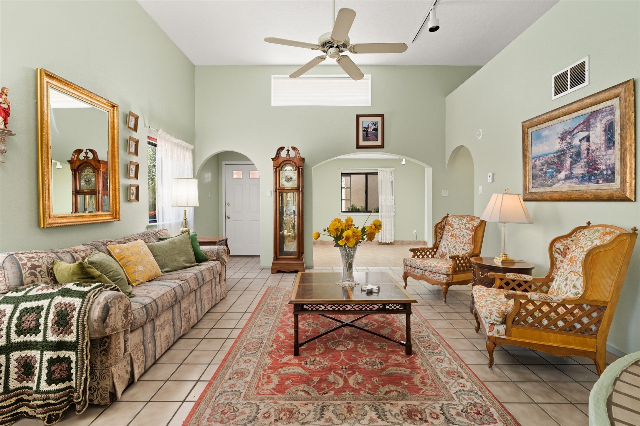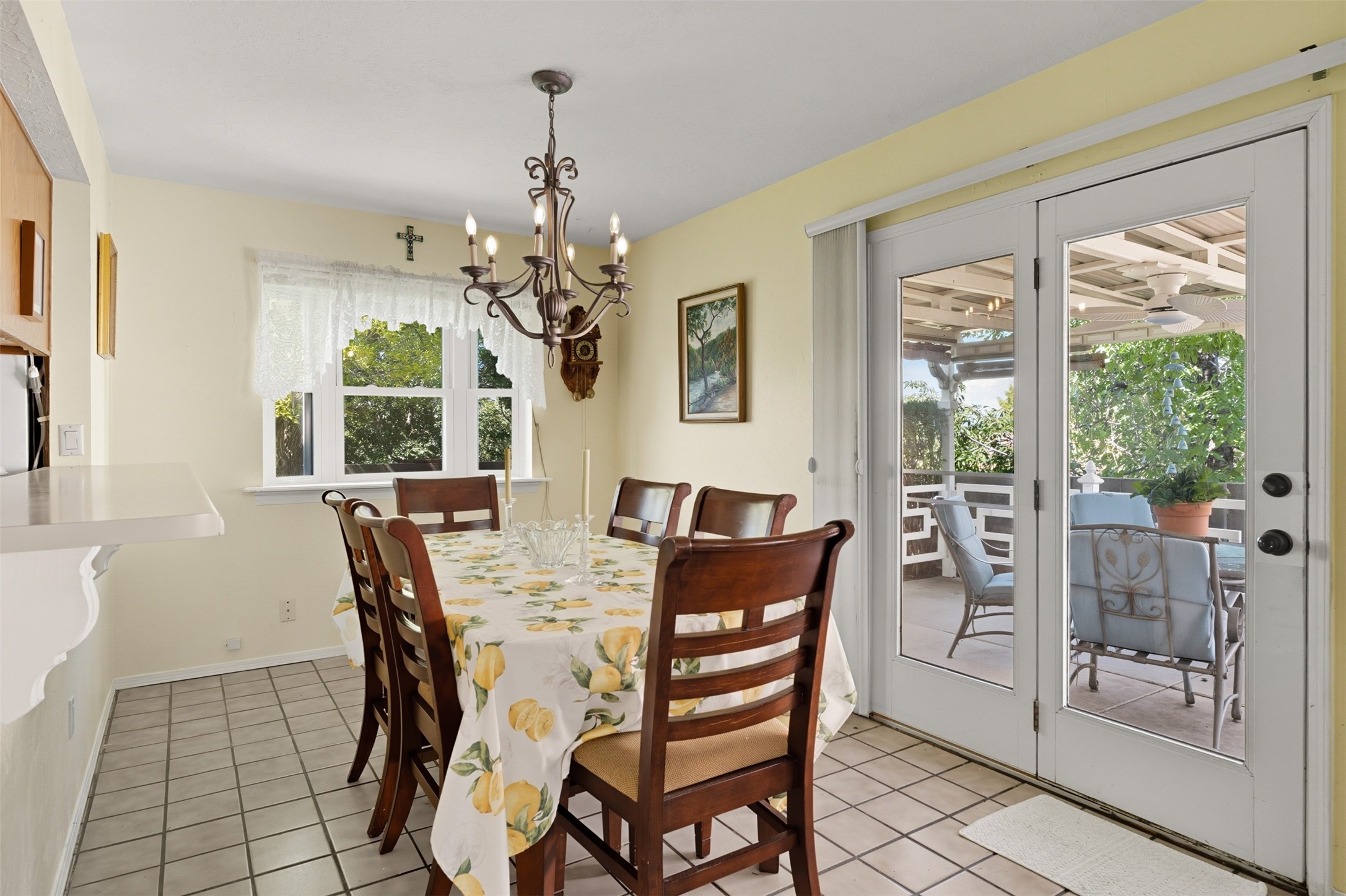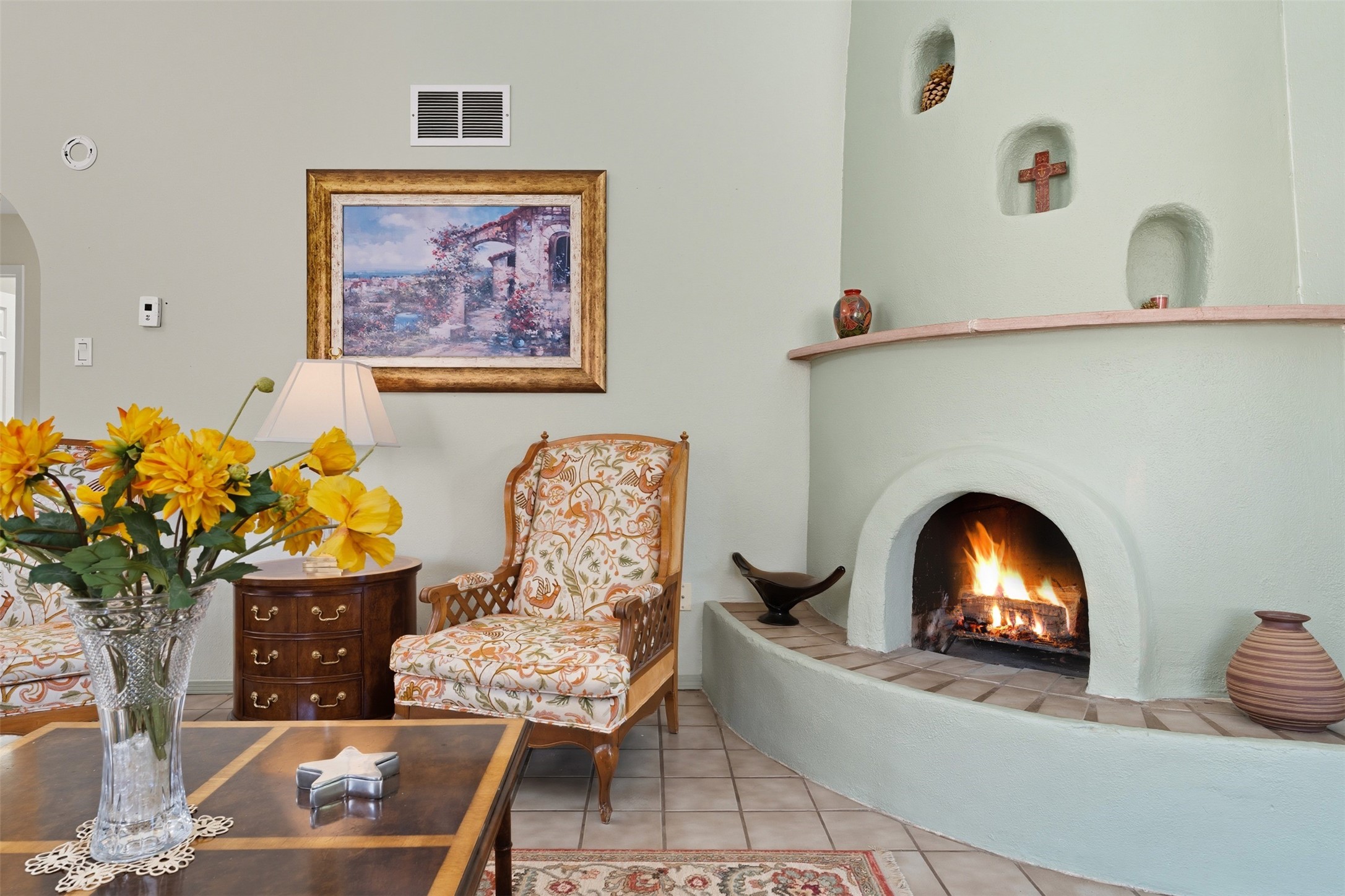 Patio home with two bedrooms and two bathrooms, plus a bonus room off the main living area that could be used as a den or office. The living room has a high ceiling and lots of light. Formal dining area adjacent to the kitchen that leads to the spacious outdoor area with covered portal, patio space and the backyard area which backs up to the Las Estancias Park. The primary bedroom is spacious and the second bedroom is at the opposite side of the hall. An oversized garage includes built-in cabinetry for storage and an additional freezer that conveys with the home. Enjoy outdoor entertaining or quiet evenings in the private gated courtyard. A perfect blend of comfort, functionality, and outdoor living!