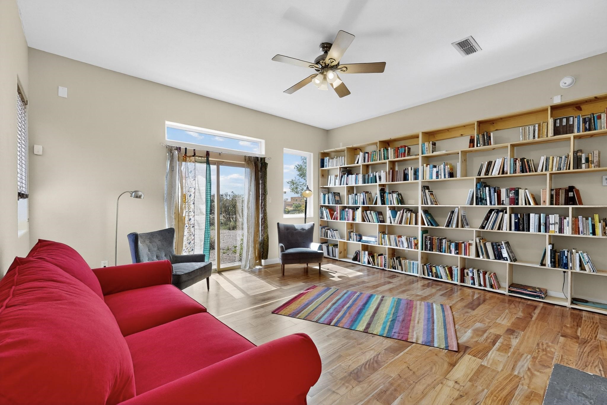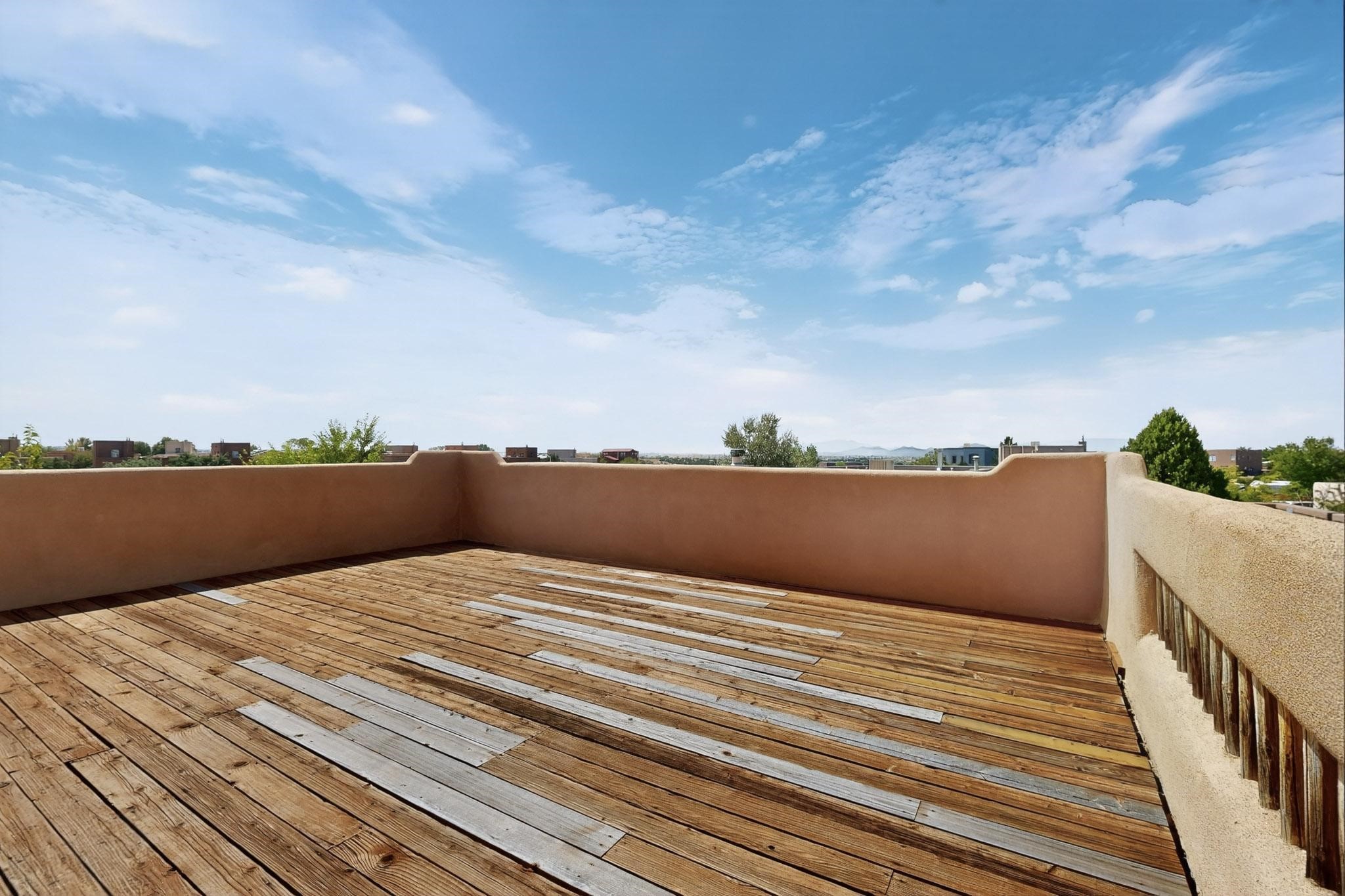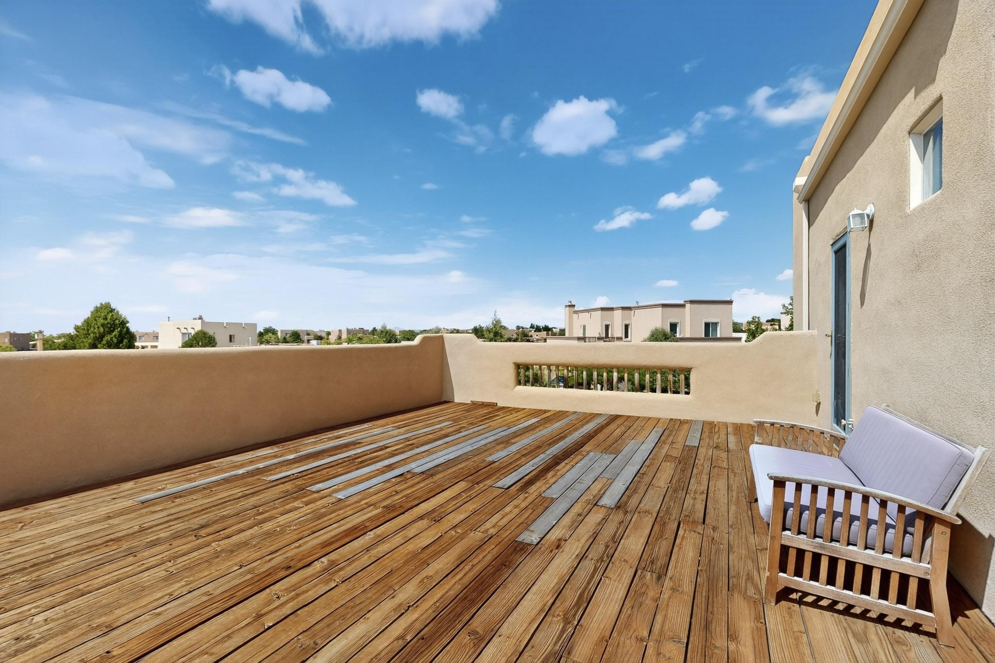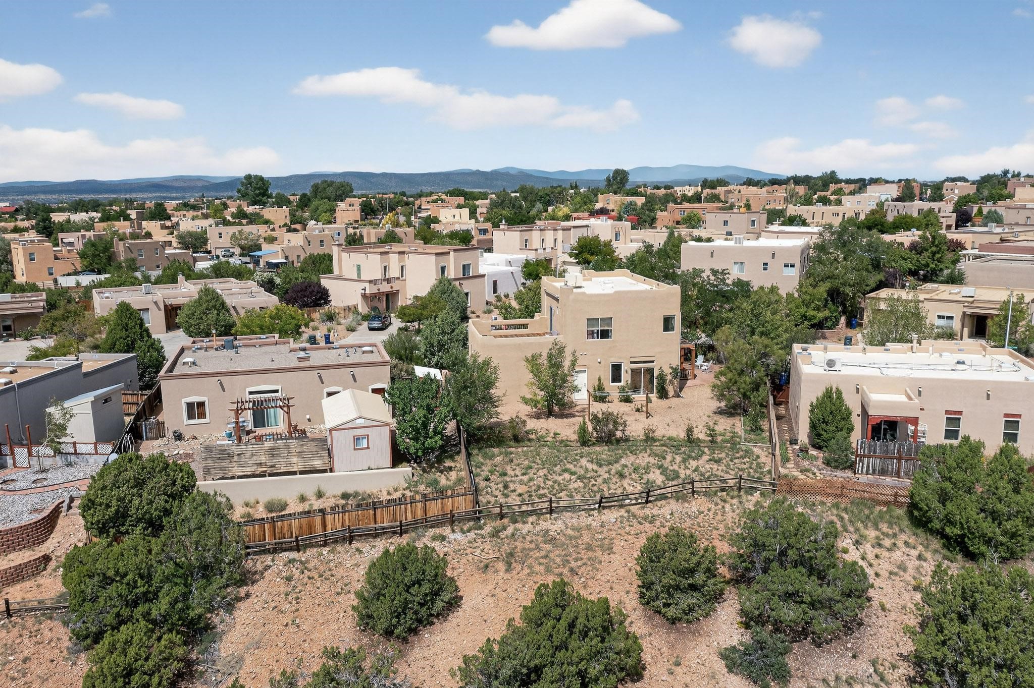 Nestled atop a serene arroyo, this exceptional property offers unparalleled convenience, mere minutes from Highway 599 and Cerrillos Road--perfect for commuters heading to Los Alamos (45 minutes) or Albuquerque (50 minutes). This location is the heart of a vibrant community, with tree-lined sidewalks and trails along Jaguar Drive, nearby schools, a public library, and the picturesque Swan Park. Plus, you can easily access historic Agua Fria Street for a quick 20-minute drive to the Railyard or Plaza in the charming heart of Santa Fe. Inside, the home welcomes you with soaring ceilings and is truly move-in ready, featuring a newer TPO roof and fresh exterior stucco. The original garage has been transformed into a stunning Artist Studio, a versatile space that can easily be reverted back or used as additional flex space for your hobbies or as a family room. The ground floor seamlessly opens onto a spacious outdoor patio, surrounded by mature trees, creating an ideal setting for entertaining or peace and relaxation. The beautifully upgraded kitchen is perfect for culinary enthusiasts and entertaining, while the master suite upstairs offers a spa tub and a private outdoor deck--your sanctuary for morning yoga or evening stargazing. With a drip irrigation system in place to maintain lush, green grounds and keep the house cool, this property truly embodies comfort and convenience. Don't miss your chance to call this beautiful home your own!