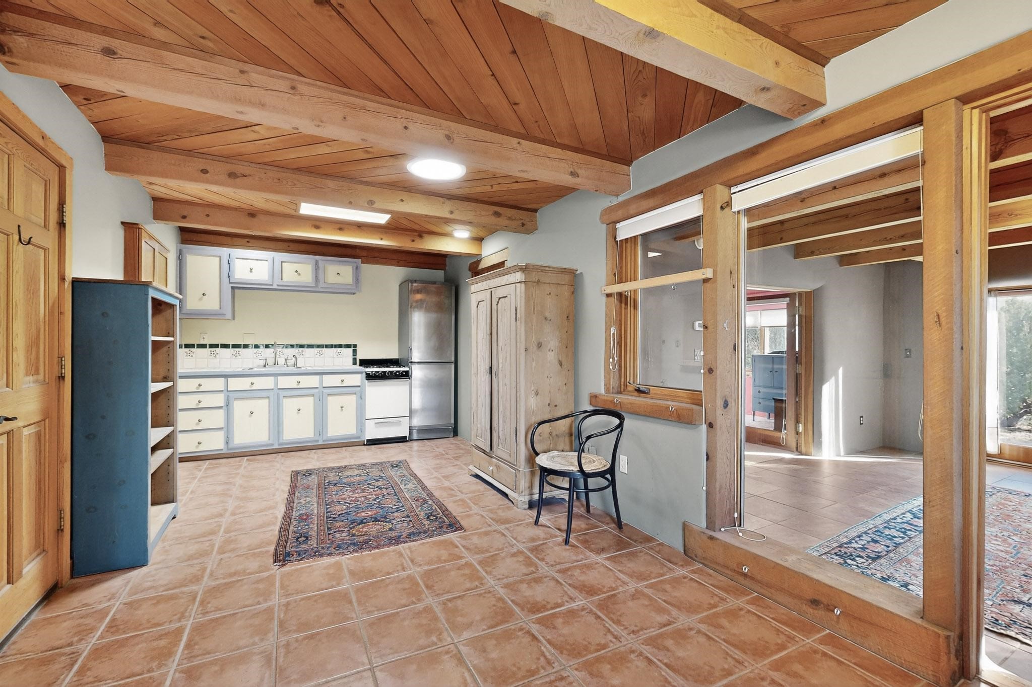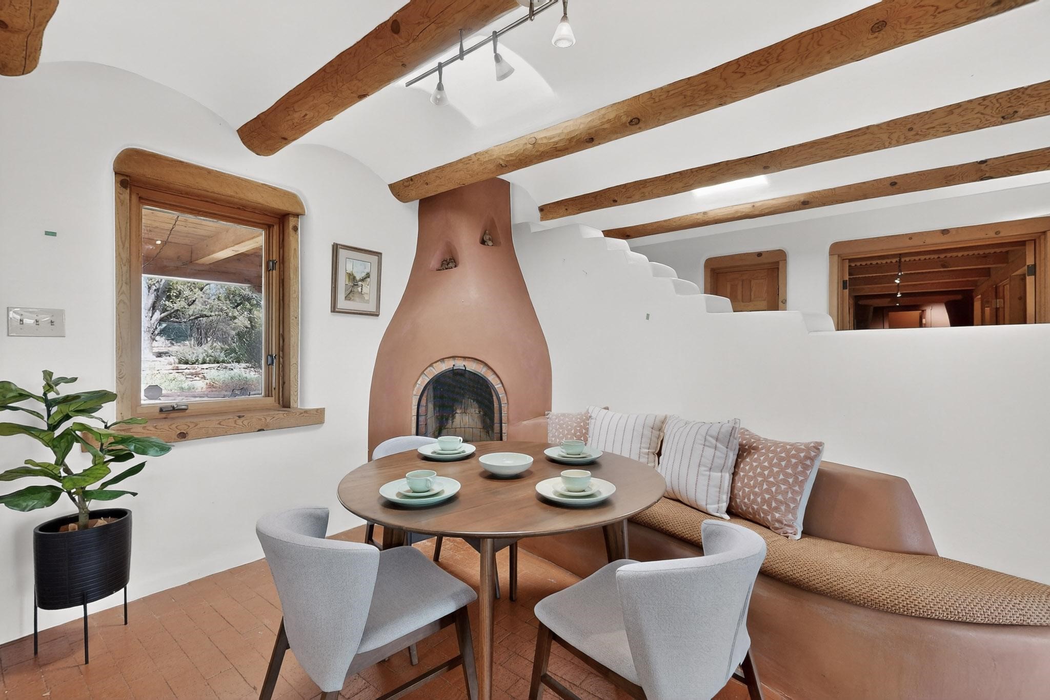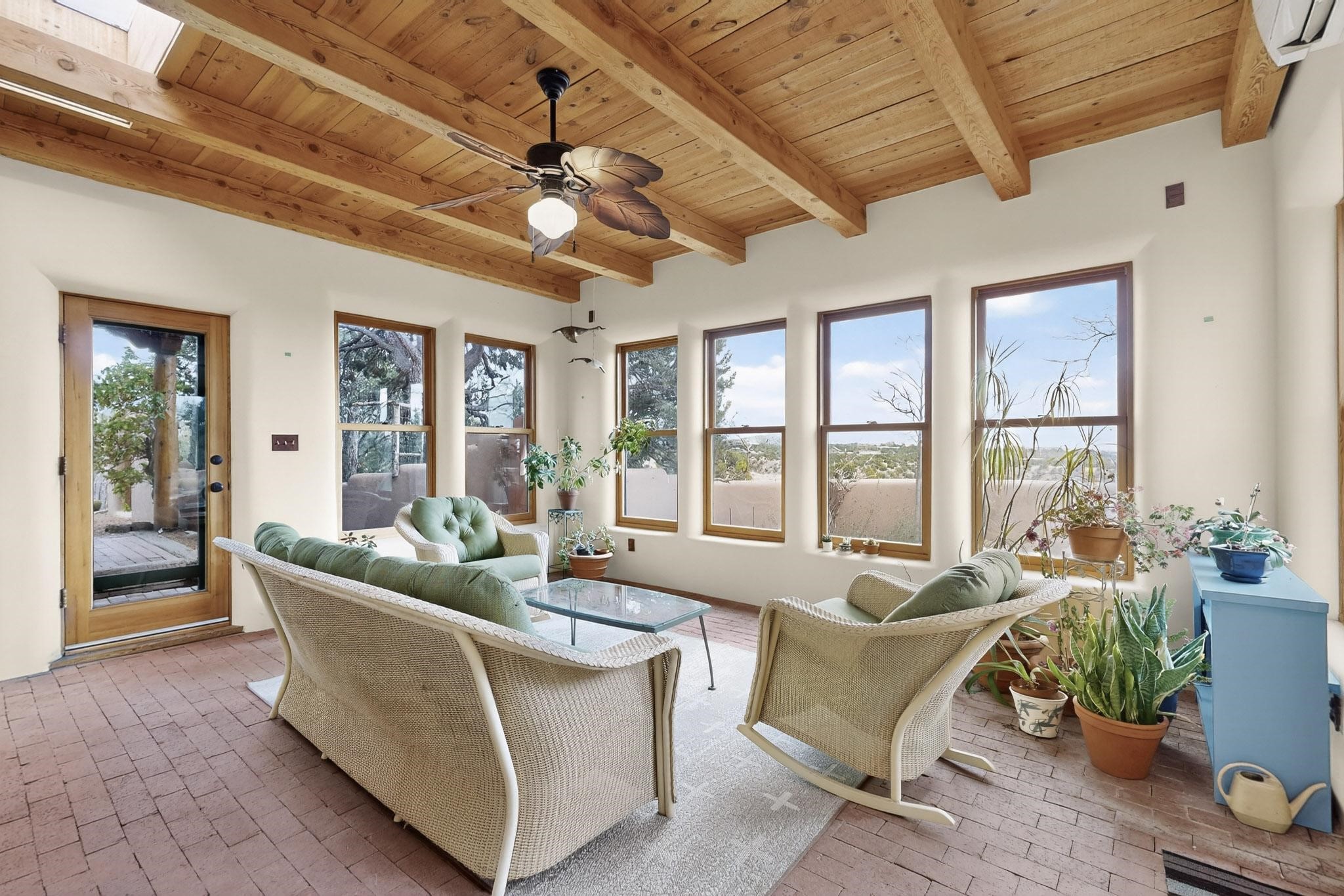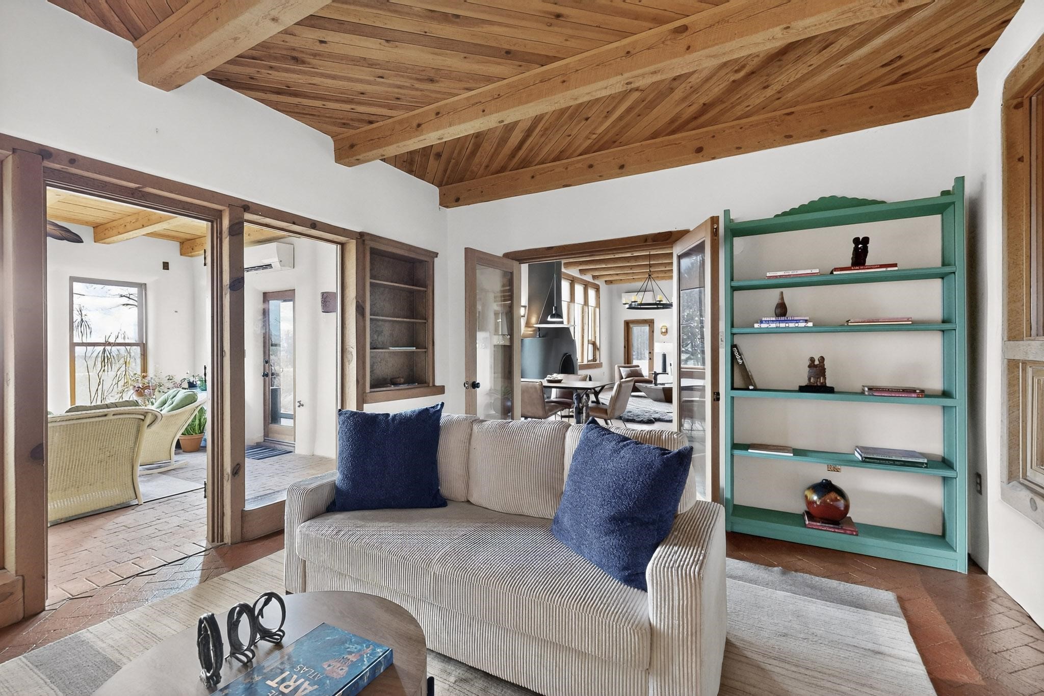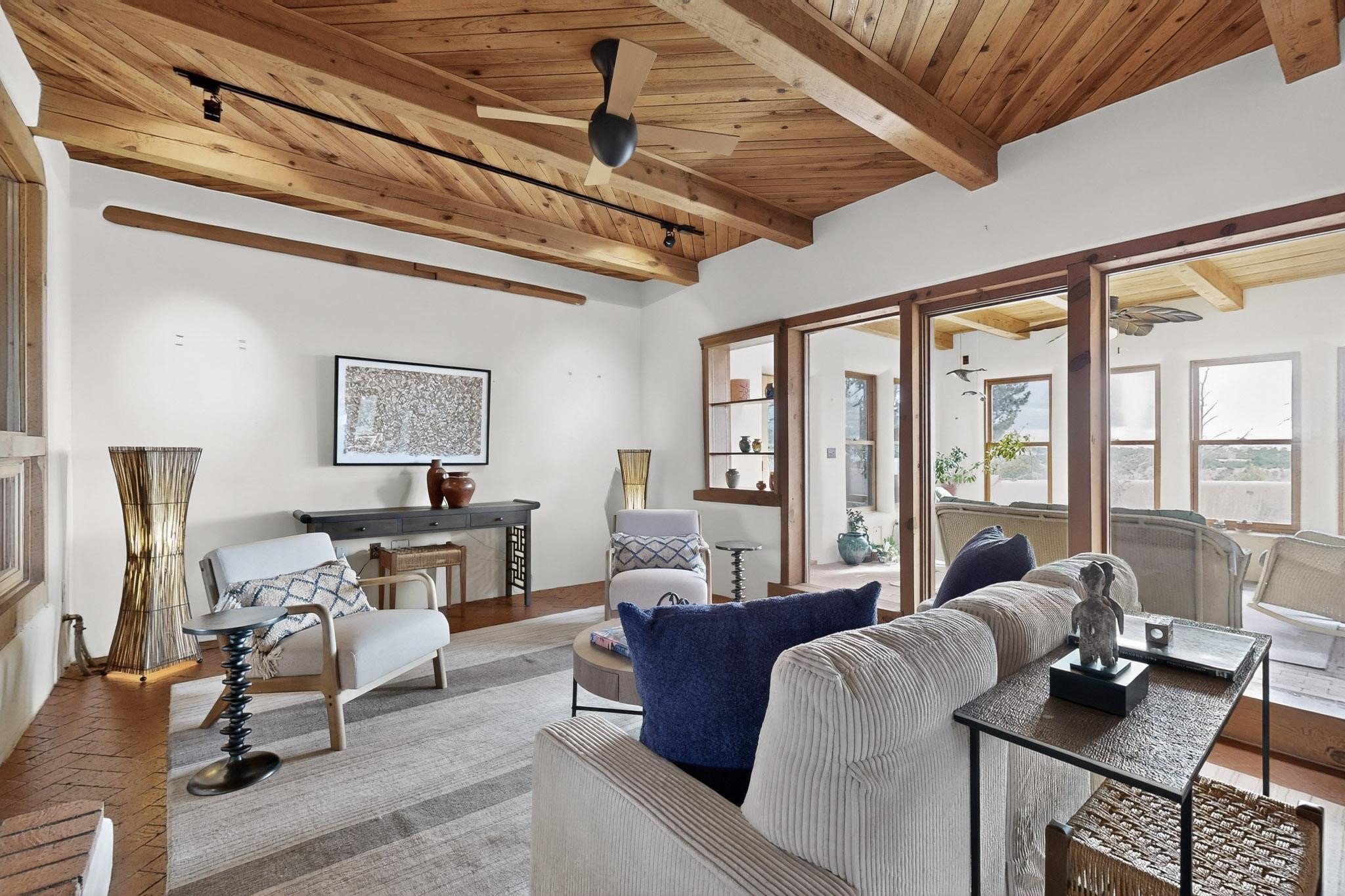 The 24 Old Agua Fria adobe compound is a rare property given its unique location on the north rim of the Arroyo Hondo , a tributary of the Santa Fe River, with its inspiring and commanding canyon views to the south and west, its access to nearby public and private trails, its plentiful garden pathways, stone walls, and diverse trees and plants. Of note, the property has a remarkable solar footprint both on ground and rooftop that champions its sustainable profile in locked step with PNM. And finally, the nearby proximity of the indigenous Arroyo Hondo Pueblo (Ca1300 CE) that grew into a 1000 room thriving community, speaks with immediacy to our local Archeological heritage and its stewardship today under the Archeological Conservancy. See WWW.ArroyoHondo.Org in Associated Docs for the compelling Santa Fe storyline that emerged in the 20th Century.The adobe Main House was bult in 1990 and the Casita in 2000. The Main has 3 bedroom, 2 bathrooms and the Casita includes a 1 bedroom with adjacent Living Room, a small kitchen and 1 bathroom. A large adobe garage abuts to the north for car parking (EV connections), storage and creative uses. The property has a private well, the land parcel with its serene, sunny vistas shares 7.94 relatively undeveloped private acres with close access to downtown Sant Fe at 10 minutes drive away. Please come visit this extraordinary residence, experience its embrace of soft canyon winds, long sunrise and sunset views with hilltop promontory privacy that's hard to find today!