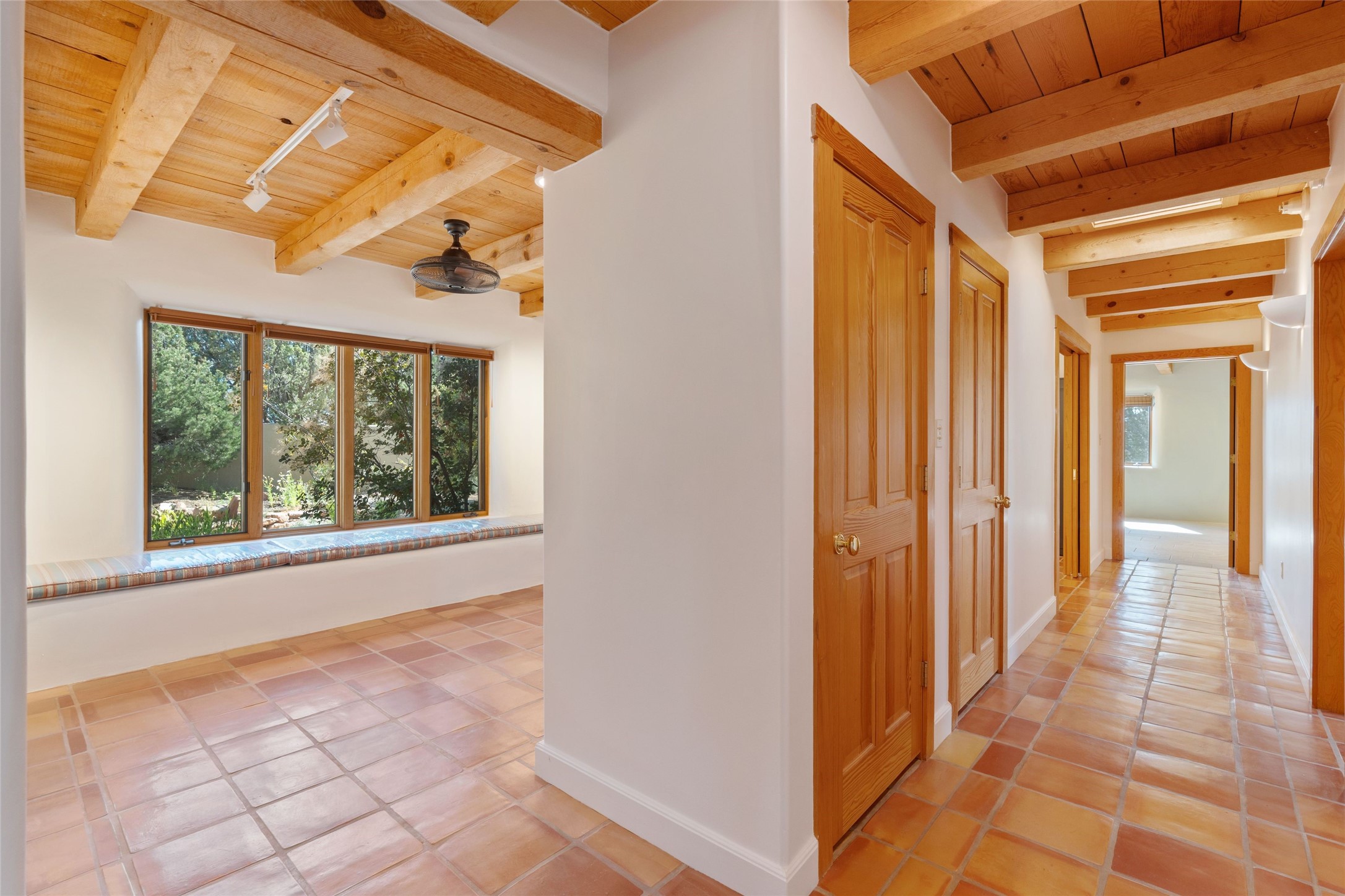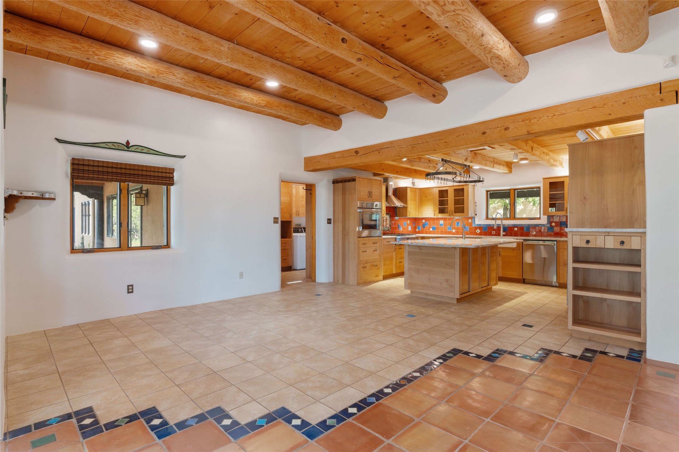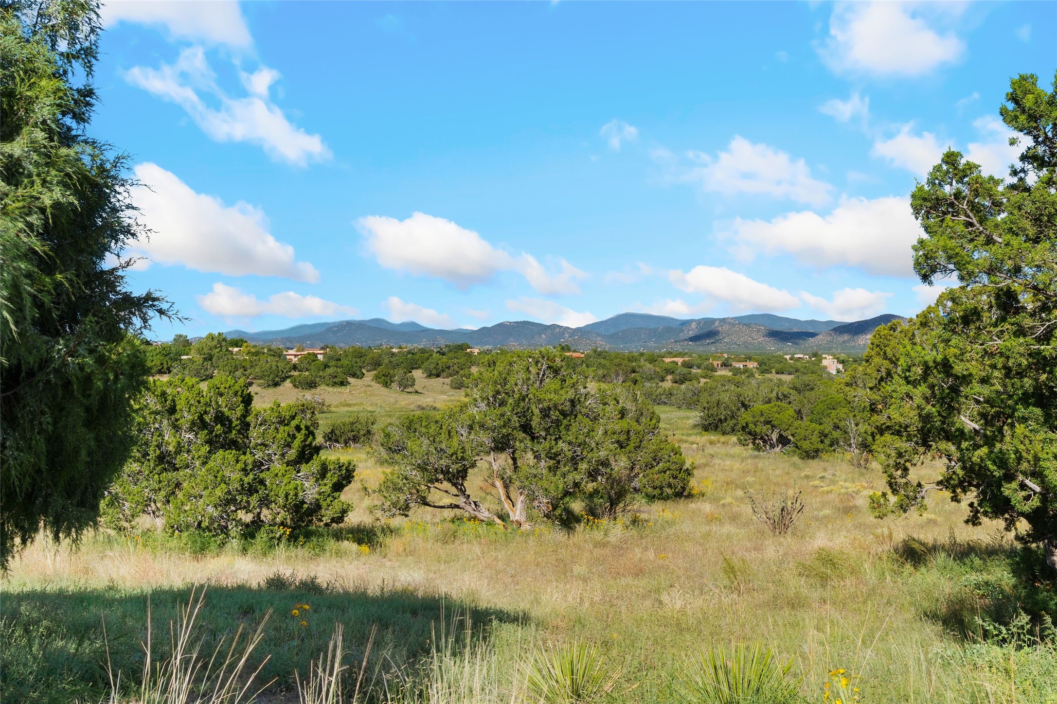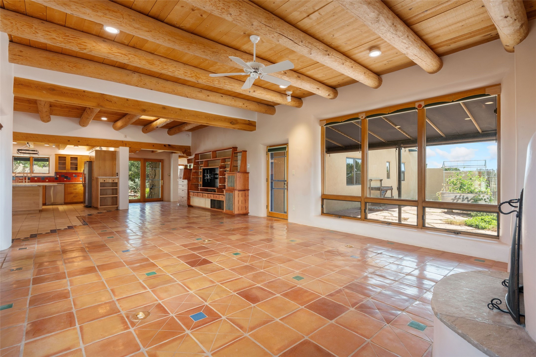 Introducing an elegant, single level, custom adobe home on almost 2 acres with absolutely everything! With an office area, 3 bedrooms, two art studios and 3 patios, the house is flexible enough for the most discerning Buyer. Walk to the front door through a large beautifully landscaped, walled courtyard and enter this light and bright home with high beamed ceilings and a dramatic fireplace - the incredible views to the east and to the west bring the outdoors in. Glass doors open to two different outdoor patios. The spacious open floor plan leads you naturally from the breathtaking living room, to the cozy, comfortable dining area which opens onto the renovated, gourmet, custom kitchen. Alder cabinets, granite countertops, under cabinet lighting and excellent appliances - every detail of this home was lovingly crafted and thoughtfully designed. The contemporary primary suite has a large walk-in closet and the bathroom has a jetted walk-in tub as well as a separate shower area. Another bedroom has a large fireplace and the two guest bedrooms share a bathroom with cheerful Mexican tile. Yes, two separate art studios! First, an attached former woodwork shop/ceramics studio with radiant heat followed by the newly constructed separate studio with high ceilings, art storage, excellent light and a bathroom. The studio has custom raw lime plaster walls. Light filled, with beautiful views from every window, the house is situated on an expansive greenbelt; quiet and privacy prevail. The home has solar panels providing supplemental electricity and a shared well, with excellent water, so utility bills are minimal. Improvements include a 2-year-old roof with a 10-year warranty, a high efficiency boiler with tankless hot water, drip irrigation and a large attached car port with high ceilings and ample storage. There is even a Catio for your feline friends!