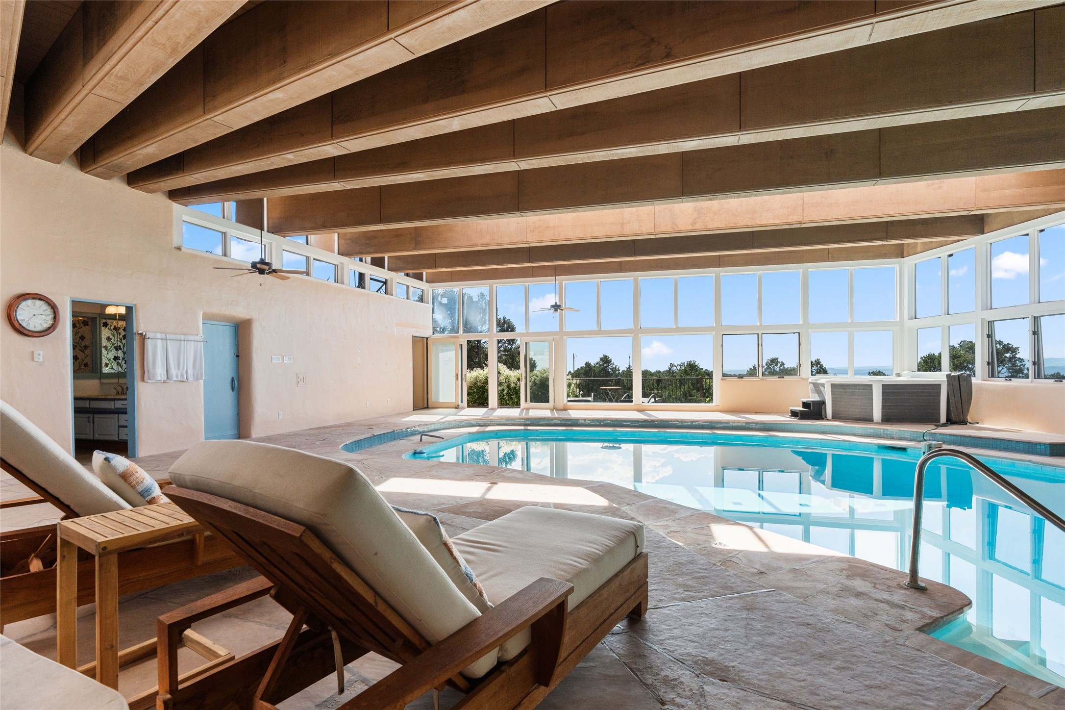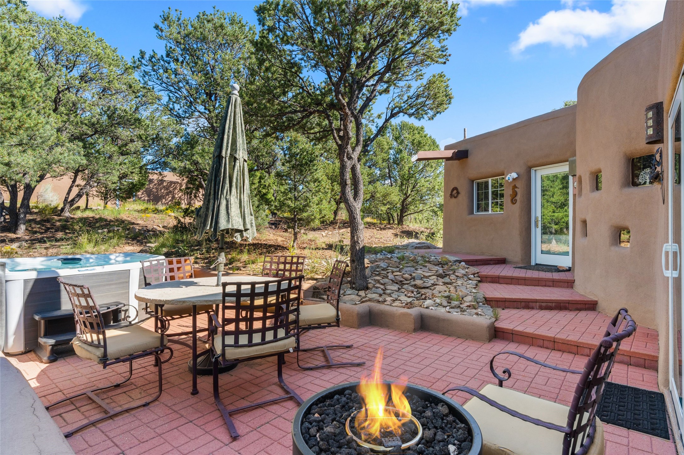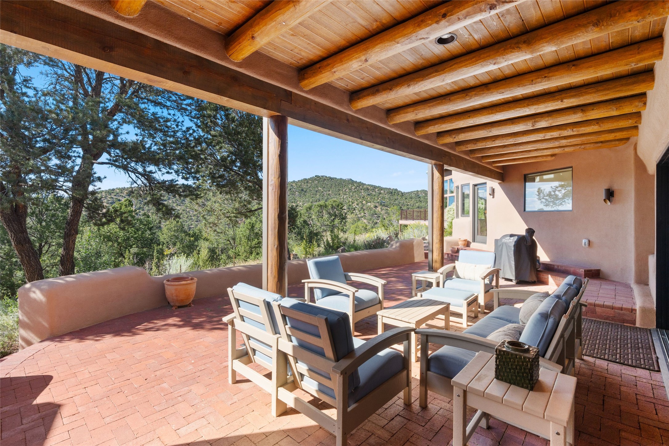 Just a minute off the historic Old Santa Fe Trail in the foothills of the Sangre de Cristo mountains, there resides a spectacular expression of design and architecture. This totally remodeled adobe/frame and stucco home sits upon 1.98 maturely treed and landscaped acres. Exquisitely constructed in a traditional Pueblo design, the 3 bedroom/3 bath, 3,900 +/- sq.ft. main home was designed with a timeless attention to detail, from the siting of the home to the hand plastered walls, vigas with cedar planking, and cascading wood floors throughout. Lovingly upgraded and maintained, the home has several primary suite options with each their own lavish and spa-like bathrooms. An open concept living/dining area is bathed in natural light with a dramatic gas fired fireplace centering the room opposite a wall of disappearing glass doors, ideal for year round entertaining on the deep portal. The large gourmet kitchen area offers a free and easy experience for those looking to entertain or who enjoy an upscale culinary experience. A nearby oversized 2-car garage has additional storage space and shelving. A detached 1 bedroom/1 bath, 1,189 +/- sq.ft. guesthouse is separated from the main house, with its own private outdoor entertaining area and hot tub. The traditional design continues in the guest house, complemented with Saltillo tile floors, vigas and a full kitchen, perfect for guests or an additional rental opportunity. A grand pool room with another hot tub completes the property with its own bathroom, and a separate studio space nearby. A wraparound deck, just off the pool room, has breathtaking western, sunset views, easily viewable while lounging in relaxation from the inside or outside. The property is just a 5 minute drive to the famous Harry's Roadhouse Restaurant or The Club at El Gancho, all on paved and maintained roads. Both the main house and guest house have grossed superlative rental income since ownership with the furnishings available for purchase ideal for those looking for an exceptional investment opportunity property. Function and creativity blend in perfect unison with nature in a fantastic Santa Fe location.