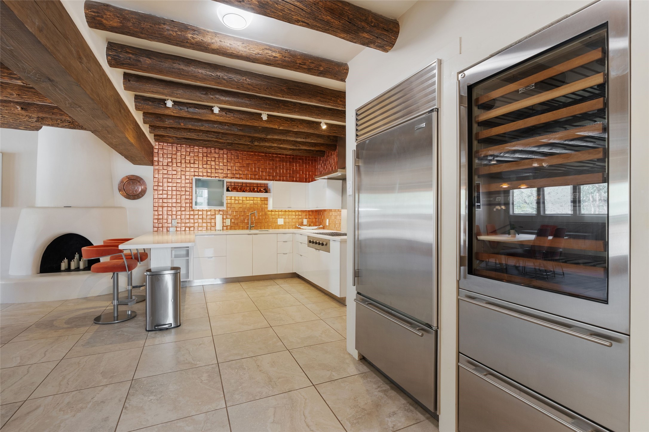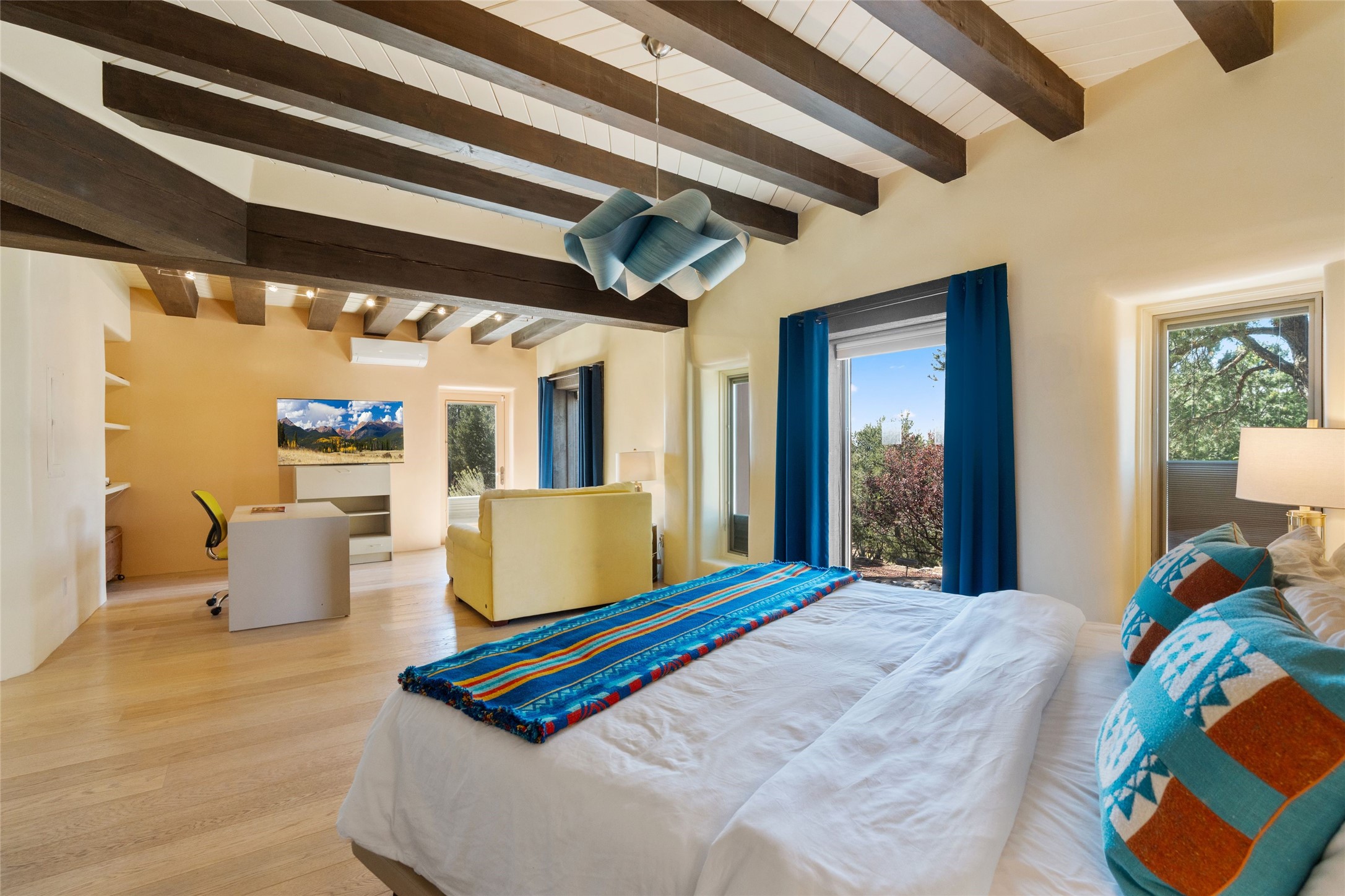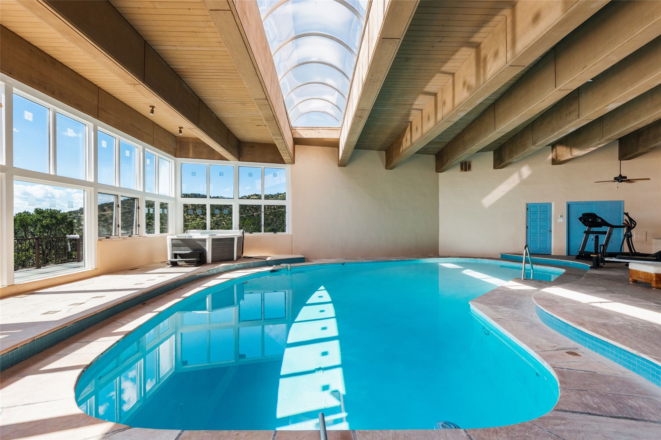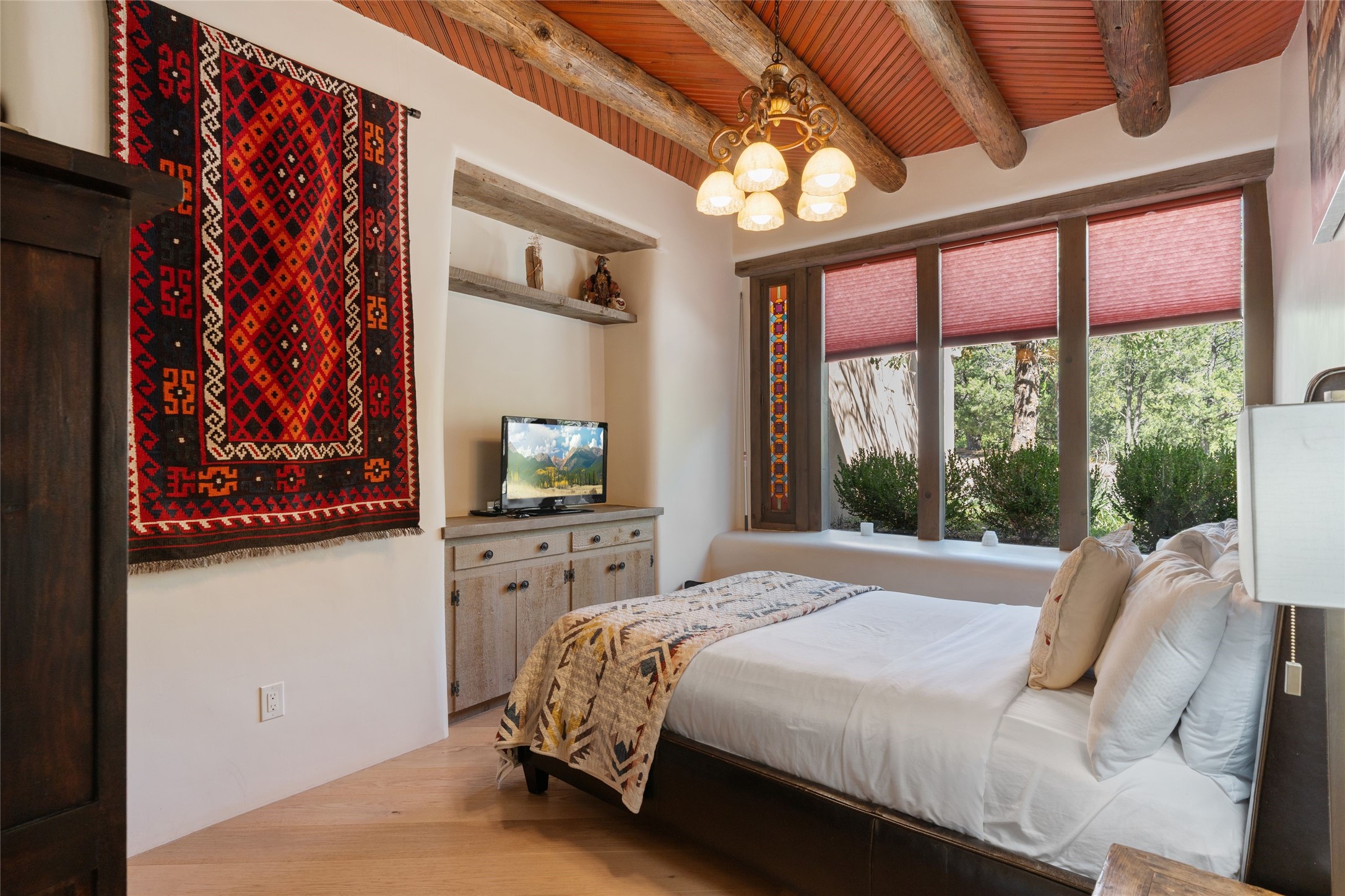 Just a minute off the historic Old Santa Fe Trail in the foothills of the Sangre de Cristo mountains, there resides a spectacular expression of design and architecture. This totally remodeled adobe/frame and stucco home sits upon 1.98 maturely treed and landscaped acres. Exquisitely constructed in a traditional Pueblo design, the 3 bedroom/3 bath, 3,900 +/- sq.ft. main home was designed with a timeless attention to detail, from the siting of the home to the hand plastered walls, vigas with cedar planking, and cascading wood floors throughout. Lovingly upgraded and maintained, the home has several primary suite options with each their own lavish and spa-like bathrooms. An open concept living/dining area is bathed in natural light with a dramatic gas fired fireplace centering the room opposite a wall of disappearing glass doors, ideal for year round entertaining on the deep portal. The large gourmet kitchen area offers a free and easy experience for those looking to entertain or who enjoy an upscale culinary experience. A nearby oversized 2-car garage has additional storage space and shelving. A detached 1 bedroom/1 bath, 1,189 +/- sq.ft. guesthouse is separated from the main house, with its own private outdoor entertaining area and hot tub. The traditional design continues in the guest house, complemented with Saltillo tile floors, vigas and a full kitchen, perfect for guests or an additional rental opportunity. A grand pool room with another hot tub completes the property with its own bathroom, and a separate studio space nearby. A wraparound deck, just off the pool room, has breathtaking western, sunset views, easily viewable while lounging in relaxation from the inside or outside. The property is just a 5 minute drive to the famous Harry's Roadhouse Restaurant or The Club at El Gancho, all on paved and maintained roads. Both the main house and guest house have grossed superlative rental income since ownership with the furnishings available for purchase ideal for those looking for an exceptional investment opportunity property. Function and creativity blend in perfect unison with nature in a fantastic Santa Fe location.