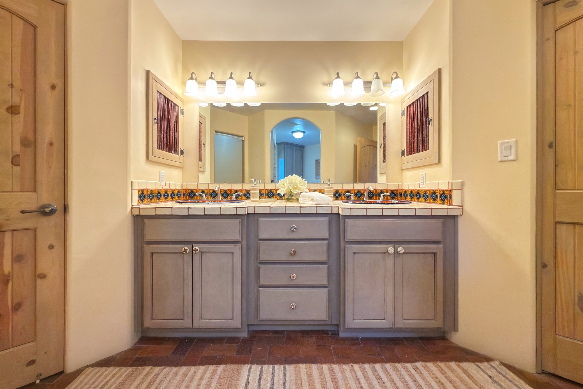 SELLER OFFERING $10,000 CREDIT AT CLOSING TO BUYER! This single-level home, built in 2005, offers the perfect blend of traditional Northern New Mexico architecture and modern comforts. Set on 1.44+/- acres with adjoining open space in the subdivision, the property welcomes you with lush, mature gardens and a beautiful entryway, framed by mountain views and proximity to equestrian facilities. Spanning approximately 2,272 sq. ft. the home features 3 bedrooms and 2 full baths. The spacious living room boasts high ceilings with wooden beams and corbels, a kiva fireplace, and brick floors that extend throughout. The kitchen includes stainless steel appliances, a walk-in pantry, custom cabinets, Mexican tile accents, and an eat-in breakfast nook. The primary suite is a private retreat with a generous walk-in closet and a large bathroom featuring double sinks, a jetted tub, and a separate shower. Two thoughtfully positioned guest bedrooms share a full bath with double sinks. Additional highlights include in-floor radiant heat, split units for supplemental heating and cooling and a two-car garage that offers a built-in workbench, custom cabinetry, and attic storage. Ideally located just minutes from Eldorado, this home is close to shopping, restaurants, gyms, banks, a post office, hardware stores, and pet services.