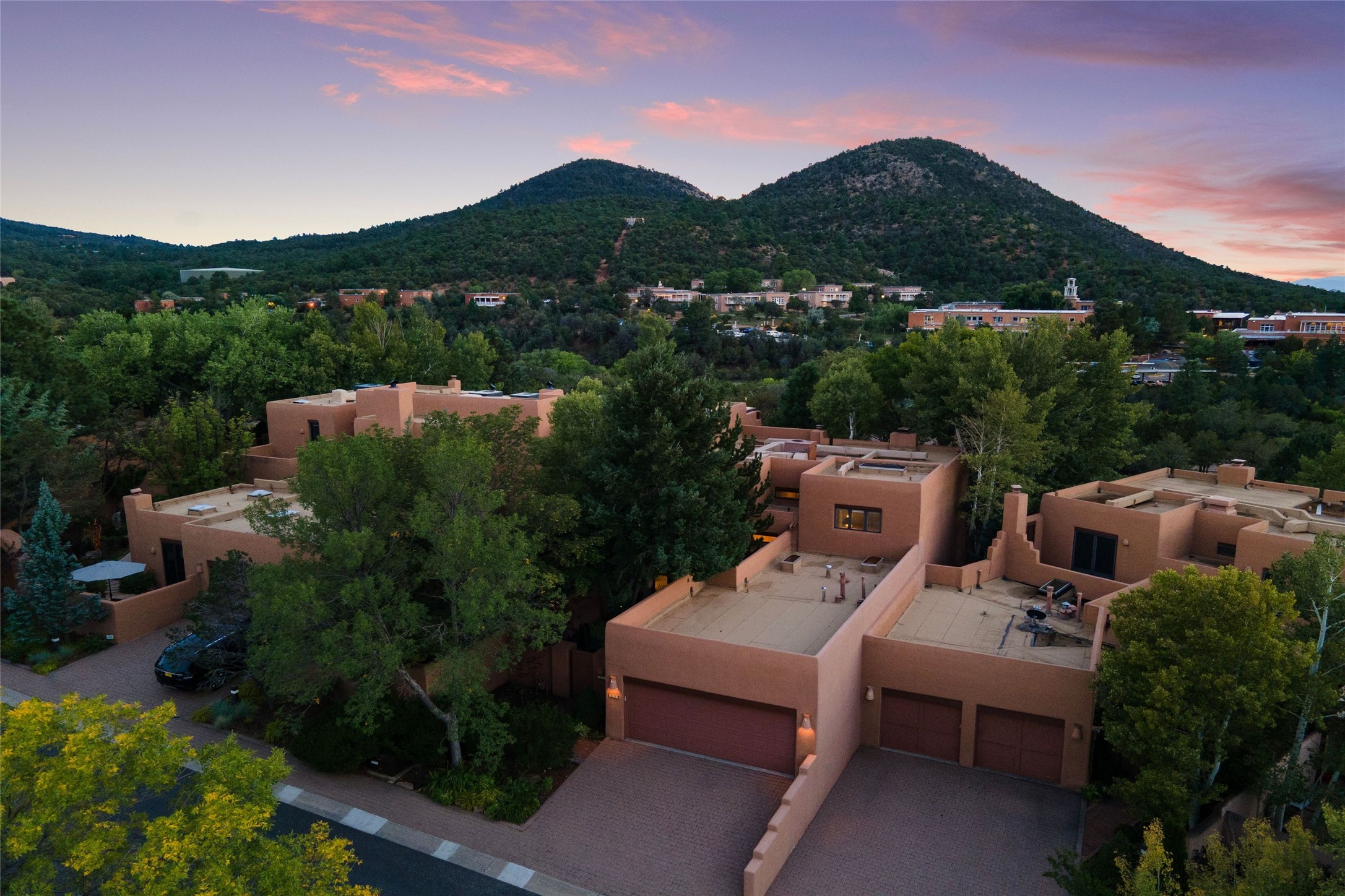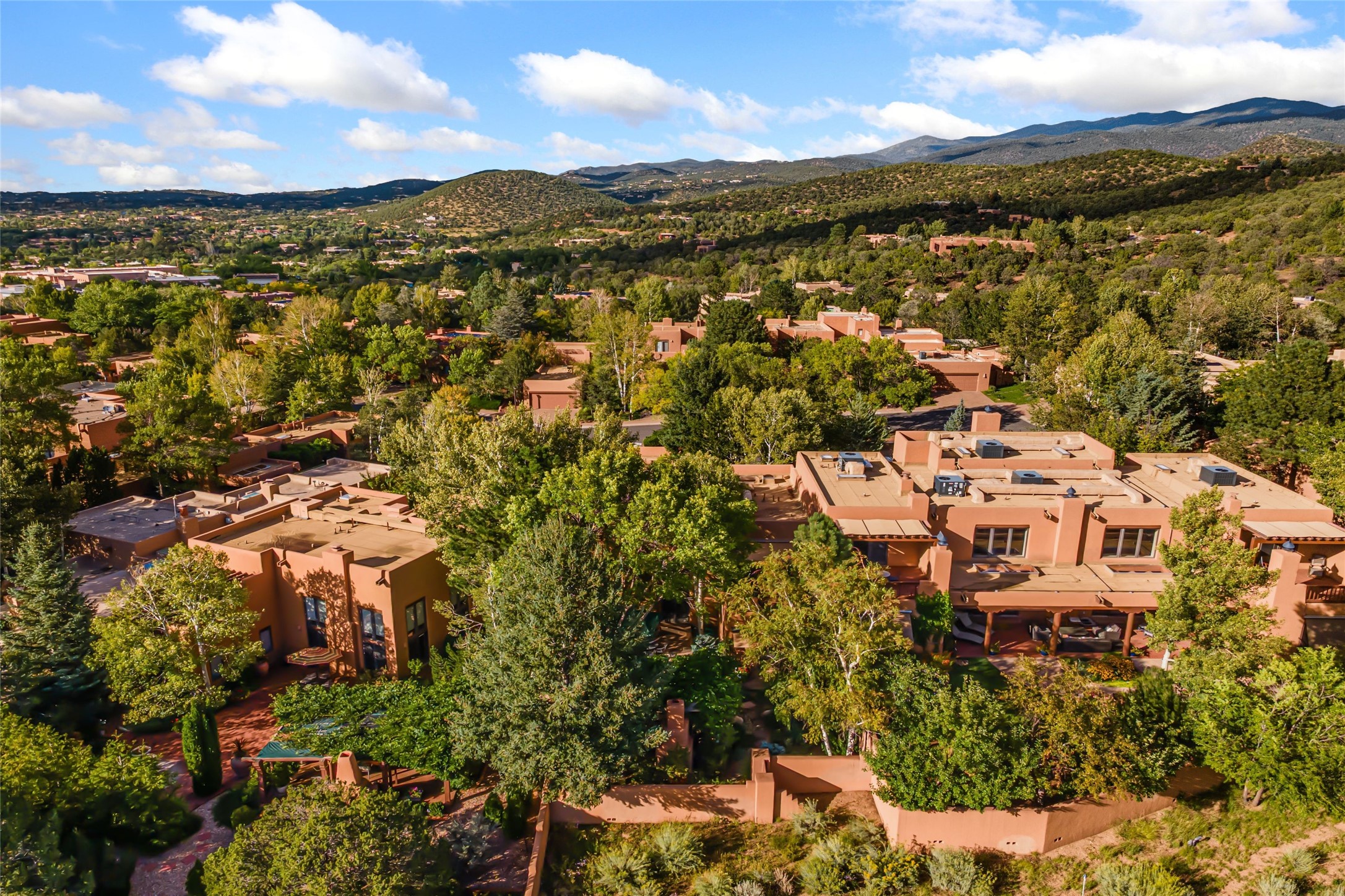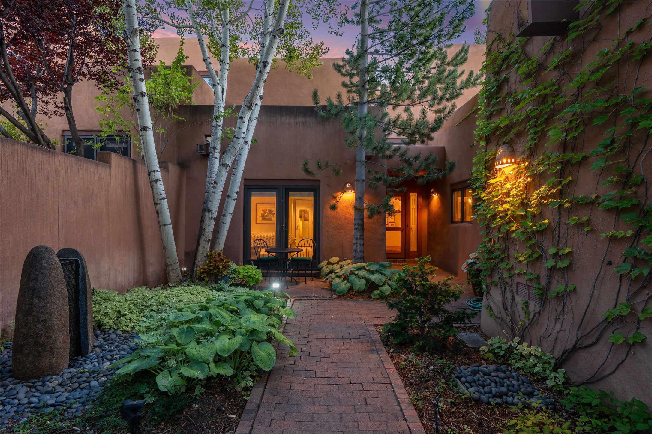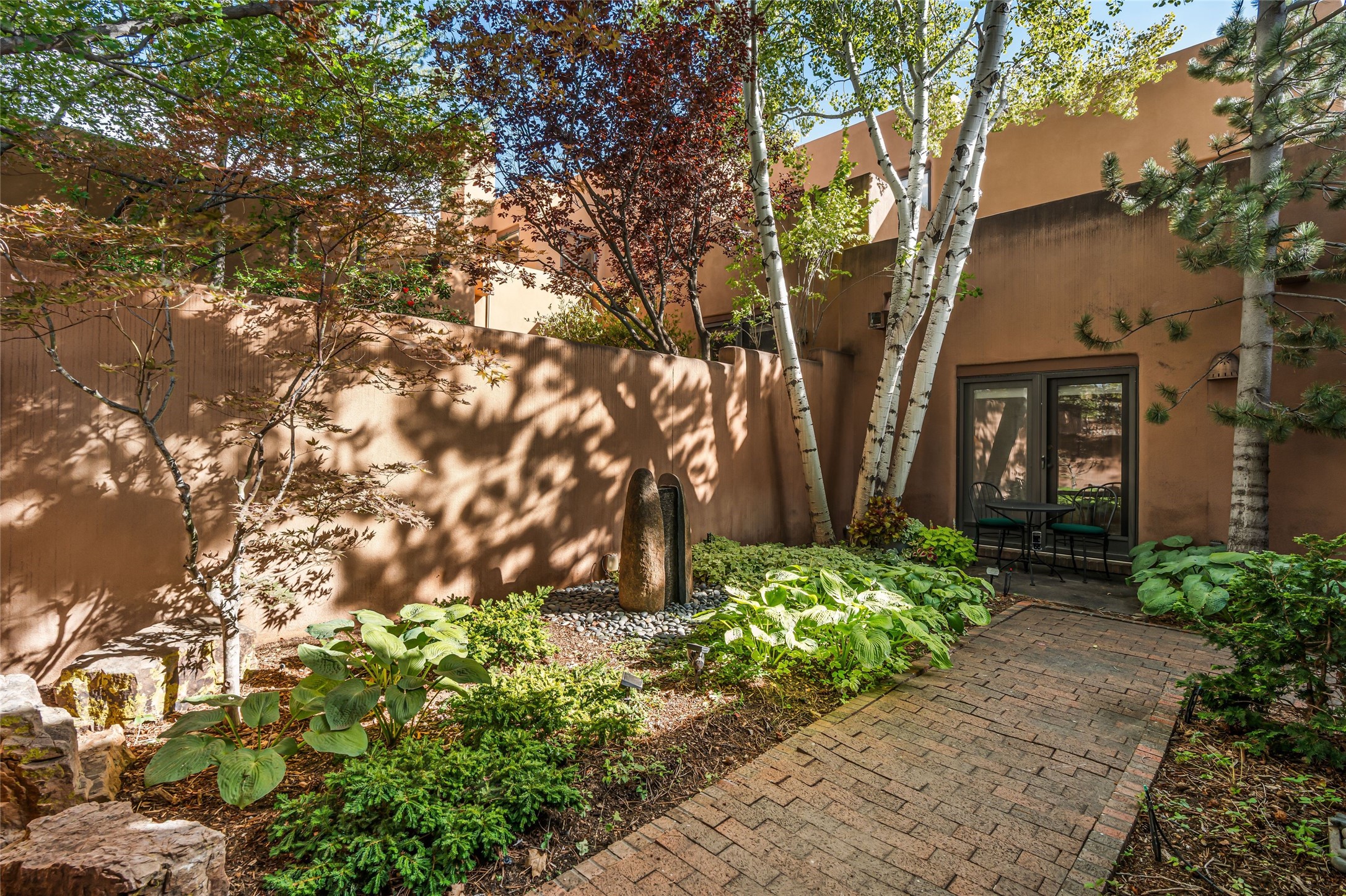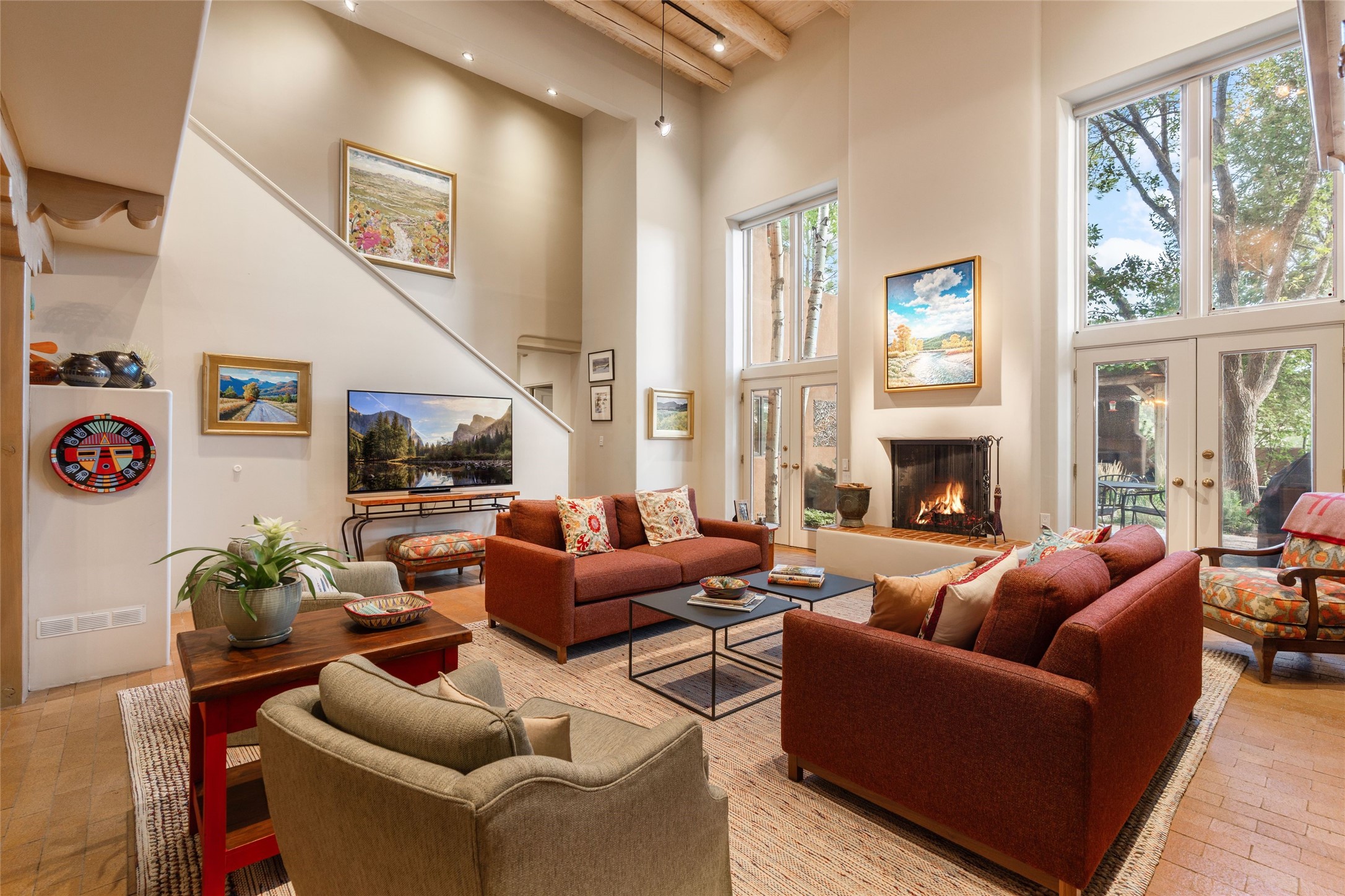 Desirable Los Miradores 3-bedroom, 3-bath residence close to Museum Hill and Canyon Road. Living room with soaring beamed ceilings and stately fireplace framed by high windows that highlight the towering trees outside. Updated kitchen, equipped with high-end appliances including a double oven, Sub-Zero refrigerator, wine fridge, and elegant quartz countertops, along with a center island perfect for casual dining and entertaining. This home features two spacious bedrooms and bathrooms on the first floor, providing convenience and comfort. Upstairs, you'll find a den/office area and a generous bedroom complete with a kiva fireplace and a large bath, both with access to outdoor decks that enhance the living space. All baths have been recently remodeled. The delightful, landscaped backyard combines a flagstone patio, outdoor fireplace, and serene nature paths bedecked with aspen trees and a tranquil fountain. 2-car attached garage. The gated community of Los Miradores offers many amenities, including a seasonal pool, workout facility and tennis court. Additionally, a 2-bedroom casita owned by Los Miradores offers rental opportunities for guests.