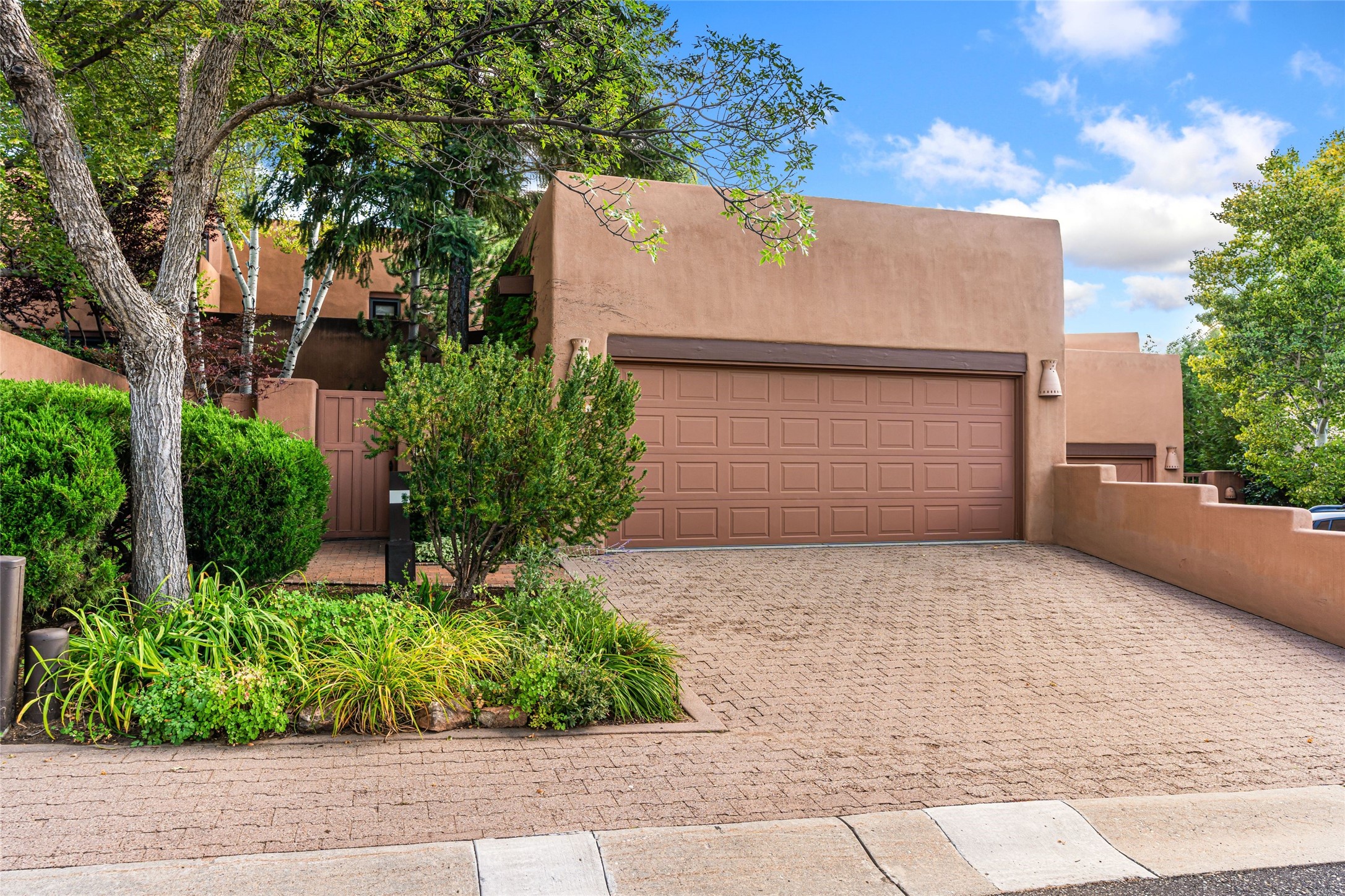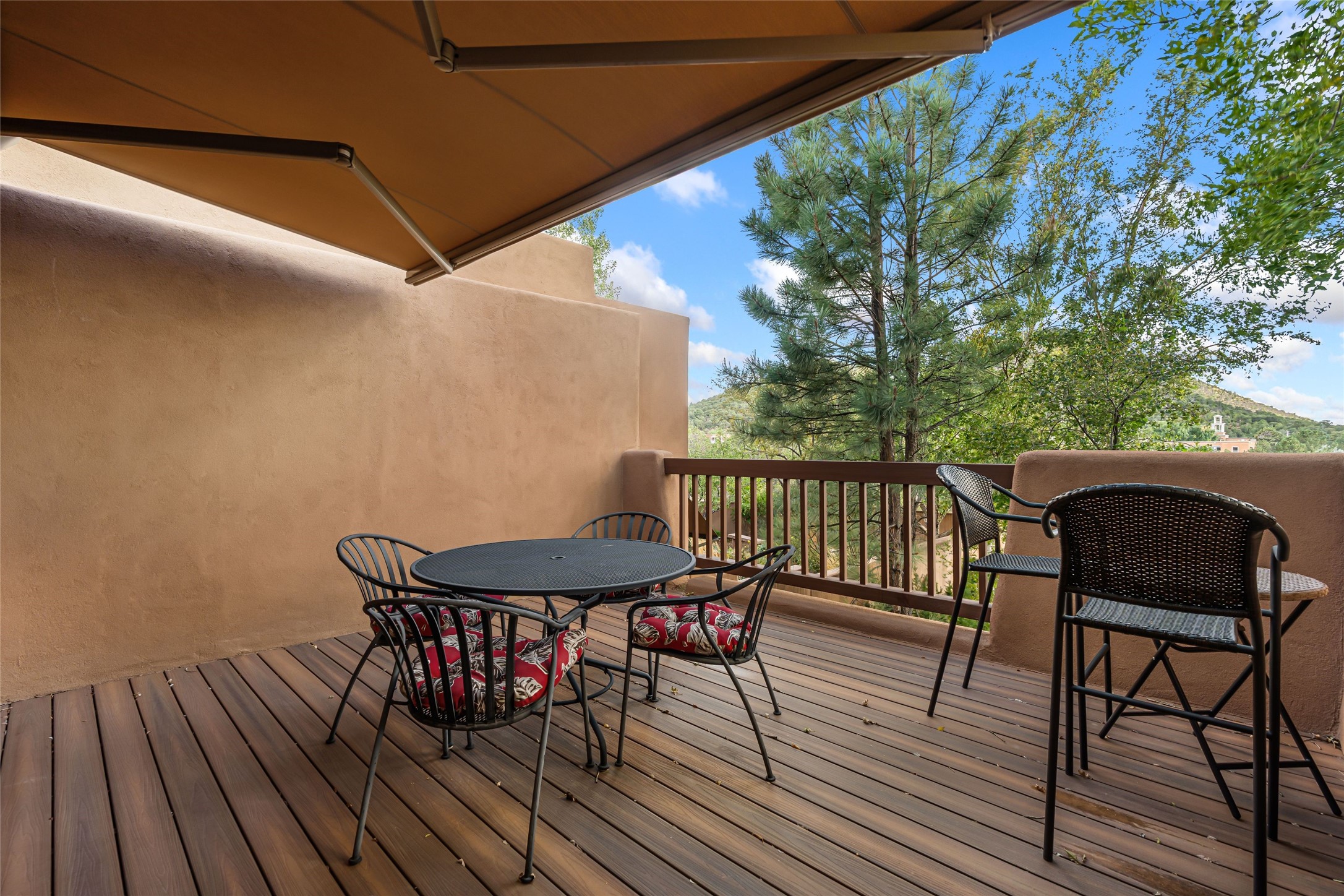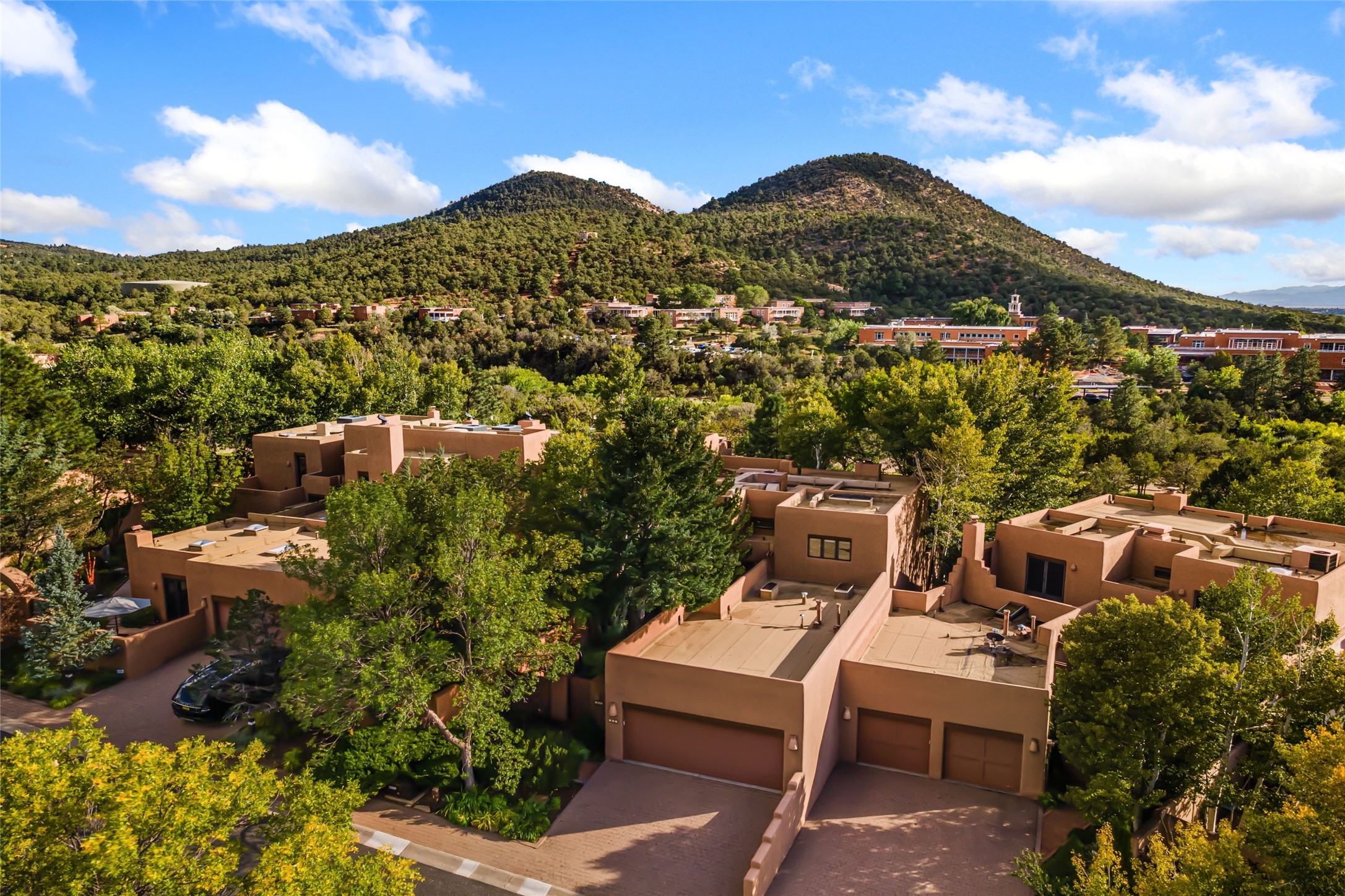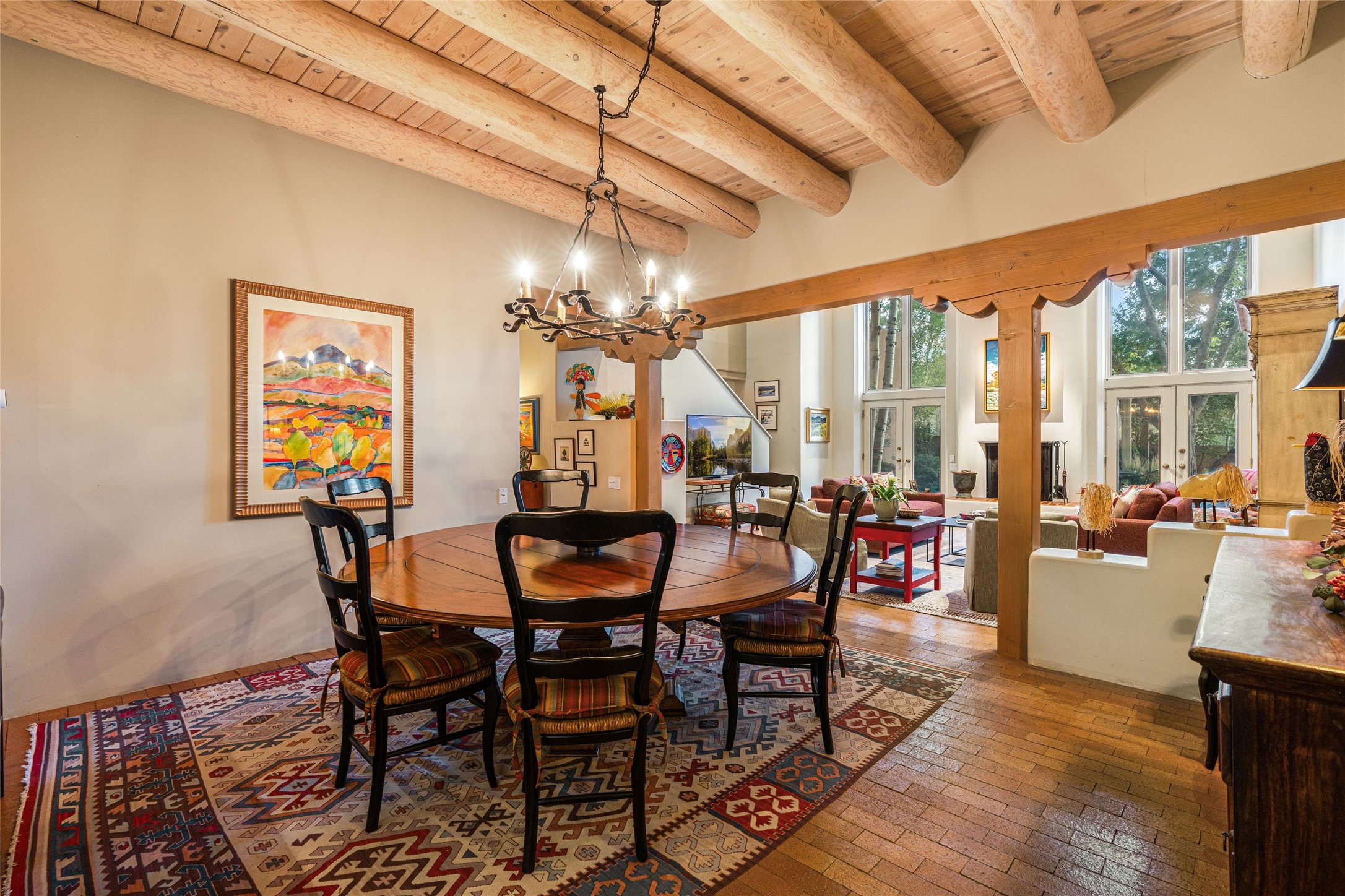Desirable Los Miradores 3-bedroom, 3-bath residence close to Museum Hill and Canyon Road. Living room with soaring beamed ceilings and stately fireplace framed by high windows that highlight the towering trees outside. Updated kitchen, equipped with high-end appliances including a double oven, Sub-Zero refrigerator, wine fridge, and elegant quartz countertops, along with a center island perfect for casual dining and entertaining. This home features two spacious bedrooms and bathrooms on the first floor, providing convenience and comfort. Upstairs, you'll find a den/office area and a generous bedroom complete with a kiva fireplace and a large bath, both with access to outdoor decks that enhance the living space. All baths have been recently remodeled. The delightful, landscaped backyard combines a flagstone patio, outdoor fireplace, and serene nature paths bedecked with aspen trees and a tranquil fountain. 2-car attached garage. The gated community of Los Miradores offers many amenities, including a seasonal pool, workout facility and tennis court. Additionally, a 2-bedroom casita owned by Los Miradores offers rental opportunities for guests.