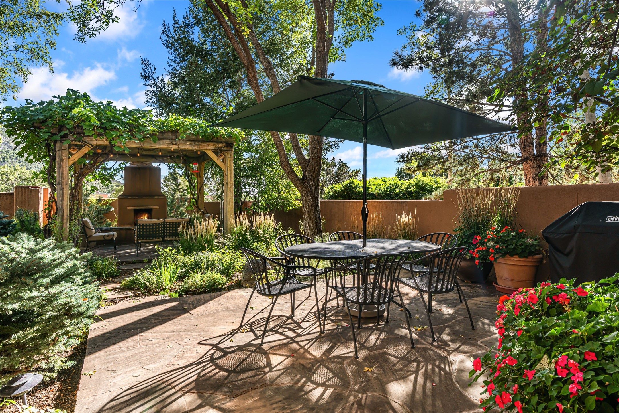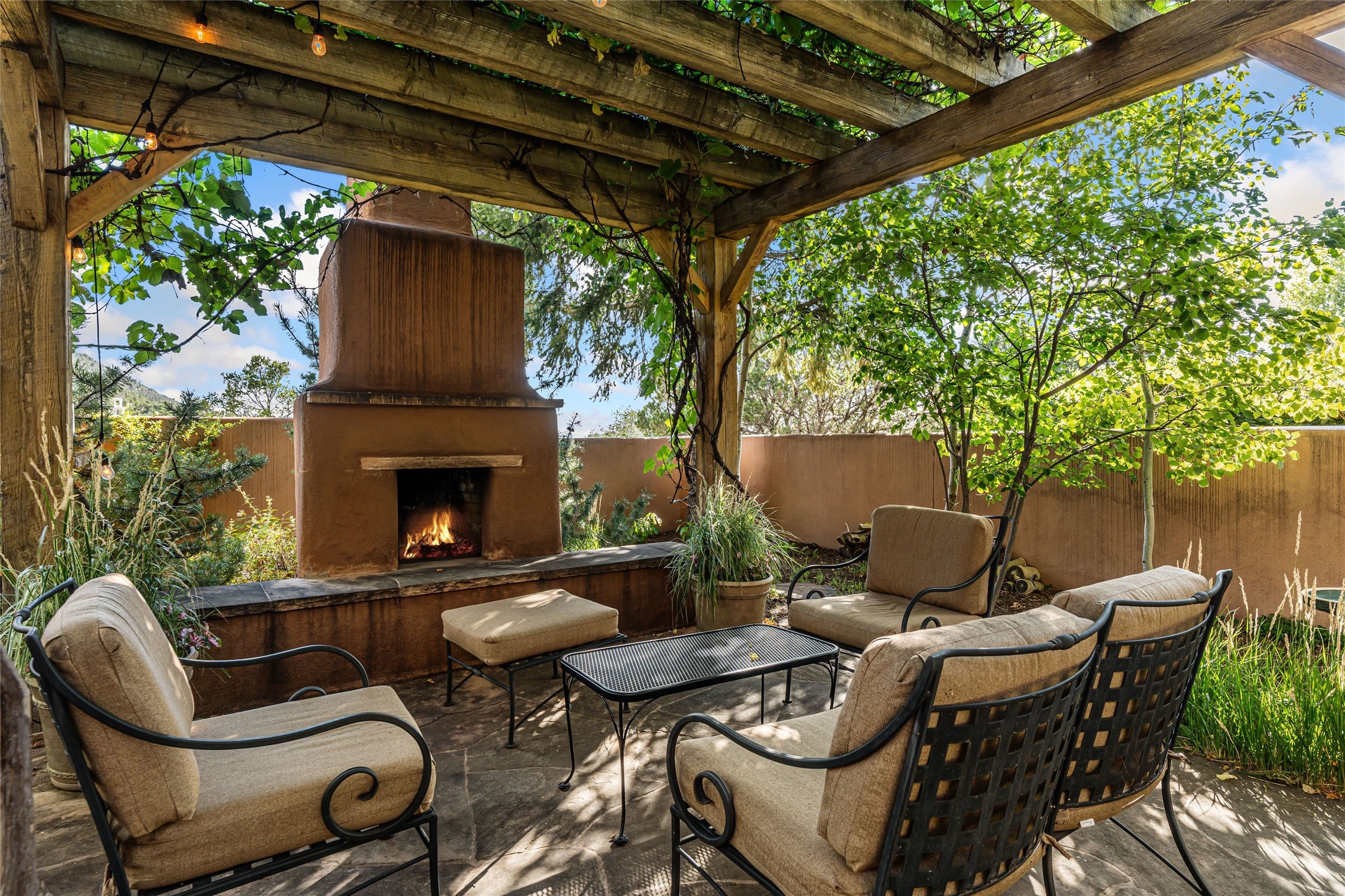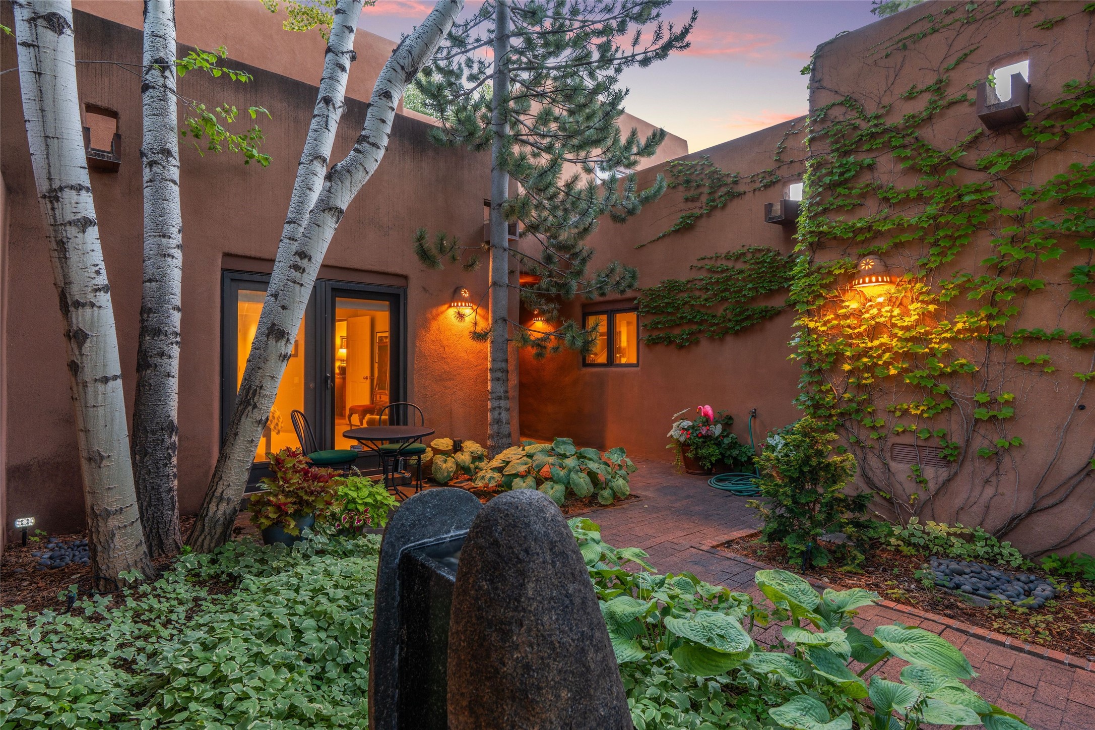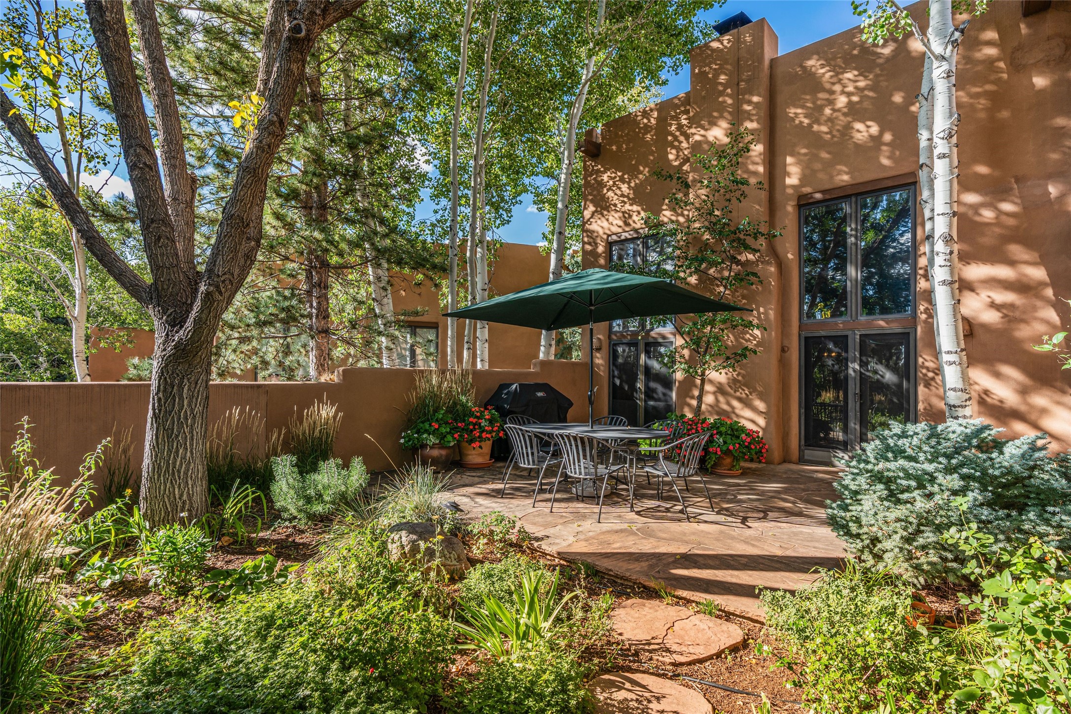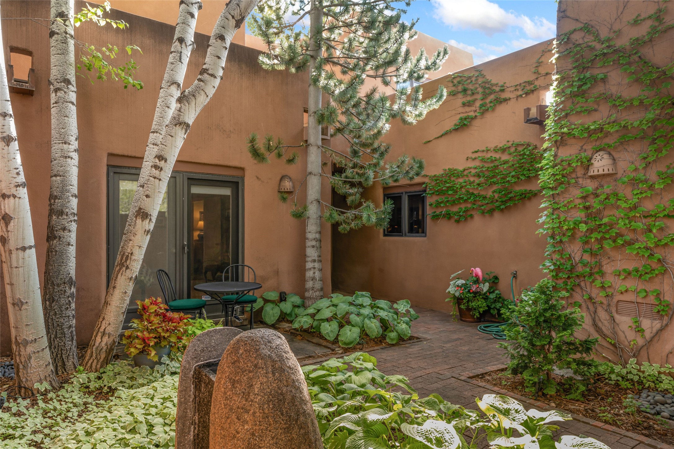 Desirable Los Miradores 3-bedroom, 3-bath residence close to Museum Hill and Canyon Road. Living room with soaring beamed ceilings and stately fireplace framed by high windows that highlight the towering trees outside. Updated kitchen, equipped with high-end appliances including a double oven, Sub-Zero refrigerator, wine fridge, and elegant quartz countertops, along with a center island perfect for casual dining and entertaining. This home features two spacious bedrooms and bathrooms on the first floor, providing convenience and comfort. Upstairs, you'll find a den/office area and a generous bedroom complete with a kiva fireplace and a large bath, both with access to outdoor decks that enhance the living space. All baths have been recently remodeled. The delightful, landscaped backyard combines a flagstone patio, outdoor fireplace, and serene nature paths bedecked with aspen trees and a tranquil fountain. 2-car attached garage. The gated community of Los Miradores offers many amenities, including a seasonal pool, workout facility and tennis court. Additionally, a 2-bedroom casita owned by Los Miradores offers rental opportunities for guests.
