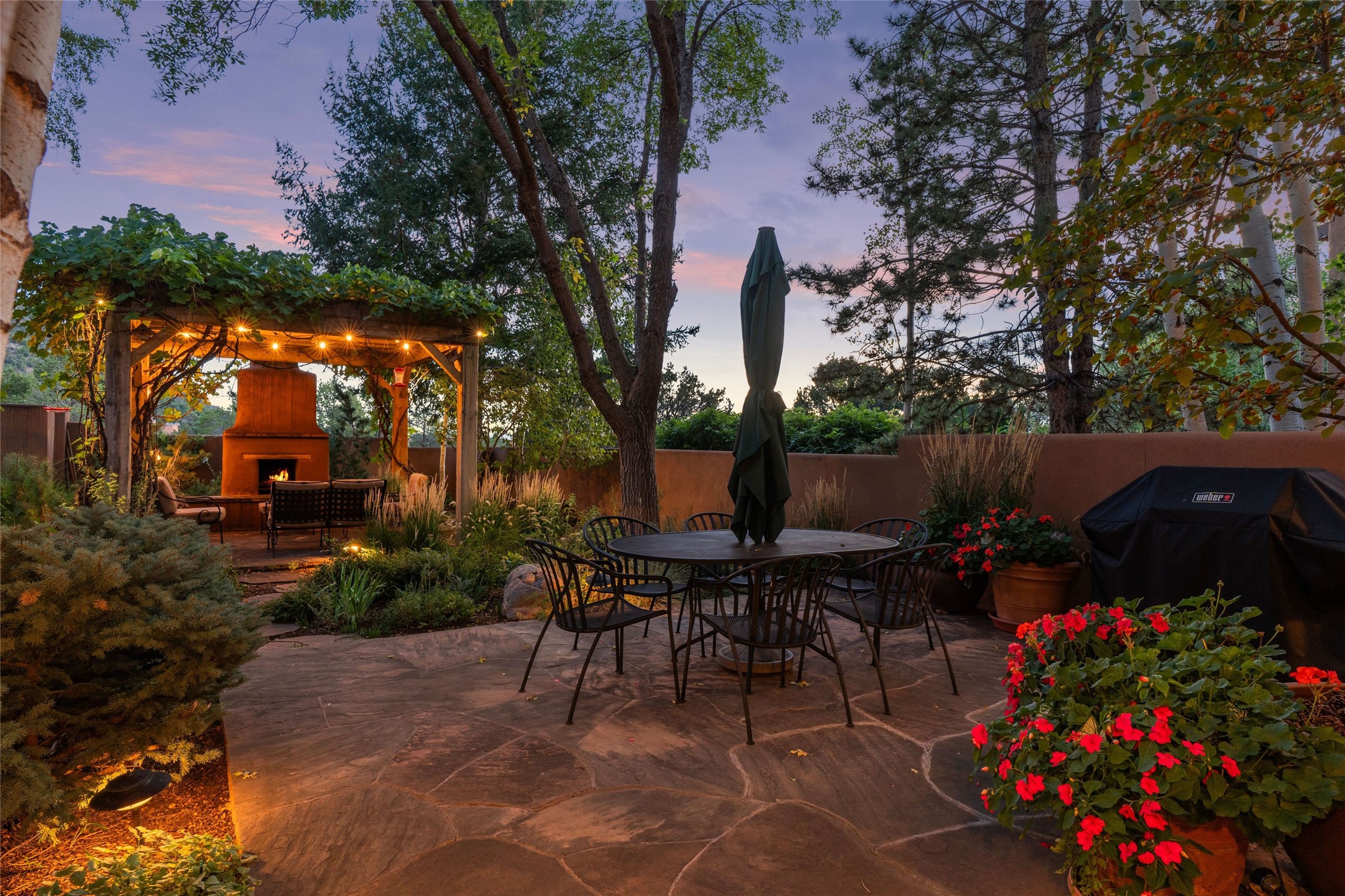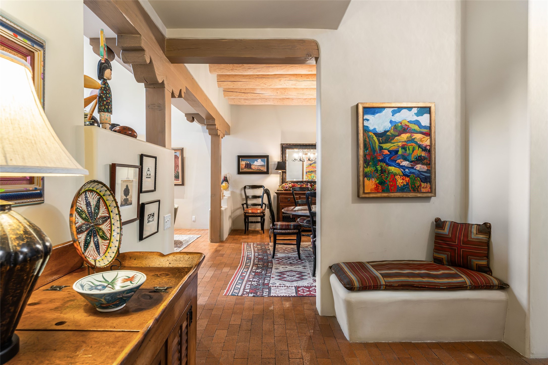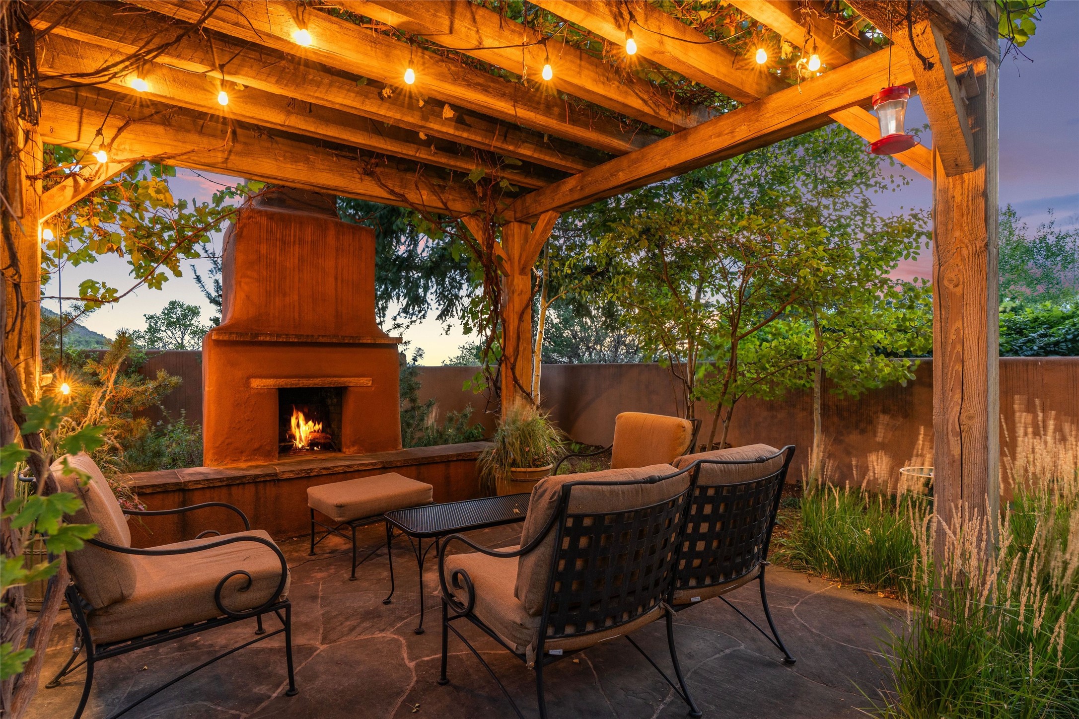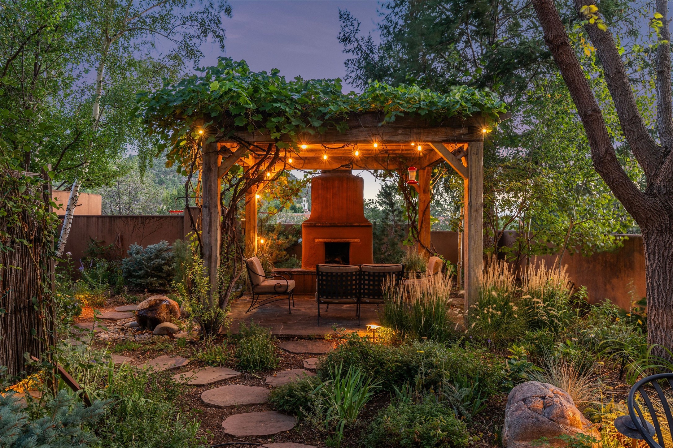 Desirable Los Miradores 3-bedroom, 3-bath residence close to Museum Hill and Canyon Road. Living room with soaring beamed ceilings and stately fireplace framed by high windows that highlight the towering trees outside. Updated kitchen, equipped with high-end appliances including a double oven, Sub-Zero refrigerator, wine fridge, and elegant quartz countertops, along with a center island perfect for casual dining and entertaining. This home features two spacious bedrooms and bathrooms on the first floor, providing convenience and comfort. Upstairs, you'll find a den/office area and a generous bedroom complete with a kiva fireplace and a large bath, both with access to outdoor decks that enhance the living space. All baths have been recently remodeled. The delightful, landscaped backyard combines a flagstone patio, outdoor fireplace, and serene nature paths bedecked with aspen trees and a tranquil fountain. 2-car attached garage. The gated community of Los Miradores offers many amenities, including a seasonal pool, workout facility and tennis court. Additionally, a 2-bedroom casita owned by Los Miradores offers rental opportunities for guests.